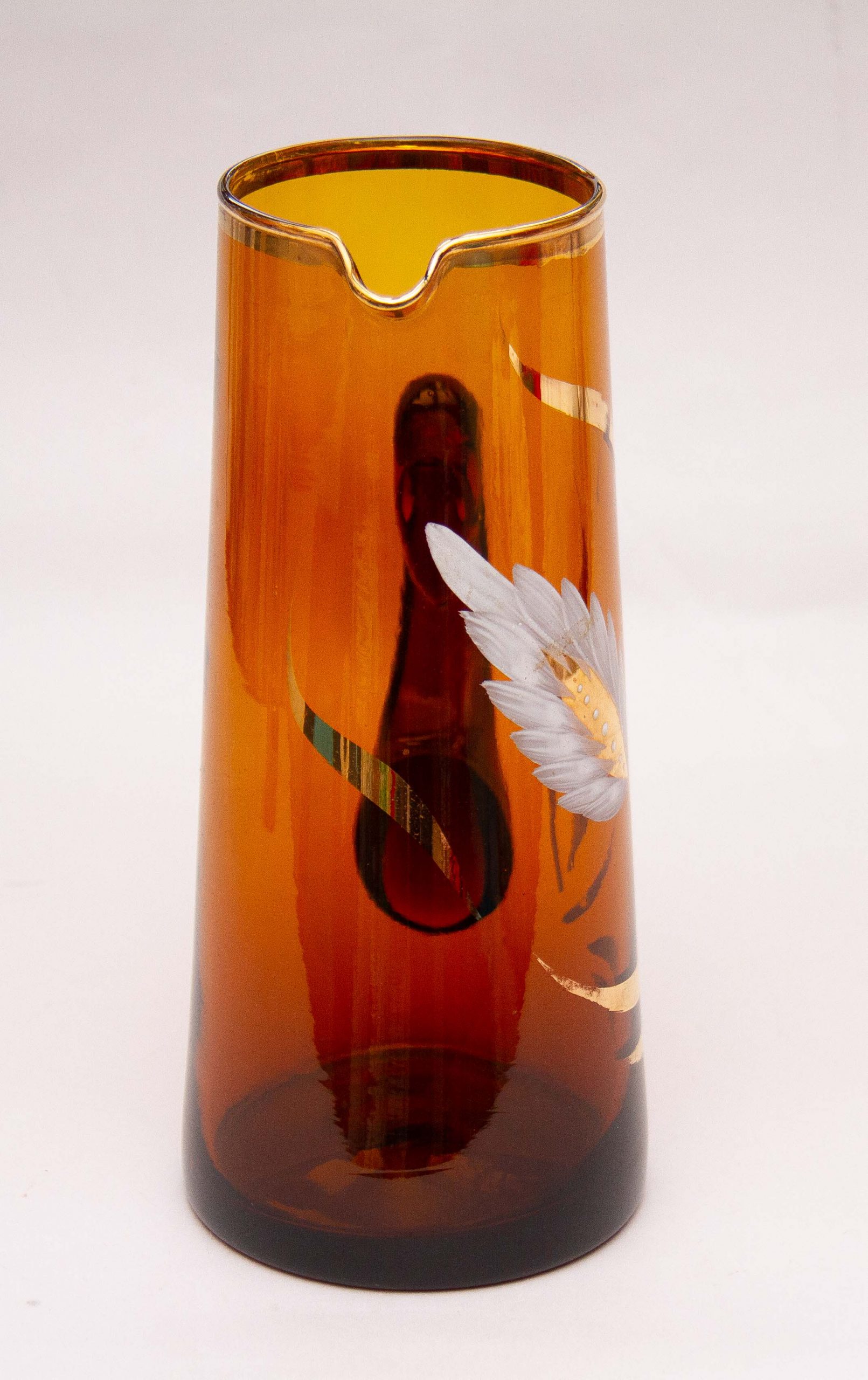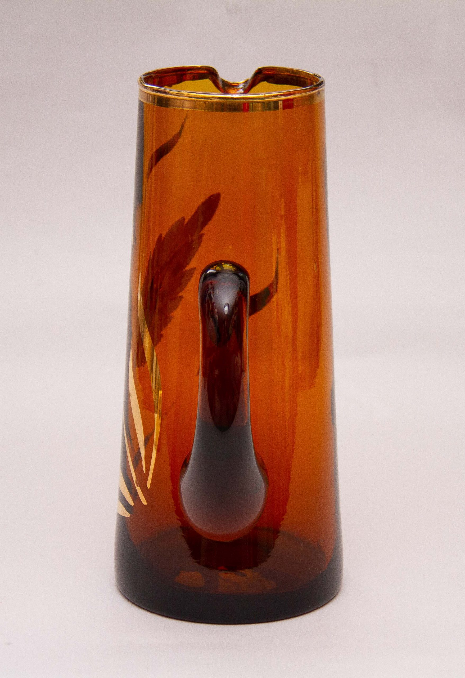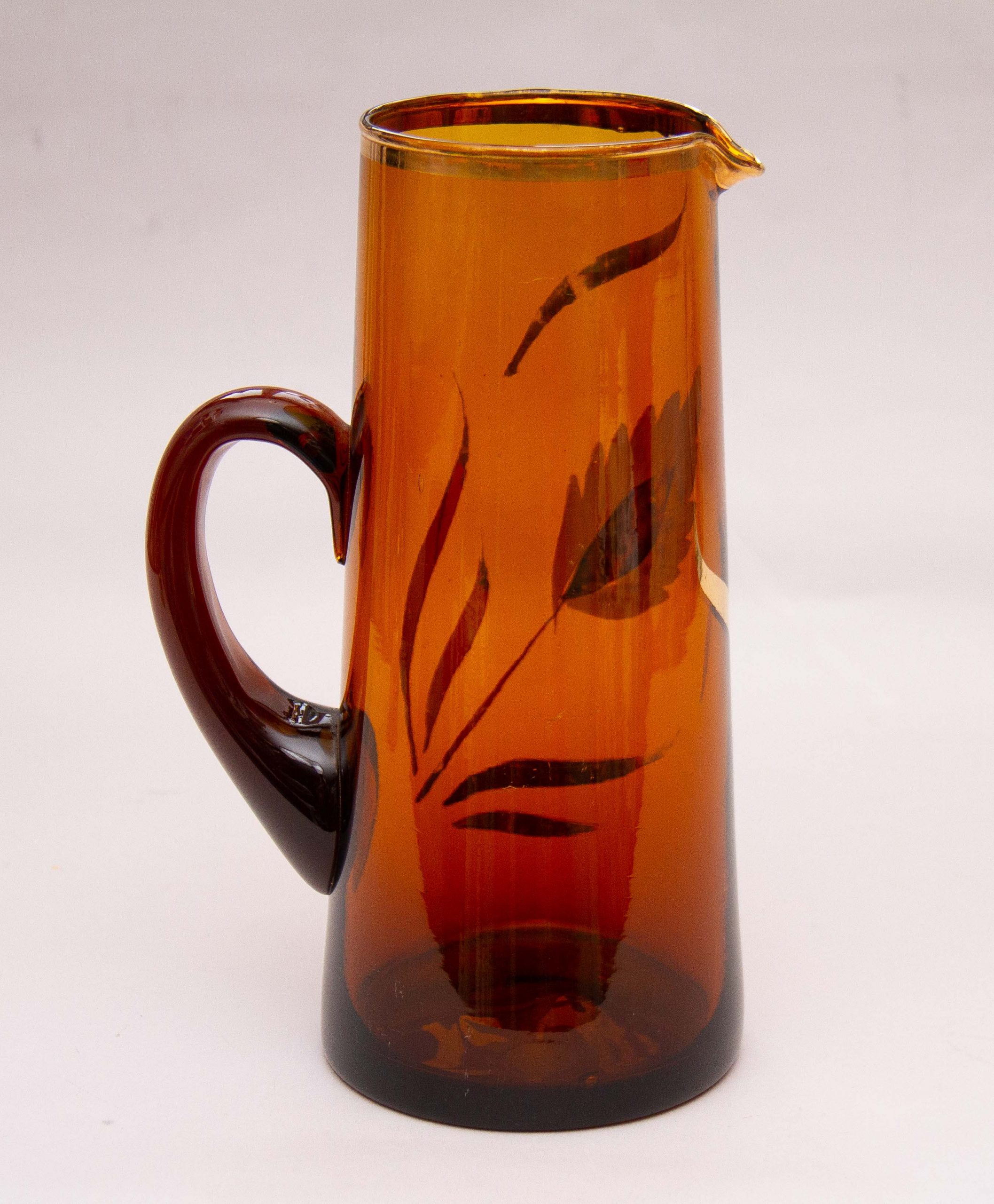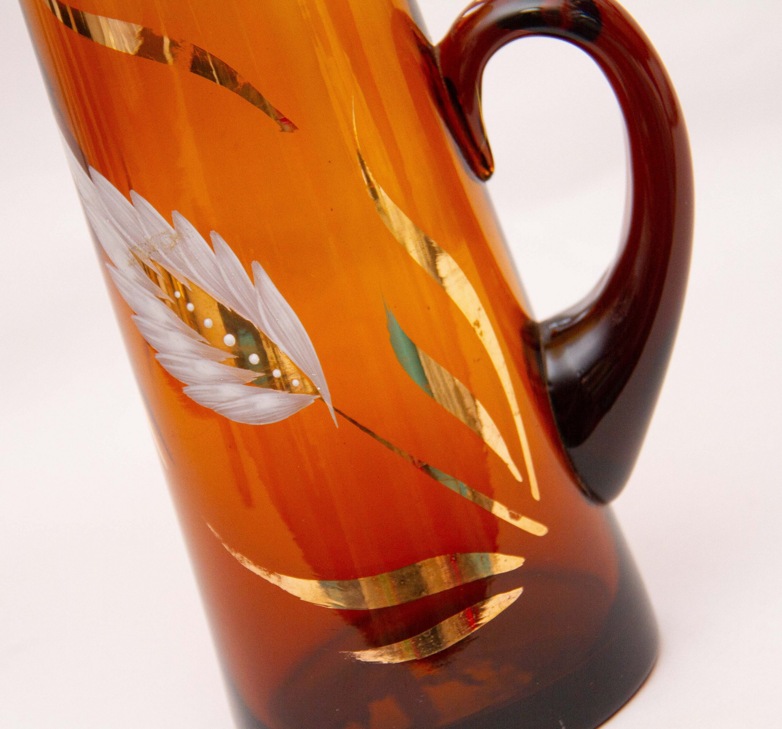 A 1960’s tall amber glass pitcher/jug, decorated with hand painted gold and white flower design.