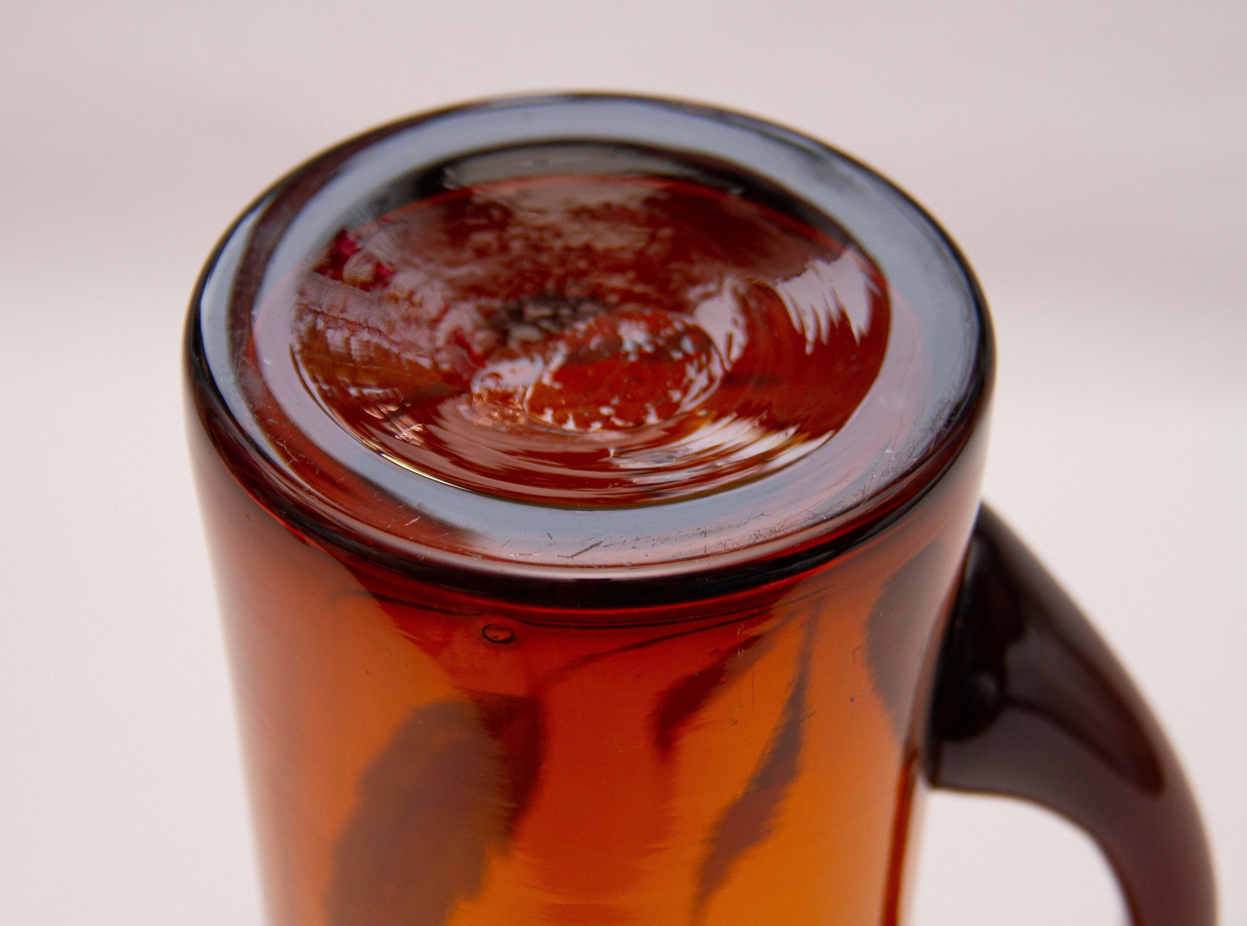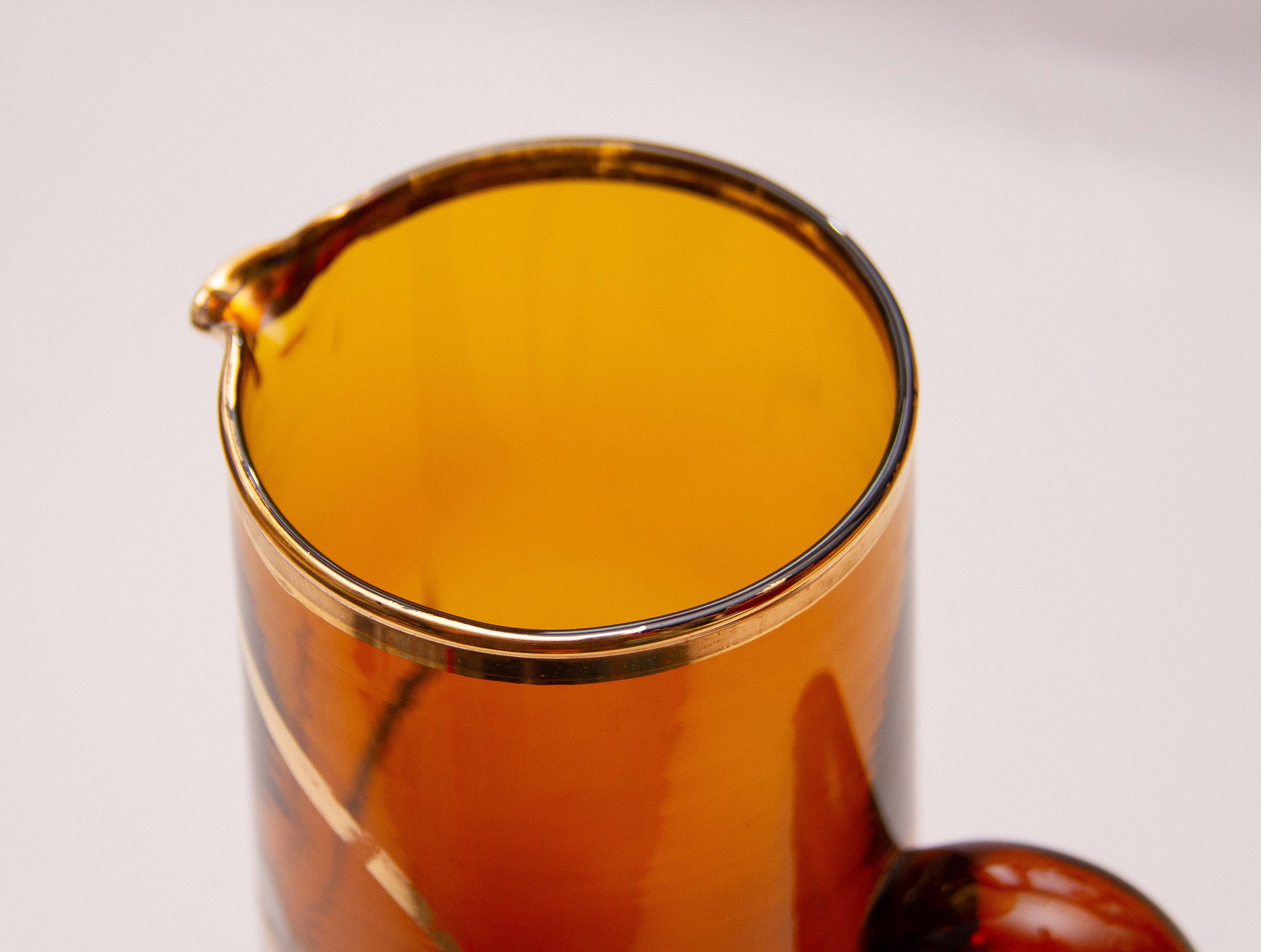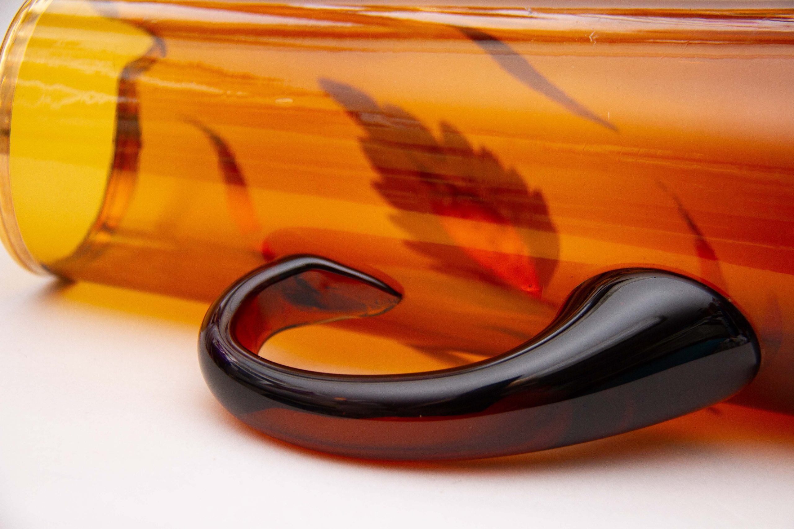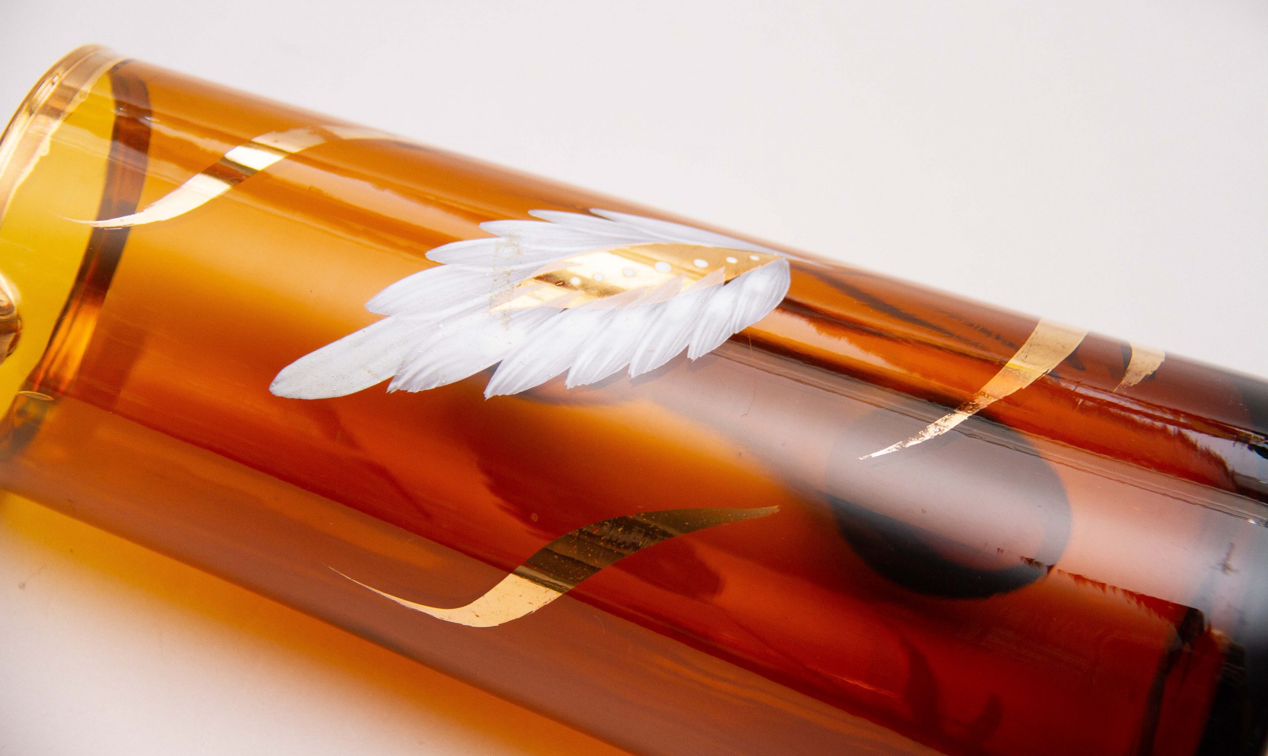 A 1960’s tall amber glass pitcher/jug, decorated with hand painted gold and white flower design.