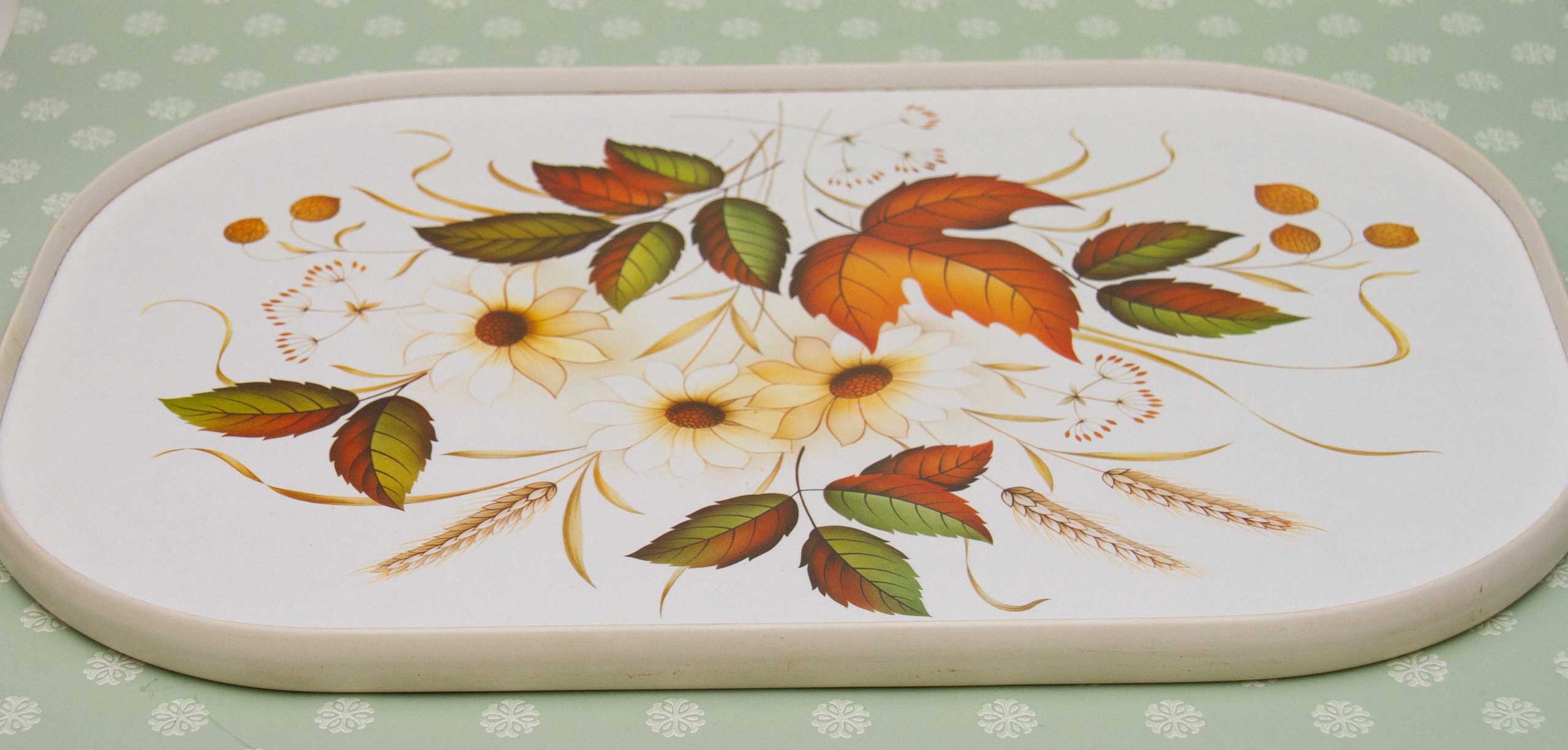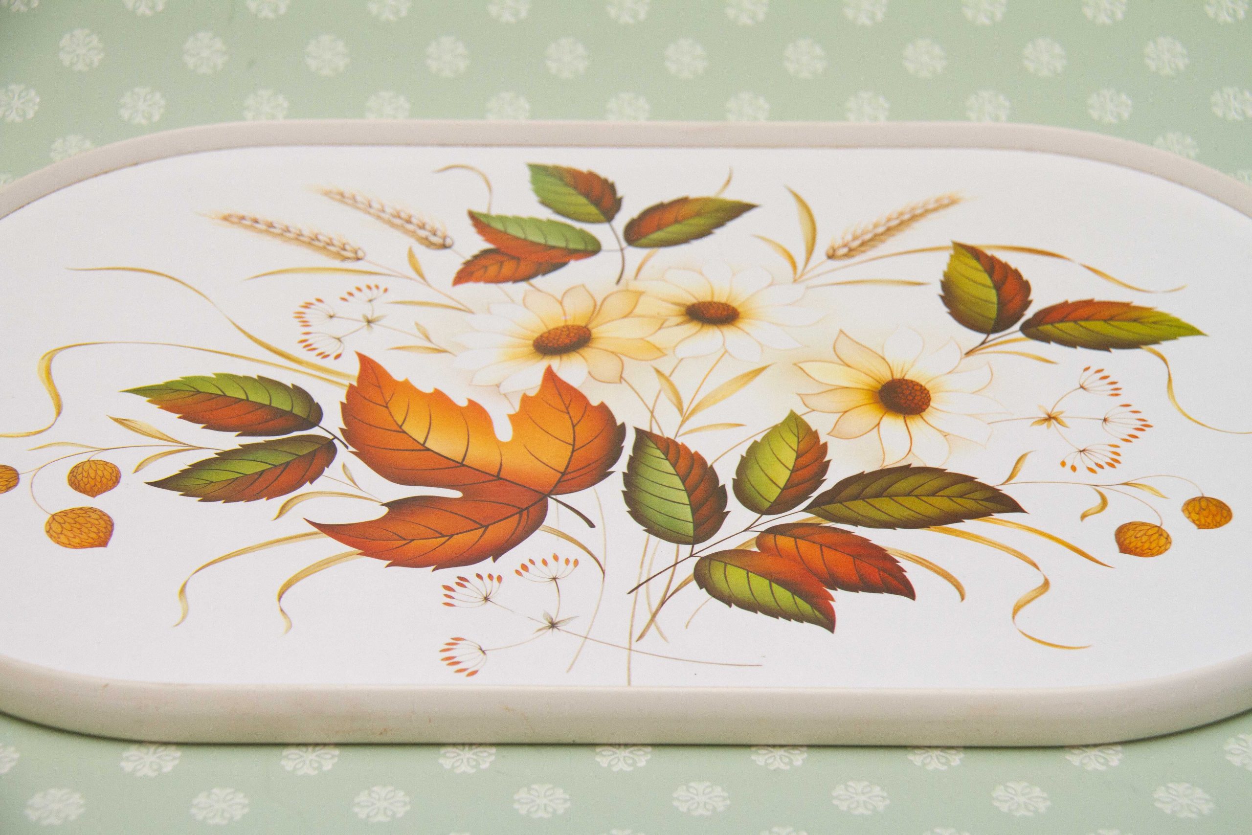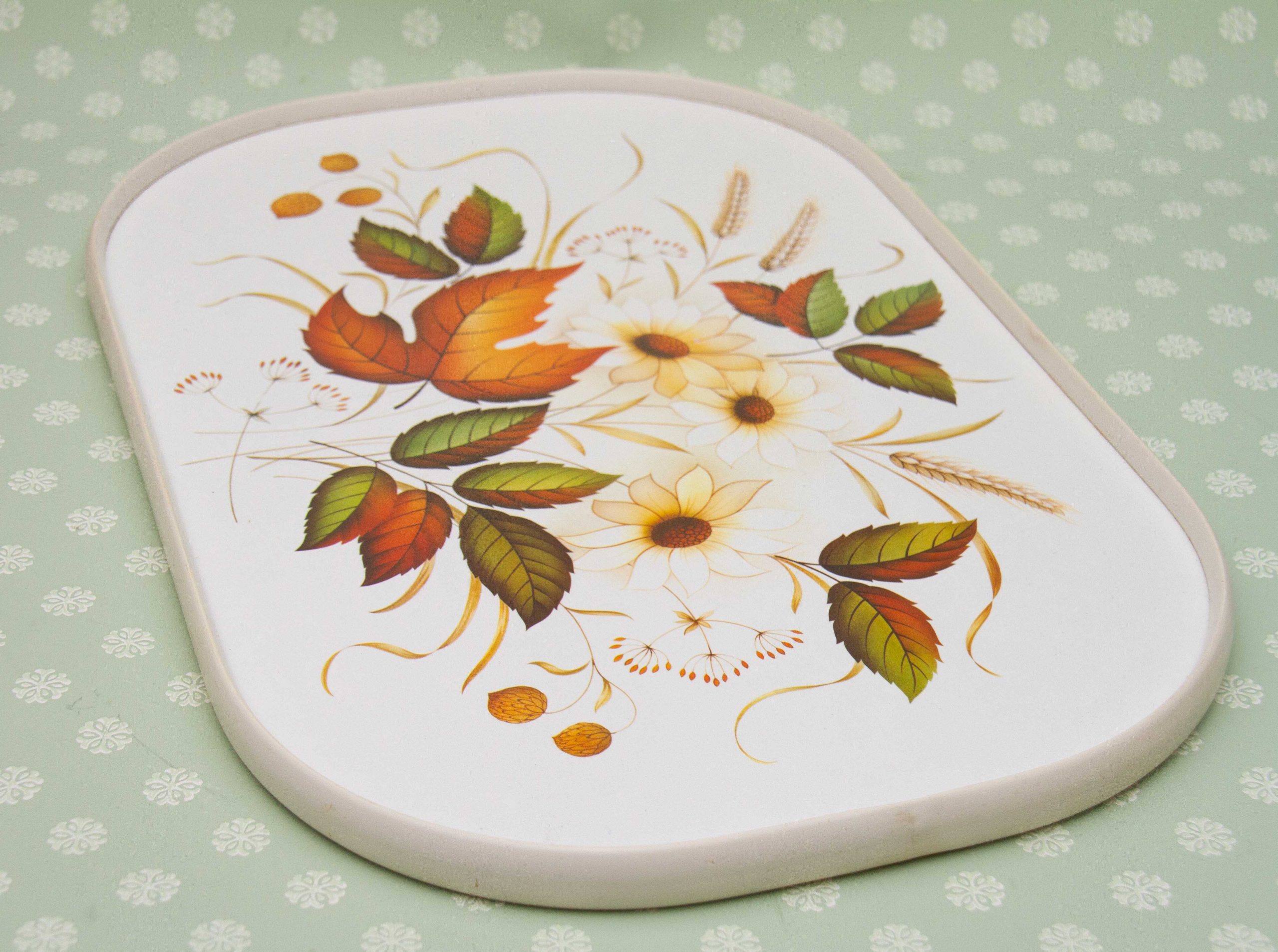 A 1970’s melamine tray with an Autumn leaves design on . Edged with plastic, Made in England
