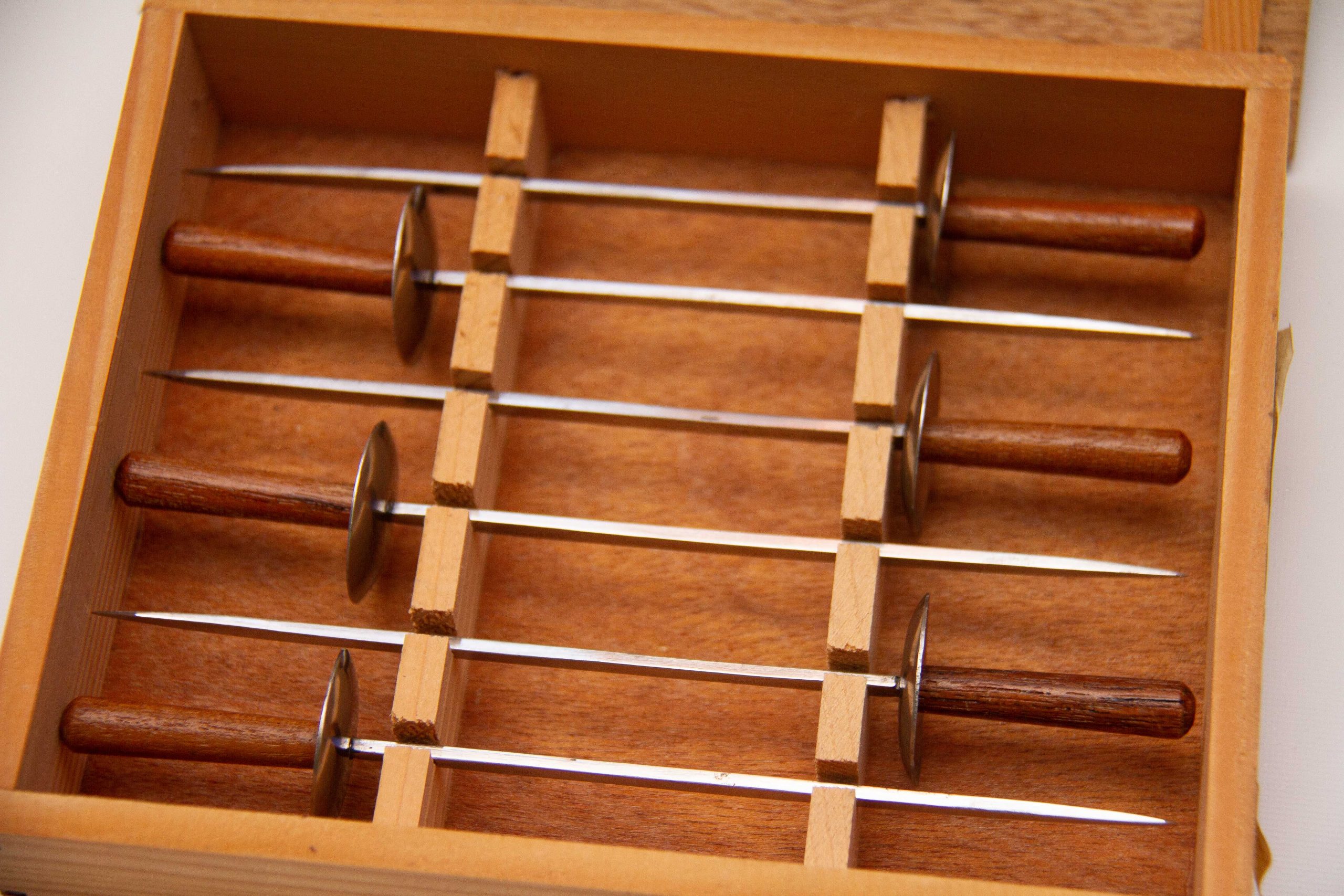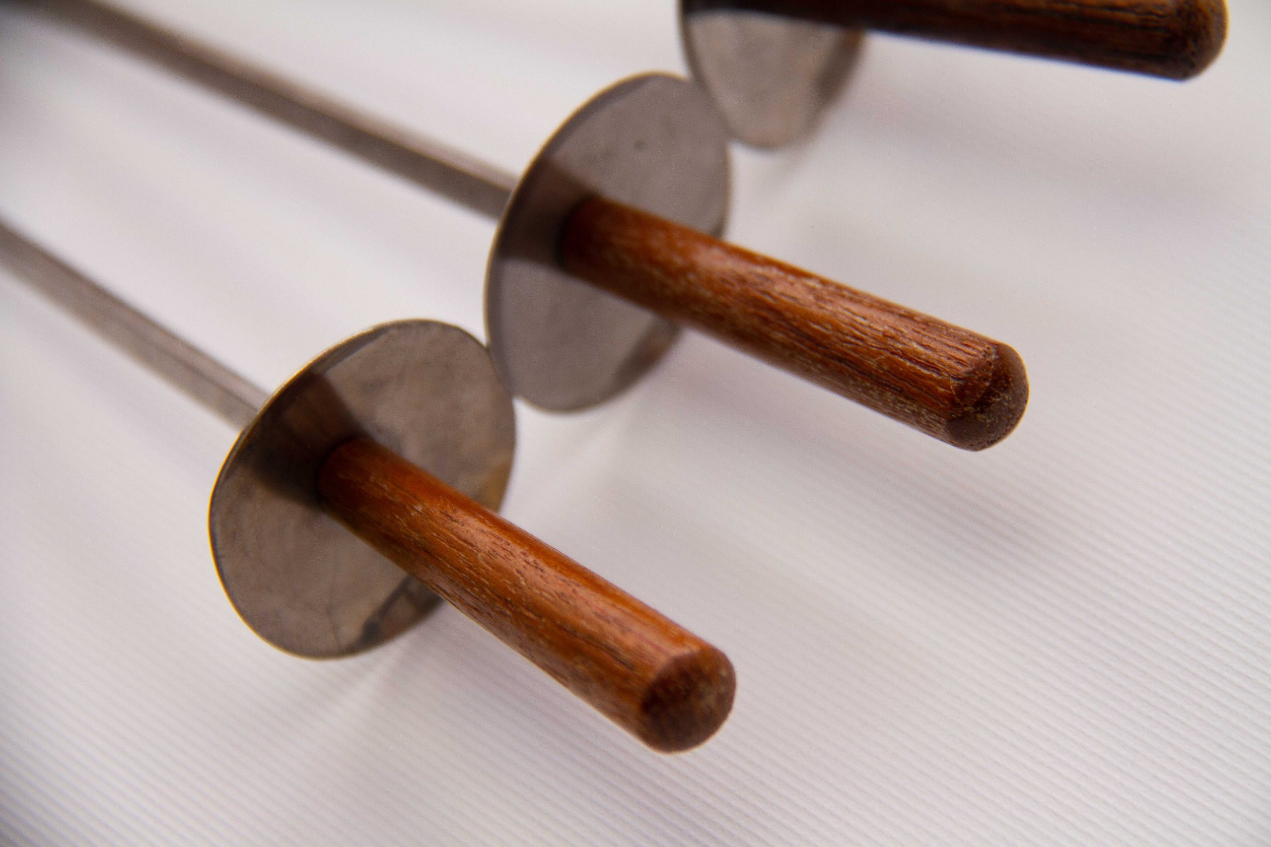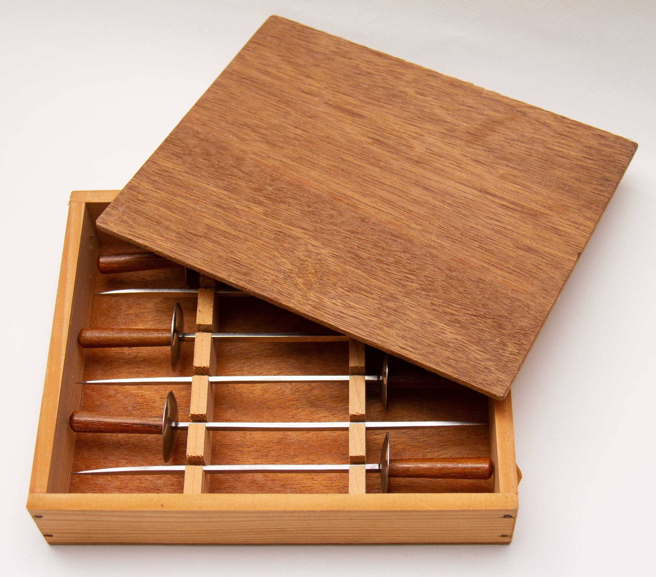 A set of 6 Mid Century Modern skewers in the style of swords. Stainless steel with teak handles. Complete in original wooden box.