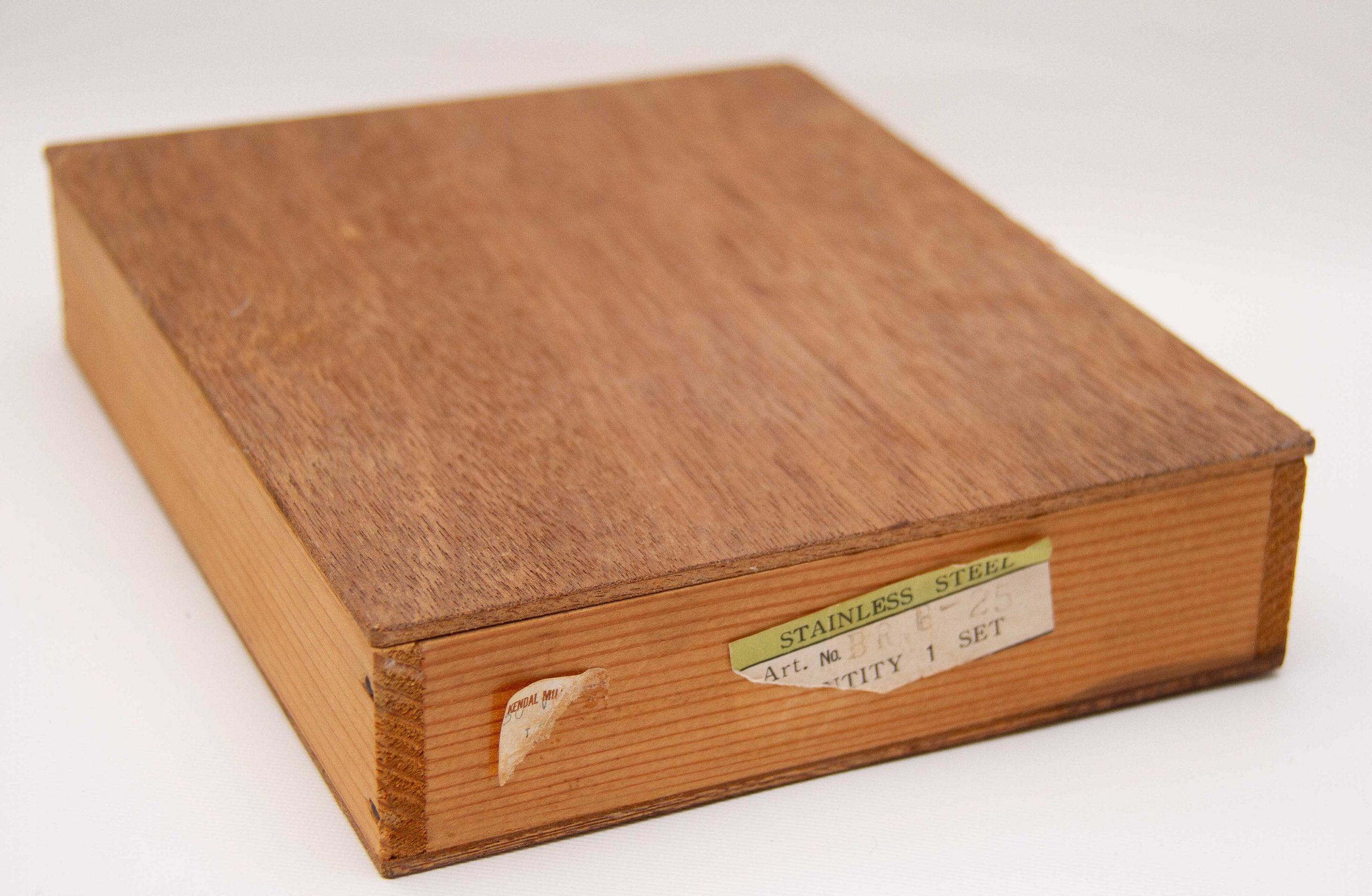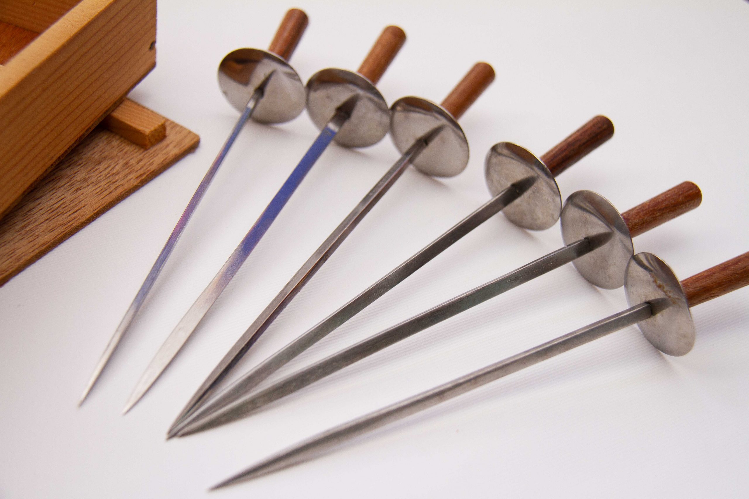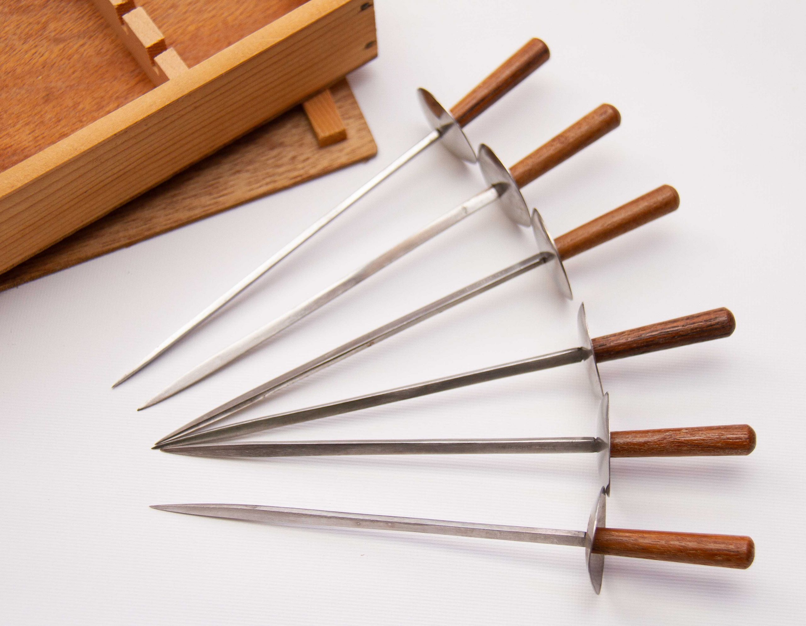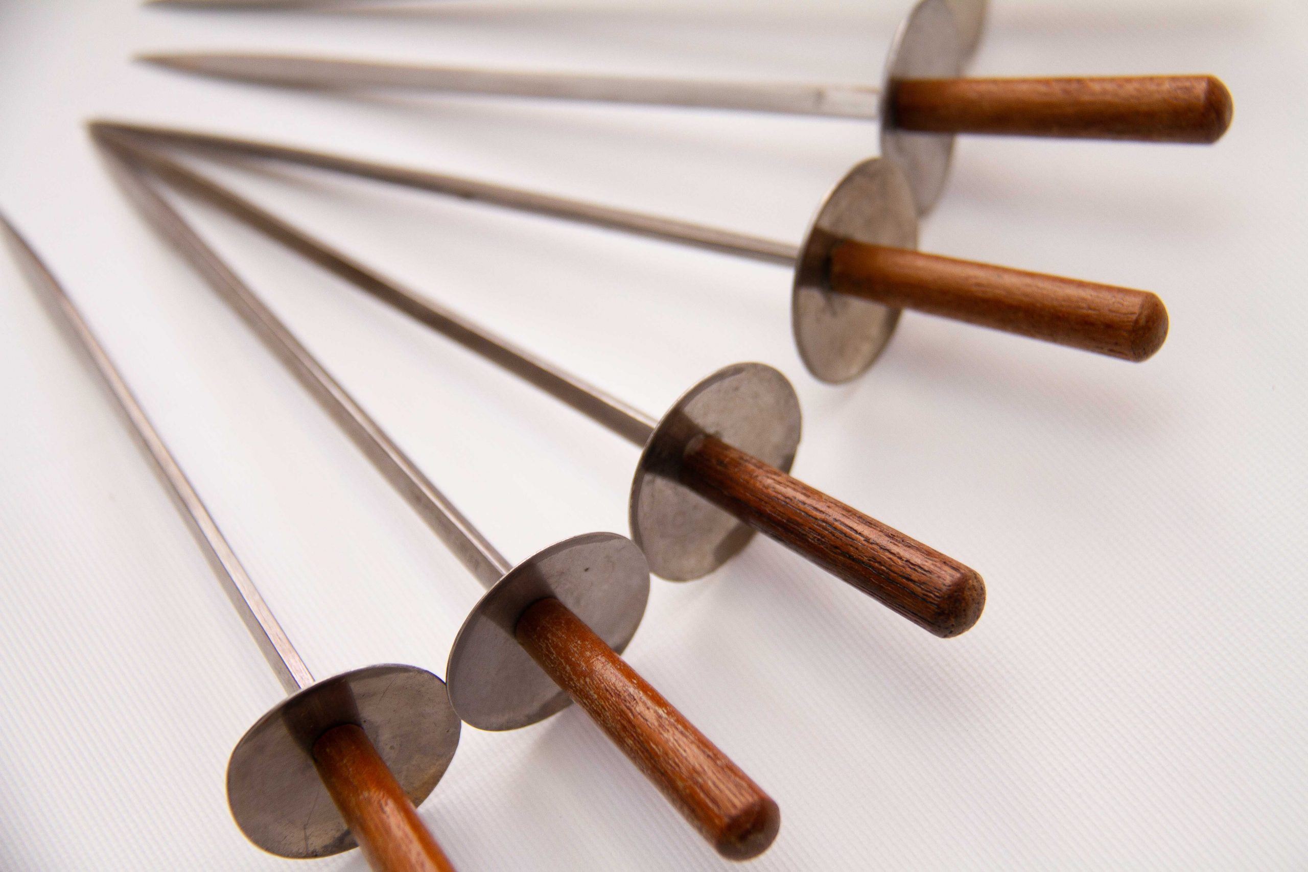 A set of 6 Mid Century Modern skewers in the style of swords. Stainless steel with teak handles. Complete in original wooden box.