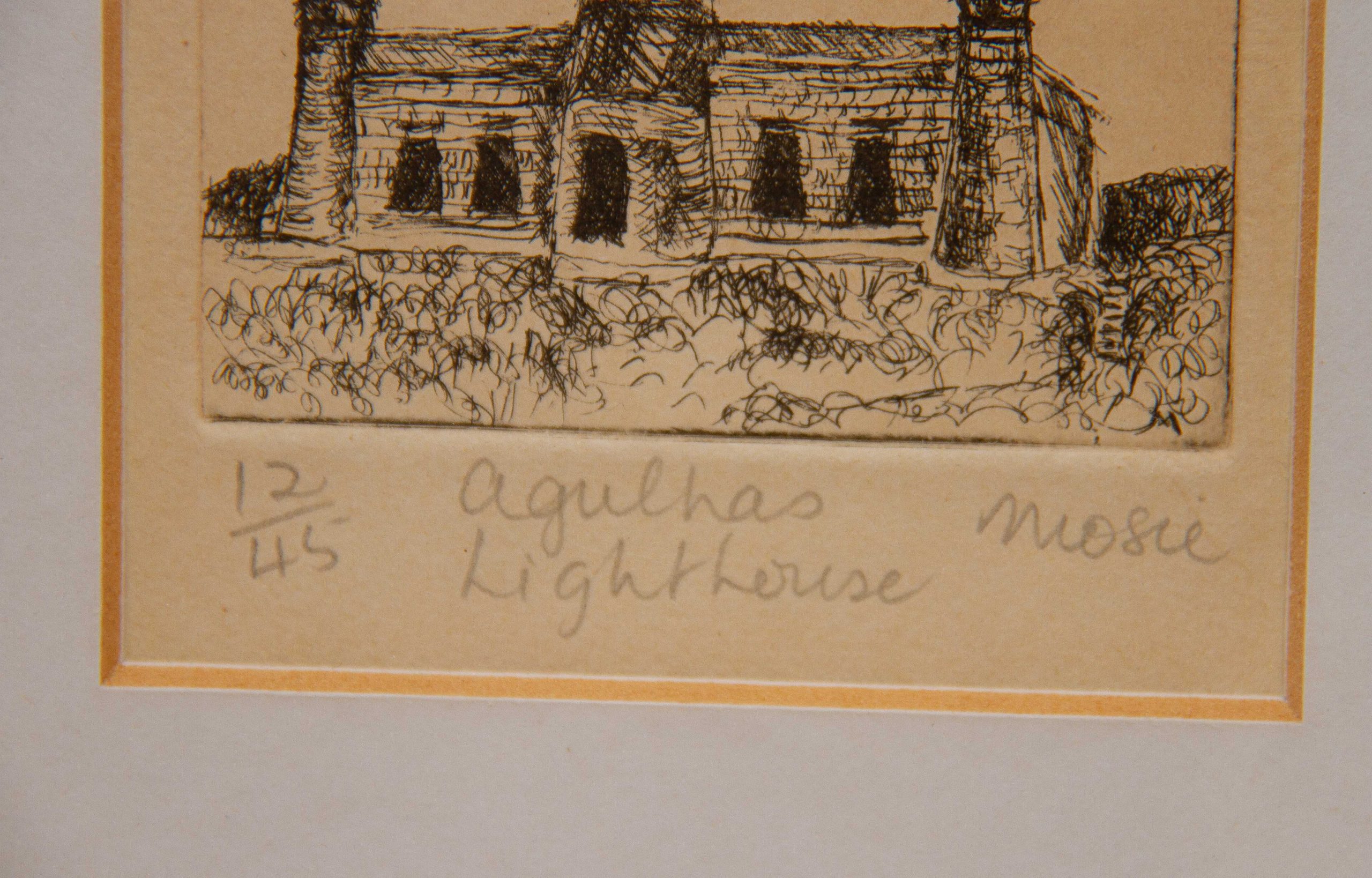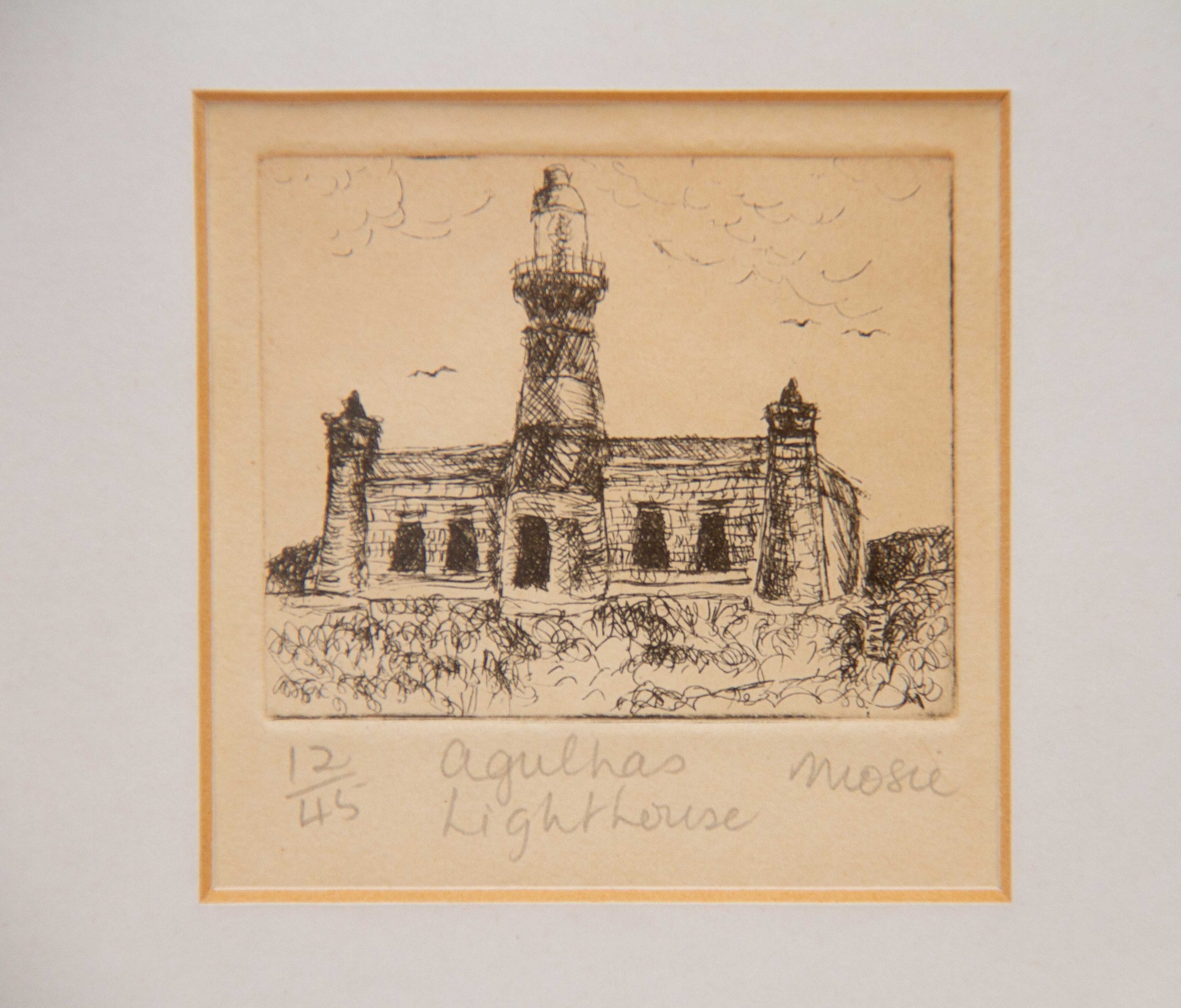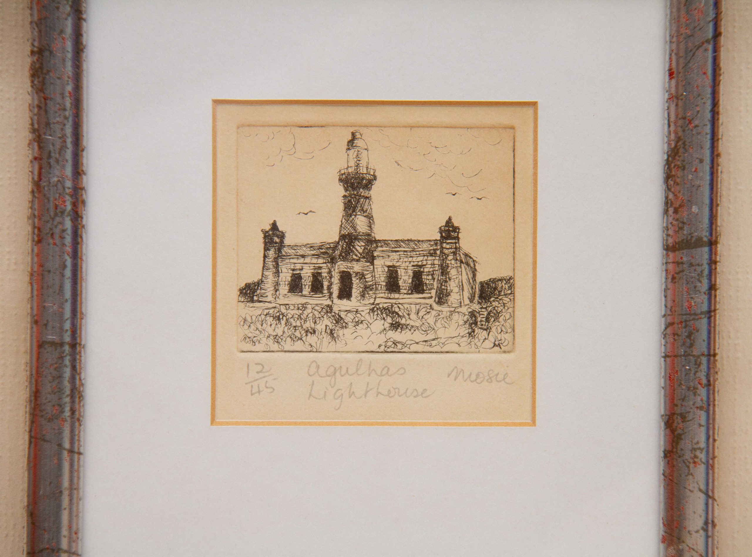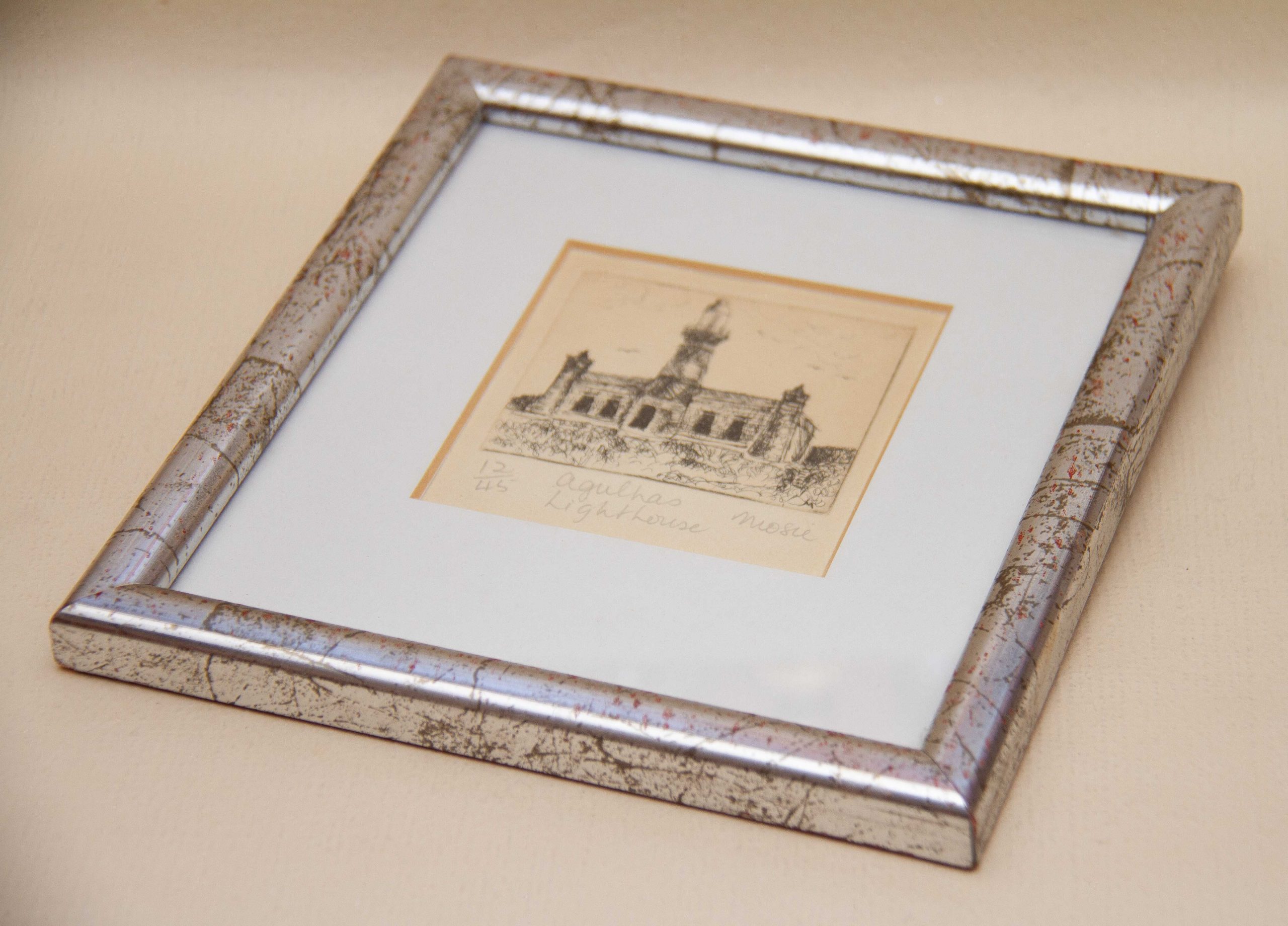 A small framed limited edition print of Agulhas Lighthouse, South Africa. Signed by the artist