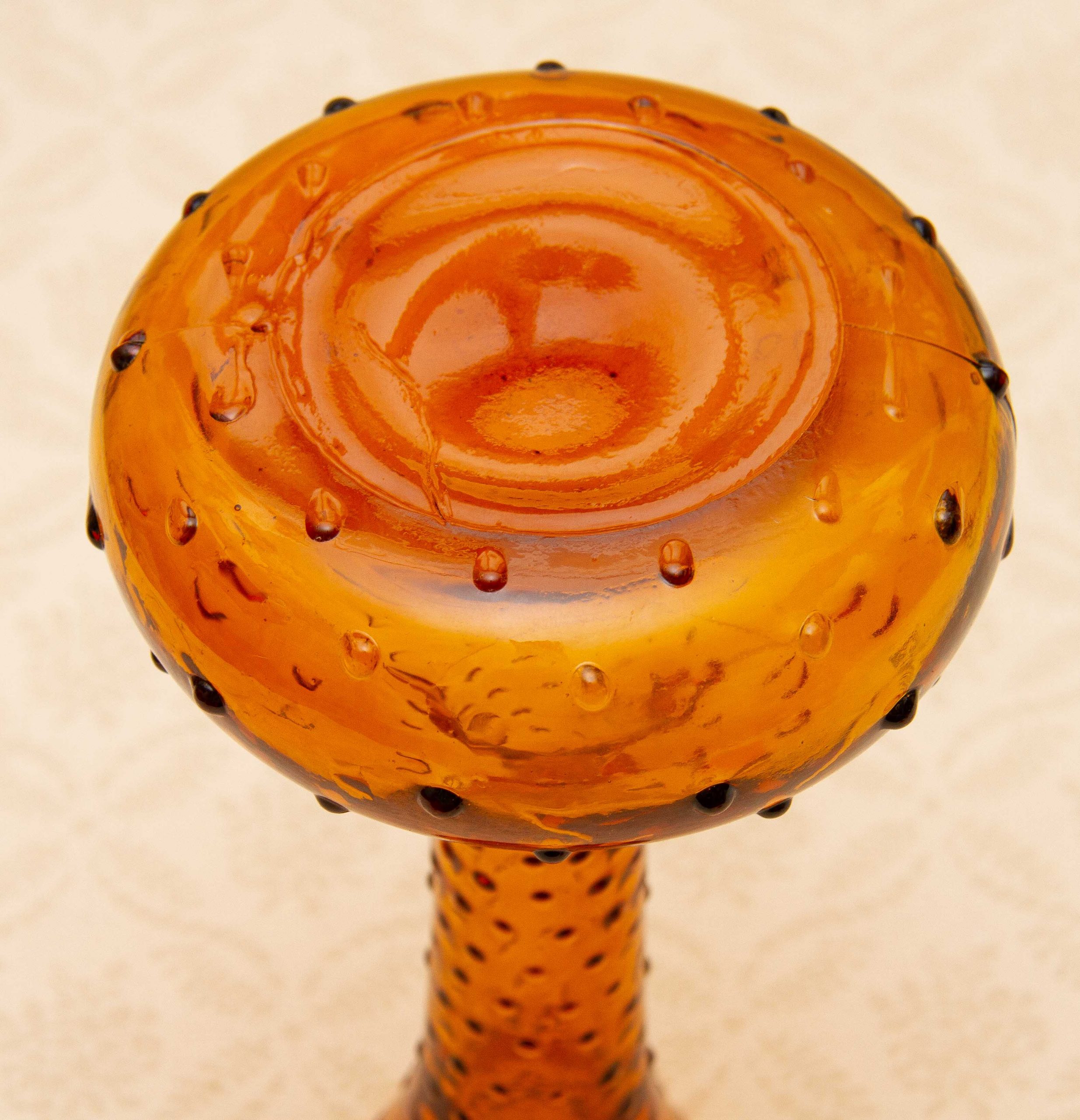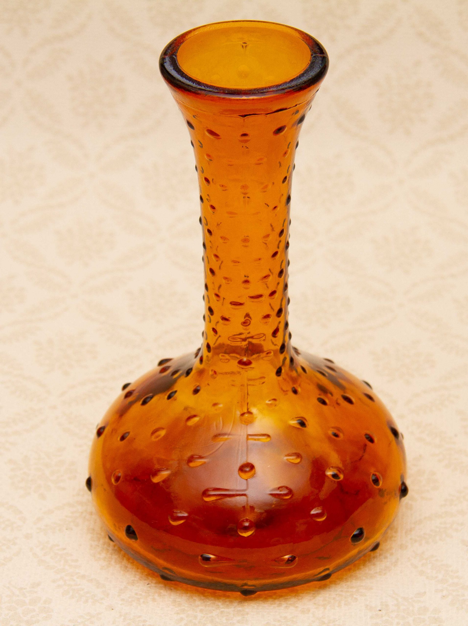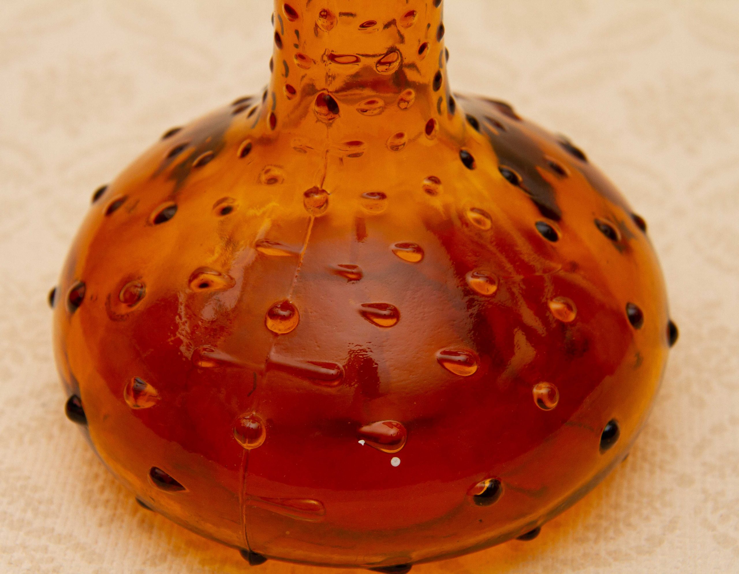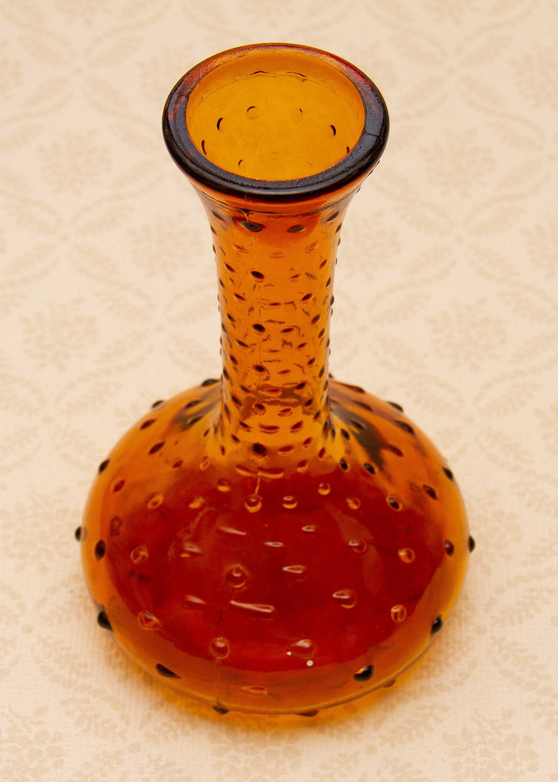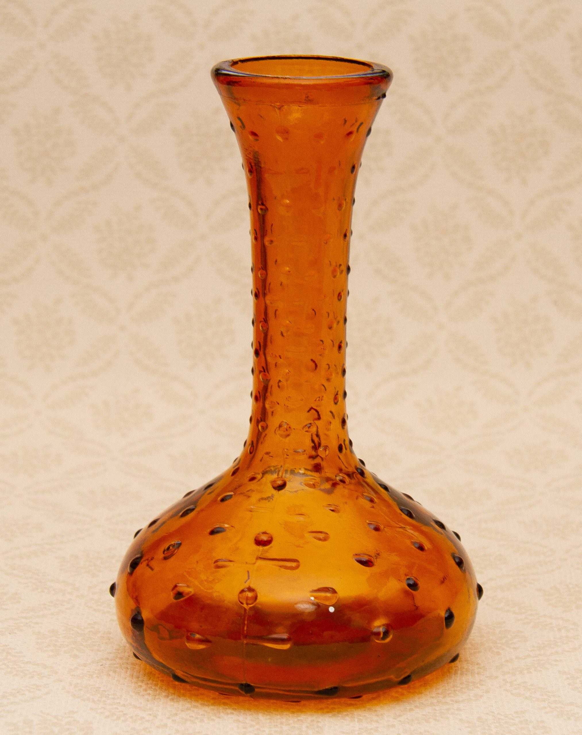 A vintage amber glass vase with a bulbous shape base and narrow neck, with a droplet effect pattern.
