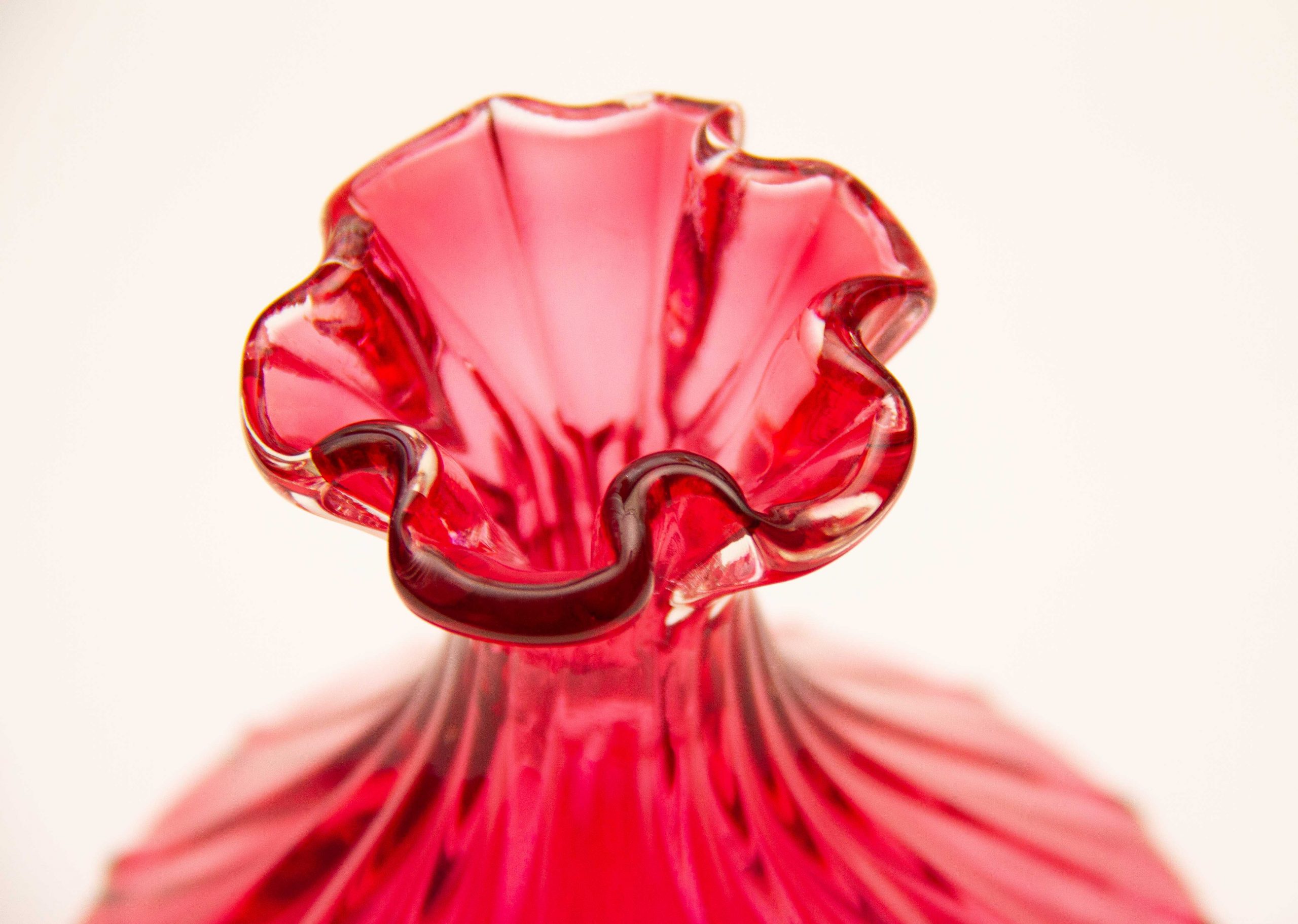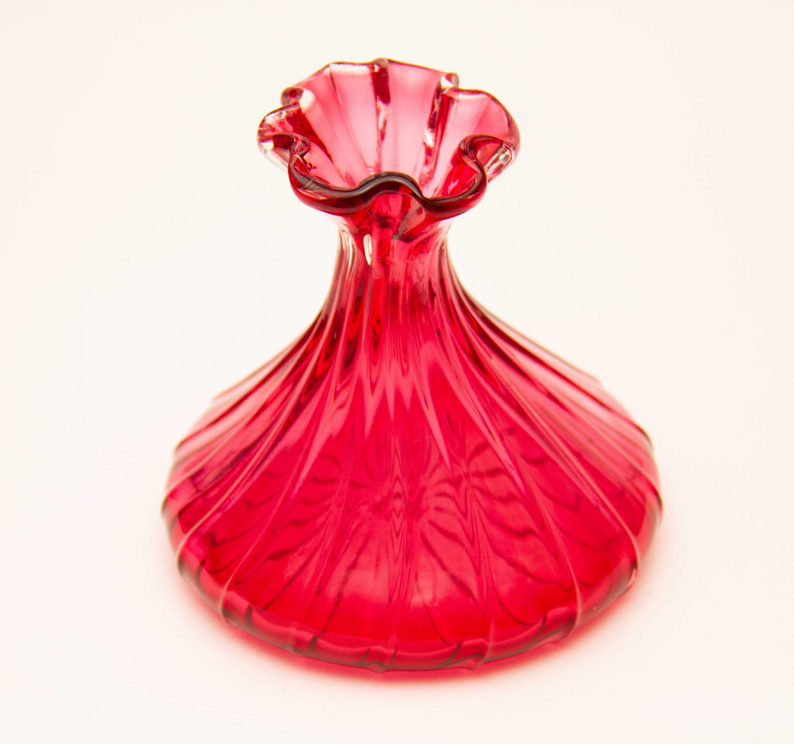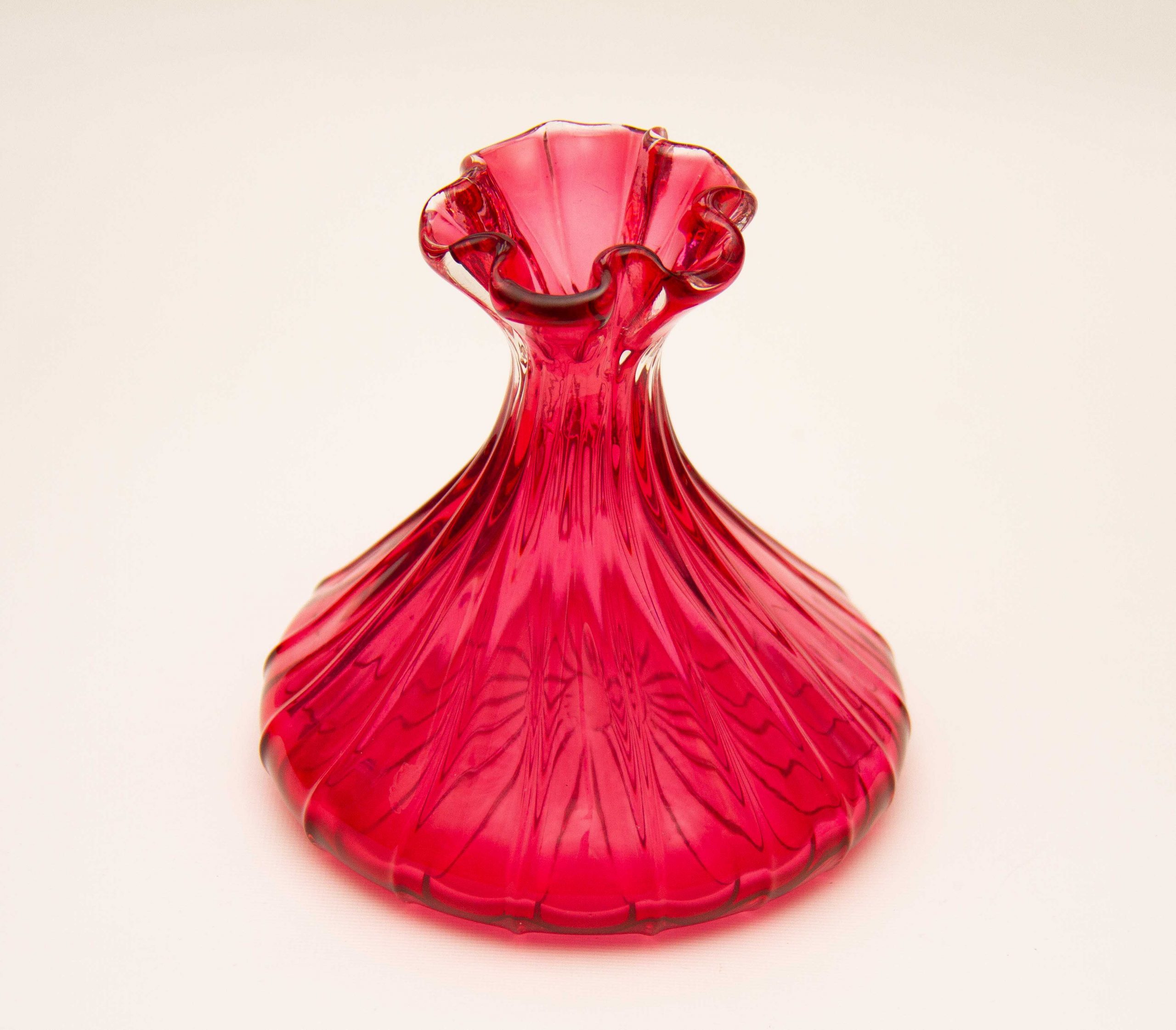 A fine antique Cranberry glass vase in an unusual conical shape, with a ribbed body, and frilled flared top. Pontil marks can be seen on the base.