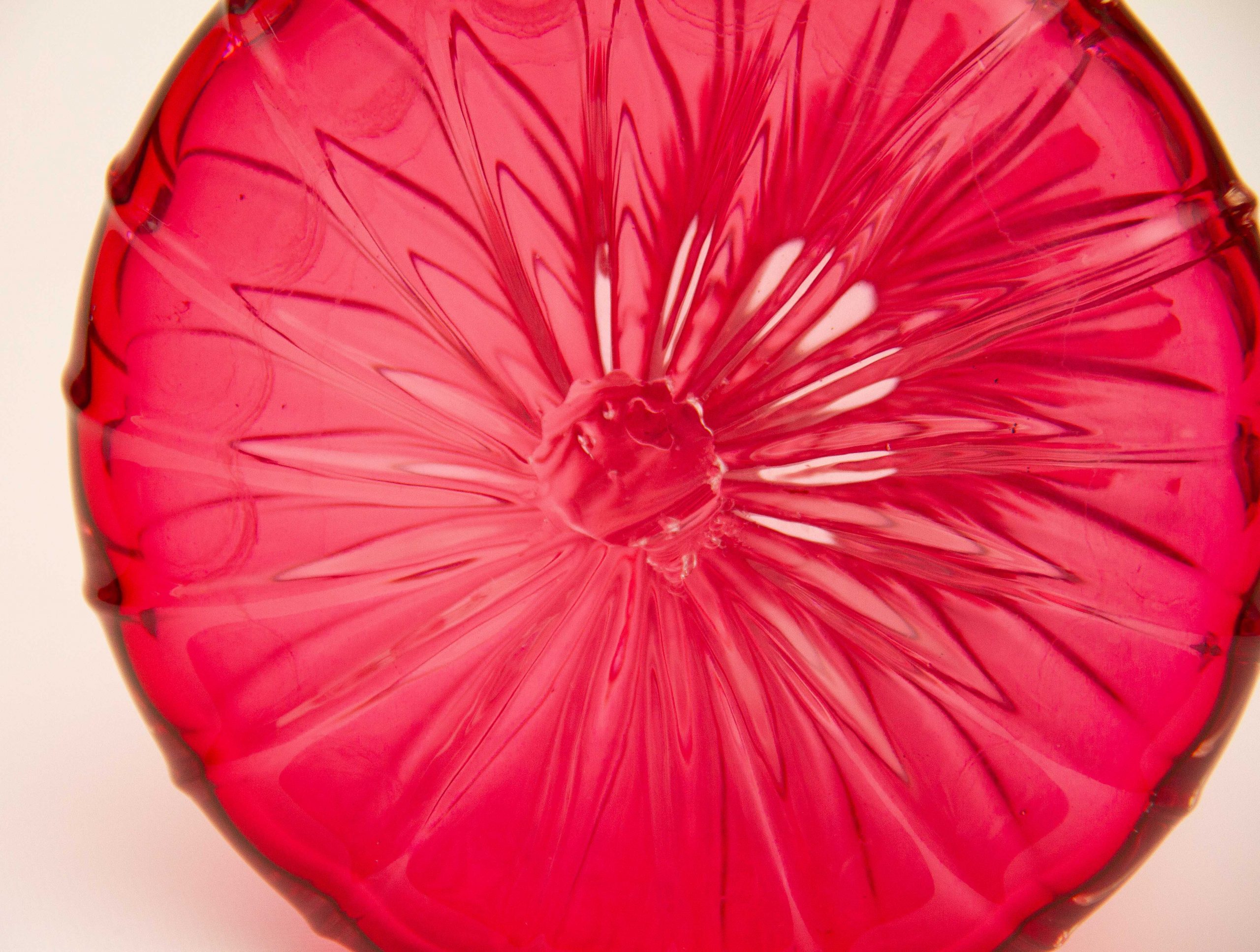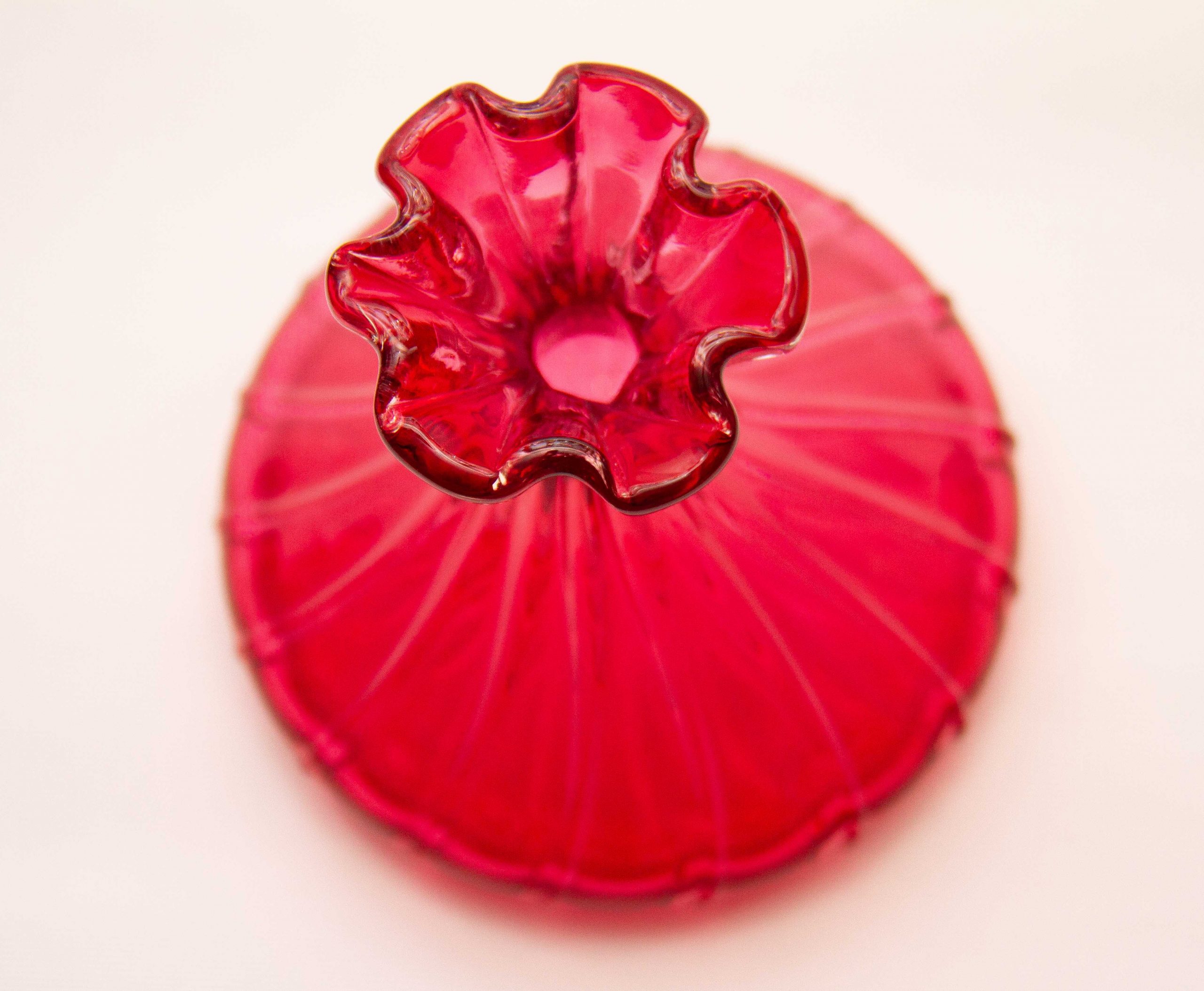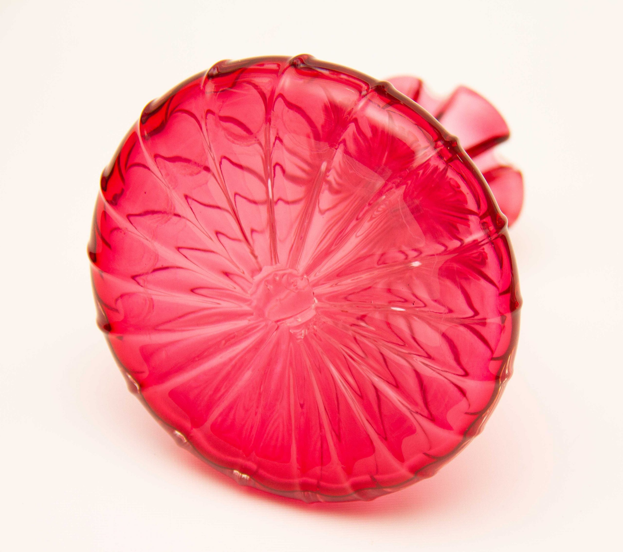 A fine antique Cranberry glass vase in an unusual conical shape, with a ribbed body, and frilled flared top. Pontil marks can be seen on the base.