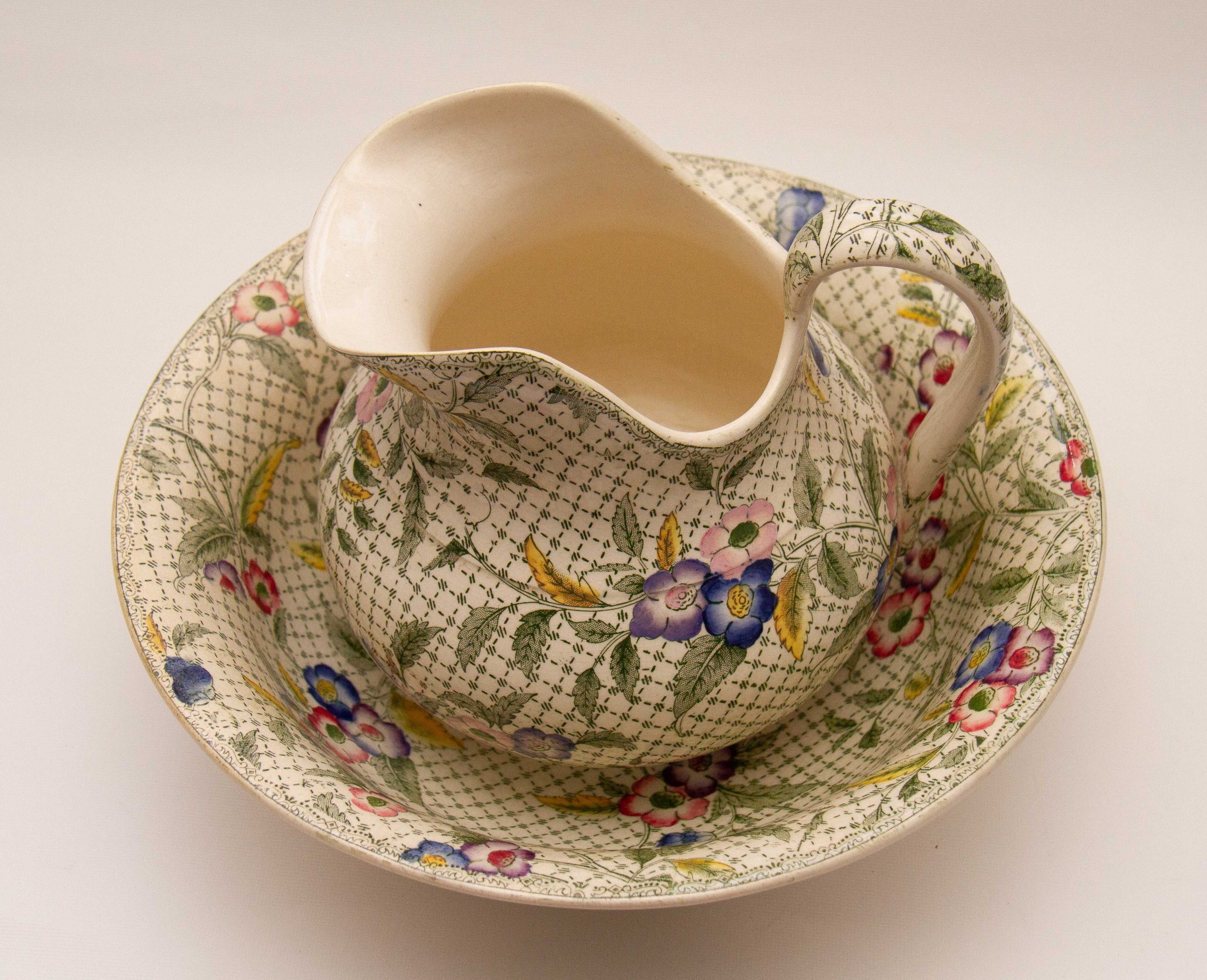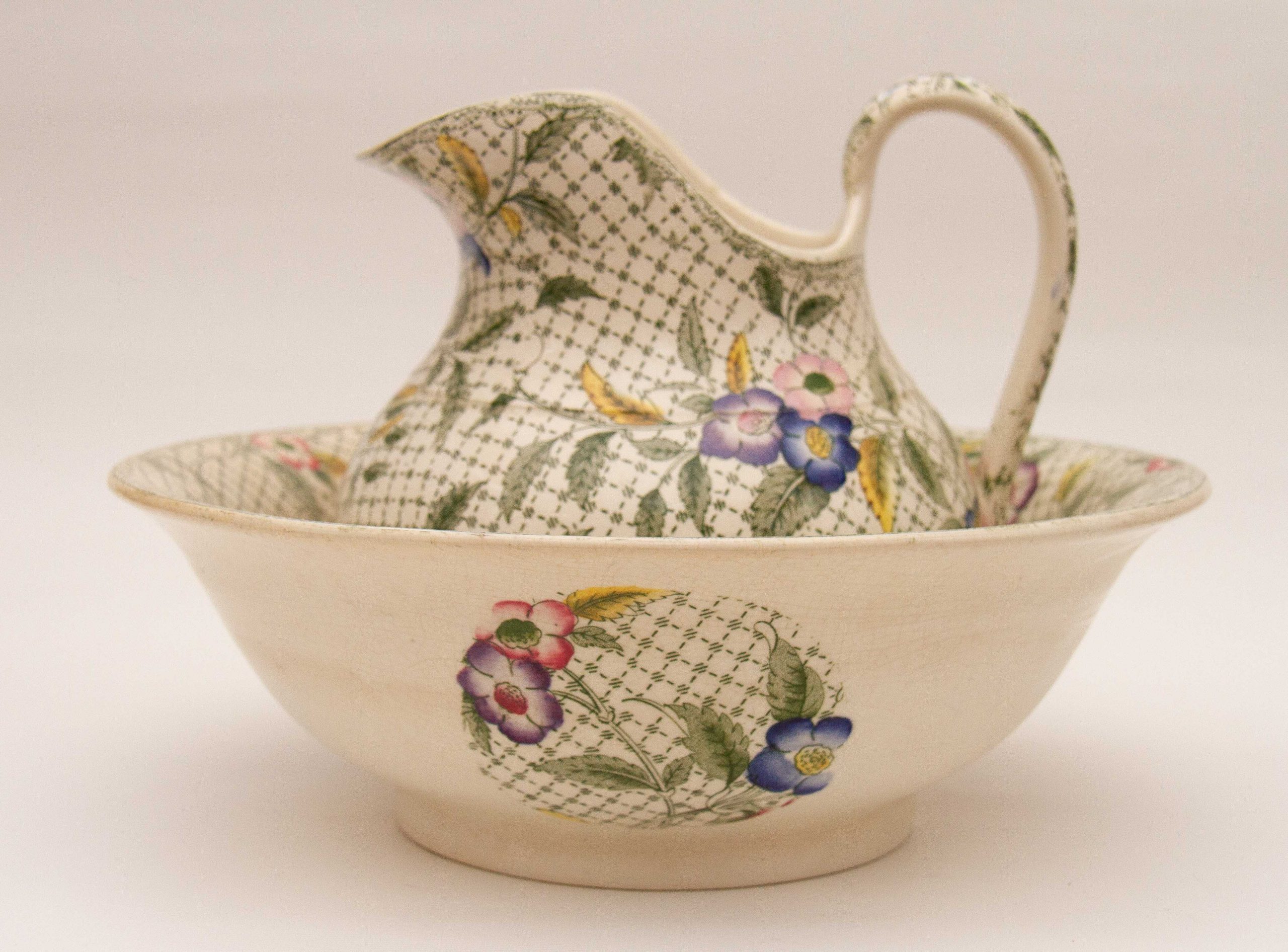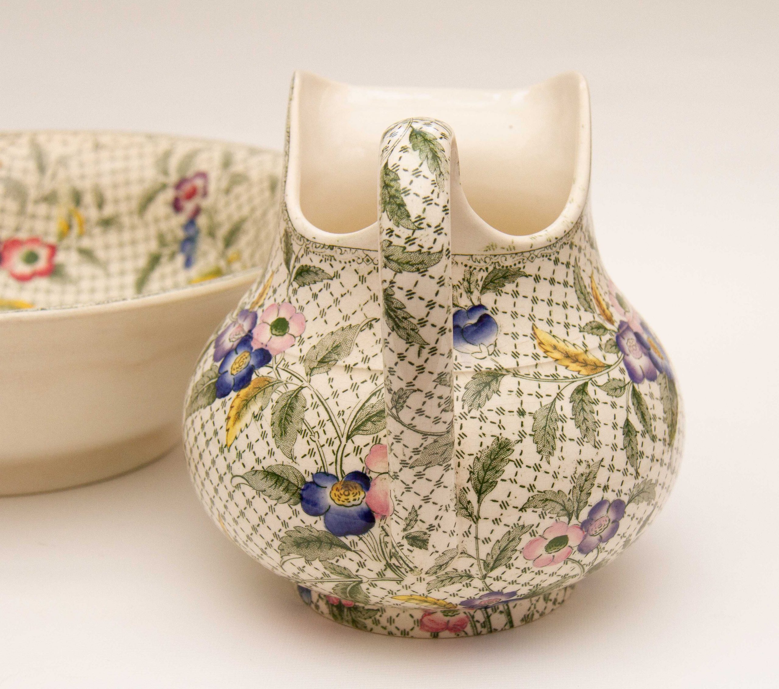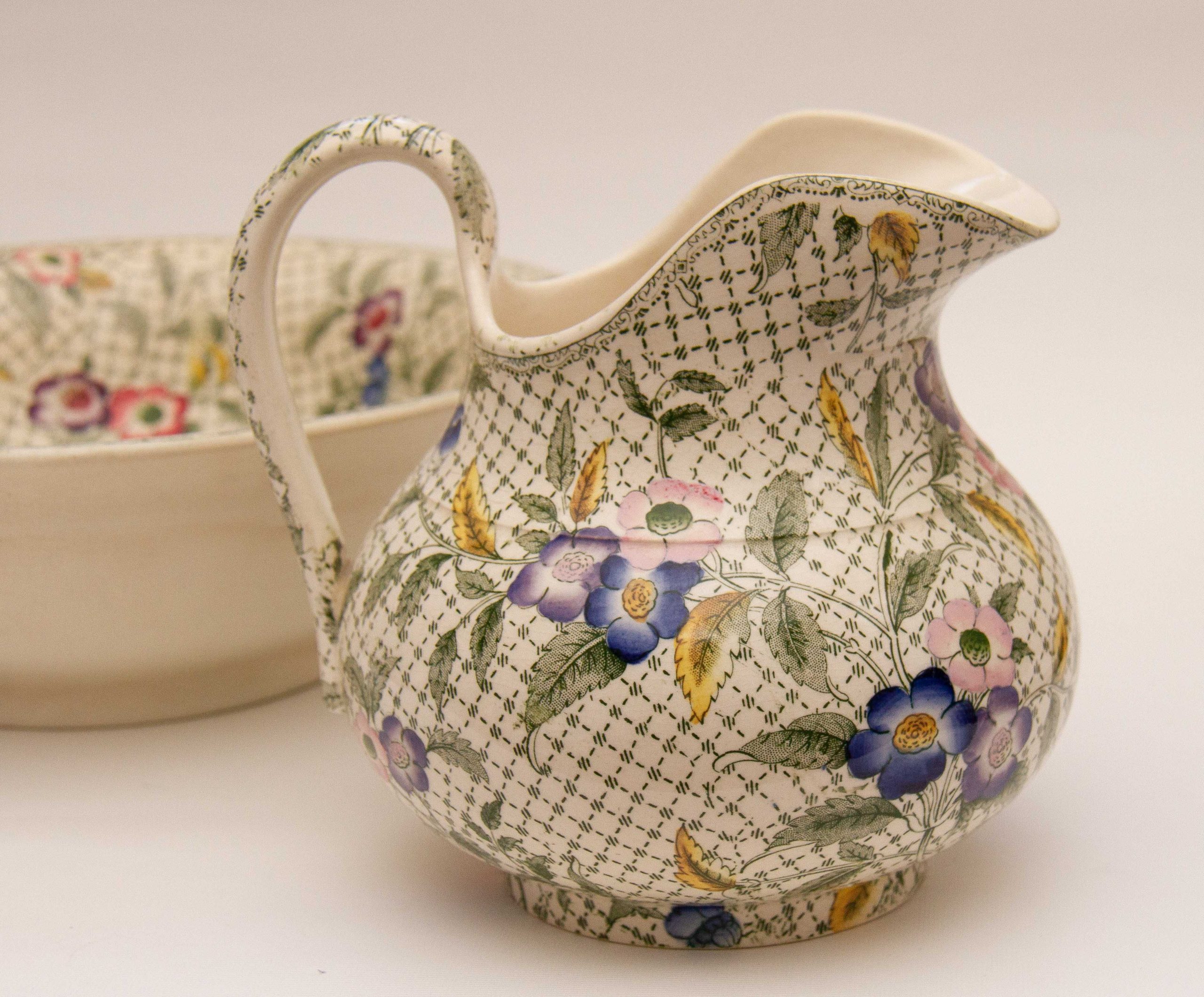 A rare antique Victorian Minton water jug and wash bowl set. Decorated in a green woven effect transfer pattern, overlaid with leaves and hand painted pink, blue and purple flowers.