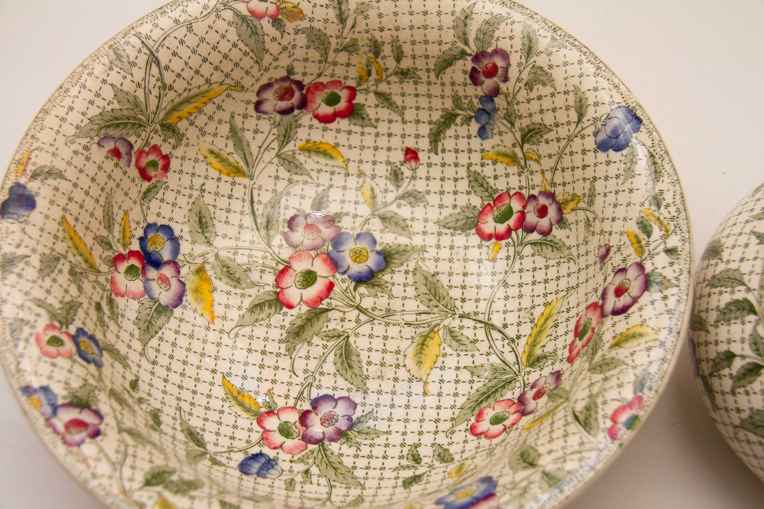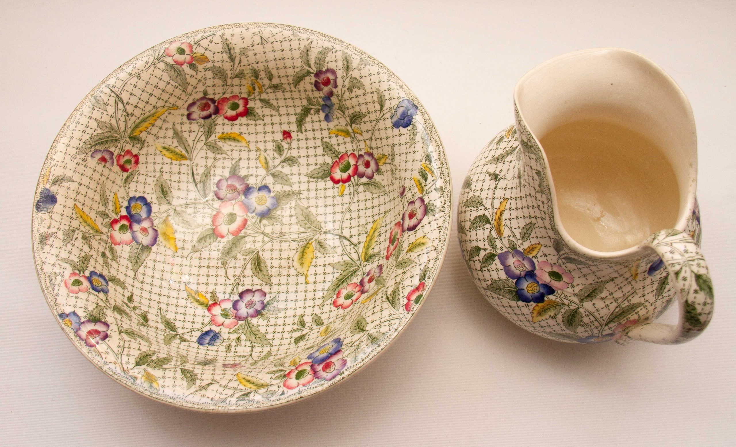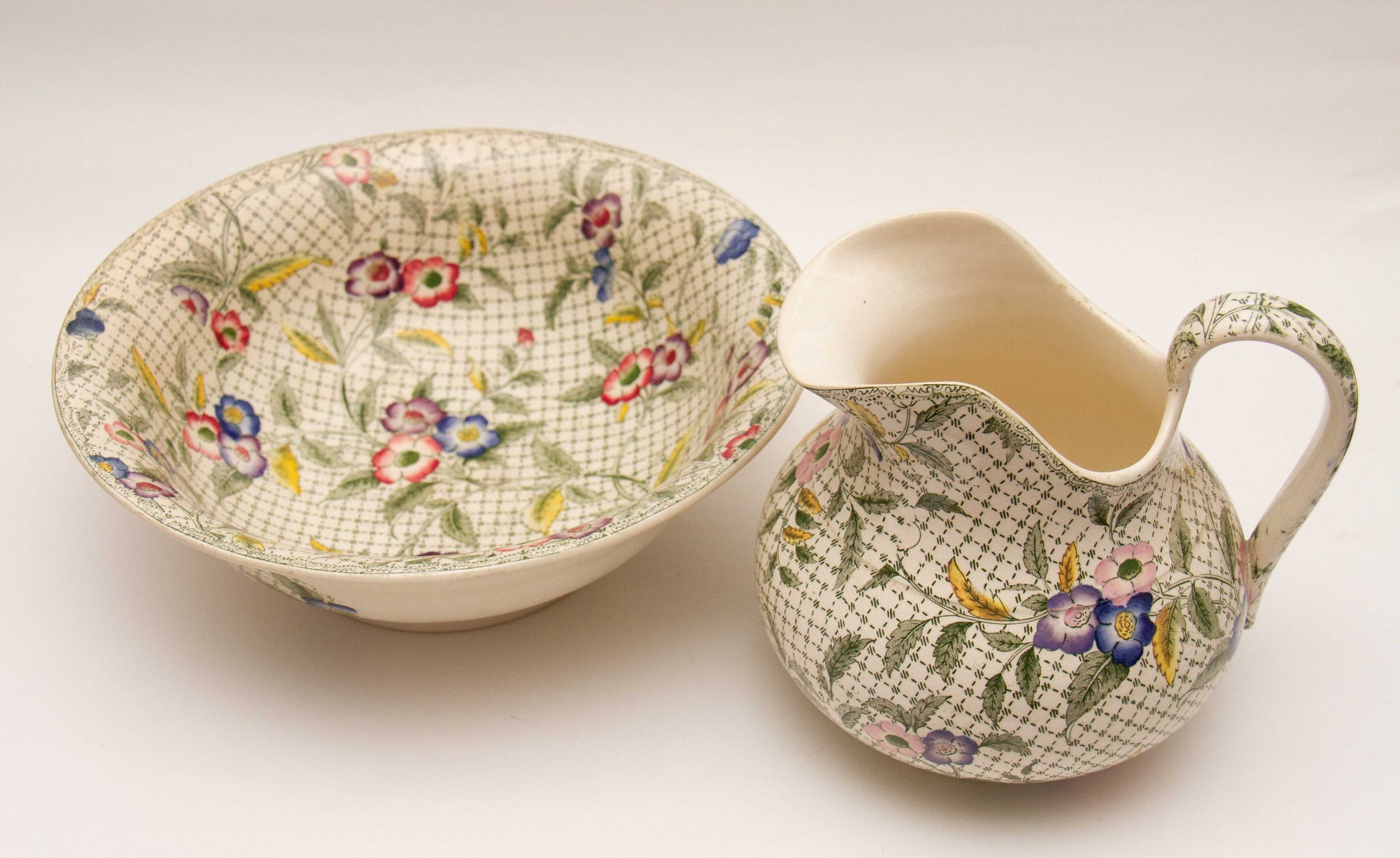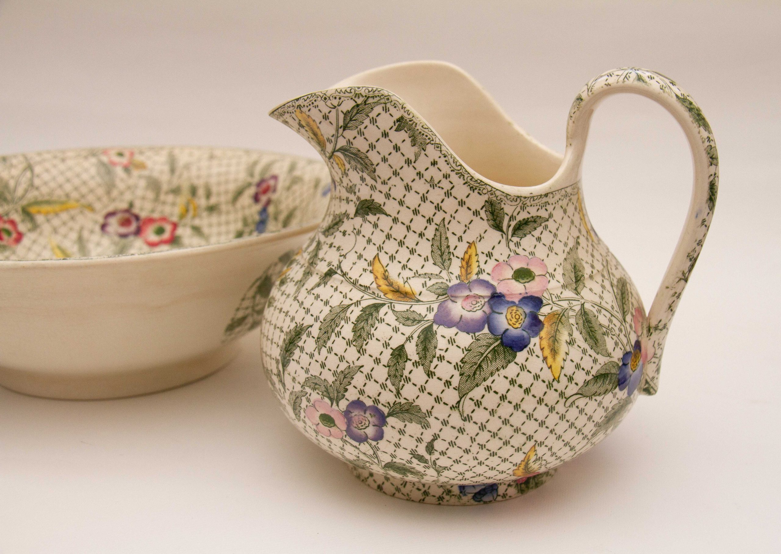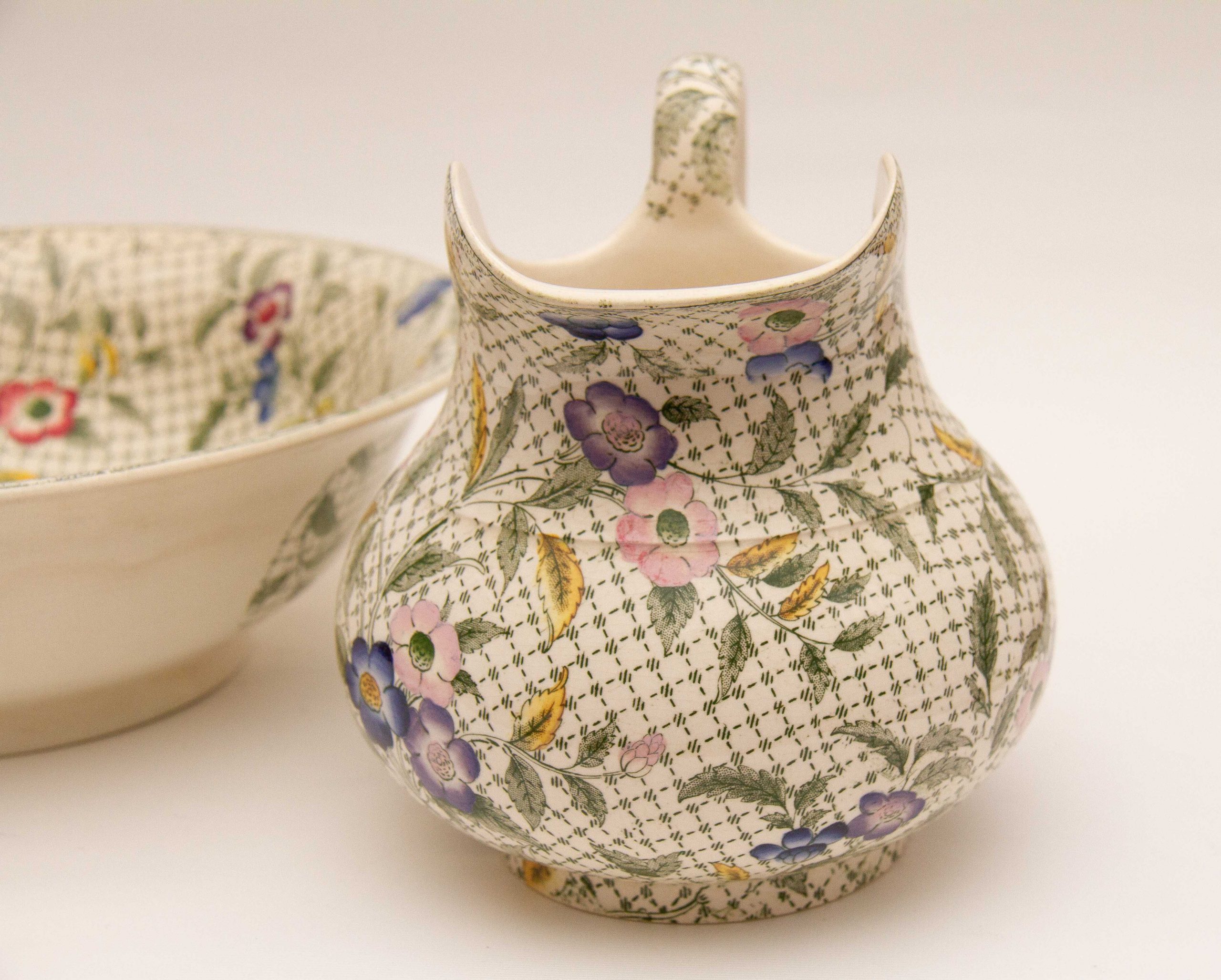 A rare antique Victorian Minton water jug and wash bowl set. Decorated in a green woven effect transfer pattern, overlaid with leaves and hand painted pink, blue and purple flowers.