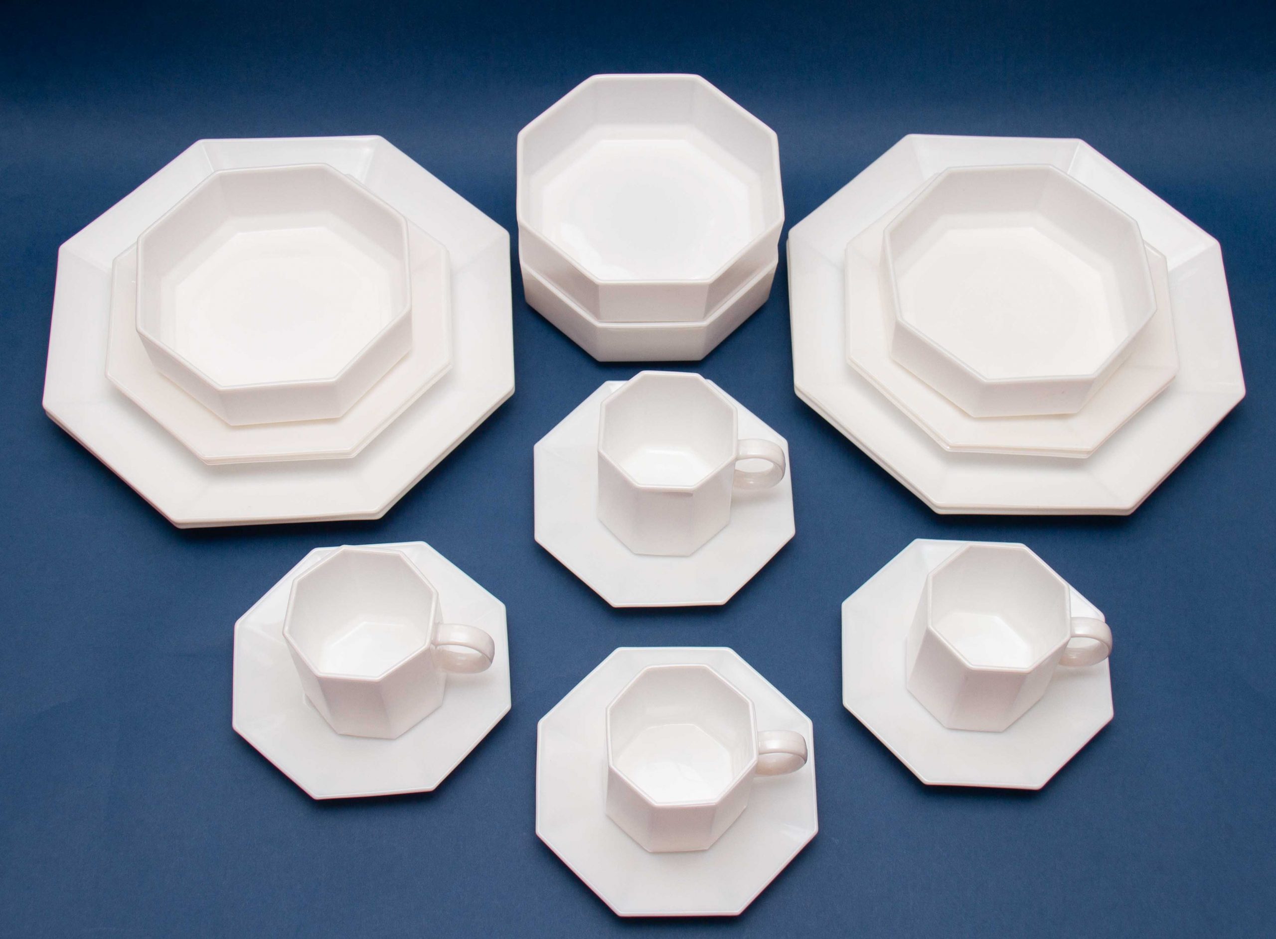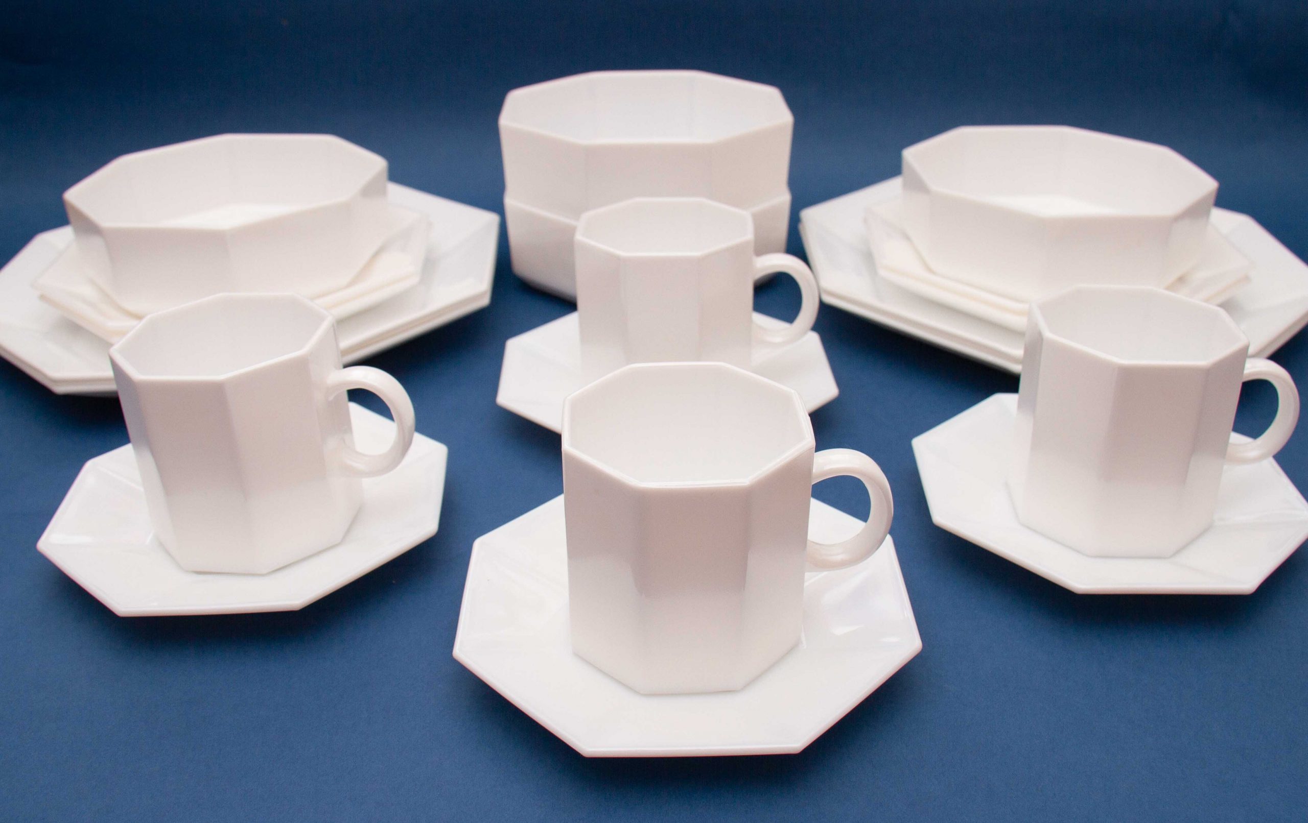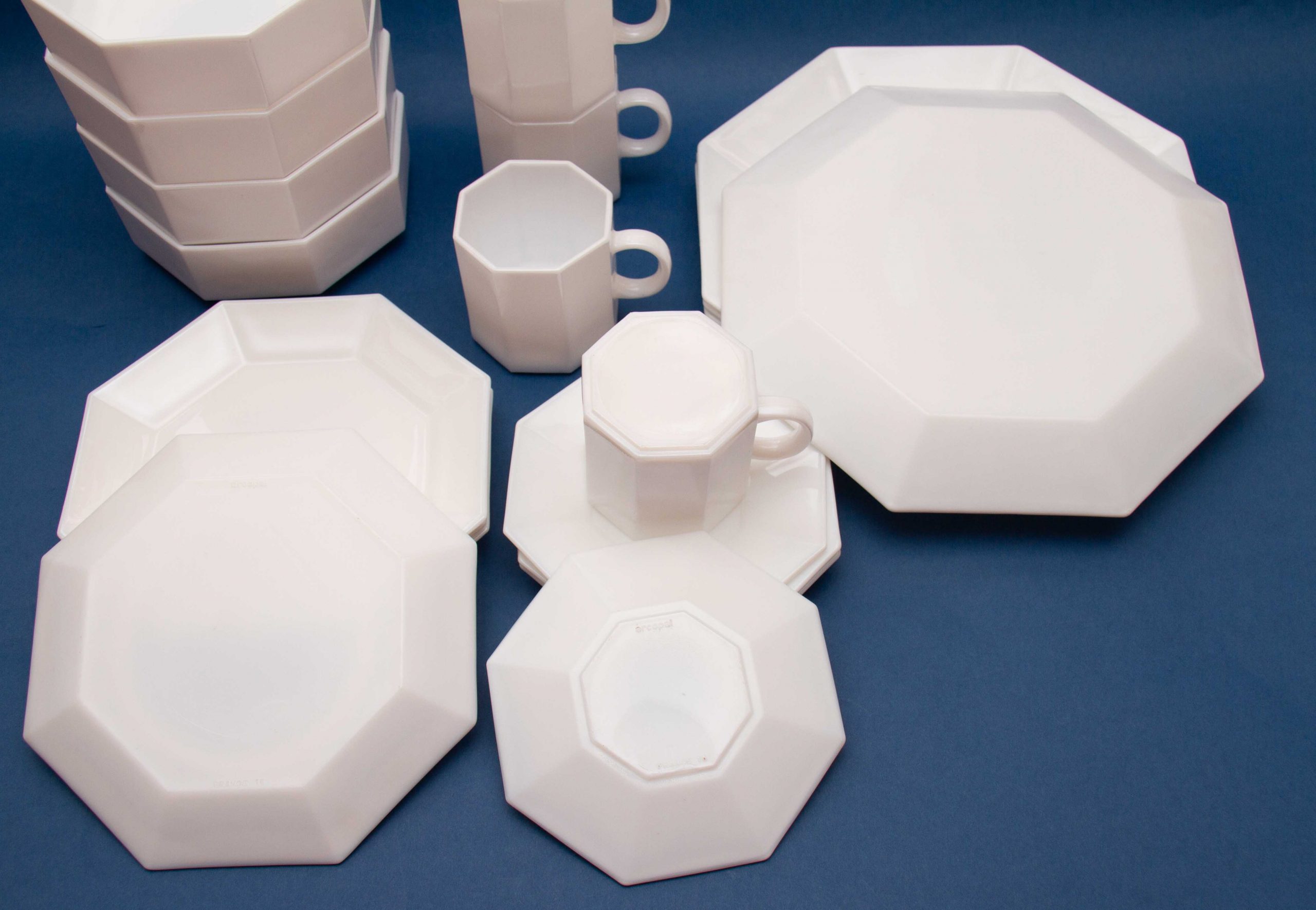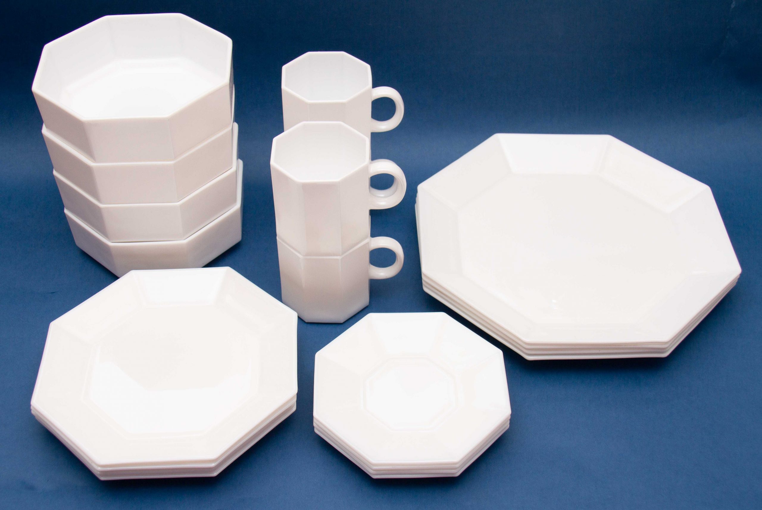 A 20 piece 4 person setting of Arcopol France Novoctime white/milk glass octagonal shaped table set. Dating from the 1980’s.