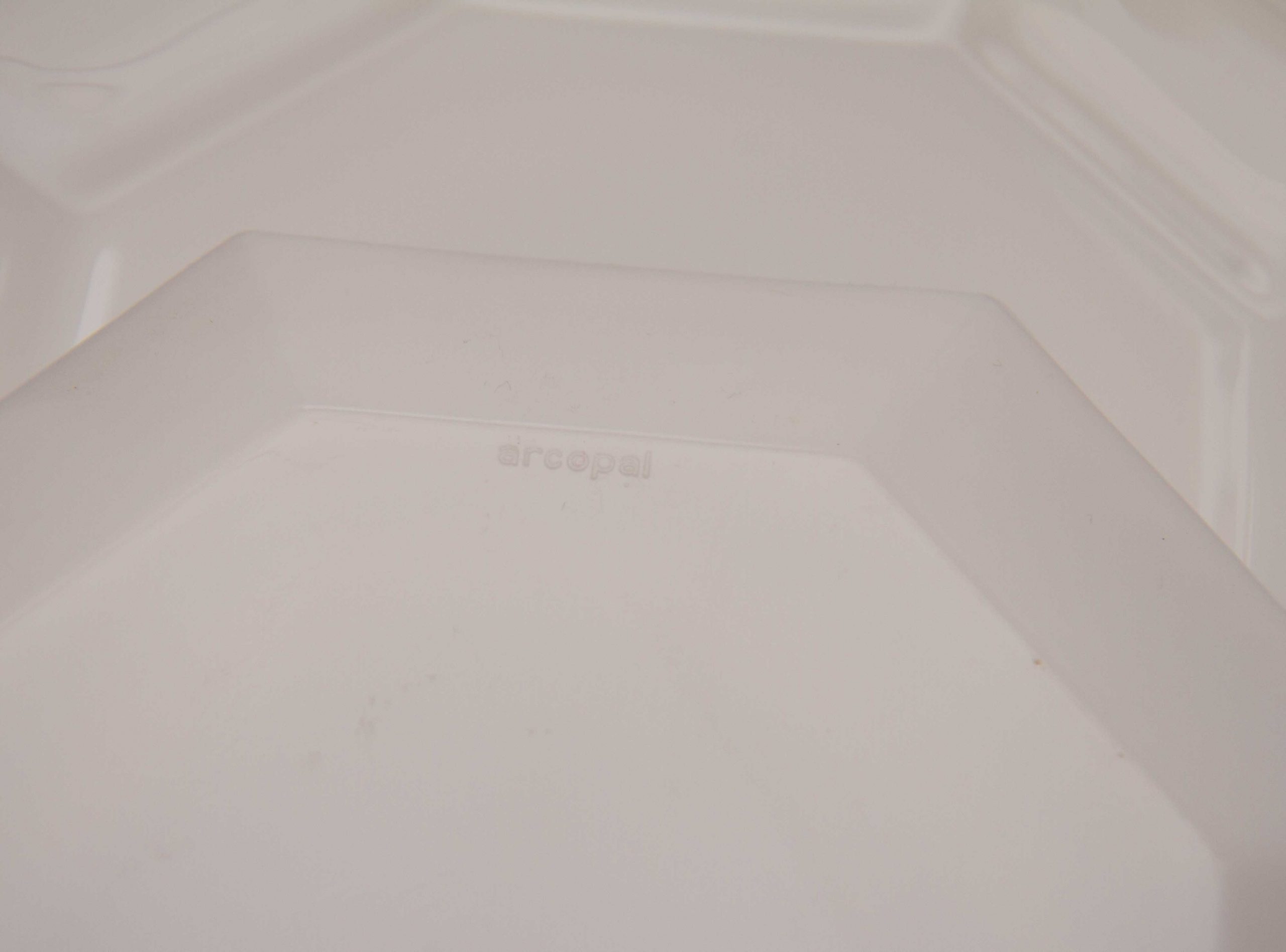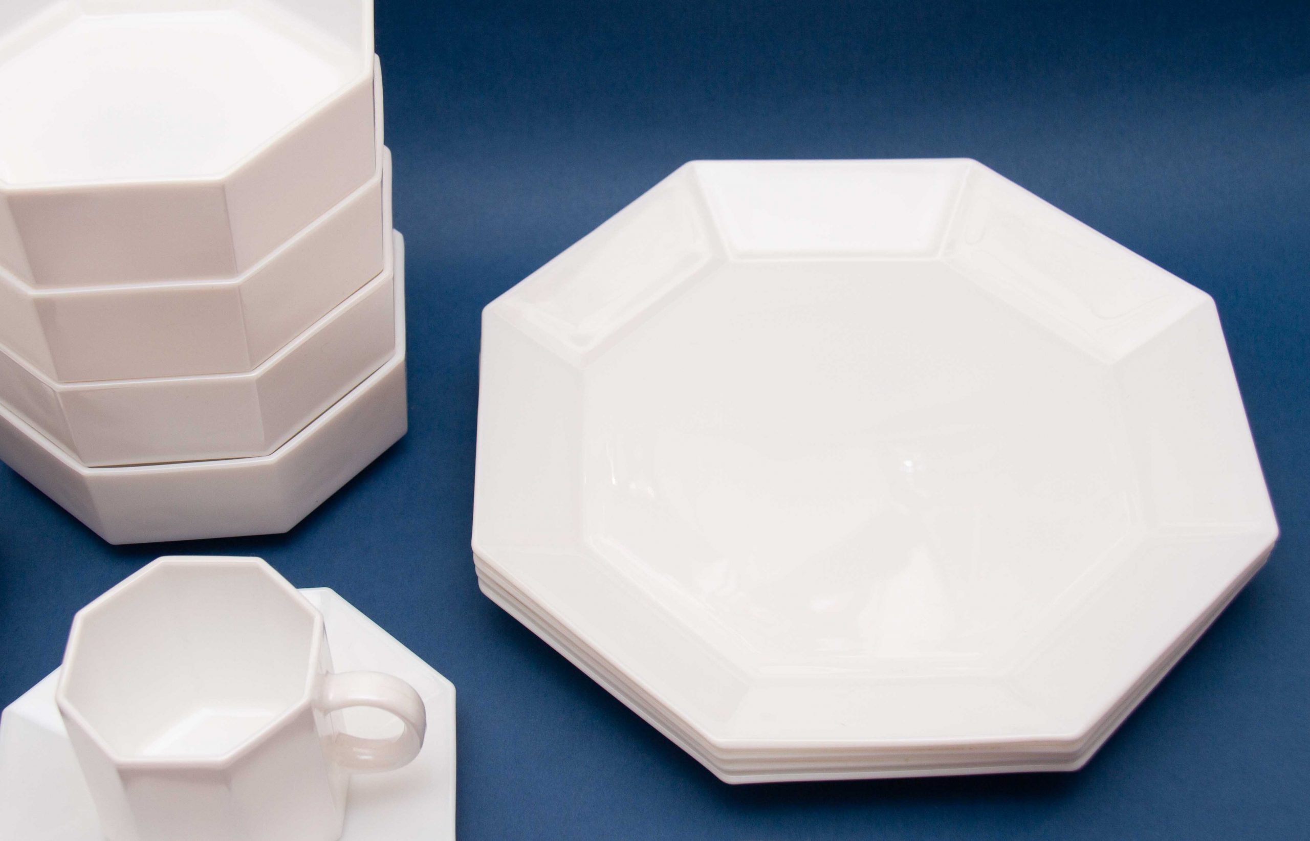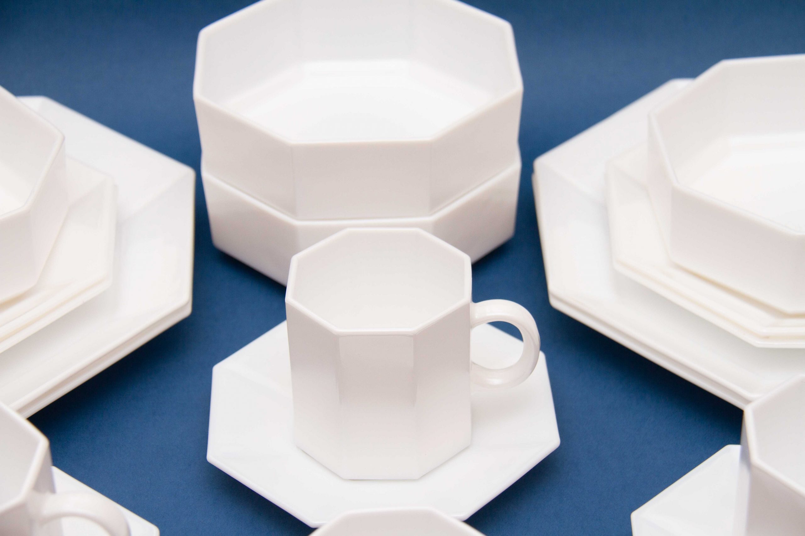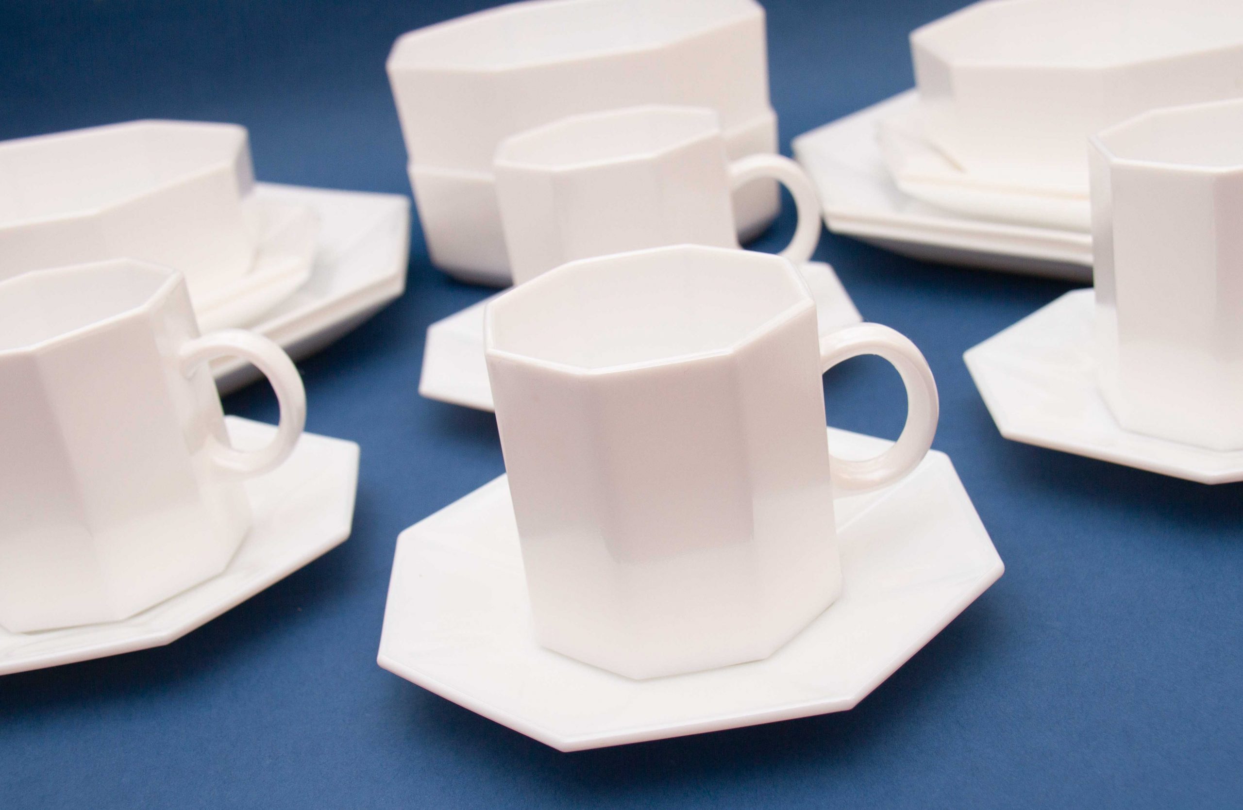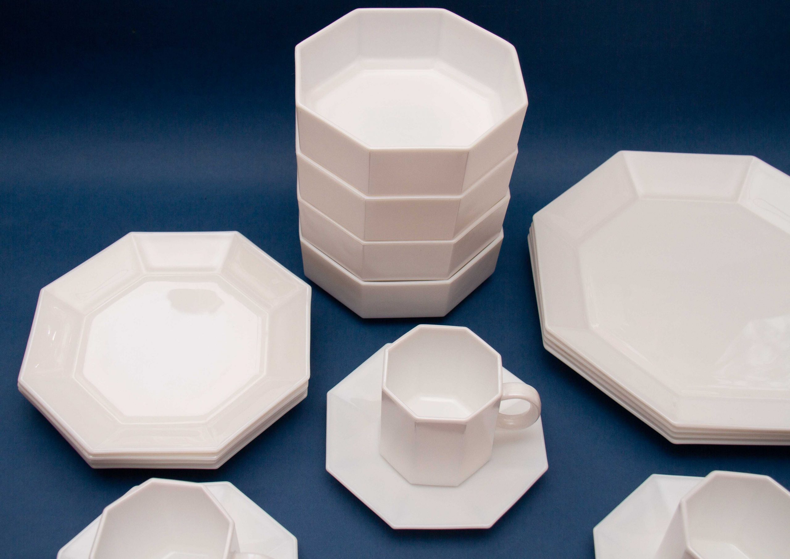 A 20 piece 4 person setting of Arcopol France Novoctime white/milk glass octagonal shaped table set. Dating from the 1980’s.