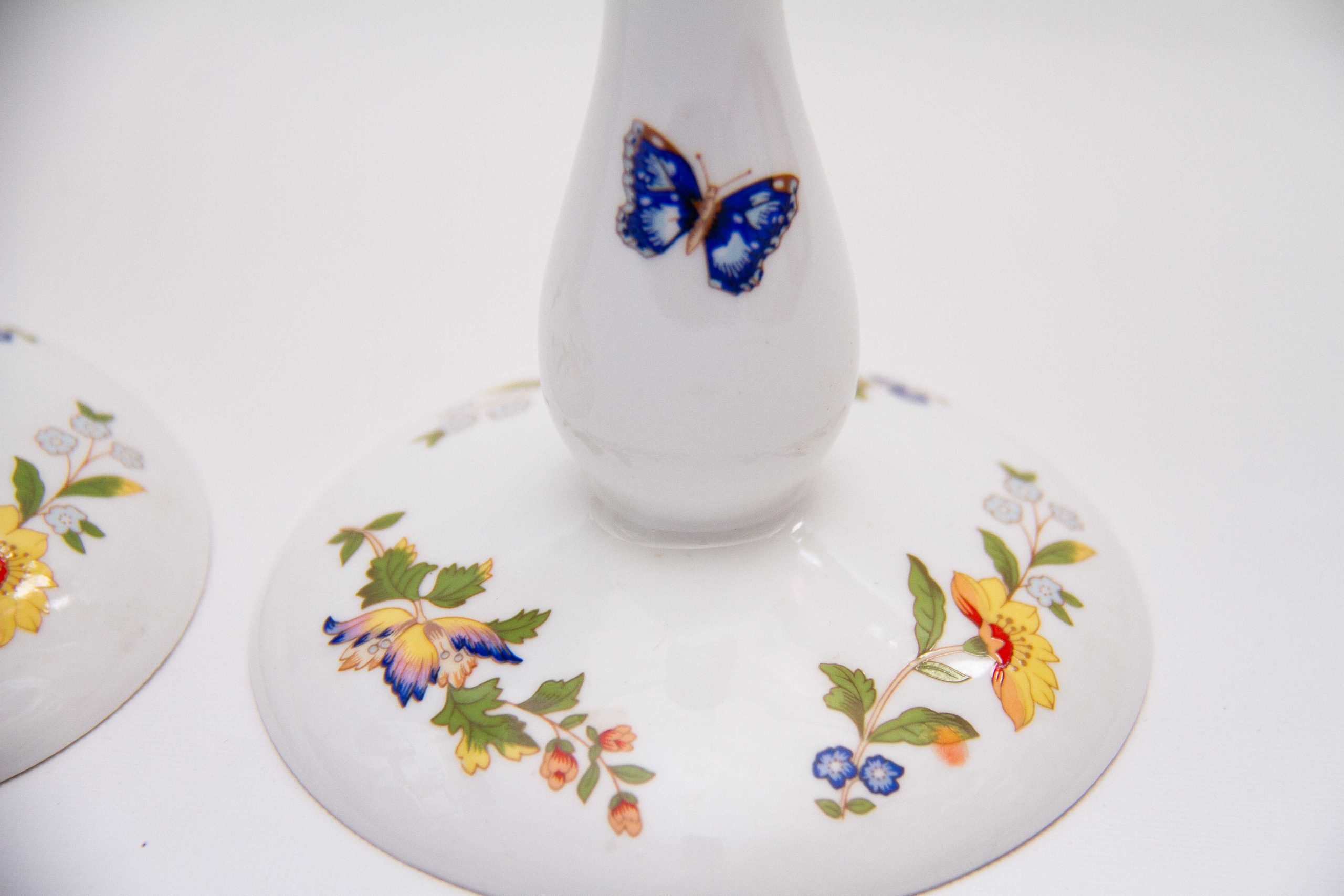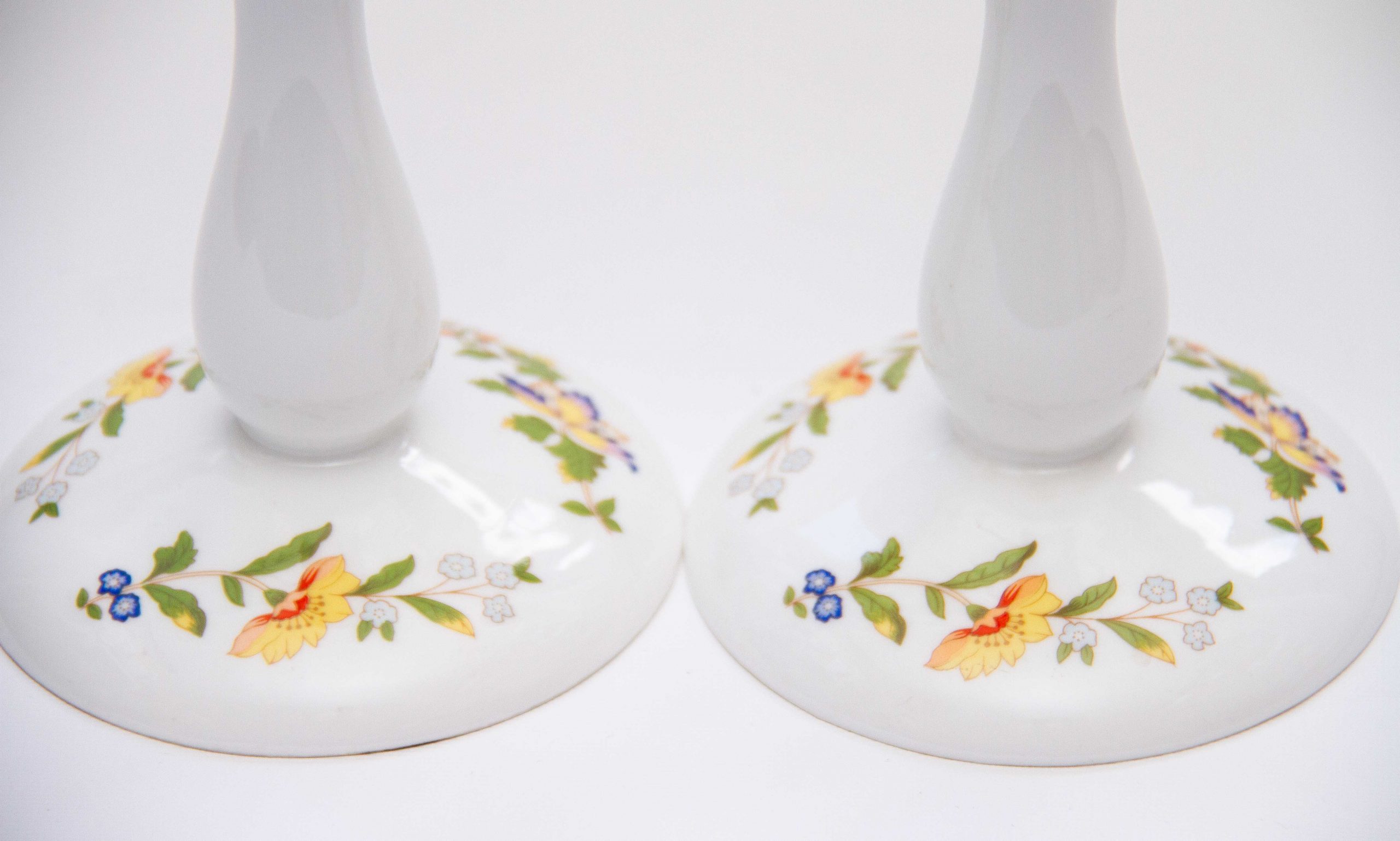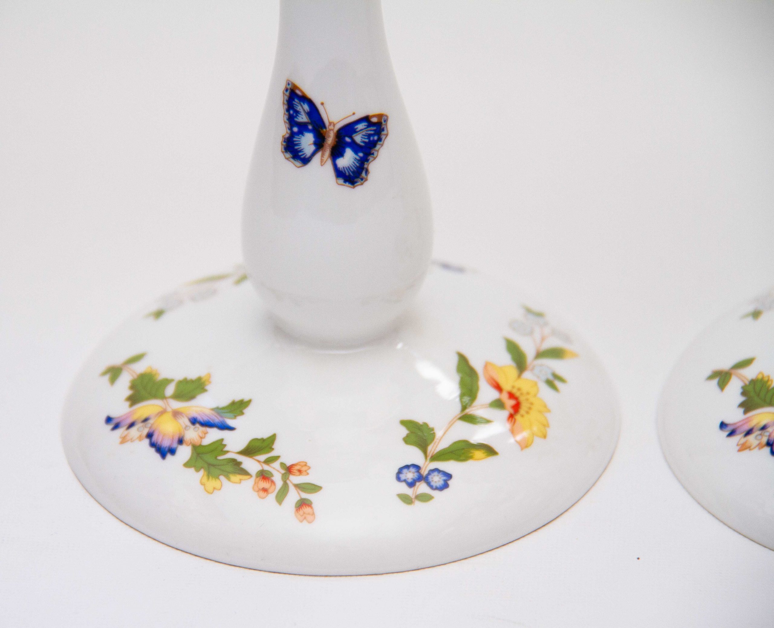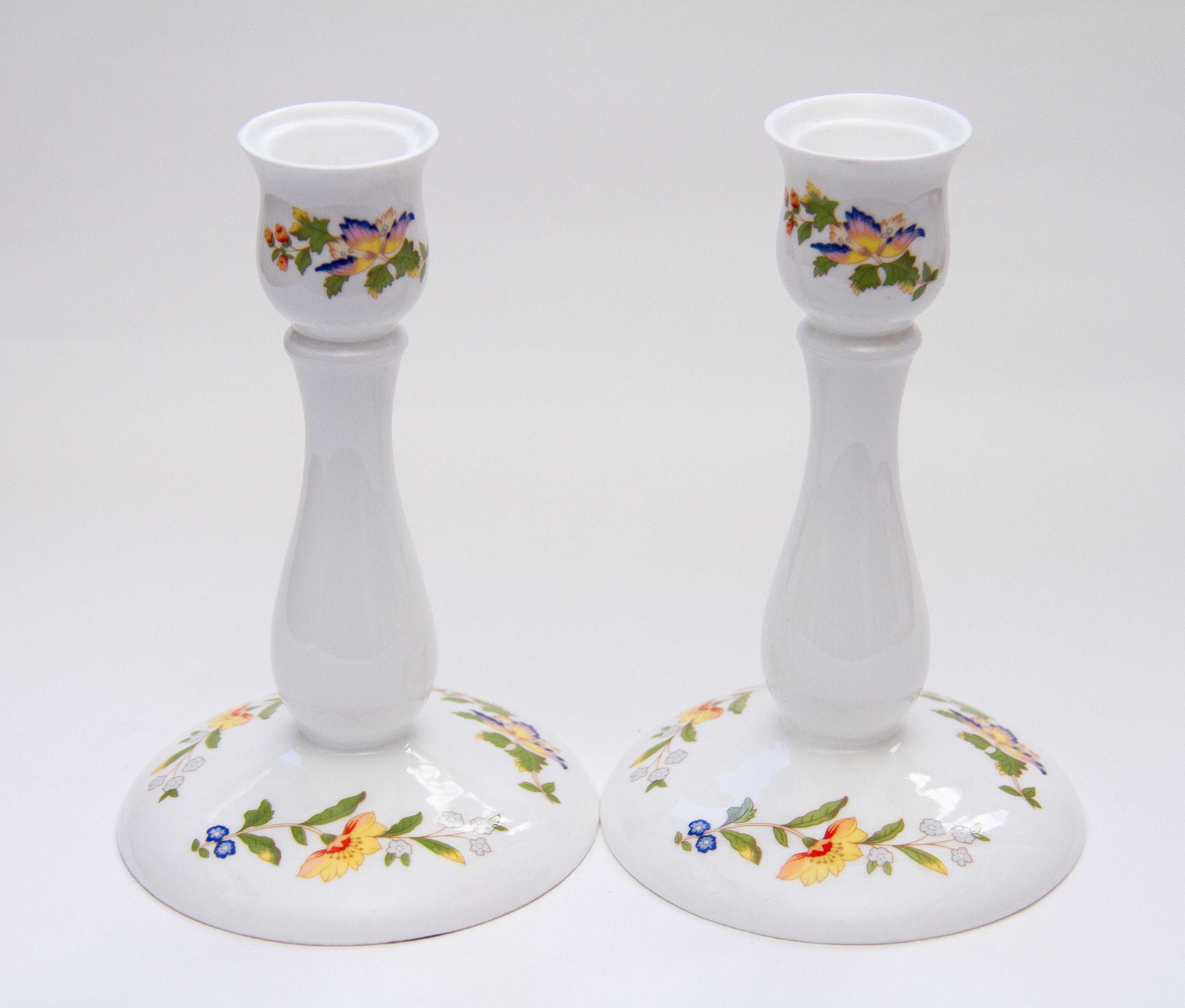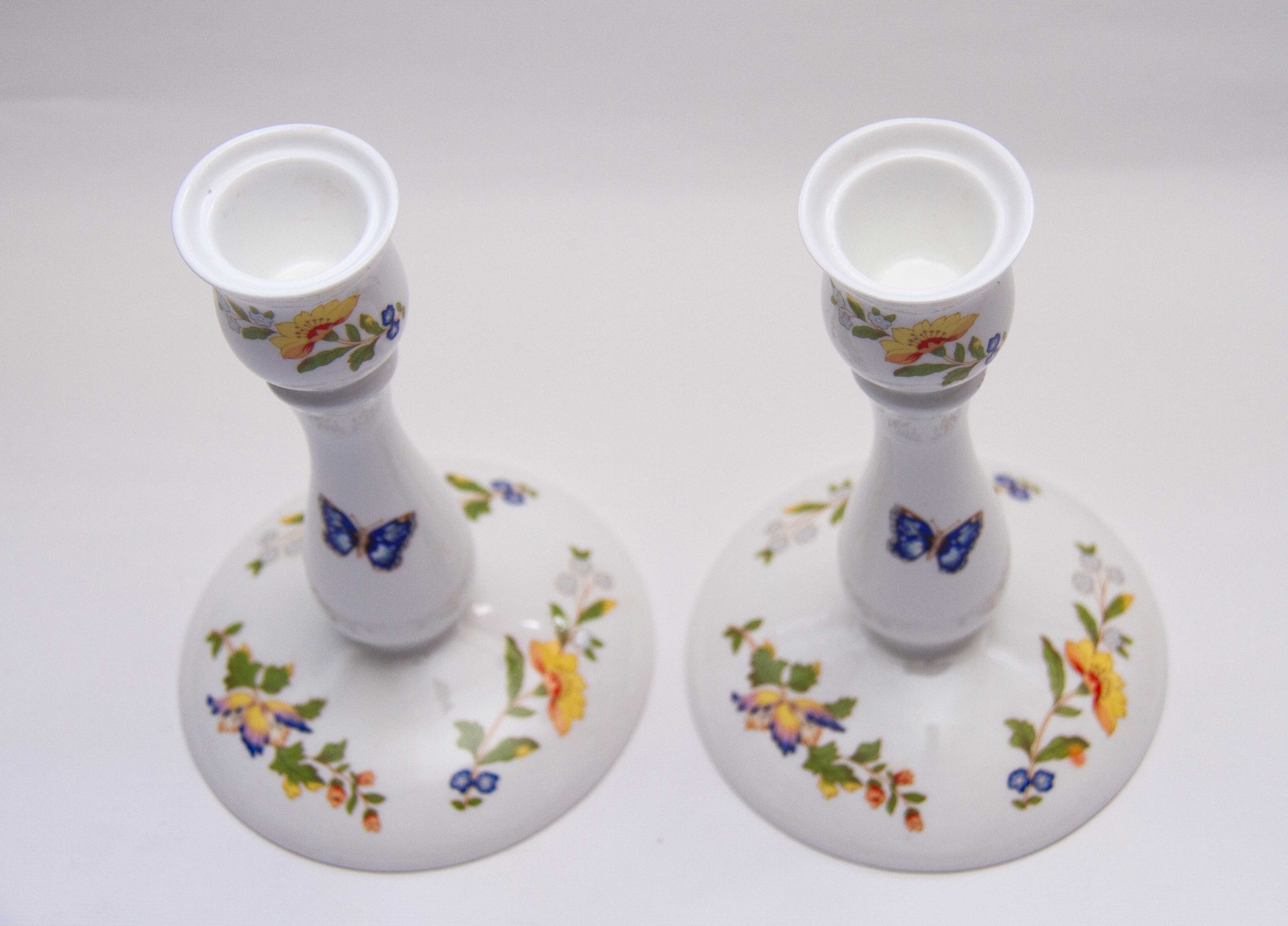 Aynsley Fine Bone China pair of tall candlesticks, decorated in The Cottage Garden pattern, depicting English country cottage flora and butterflies. Suitable for dinner/taper candles