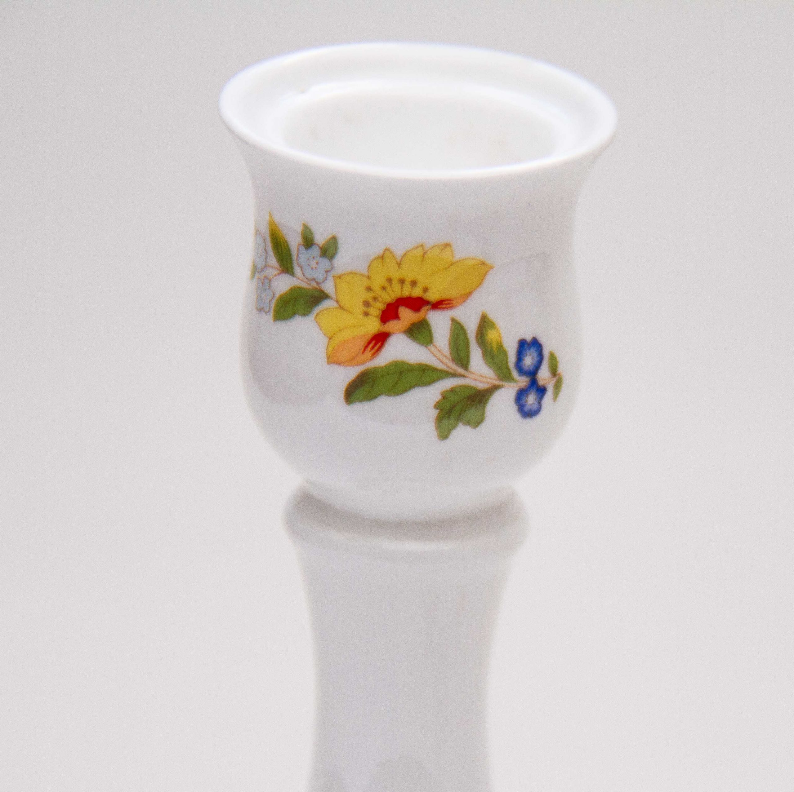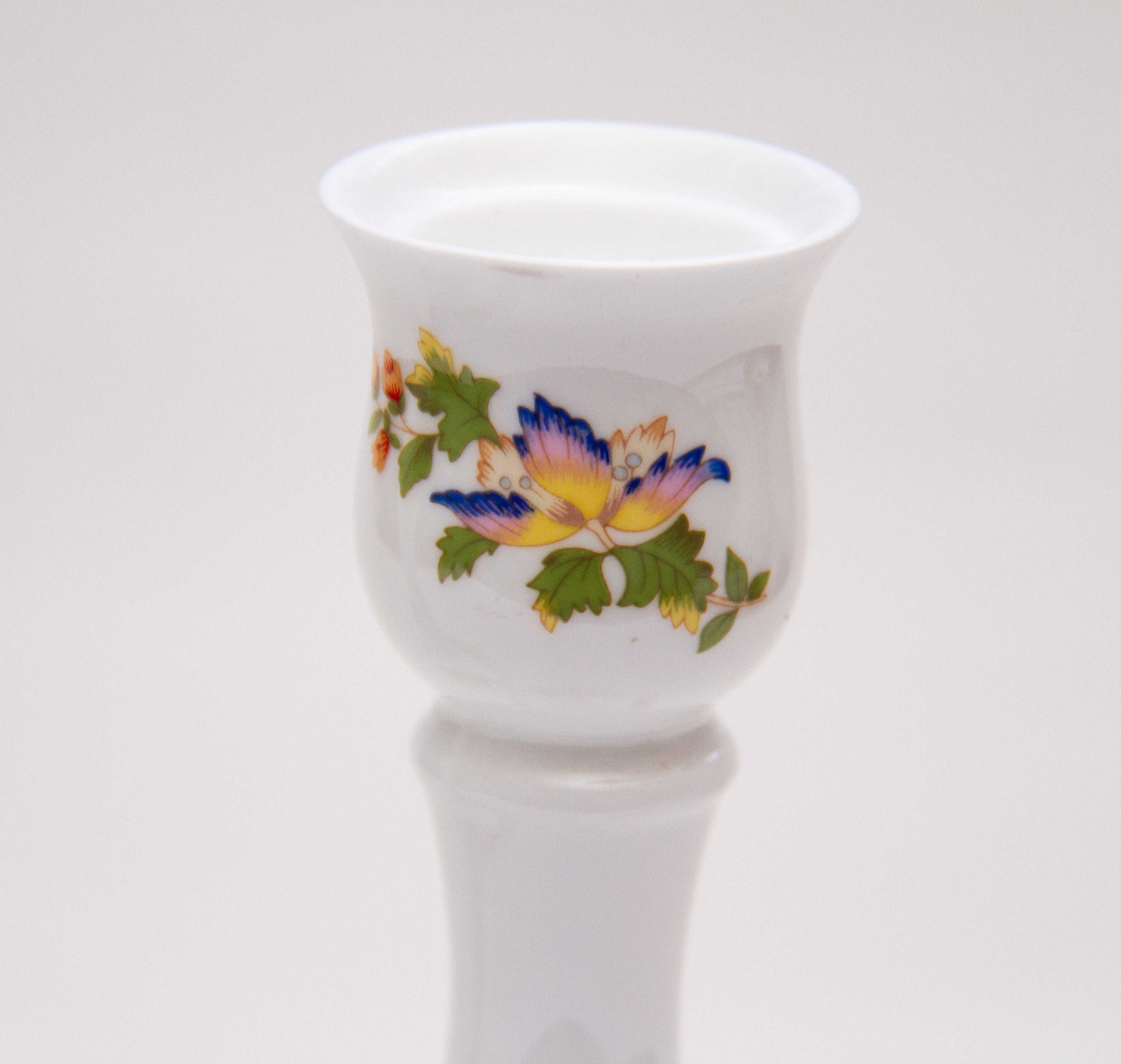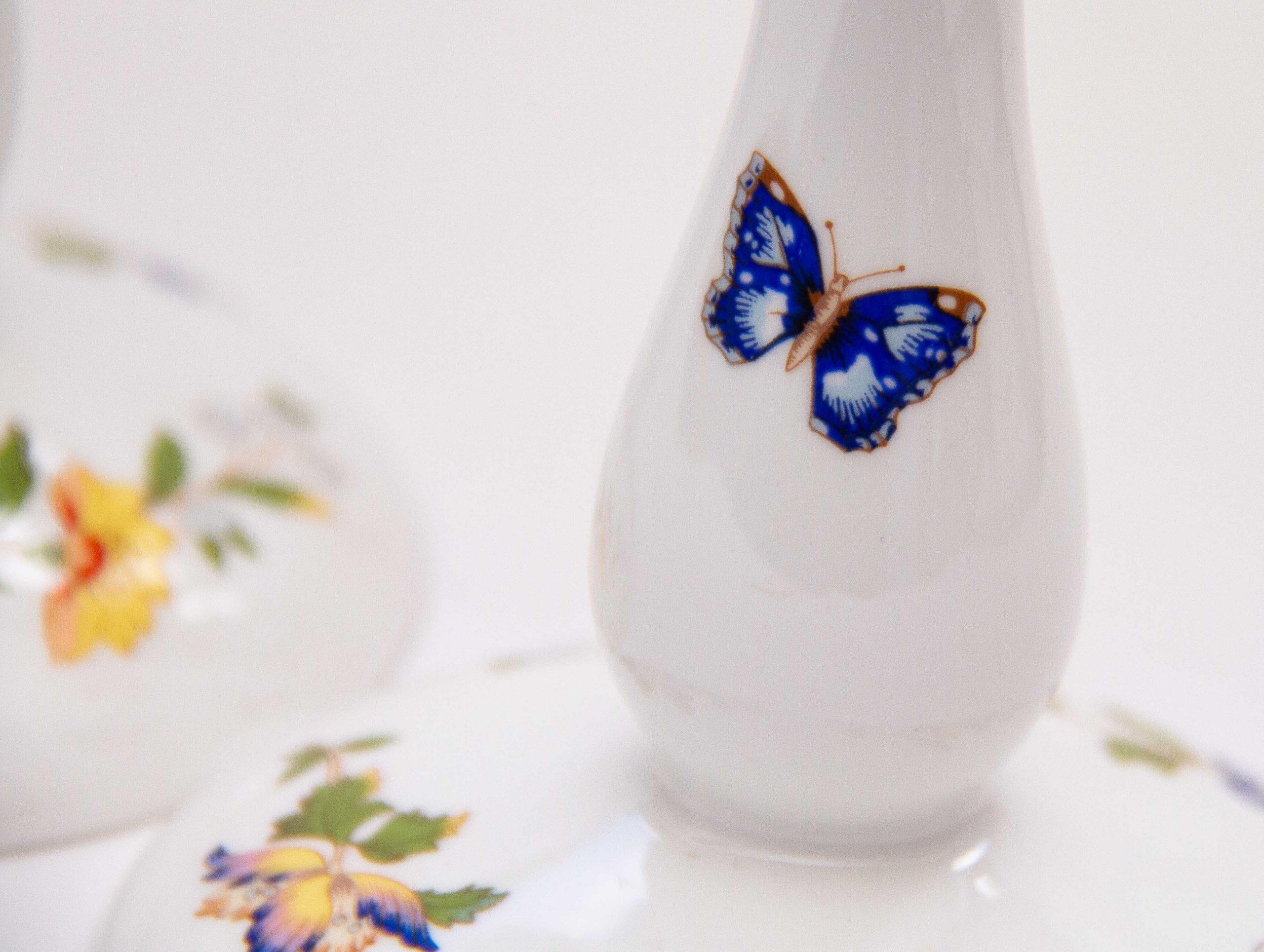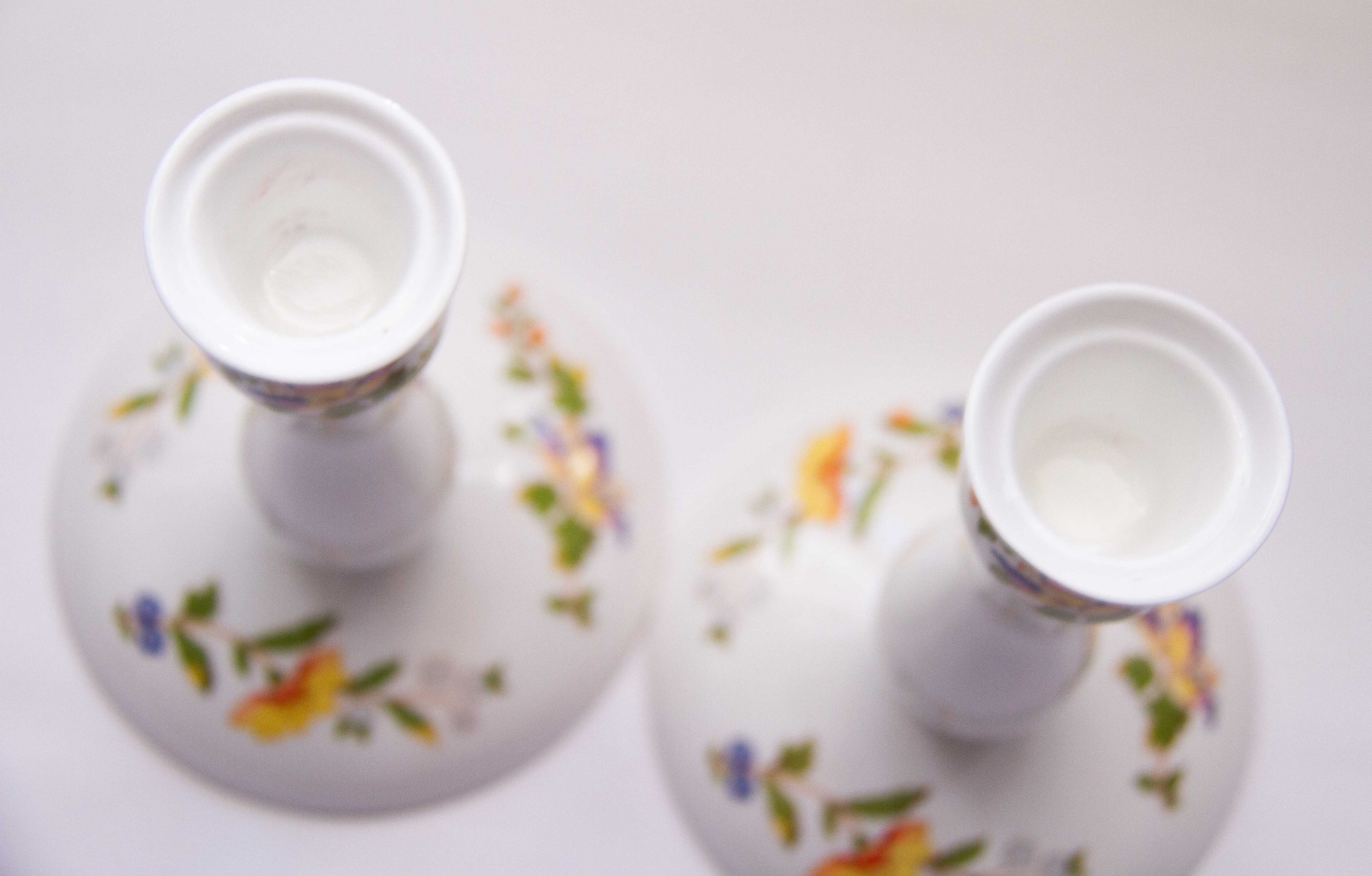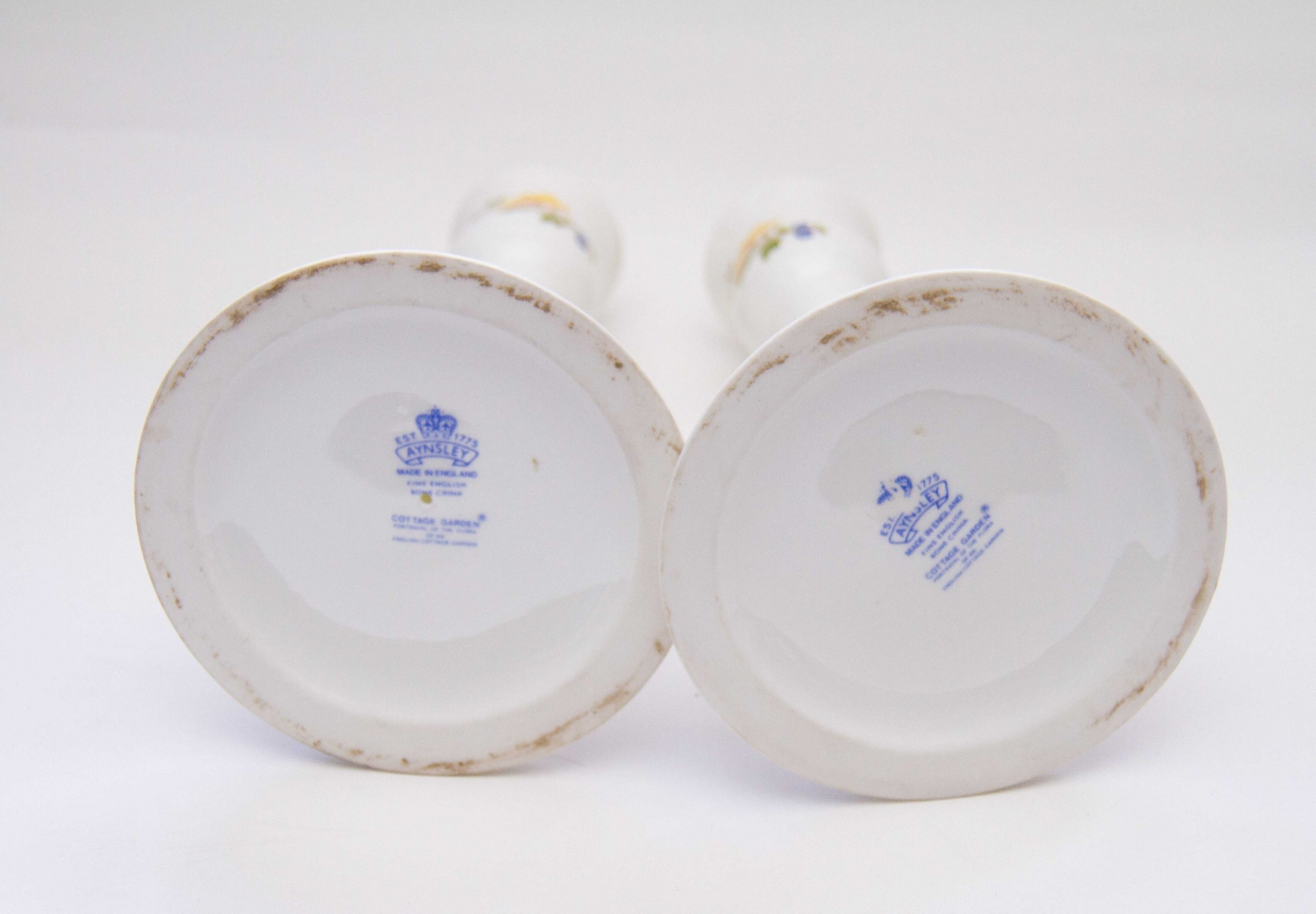 Aynsley Fine Bone China pair of tall candlesticks, decorated in The Cottage Garden pattern, depicting English country cottage flora and butterflies. Suitable for dinner/taper candles