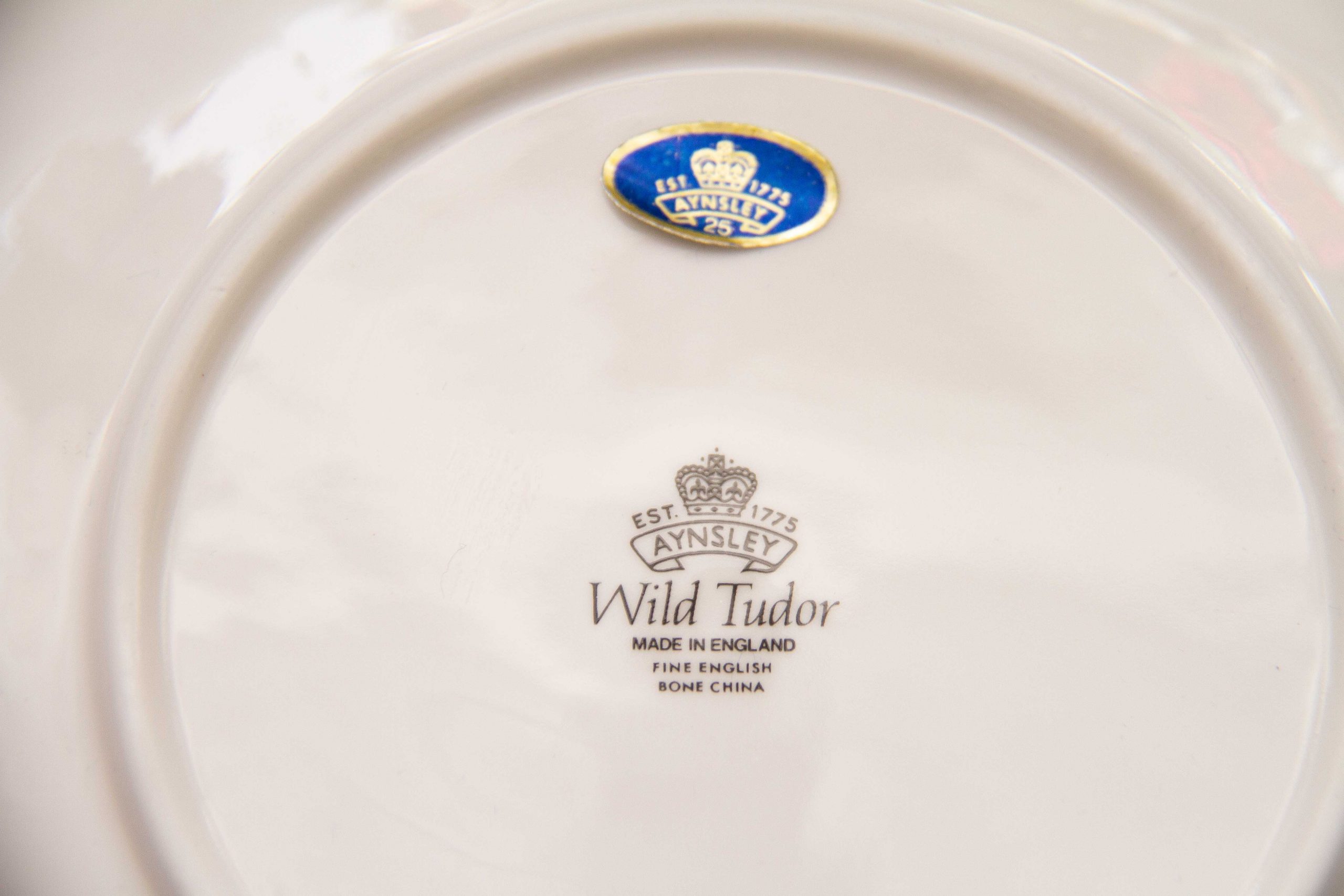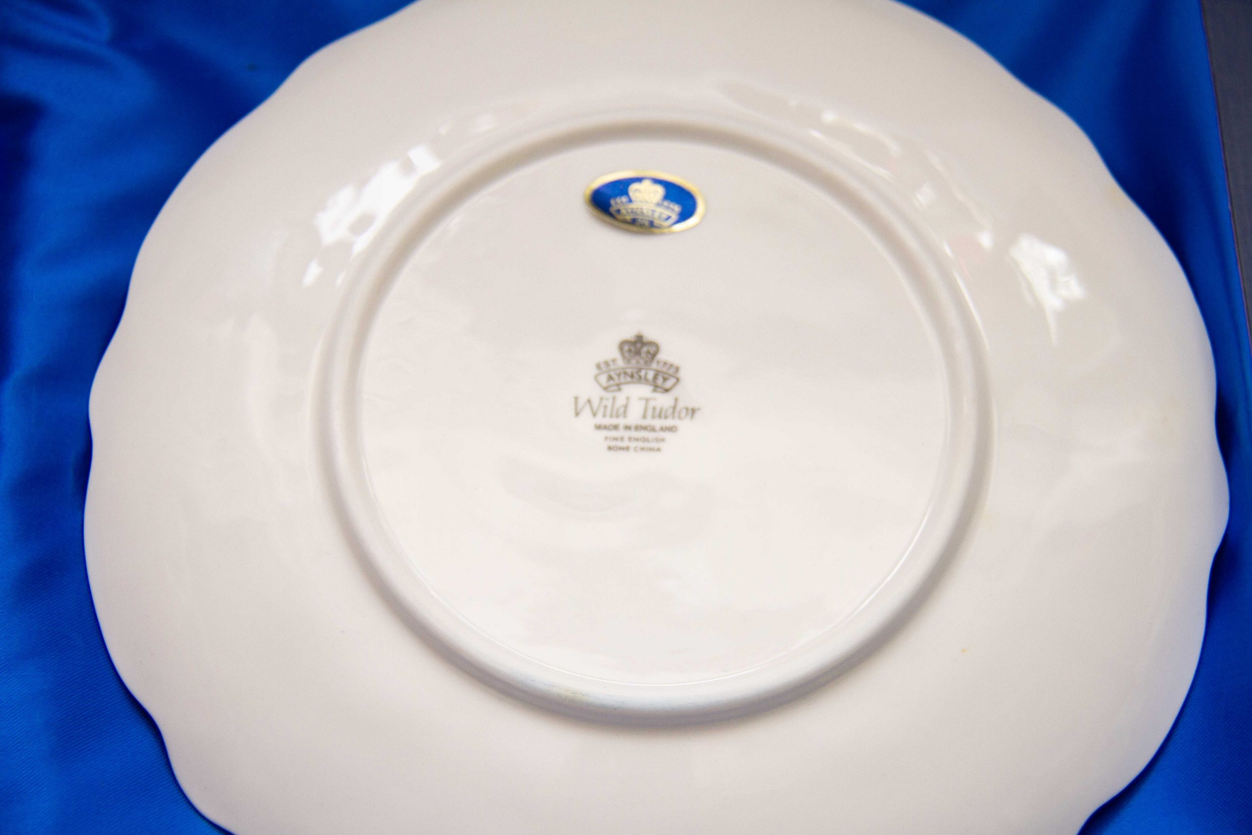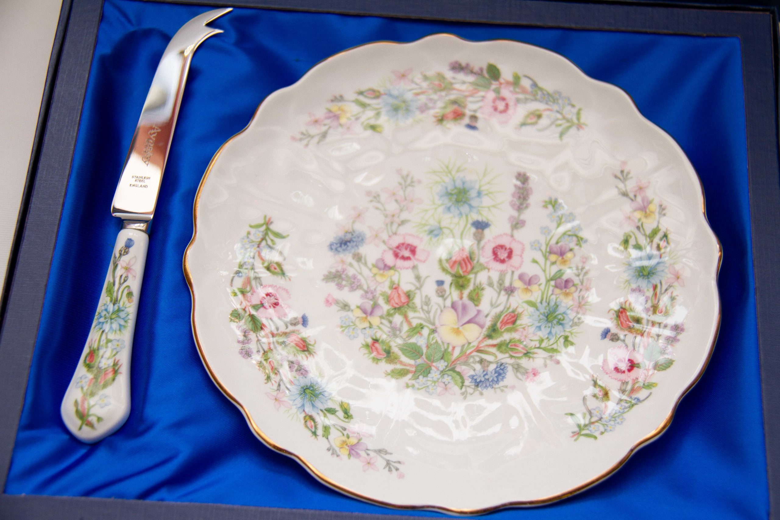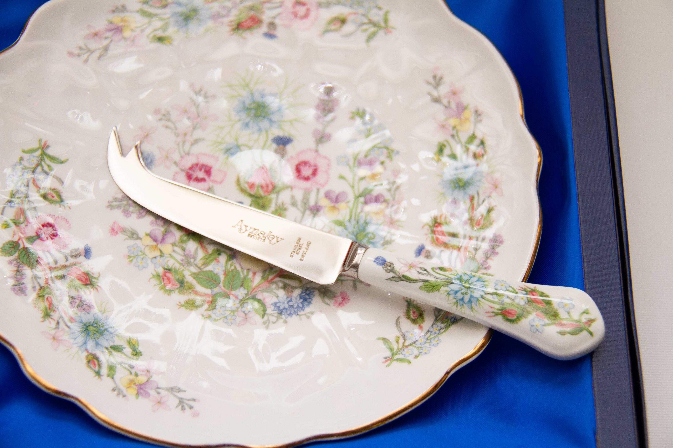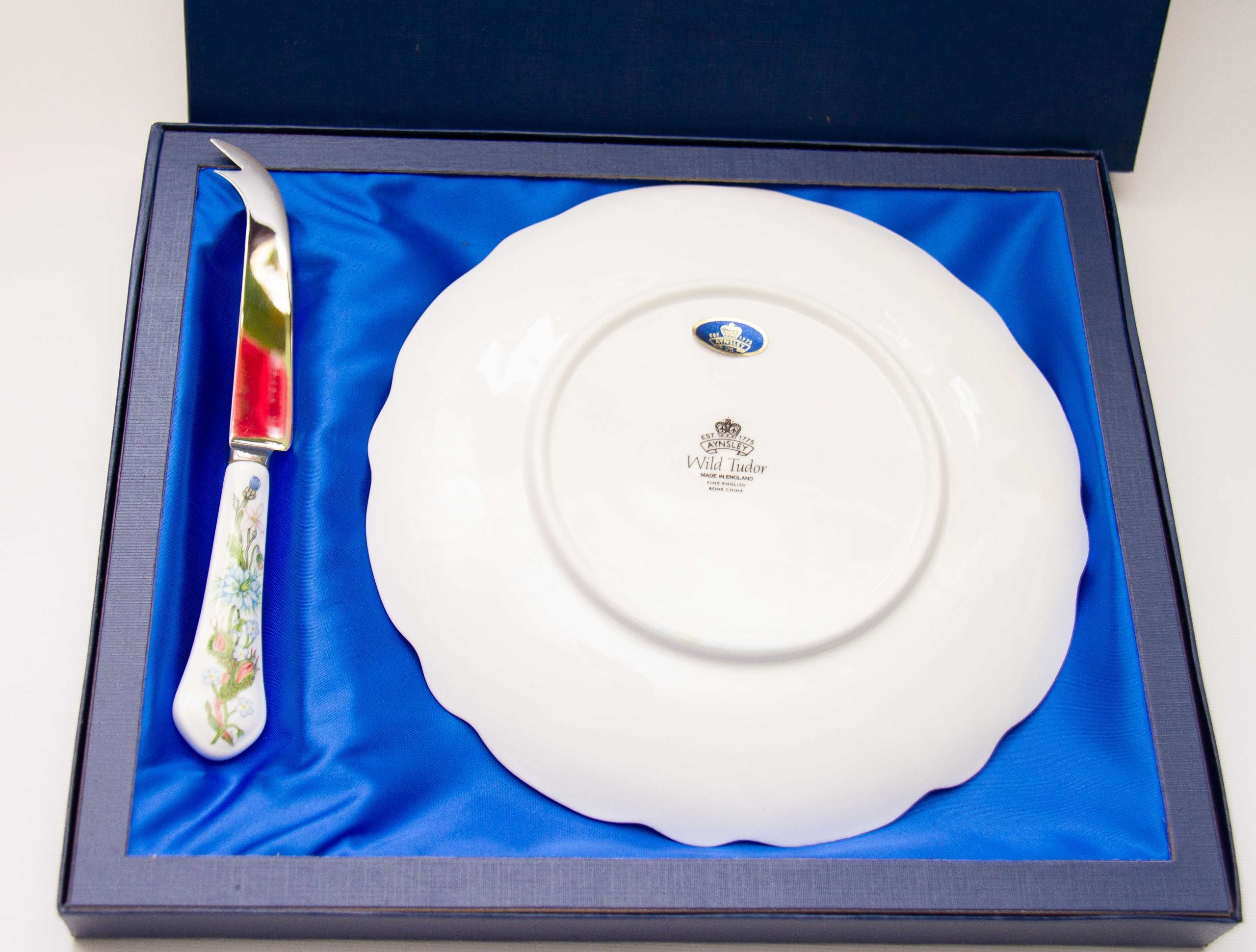 Aynsley Fine Bone China cheese serving plate and cheese knife set complete in original box. Decorated in The Wild Tudor pattern.