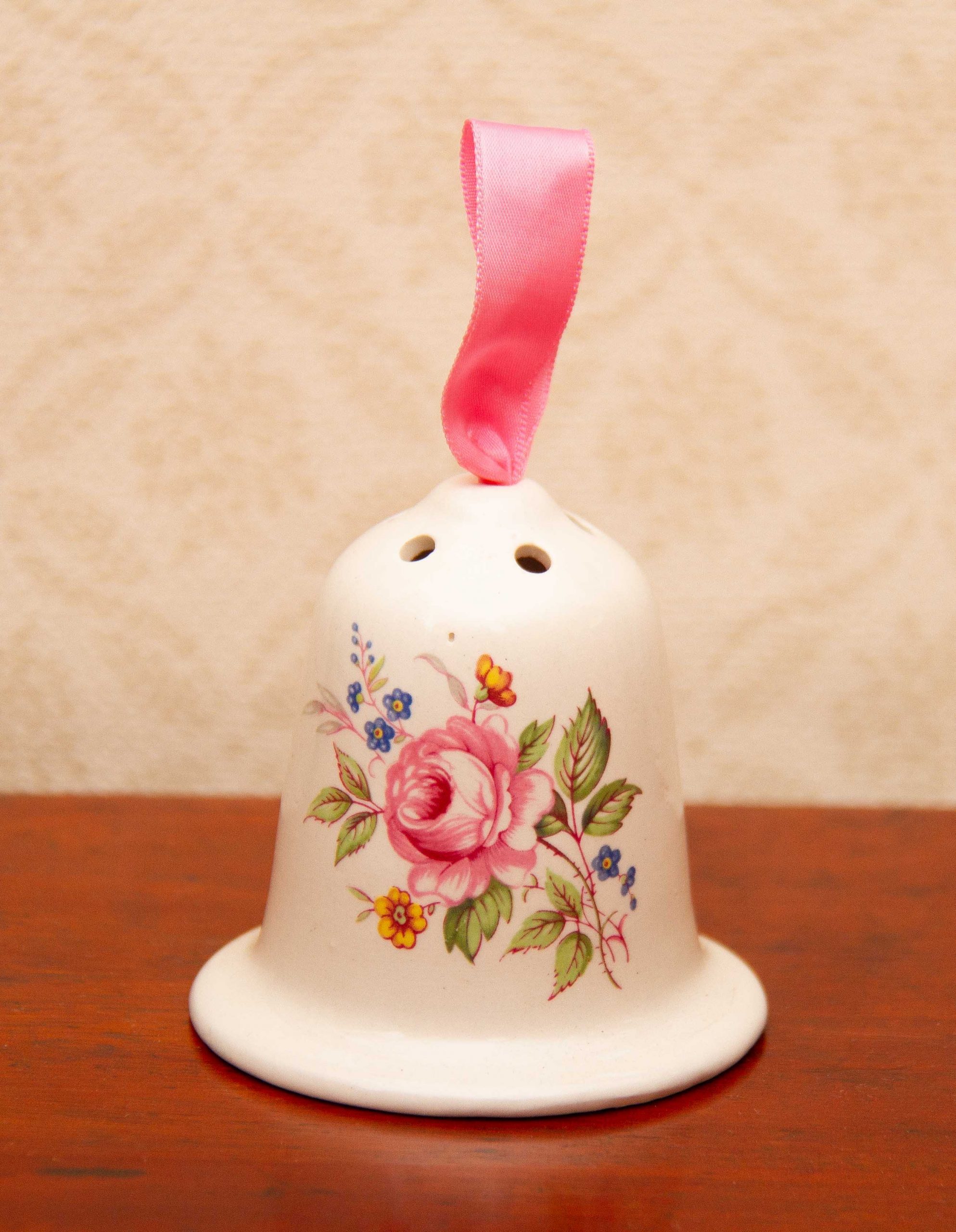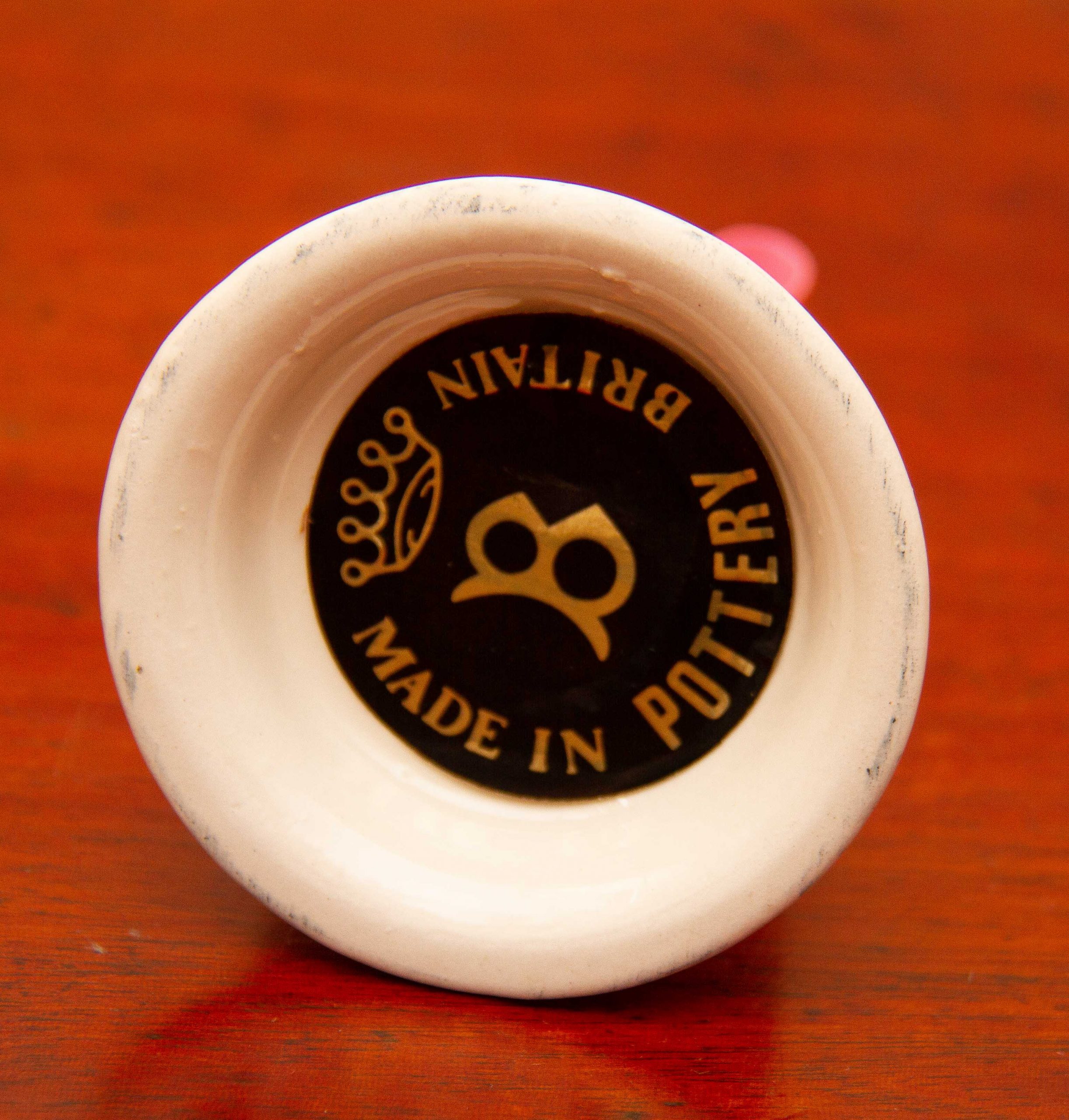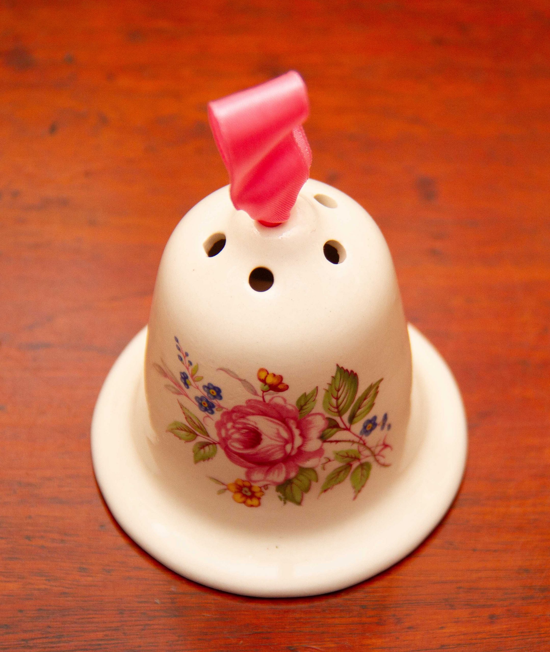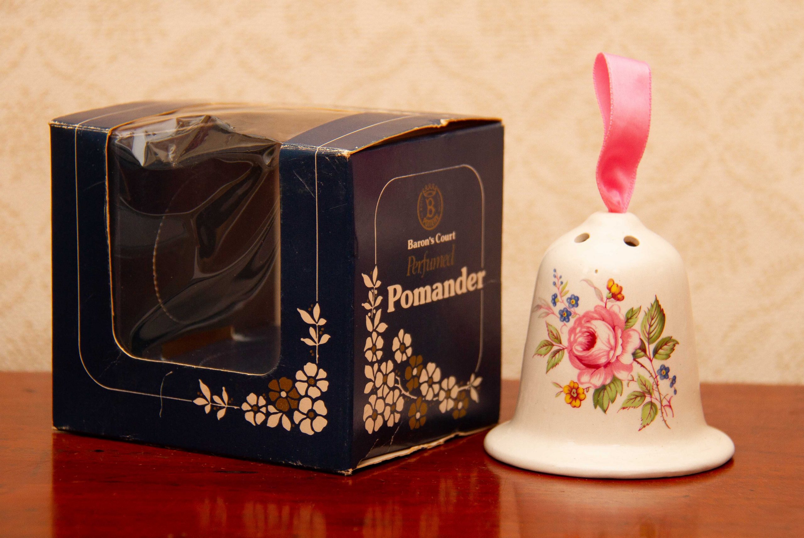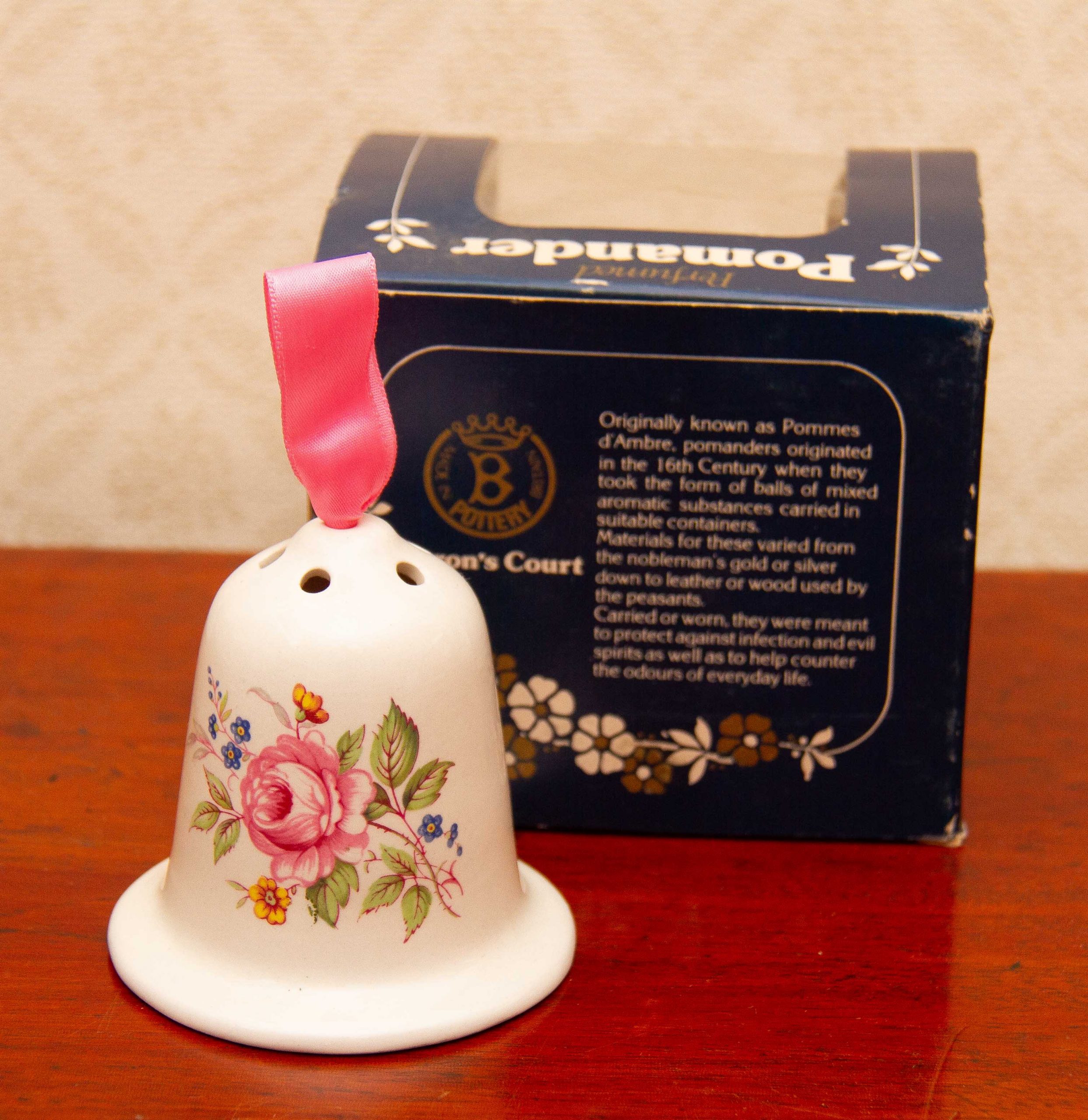 A vintage ceramic Baron’s Court perfumed Pomander, with a pink floral design on. The label on the base can be removed, so that it can be filled with pot pourri, or moth repellent, to keep your wardrobe or linen cupboard smelling nice and moth free.