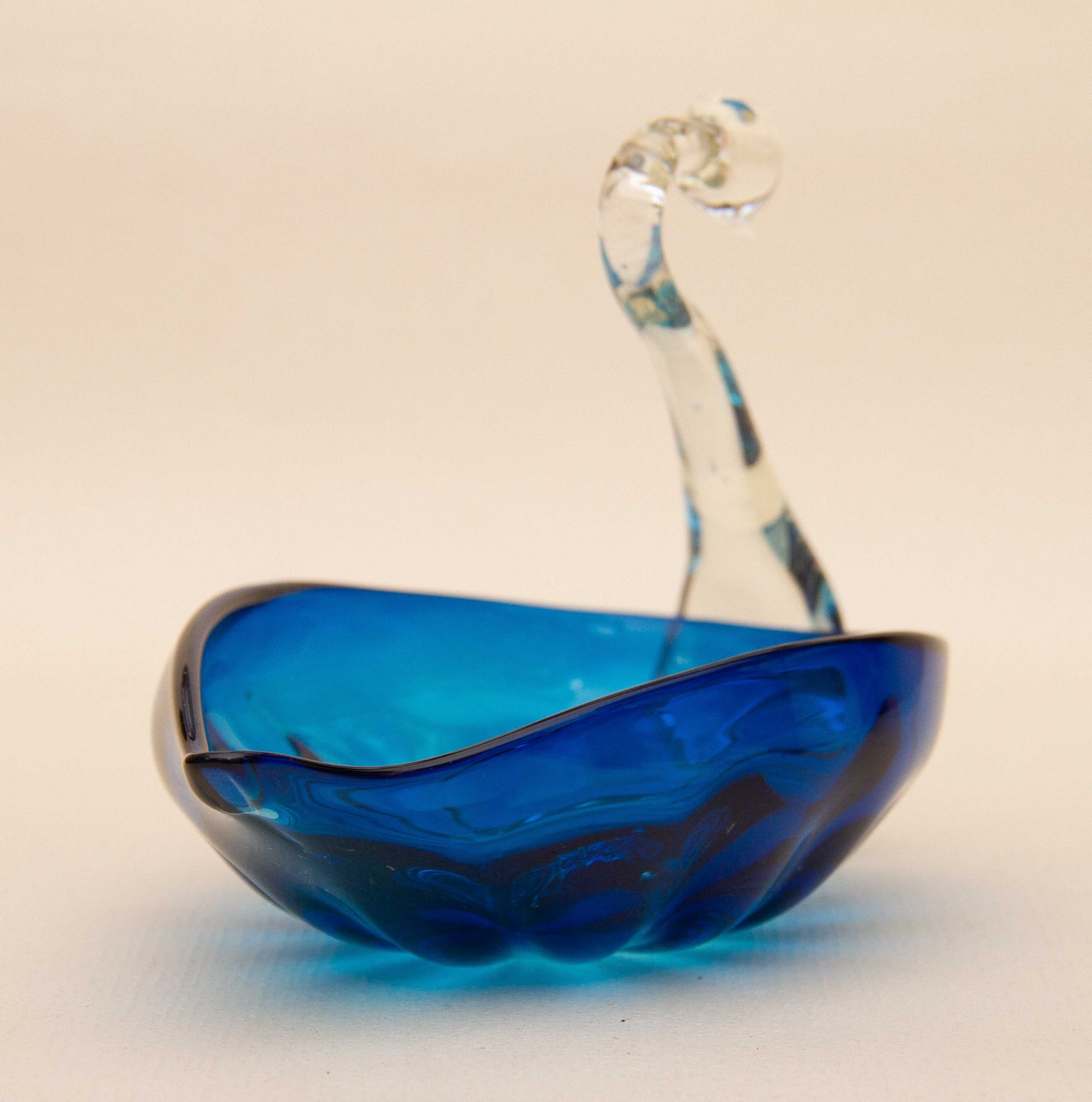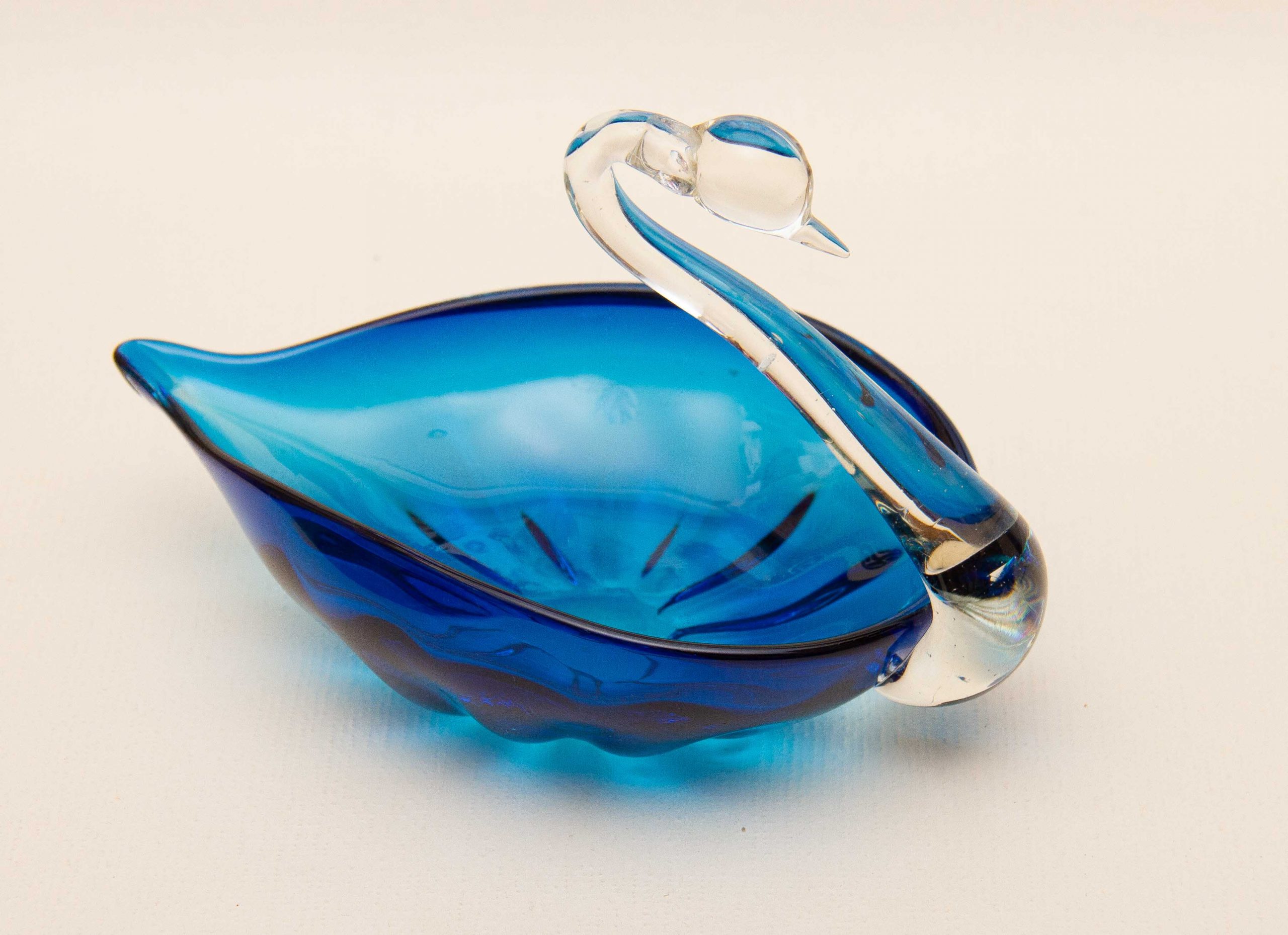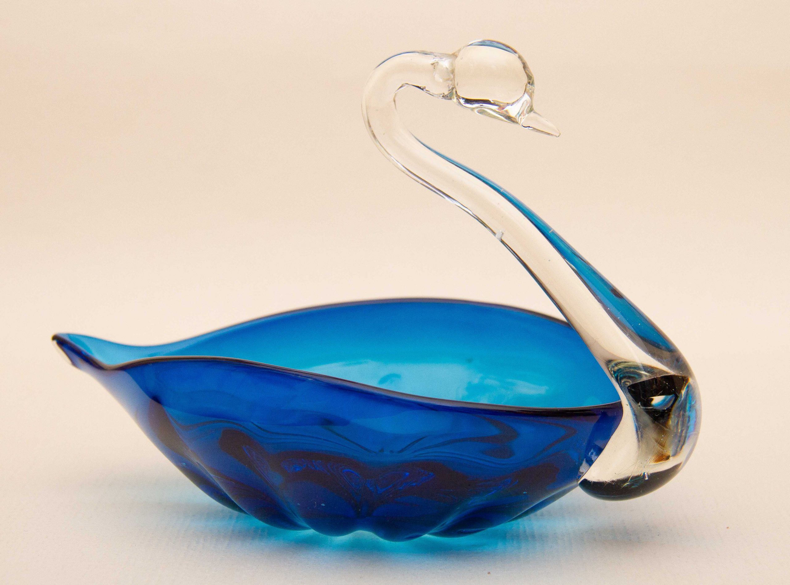 A Best Art of Japan vintage blue and clear glass swan shape dish, with partial original label on the underside.