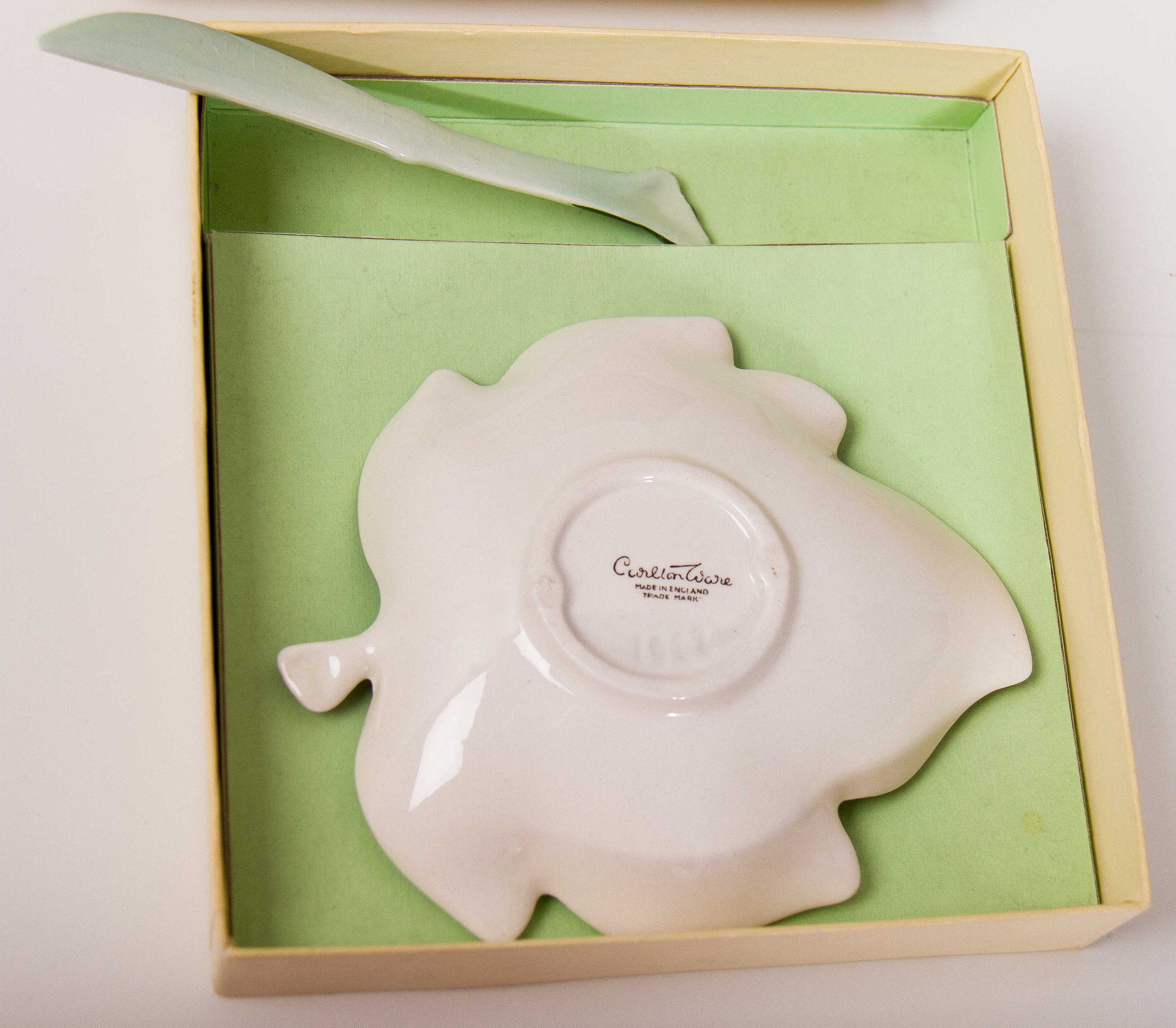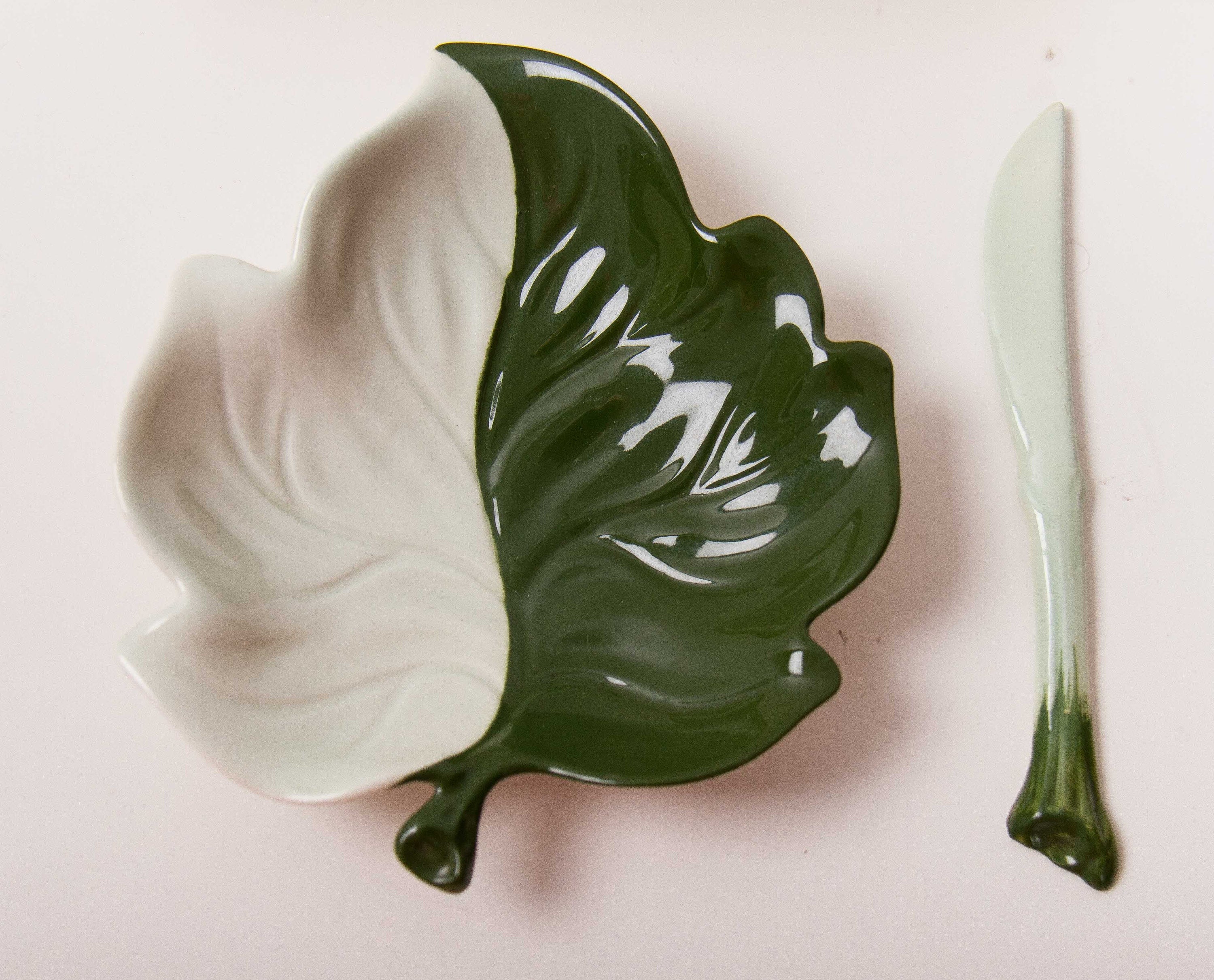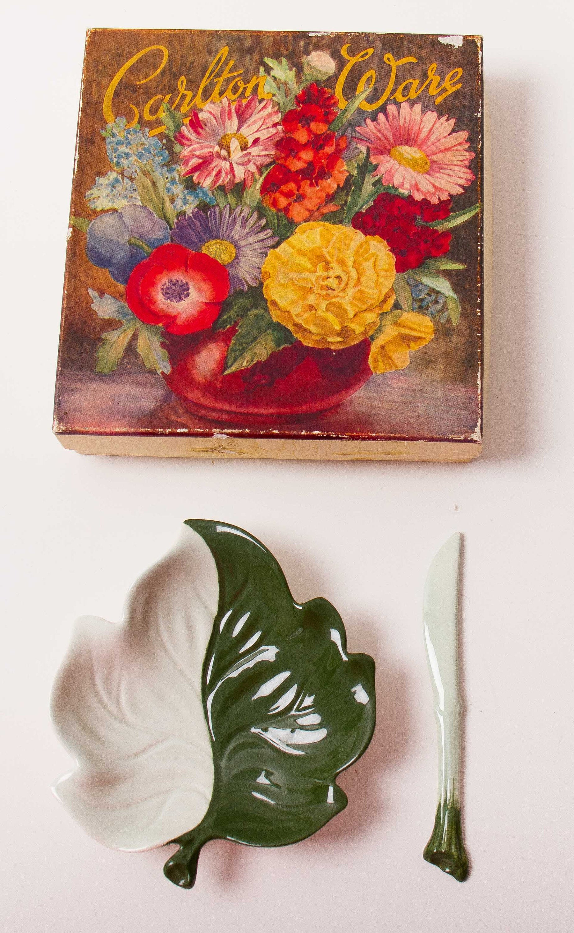 A Carlton Ware Pottery 2 tone green leaf shape dish with matching ceramic knife.