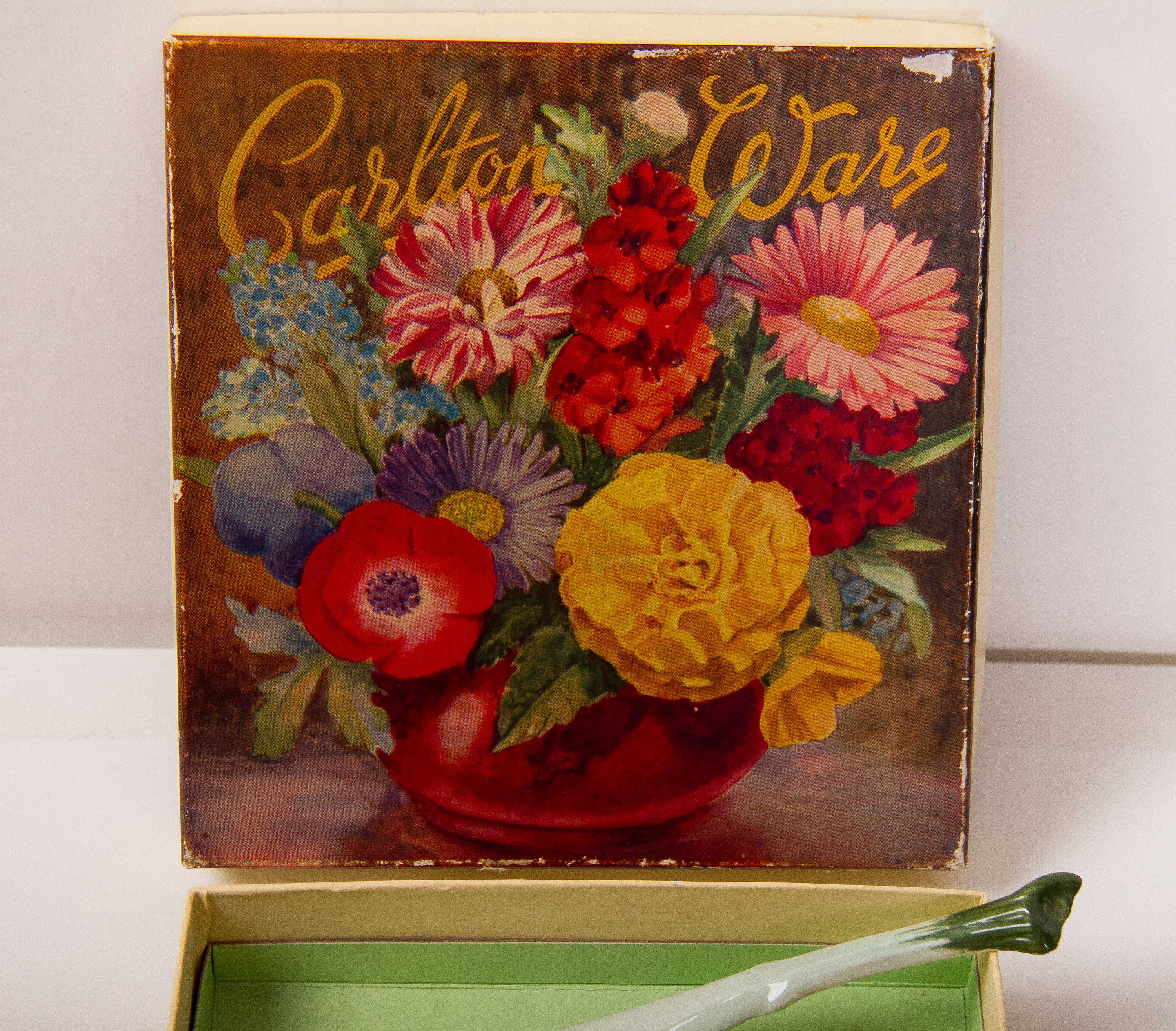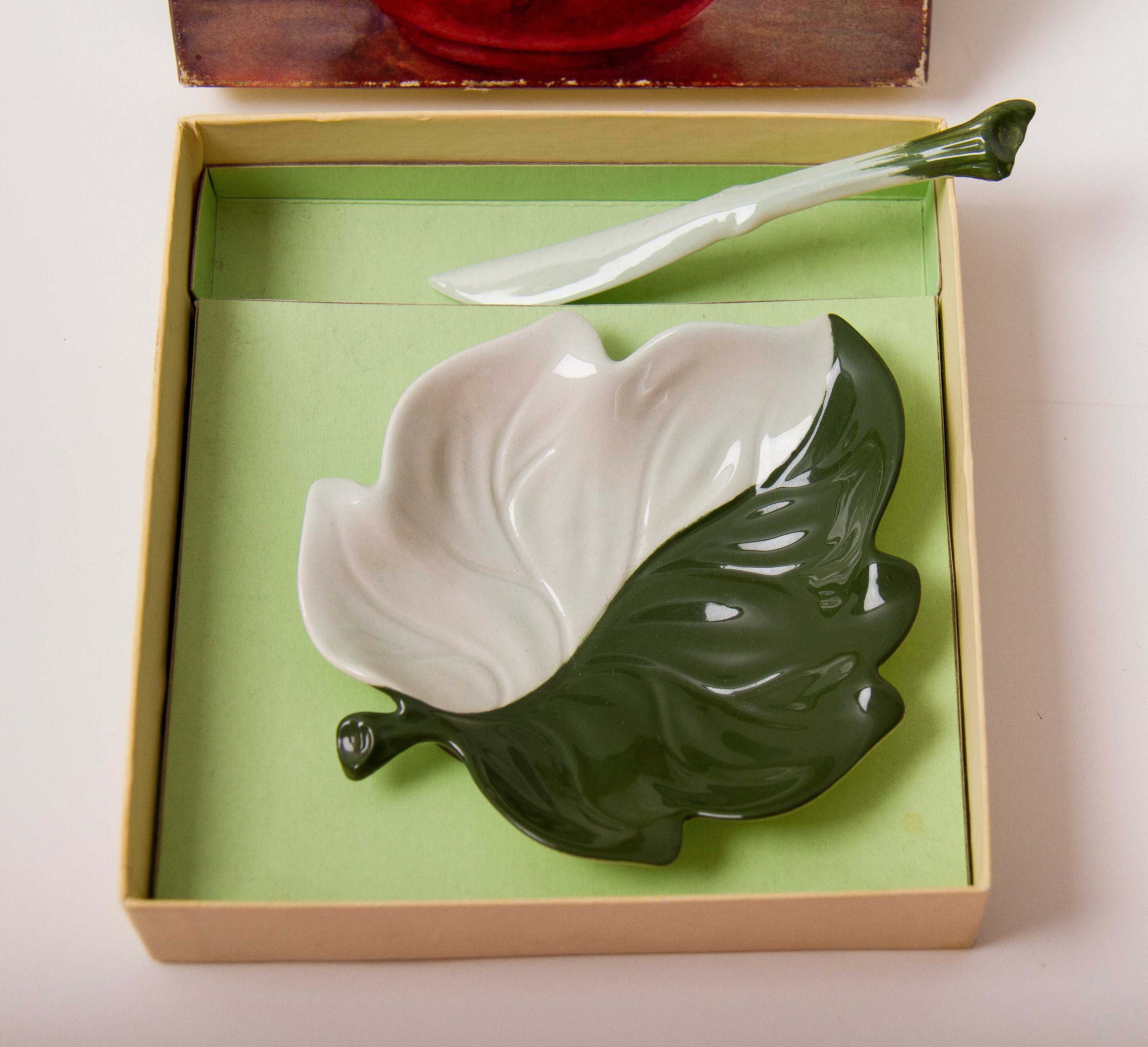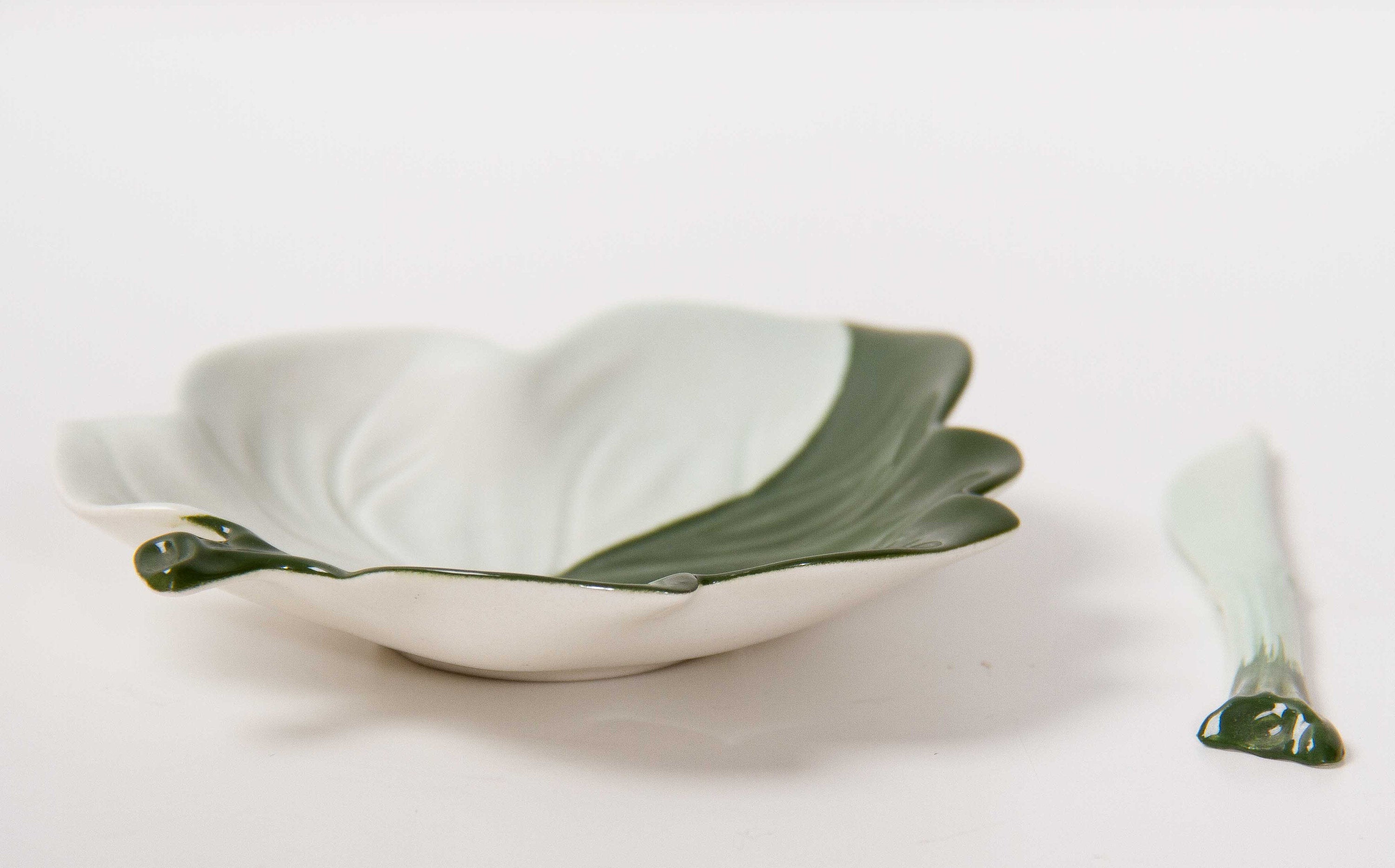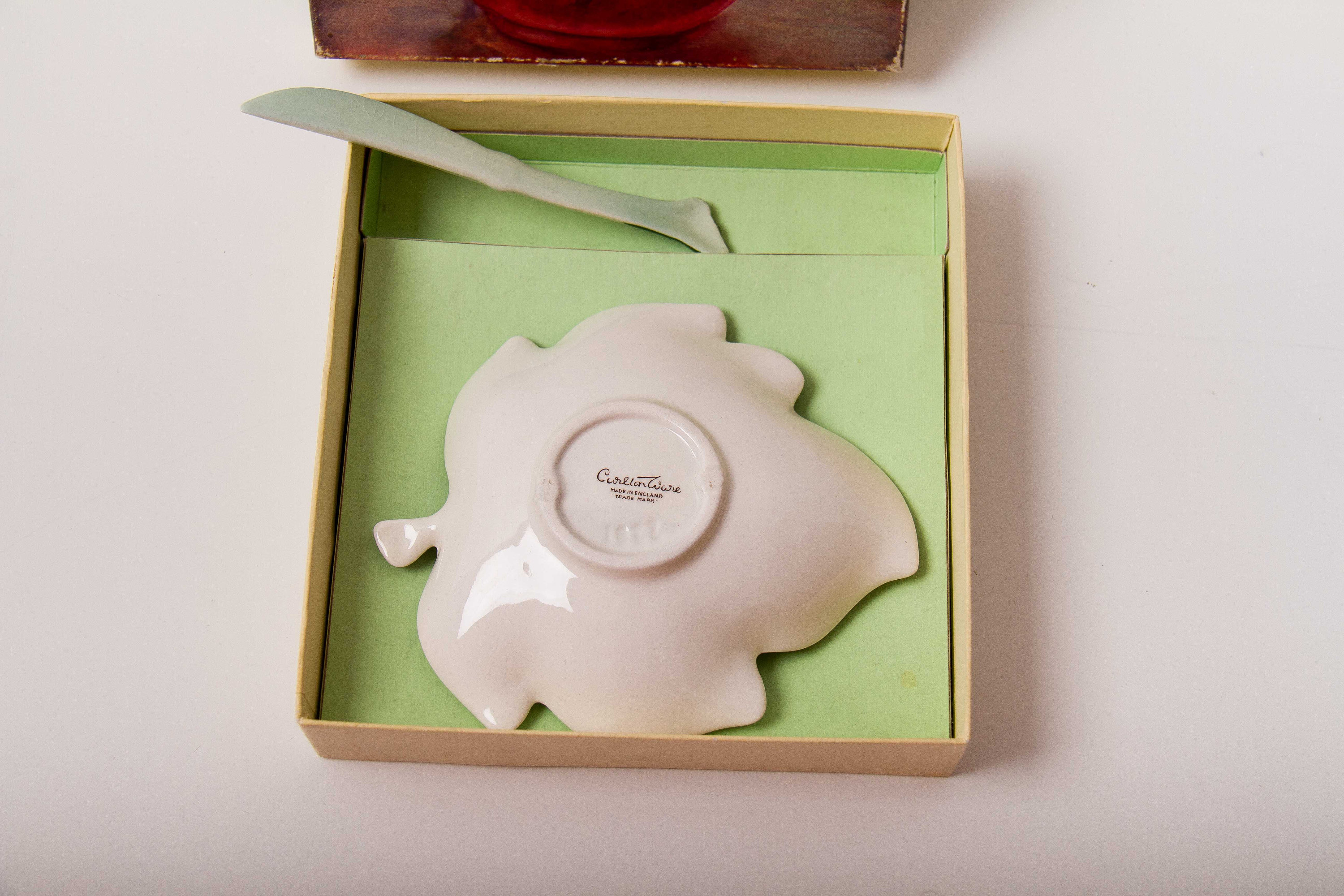 A Carlton Ware Pottery 2 tone green leaf shape dish with matching ceramic knife.