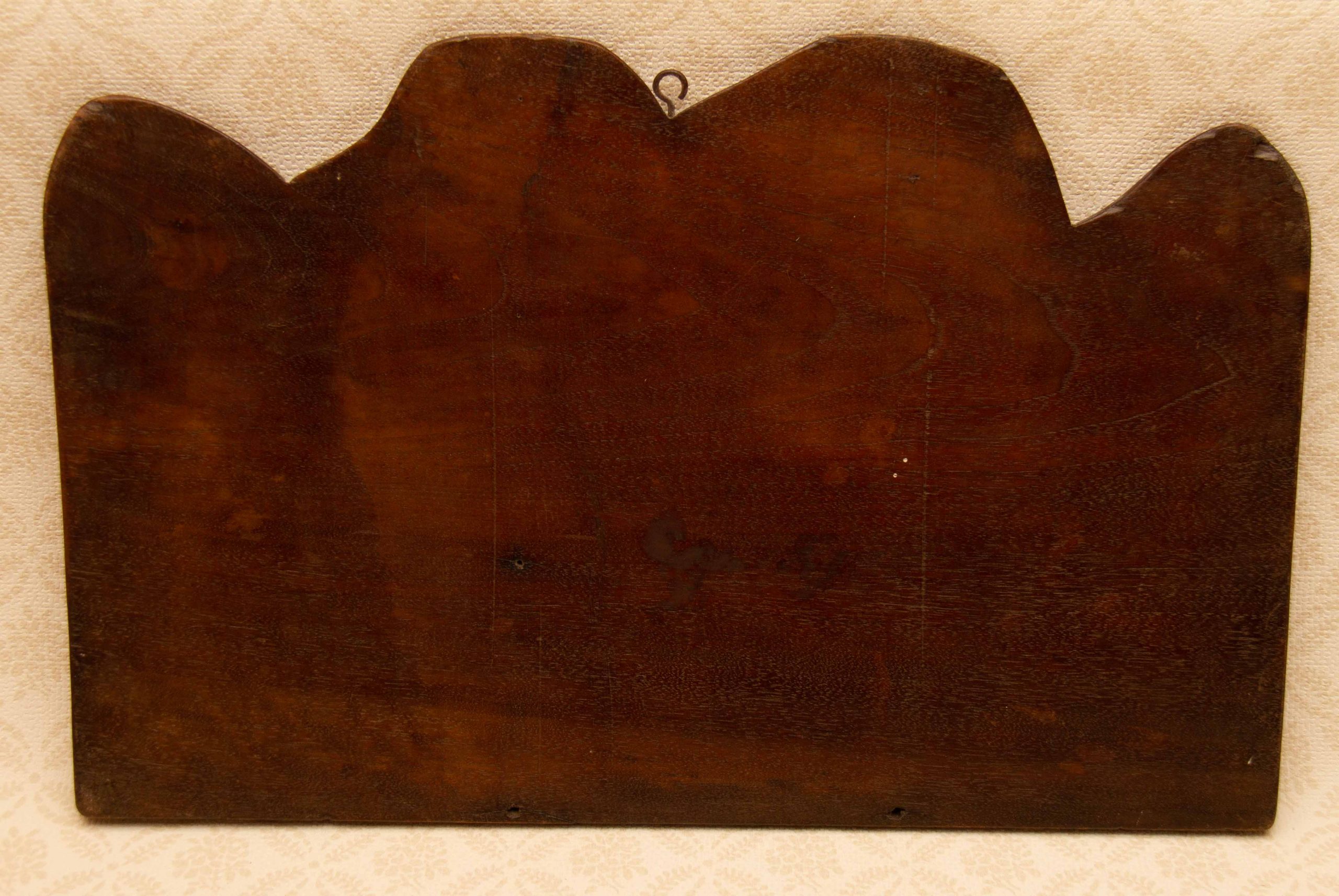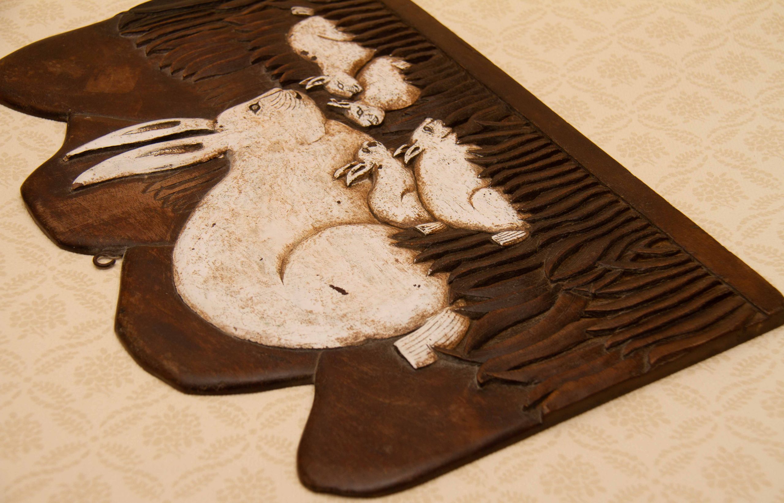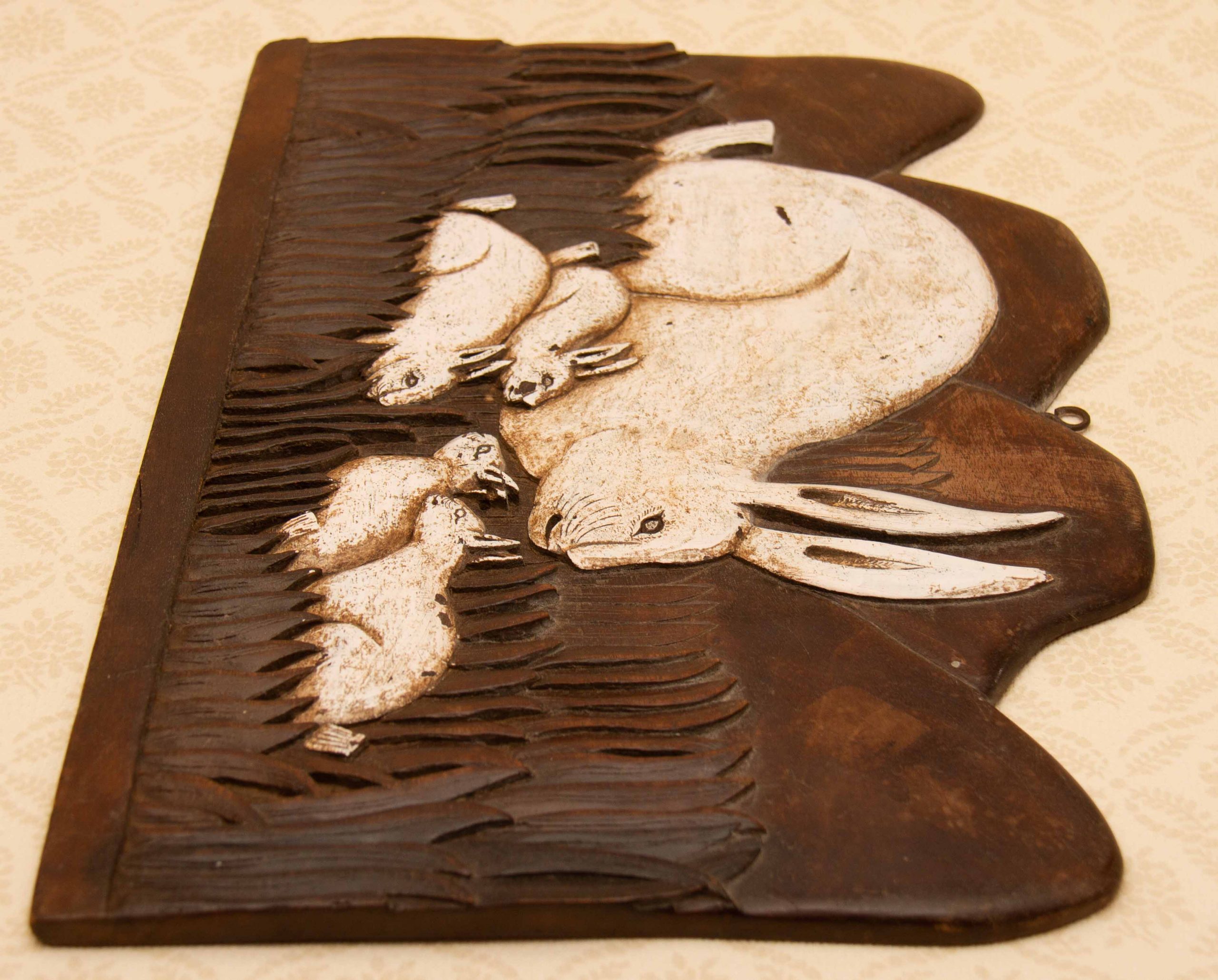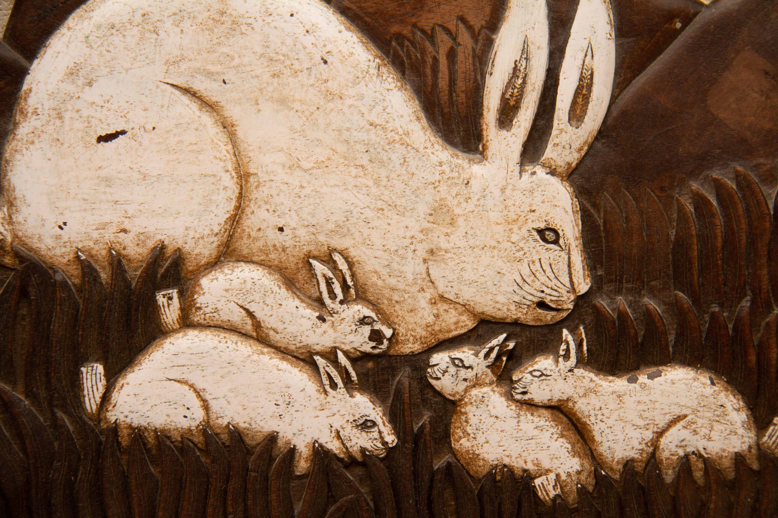 A charming rustic carved wooden wall plaque featuring white rabbits in long grass against a hilly backdrop.