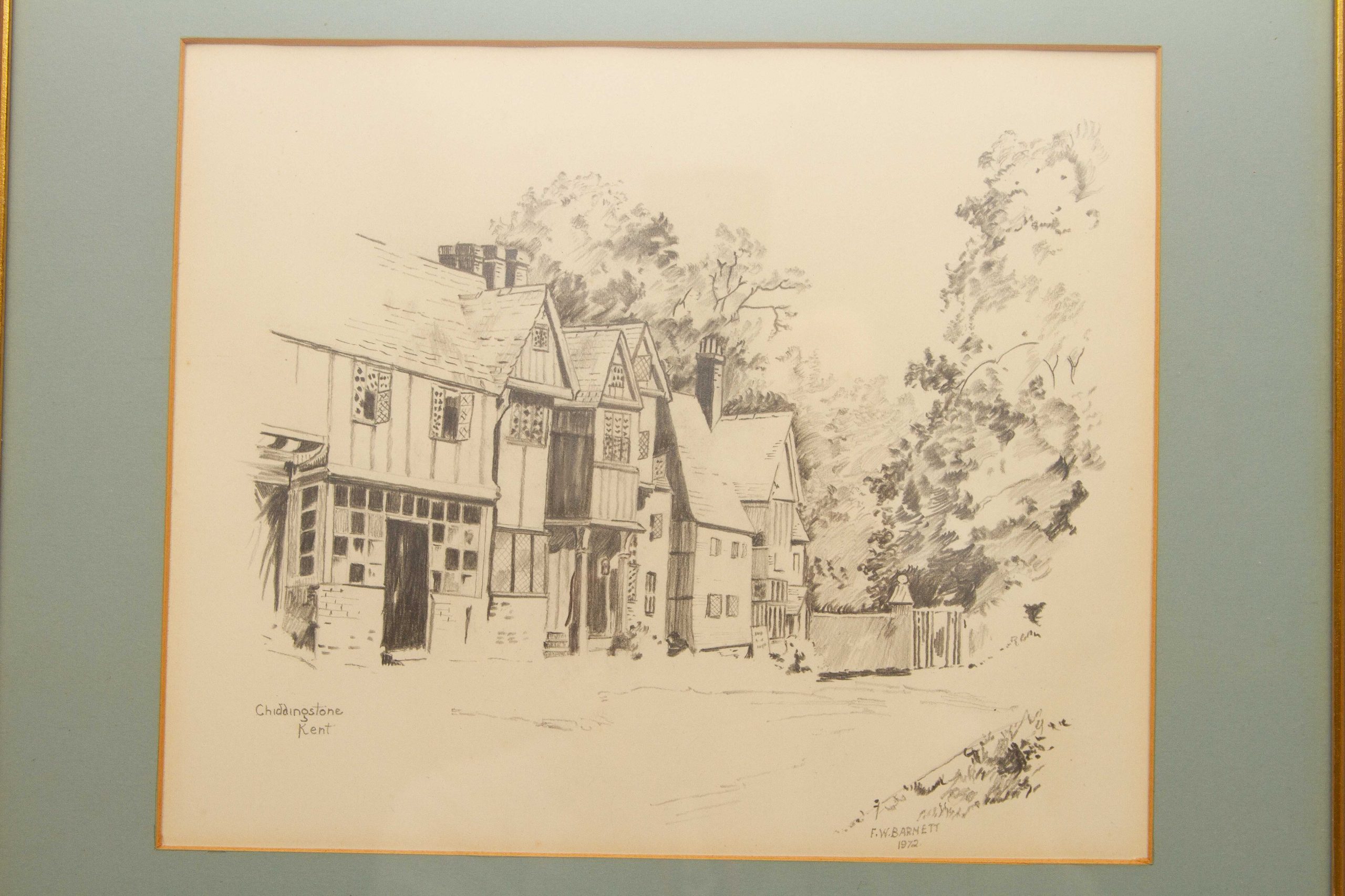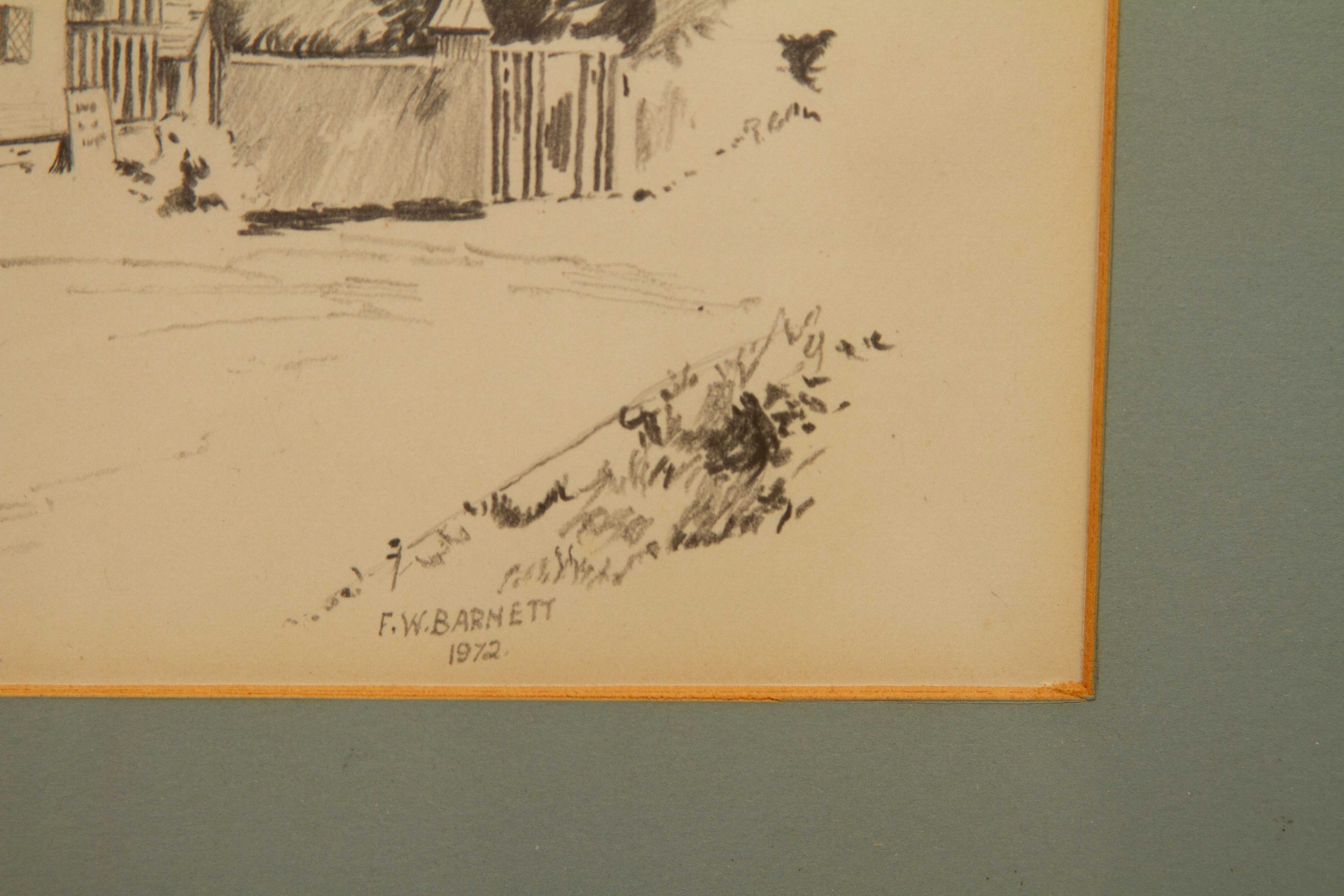 A pencil drawing of Chiddingstone Village in Kent, signed F.W. Barnett 1972. A scene of the Hight Street with the Castle Inn and the gates to the Castle. Framed mounted and behind glass.