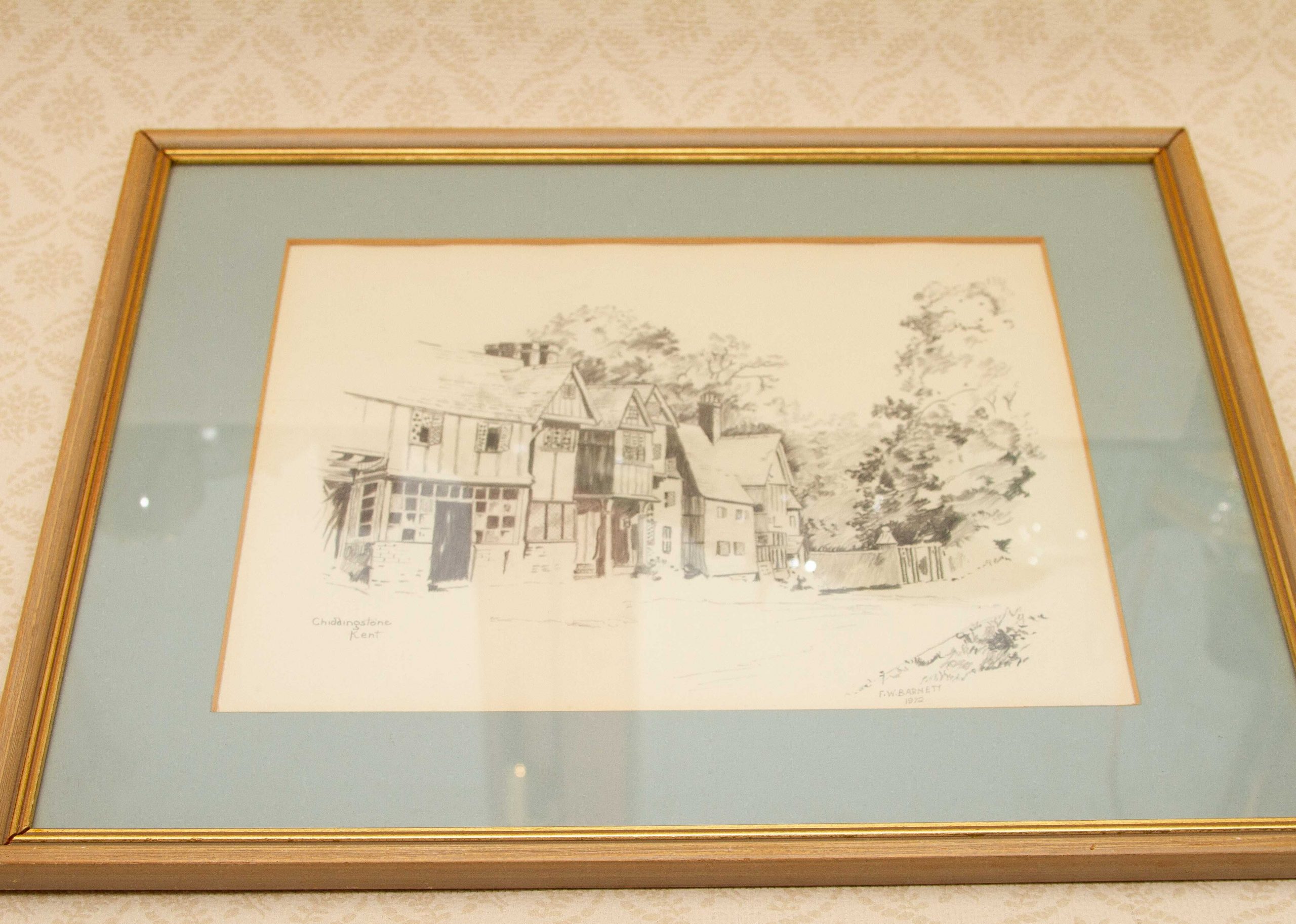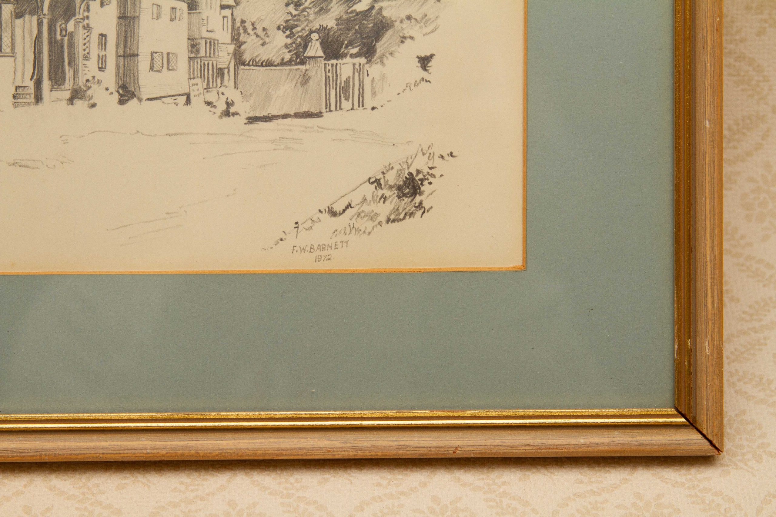 A pencil drawing of Chiddingstone Village in Kent, signed F.W. Barnett 1972. A scene of the Hight Street with the Castle Inn and the gates to the Castle. Framed mounted and behind glass.ย