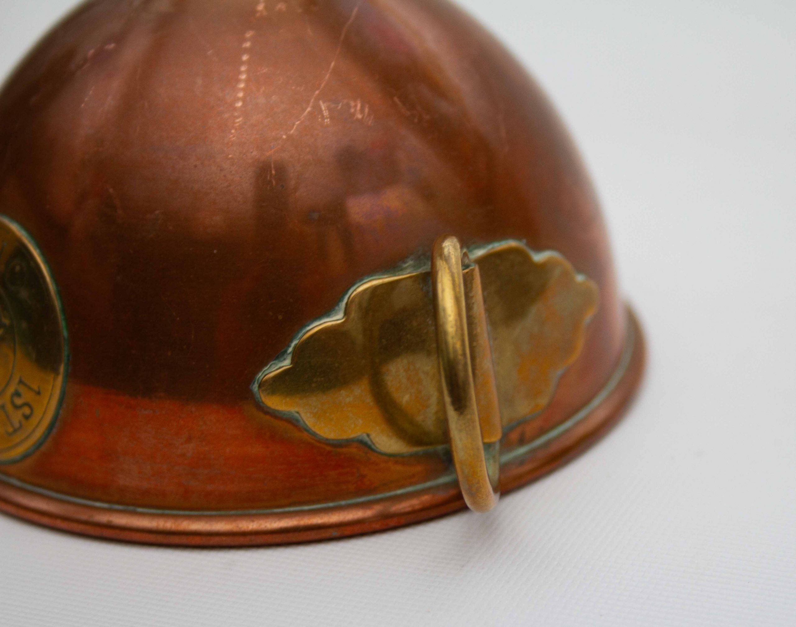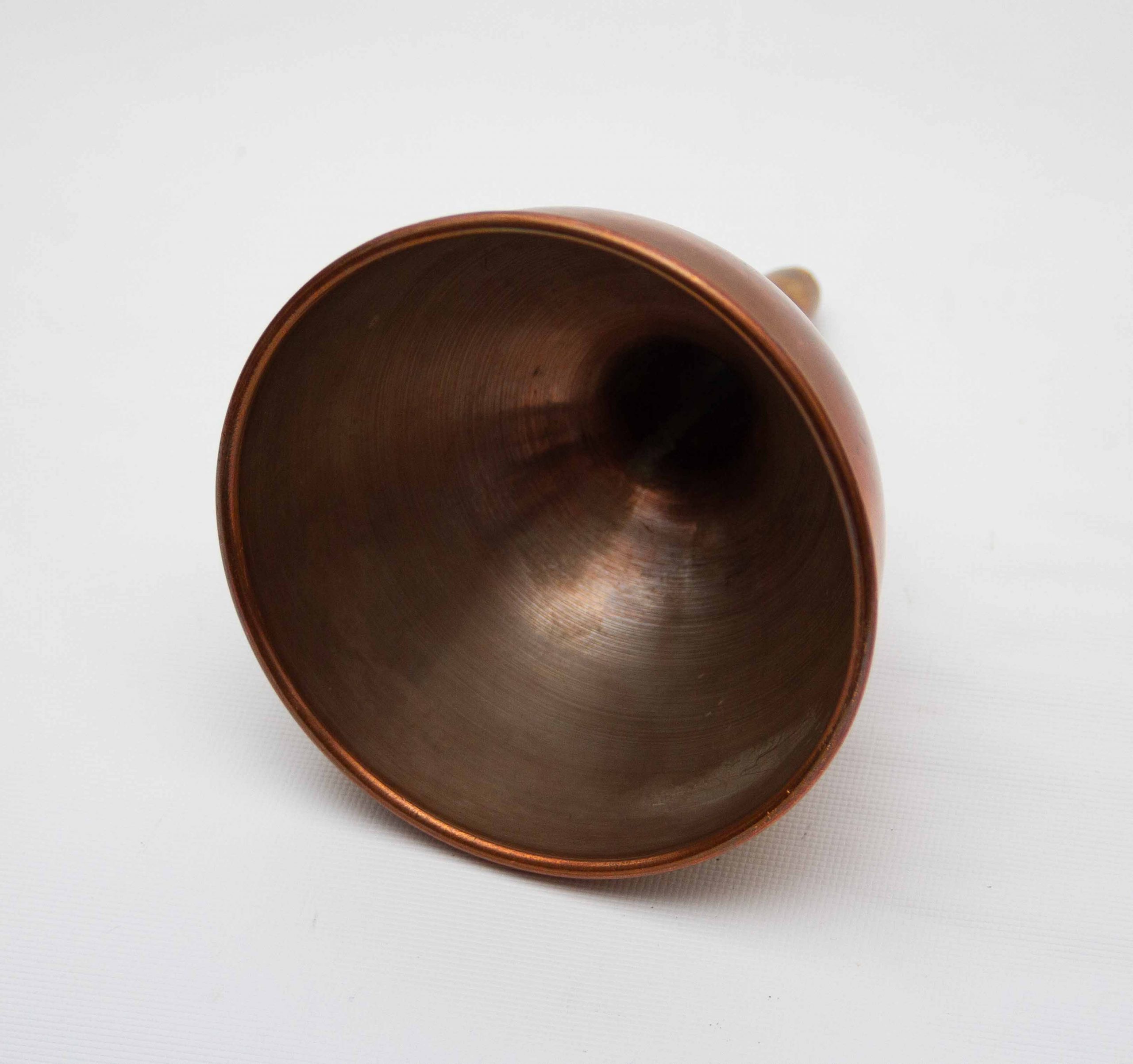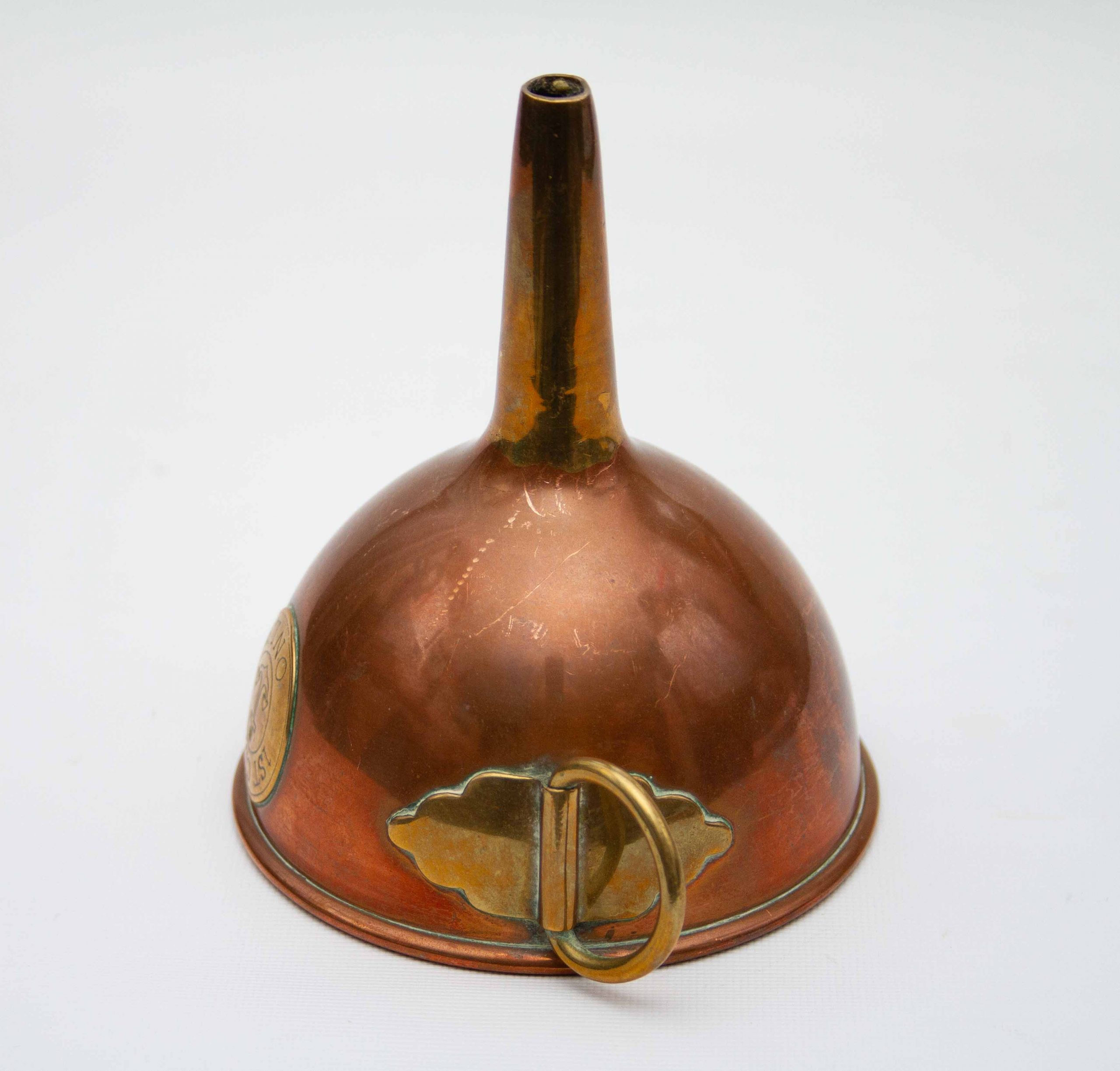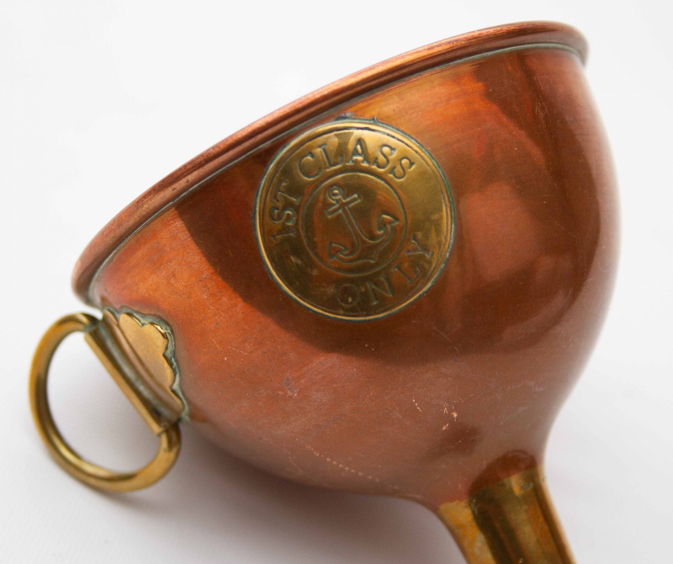 A copper ships wine funnel, with a brass plaque stating ‘1st Class Only’ with an Anchor, and brass hanging loop.