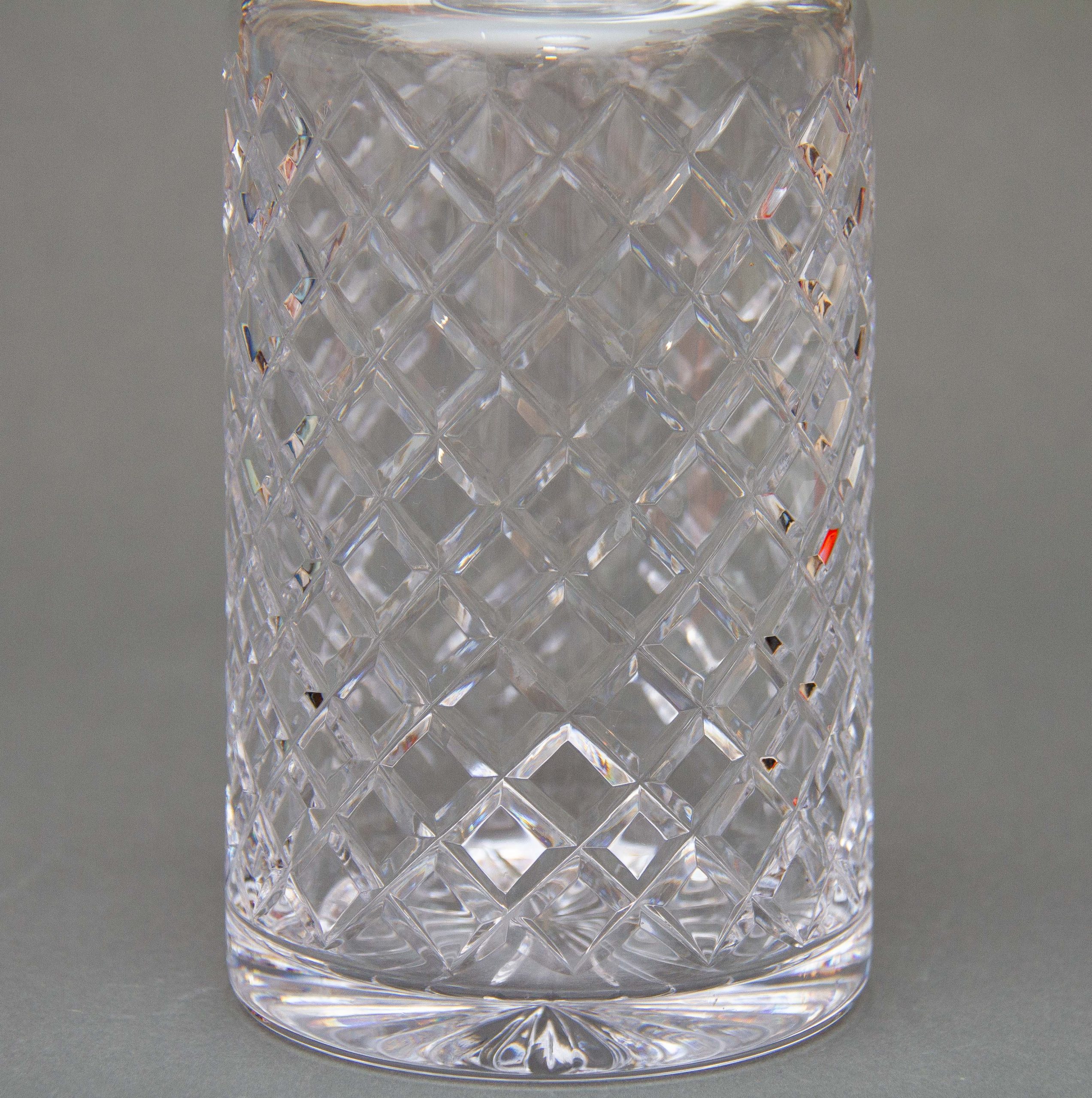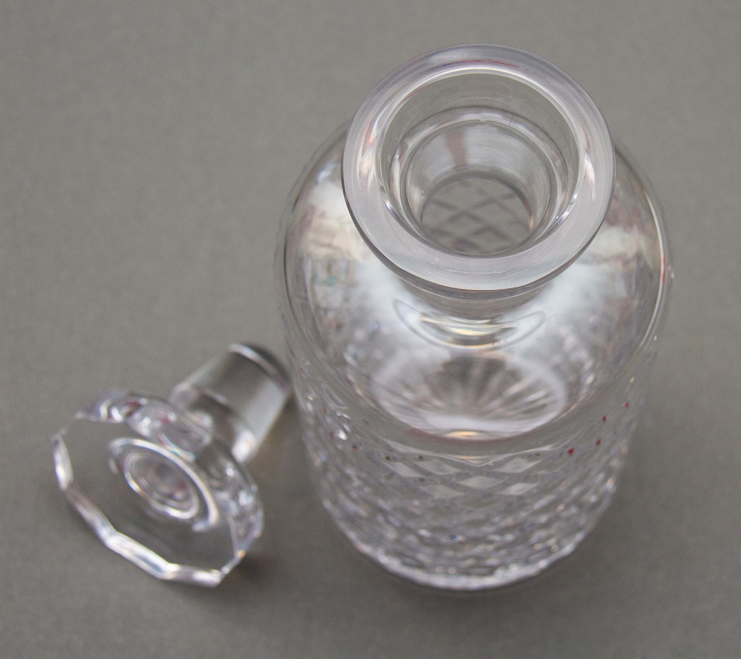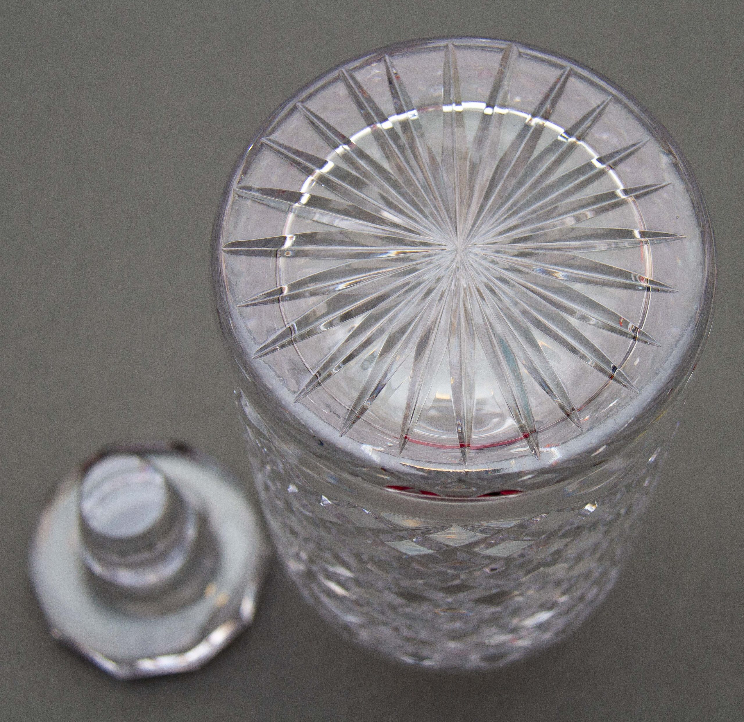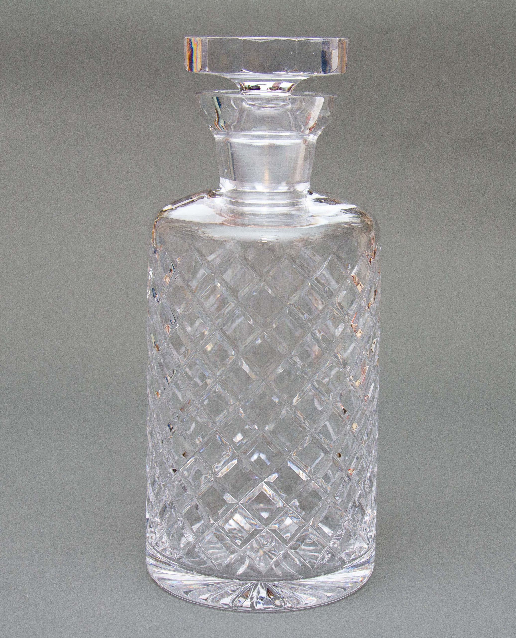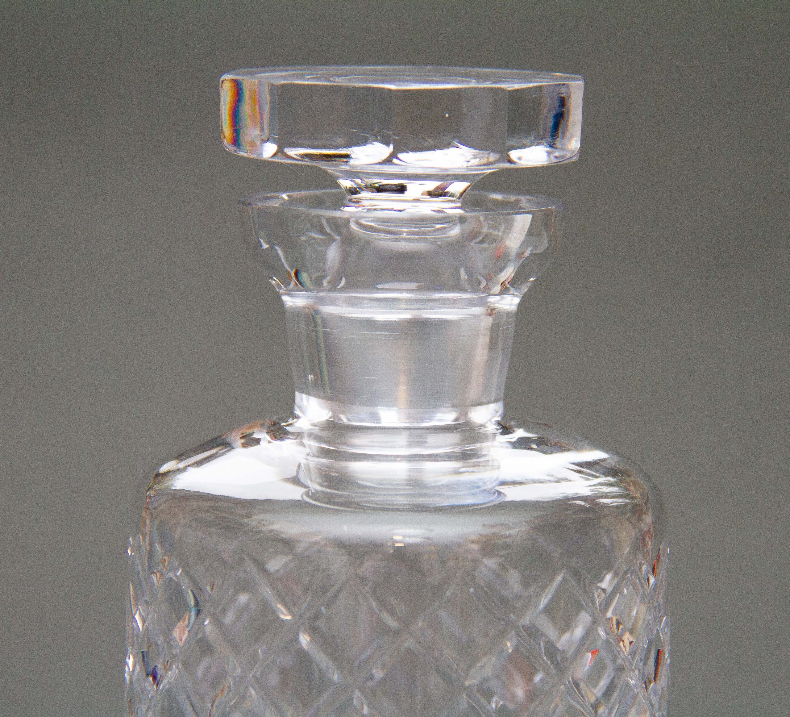 A vintage crystal clear glass decanter with a criss cross cut pattern and decagon shaped stopper.