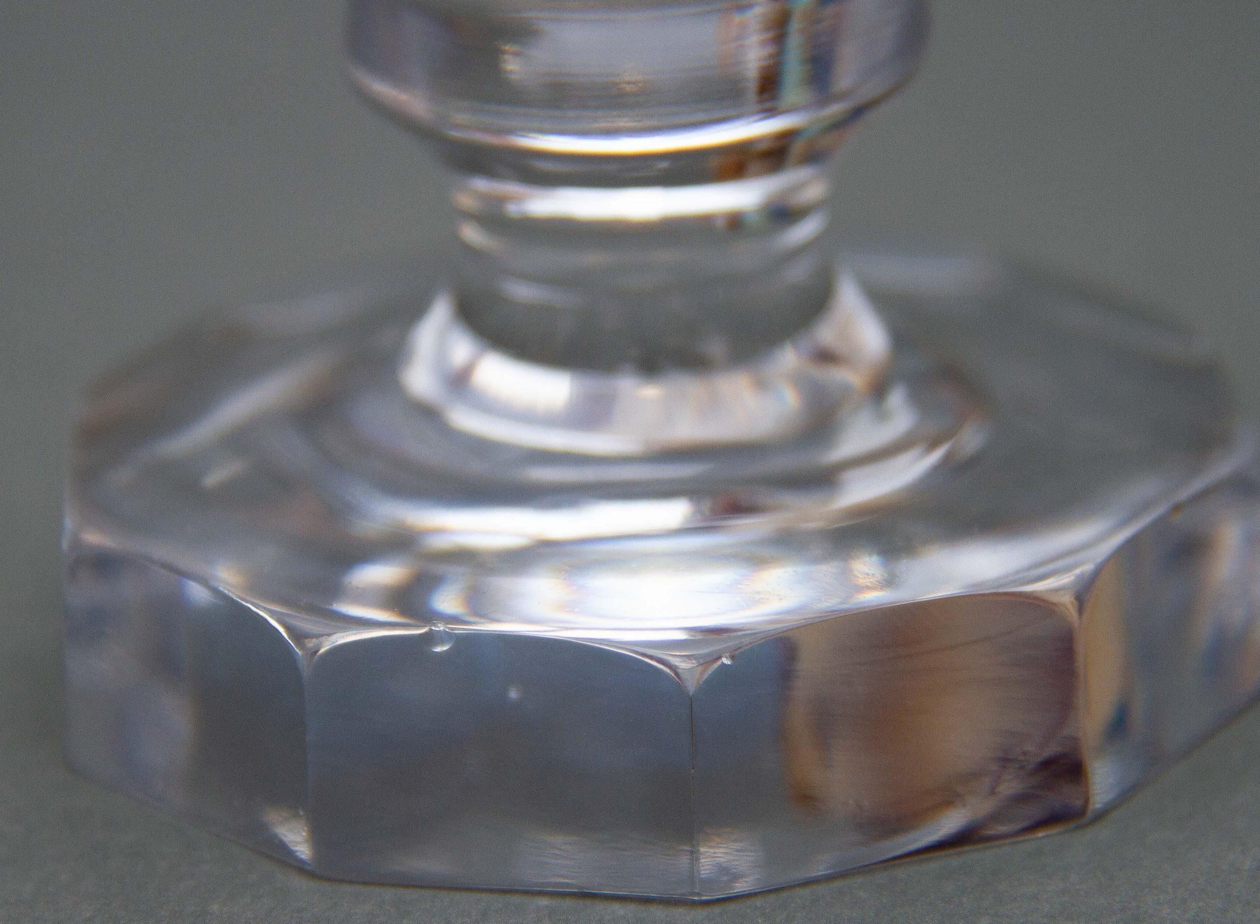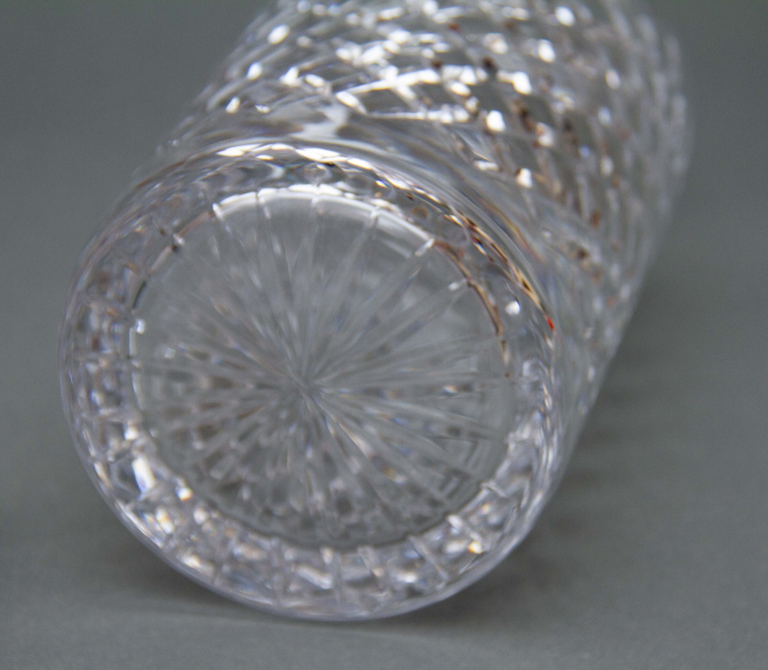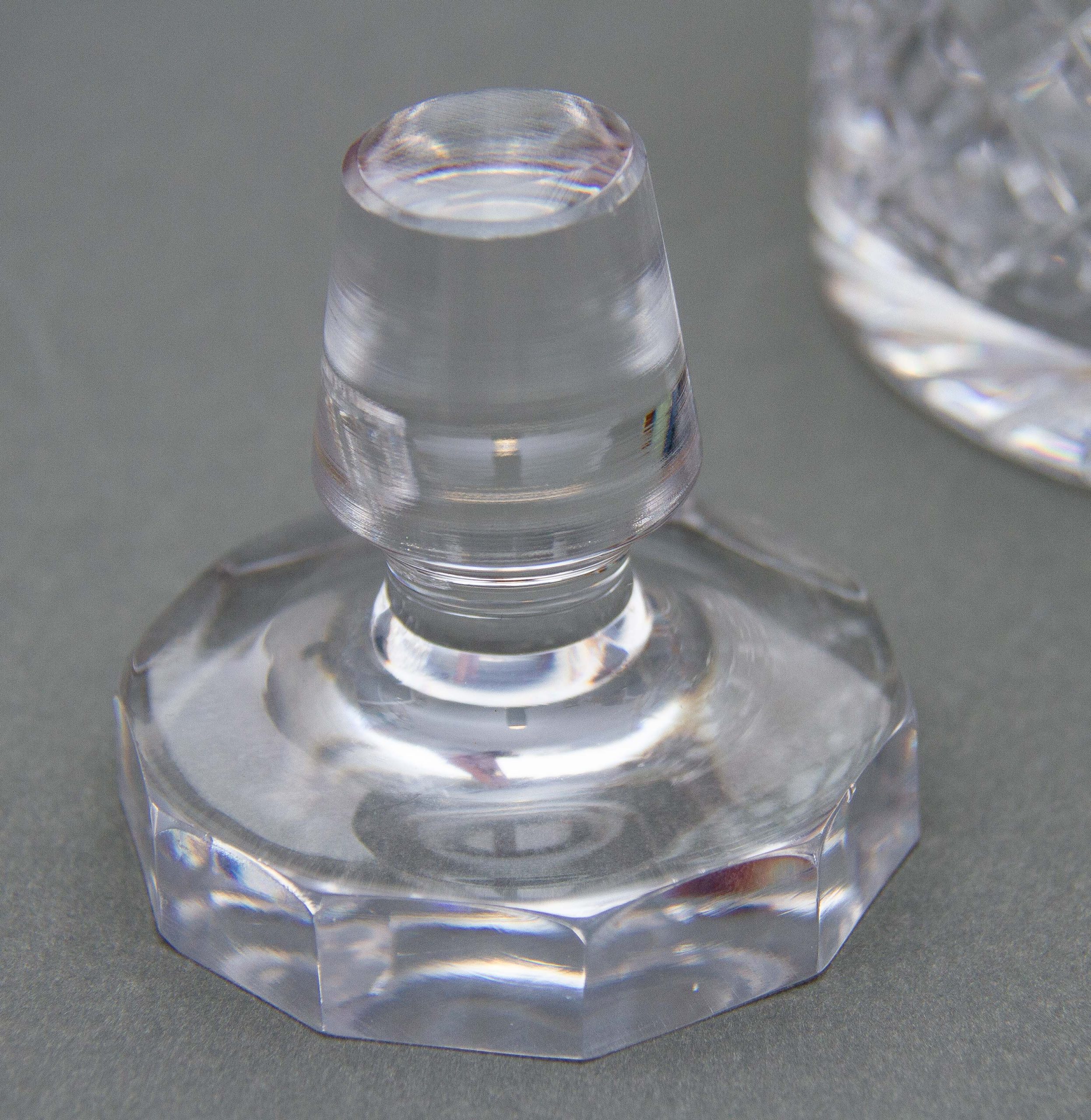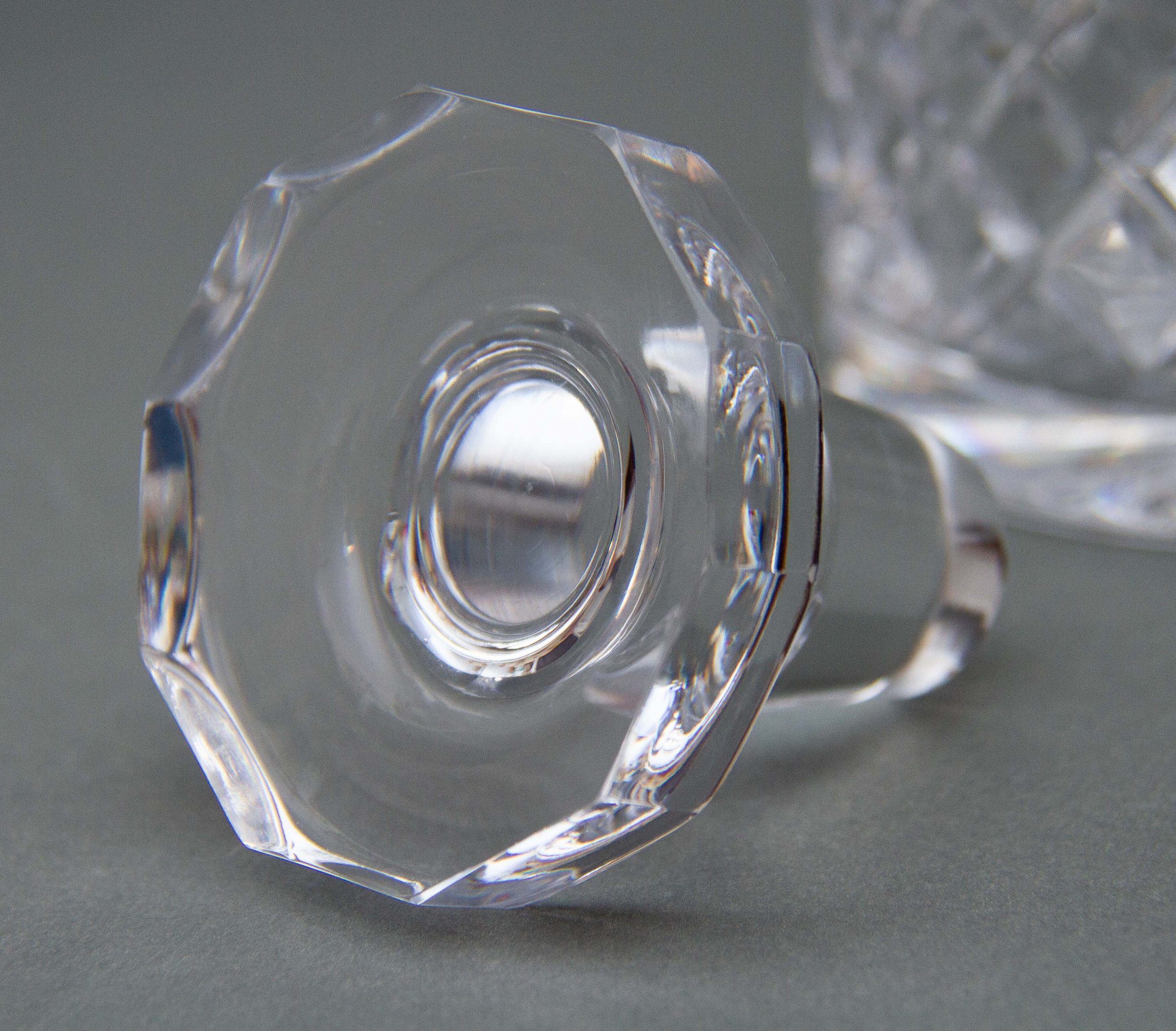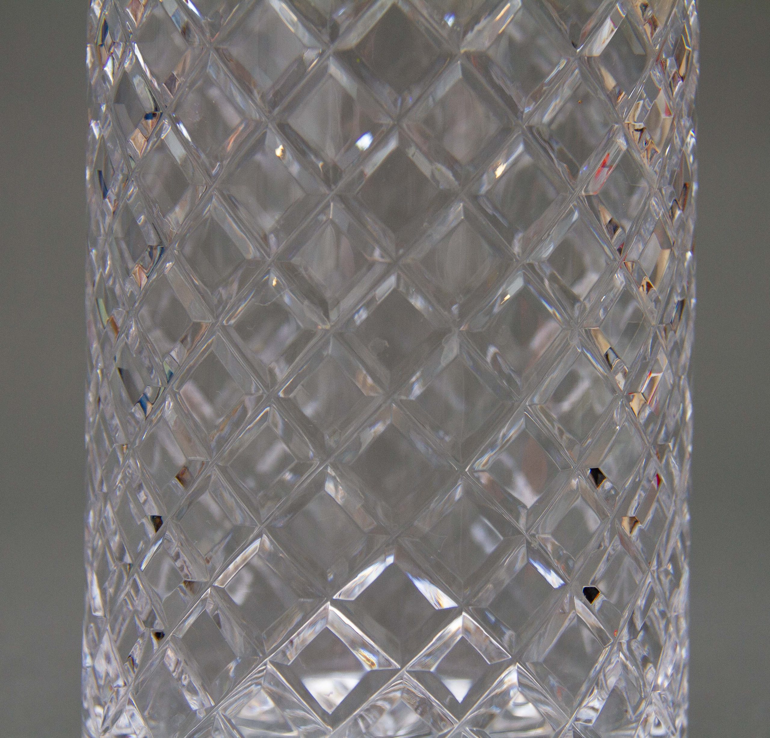A vintage crystal clear glass decanter with a criss cross cut pattern and decagon shaped stopper.
