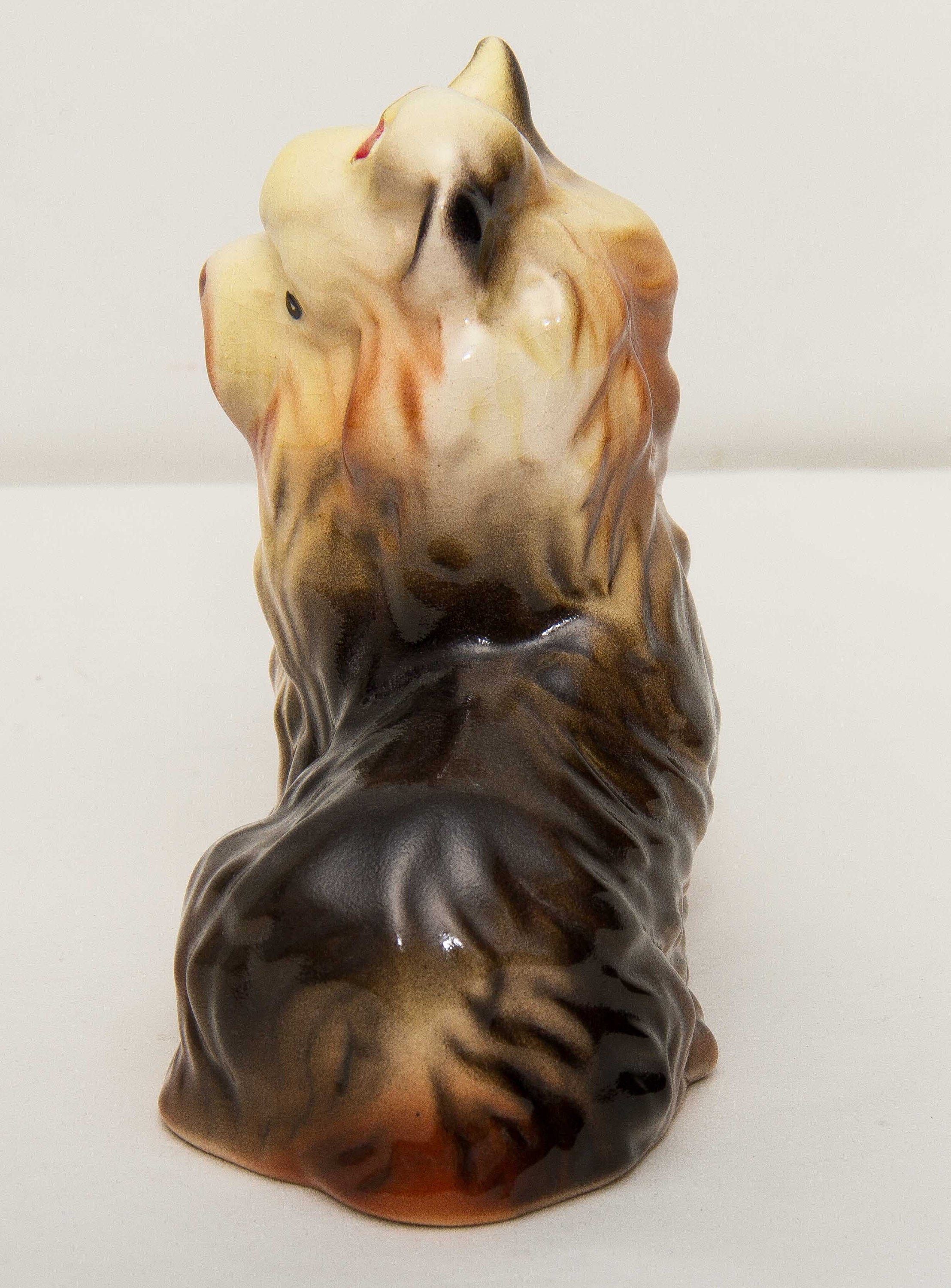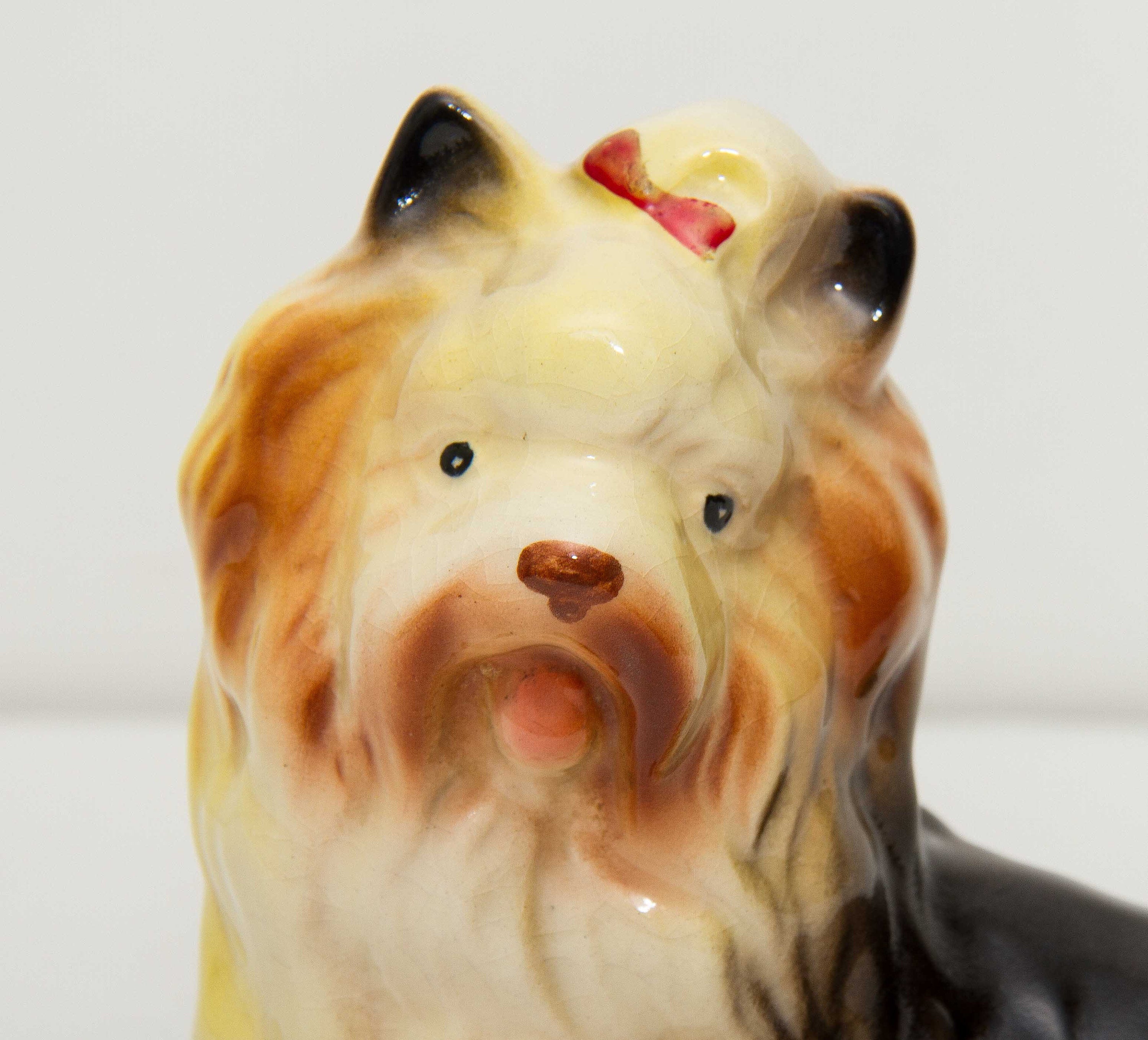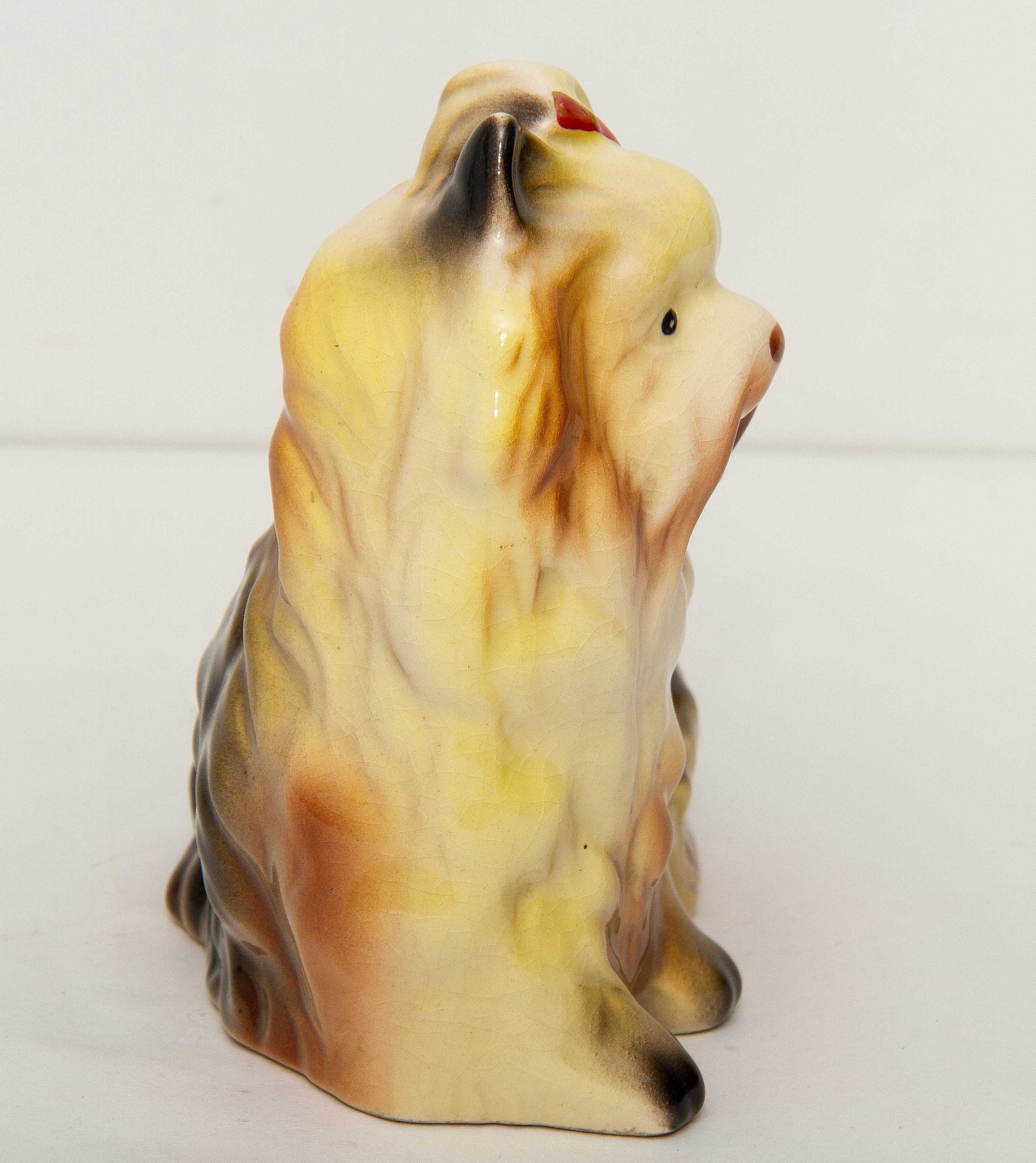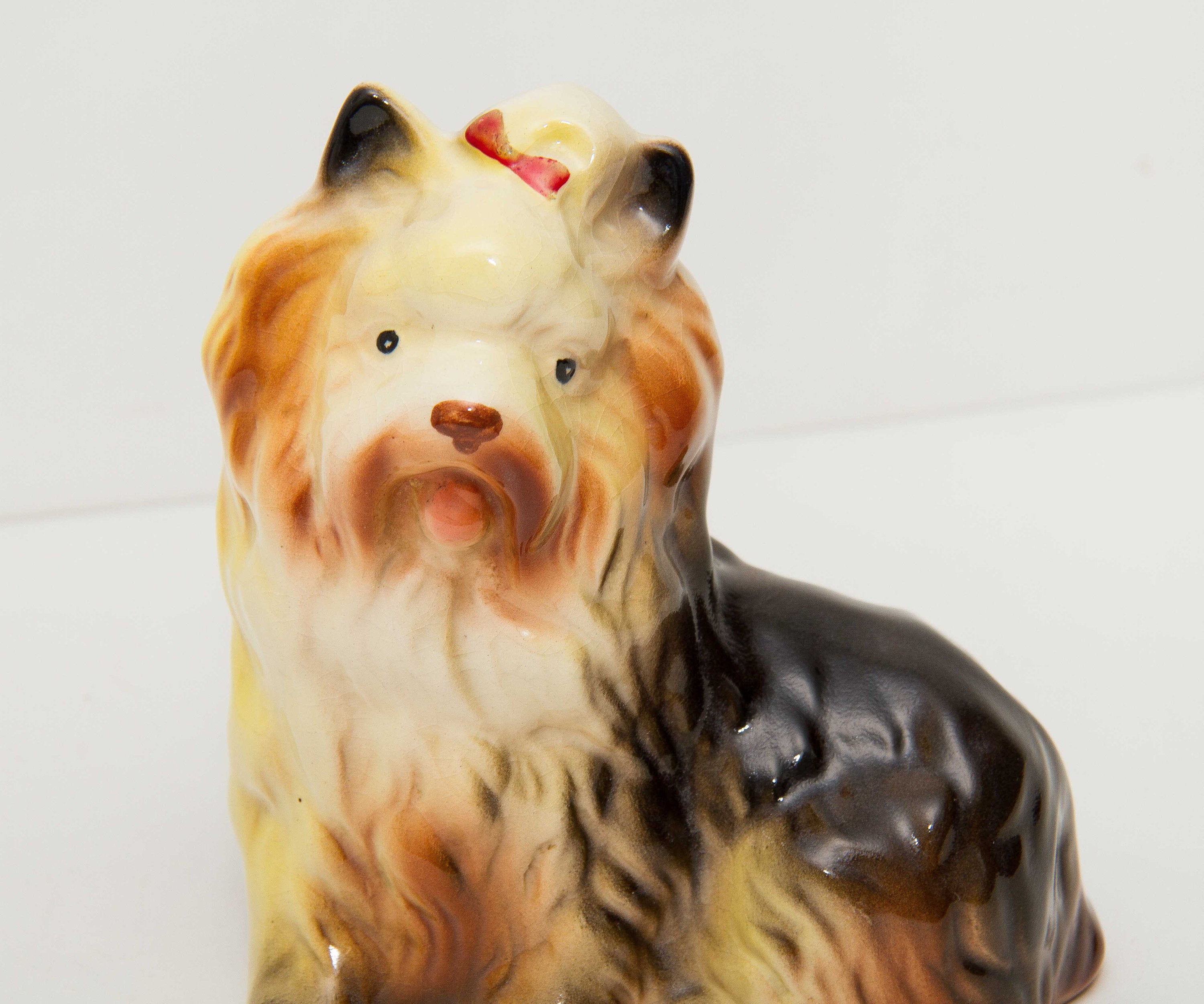A cute ornament of a Yorkshire Terrier dog in a sitting position with a red bow in it’s hair.