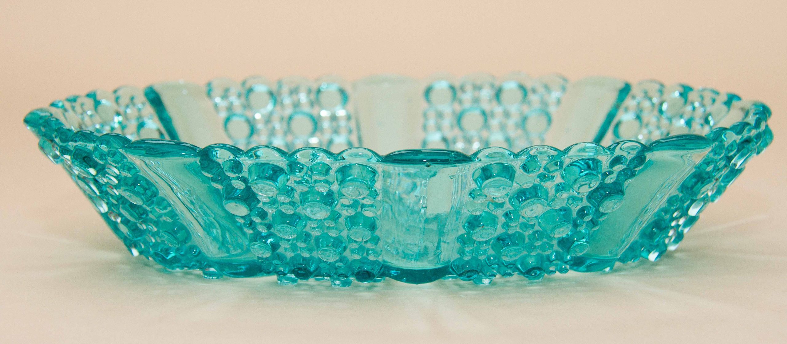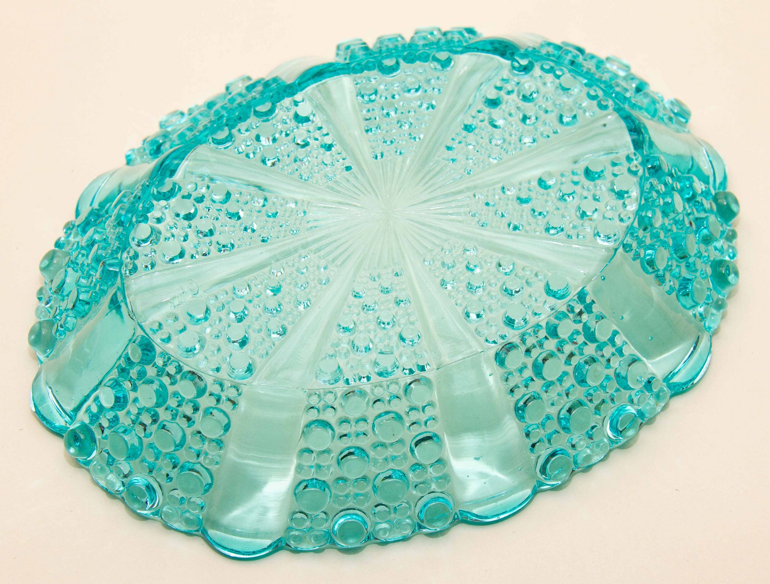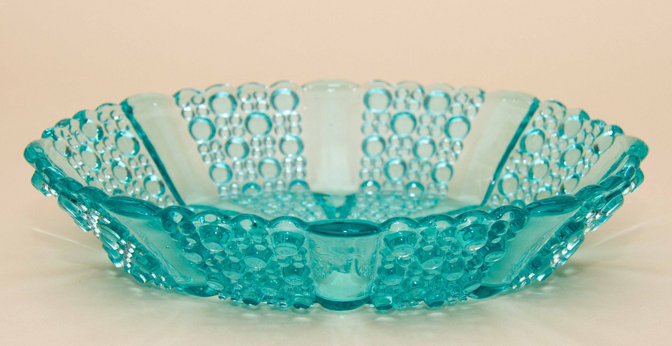 A turquoise blue oval Davidson glass oval dish with a raised bobble design.