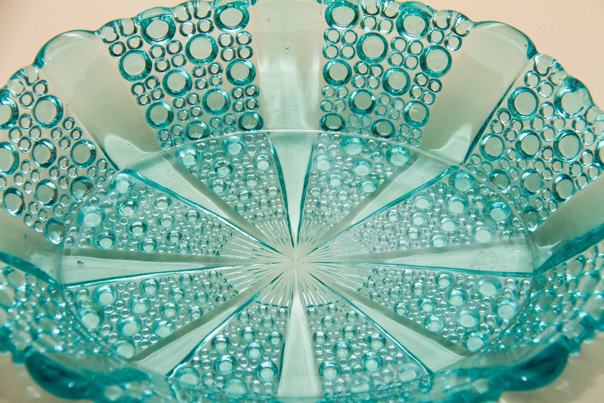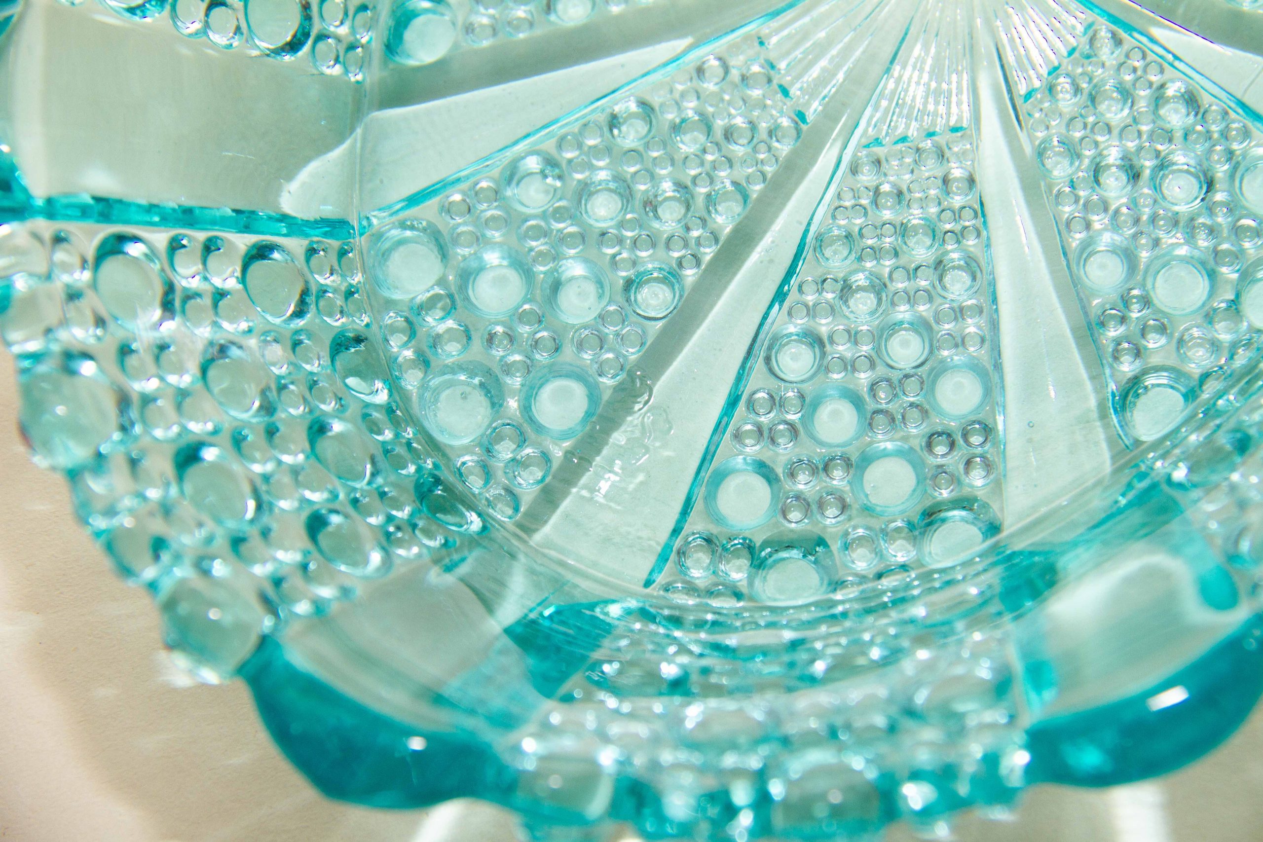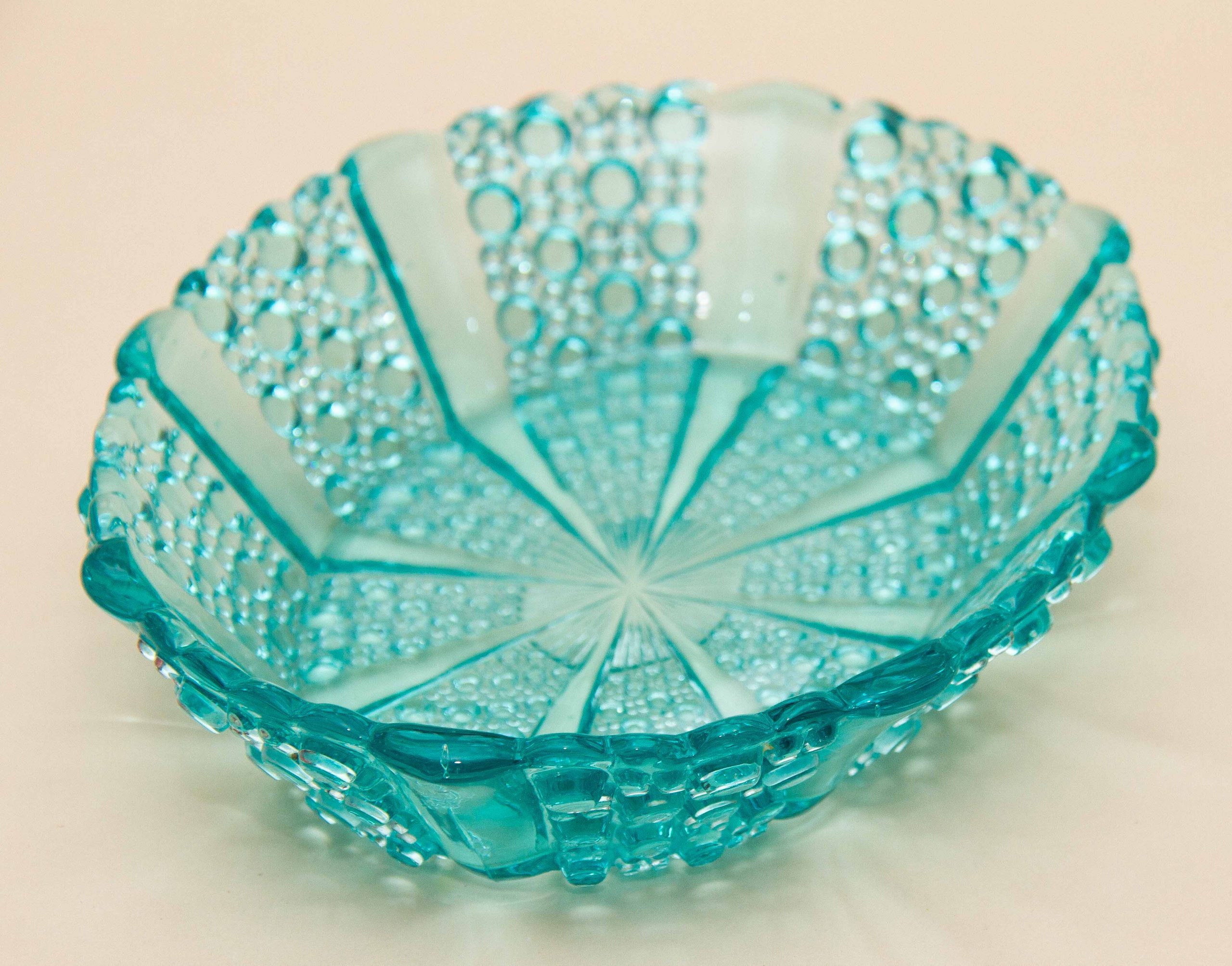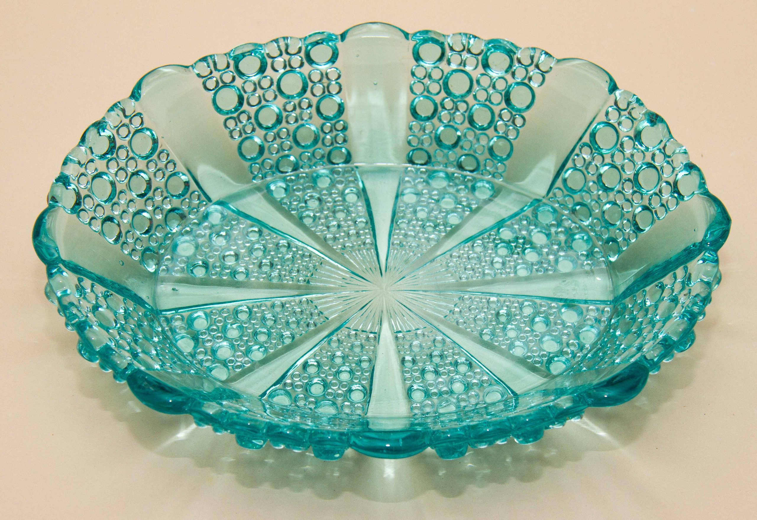 A turquoise blue oval Davidson glass oval dish with a raised bobble design.