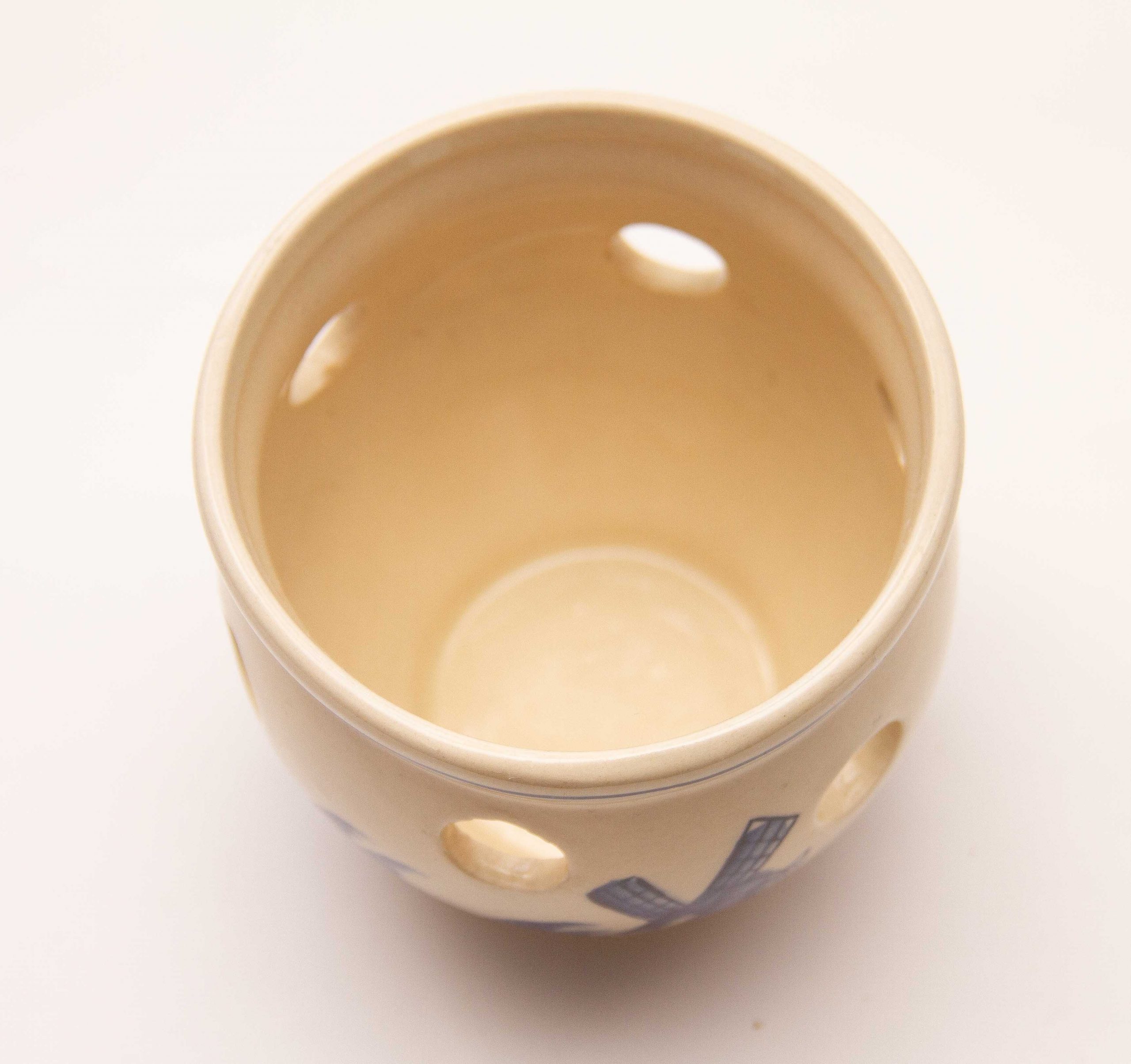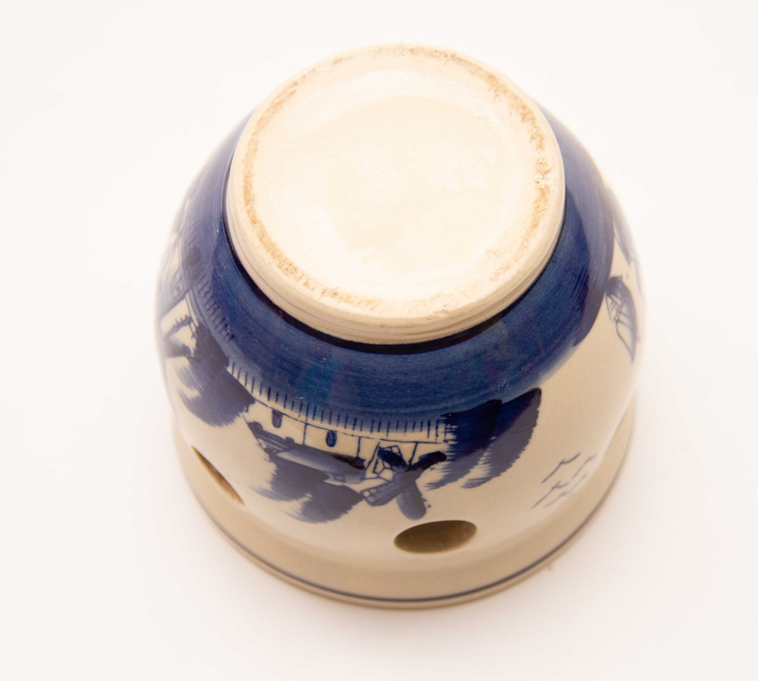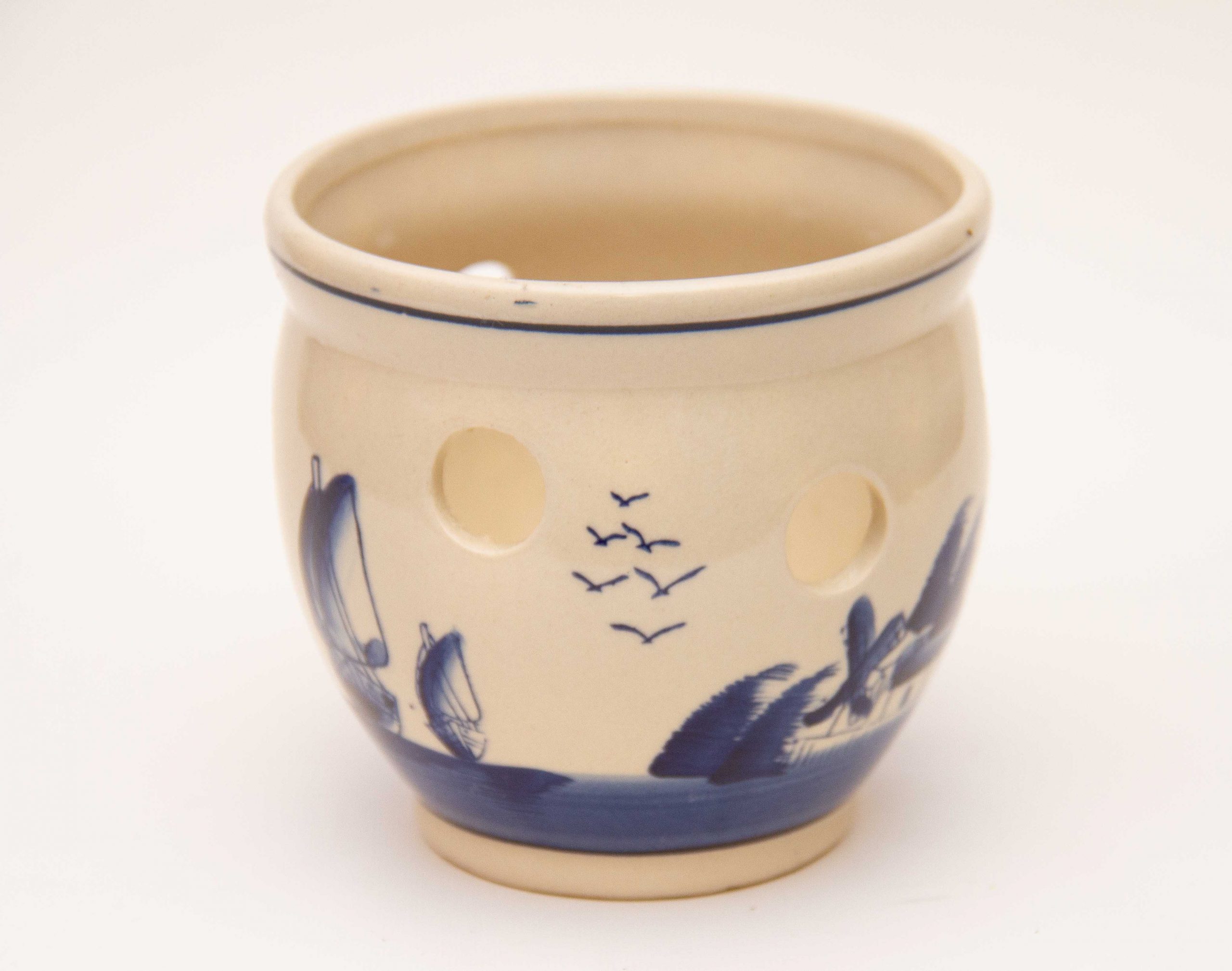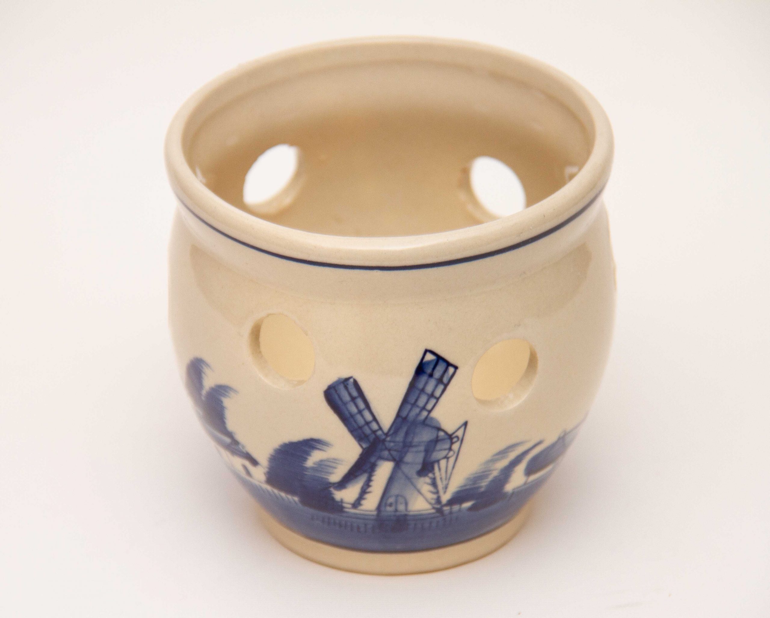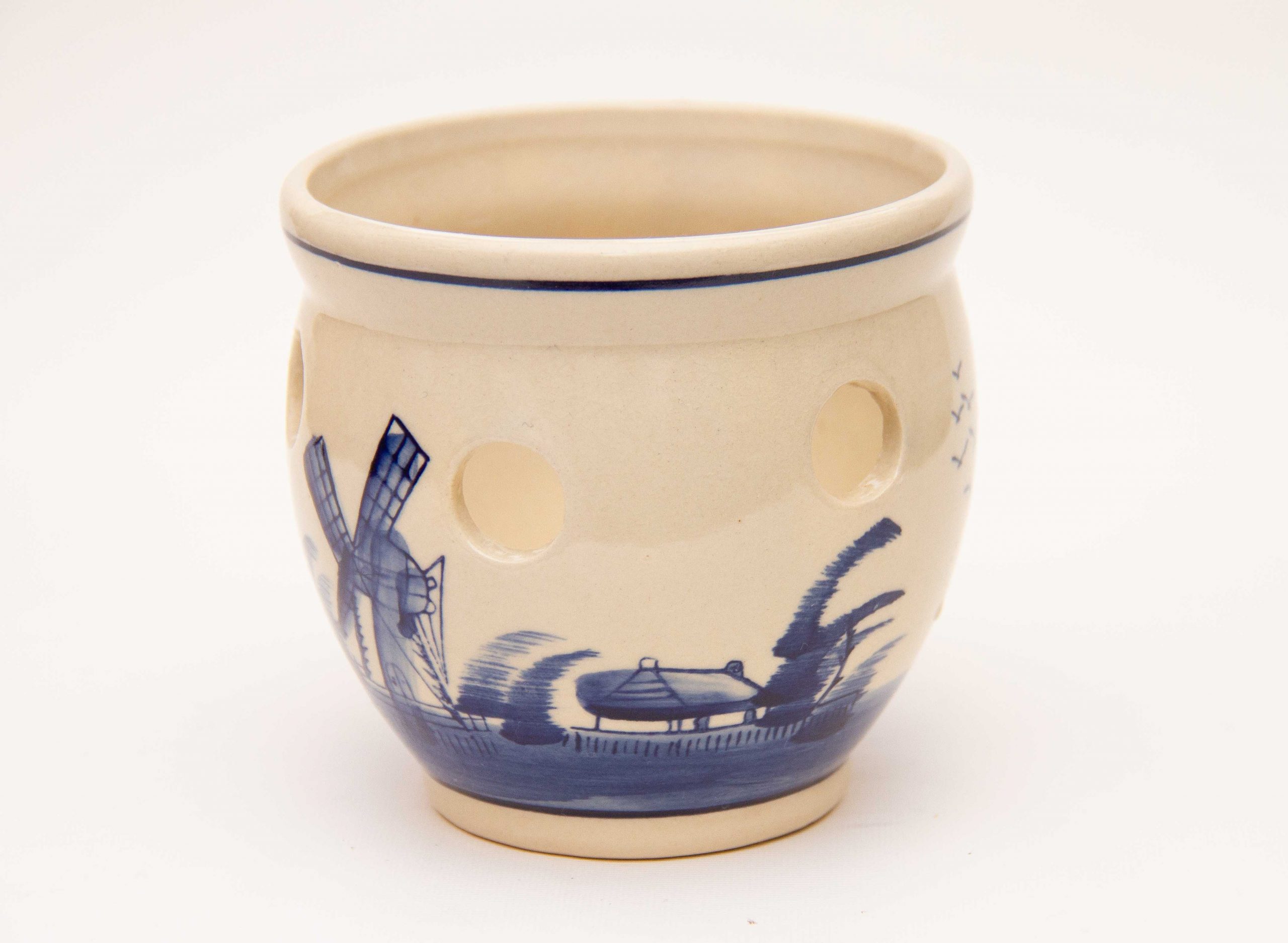 A small Delft Holland plant pot in blue and white with a Dutch windmill design on.