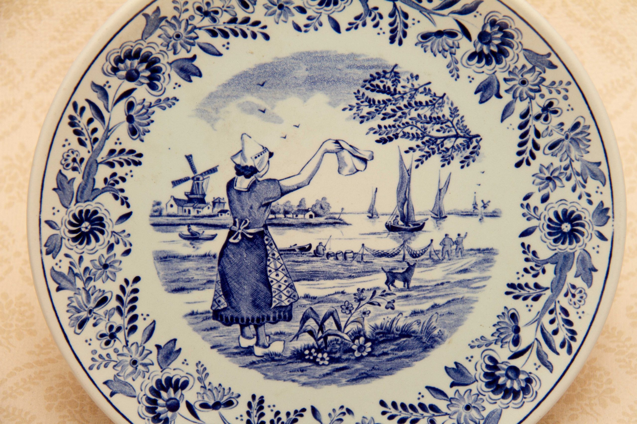 A vintage Delfts blue and white plate with a Dutch scene on made for Royal Sphinx Holland By Boch Belgium.