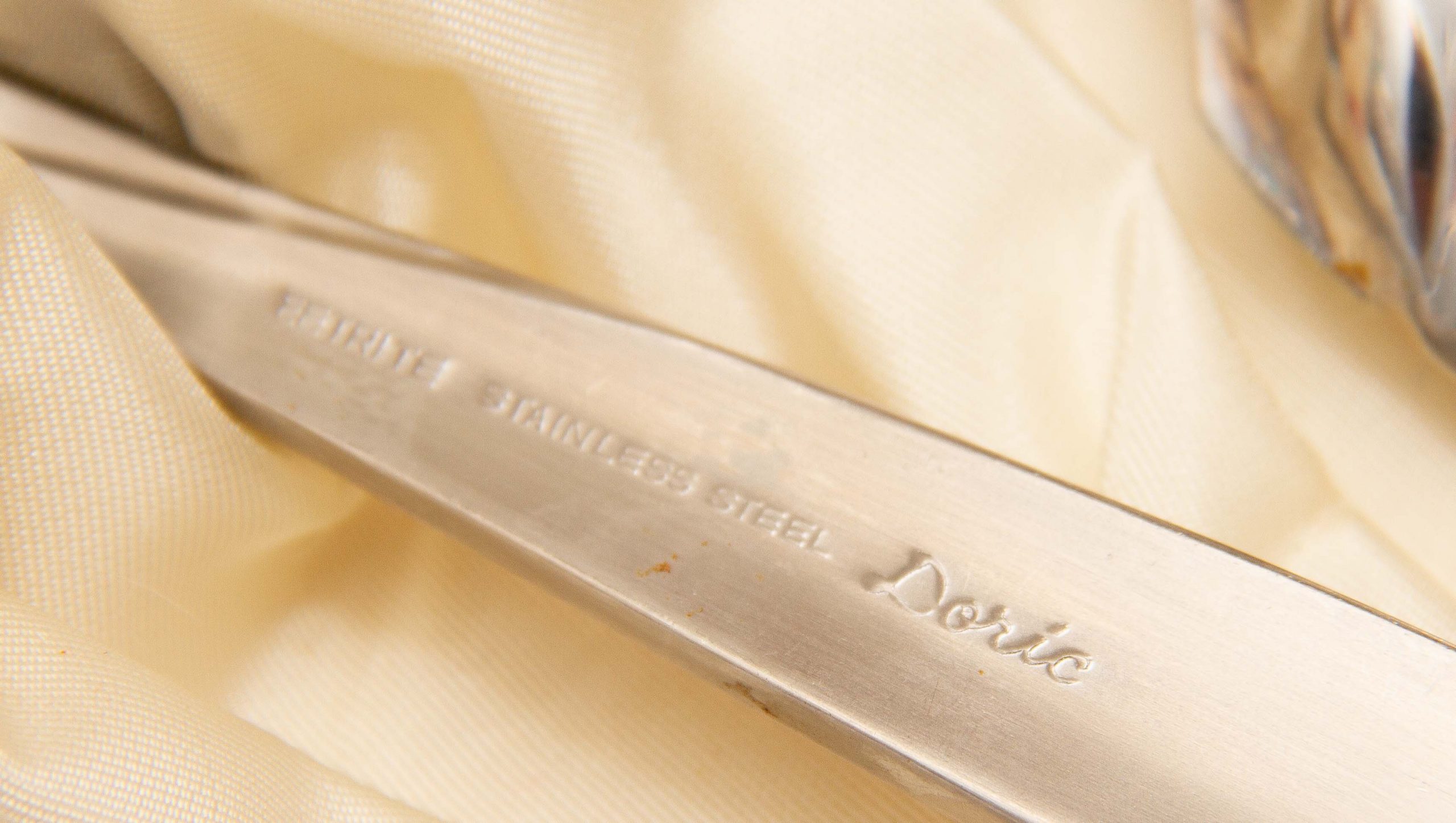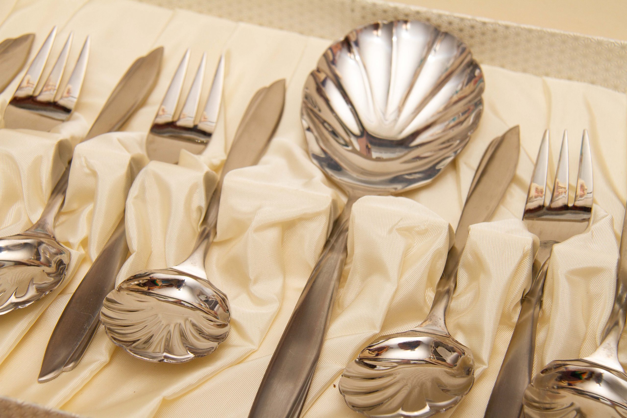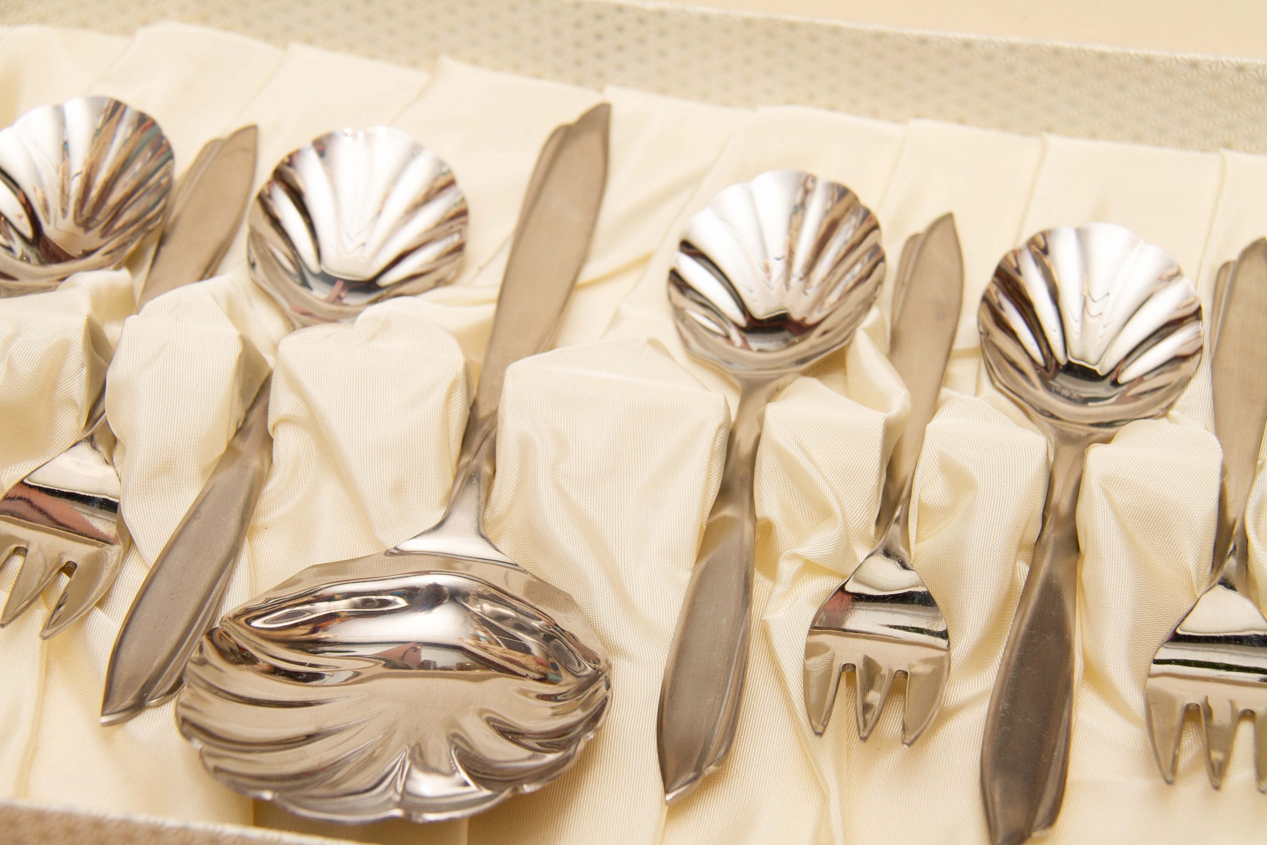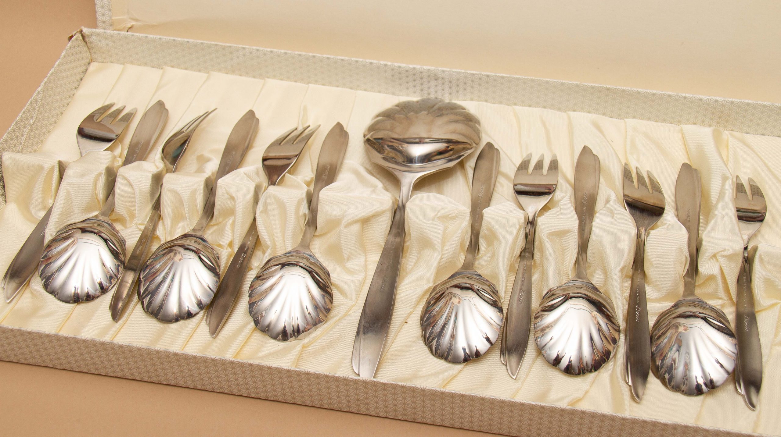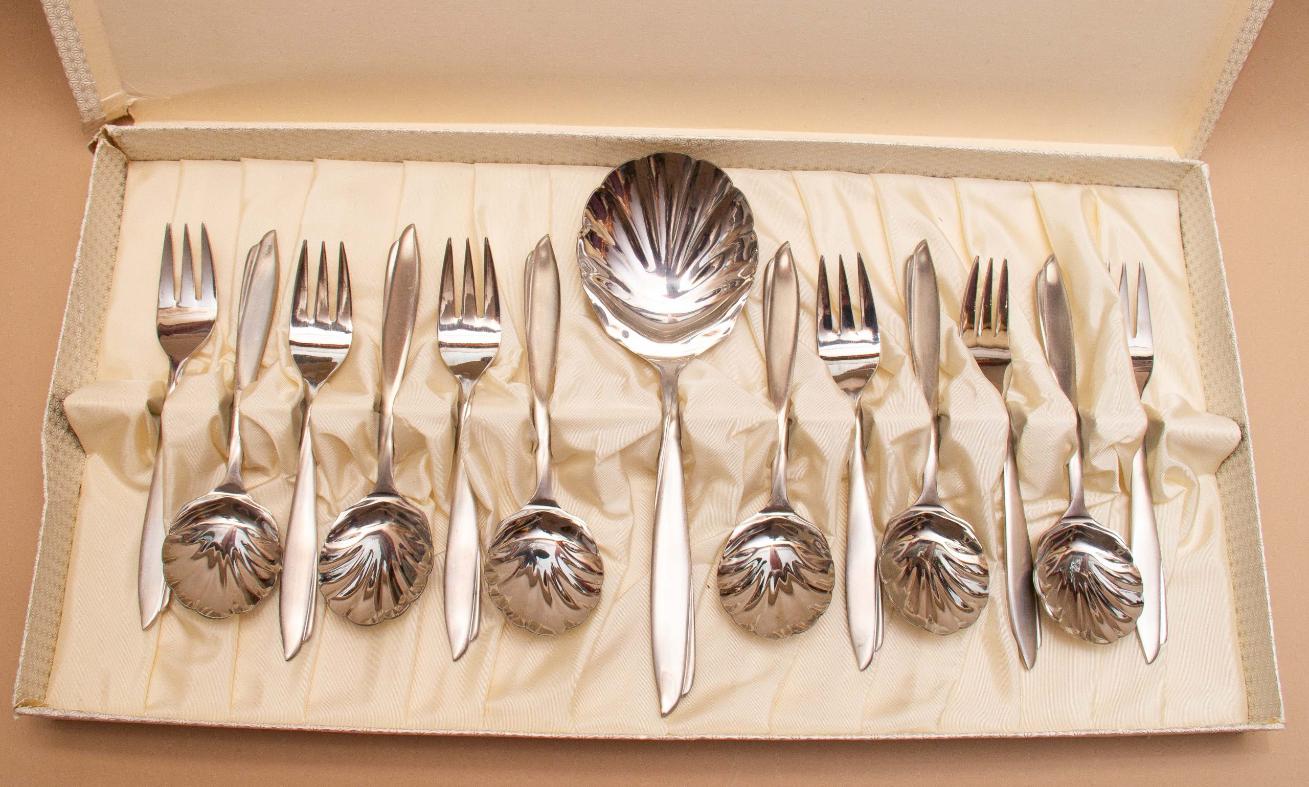 This is a beautiful vintage 6 setting desert cutlery set in the Doric pattern by Eetrite, made from stainless steel. The spoons have shell shape bowls and the set consists of 6 spoons, 6 forks and a large serving spoon, complete in their original fitted box.