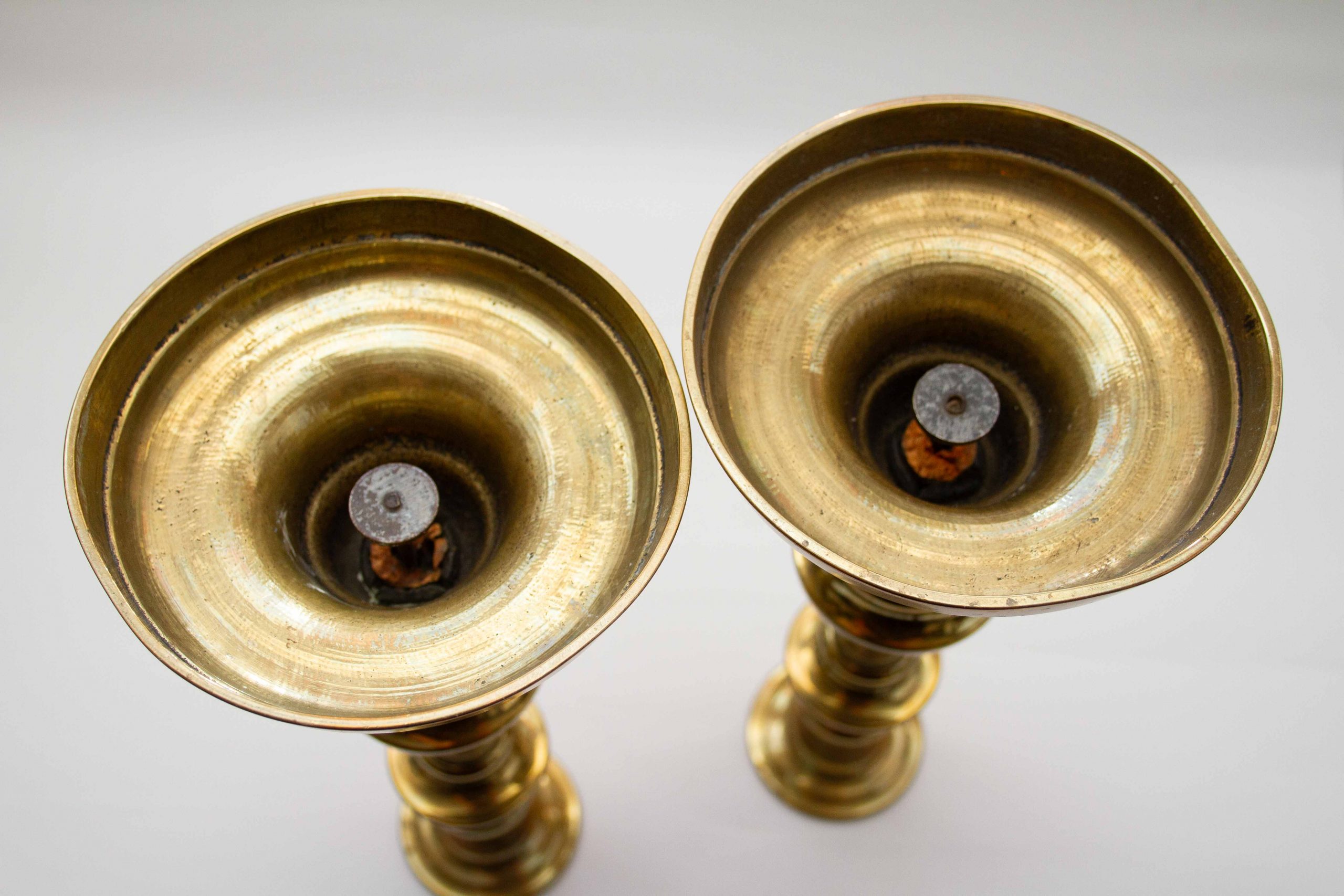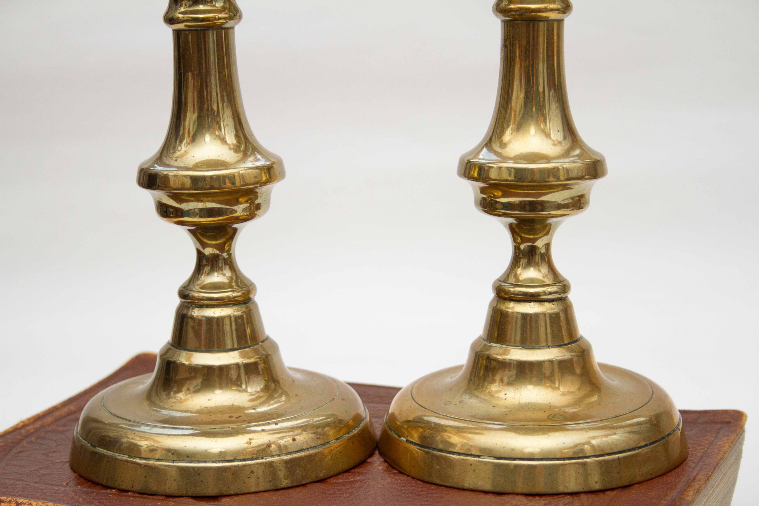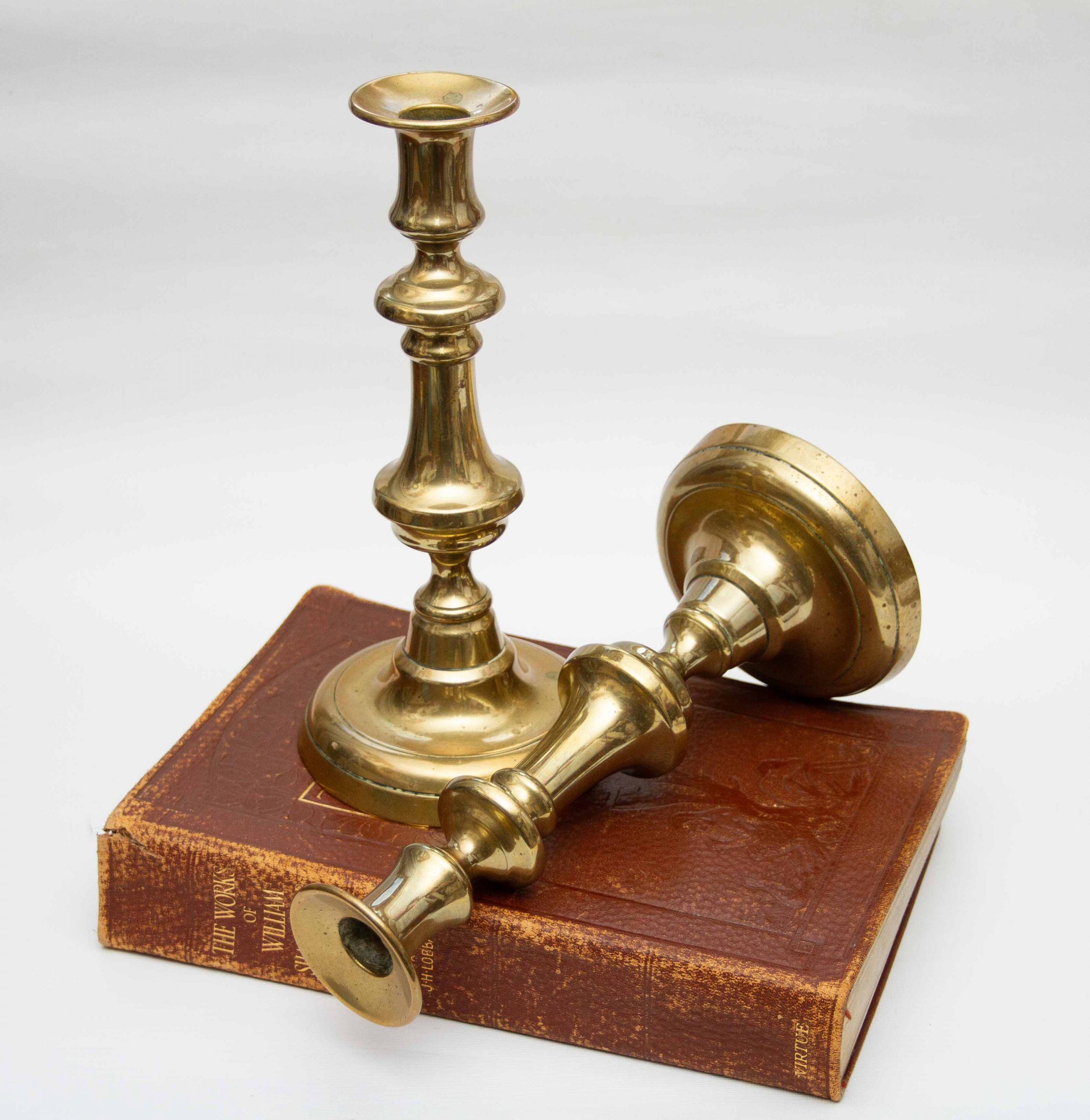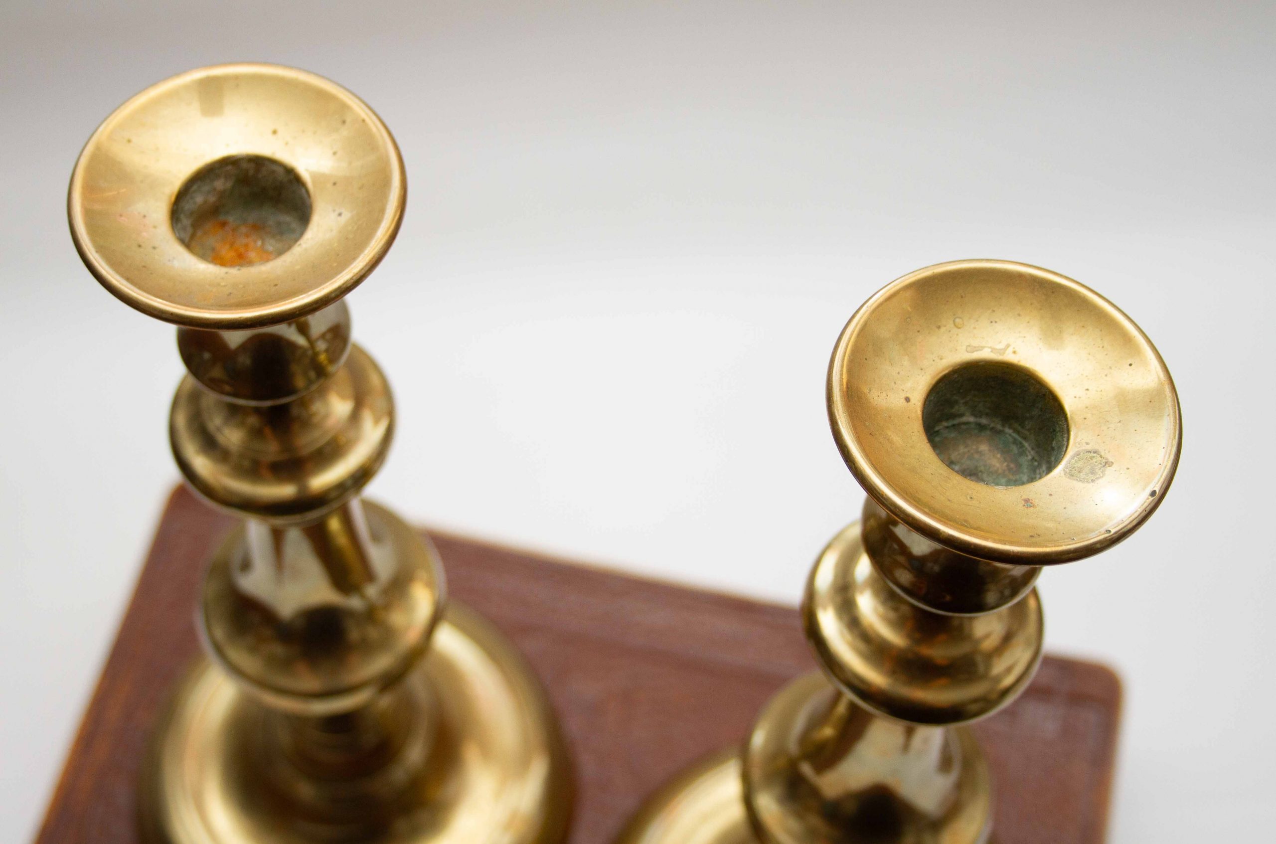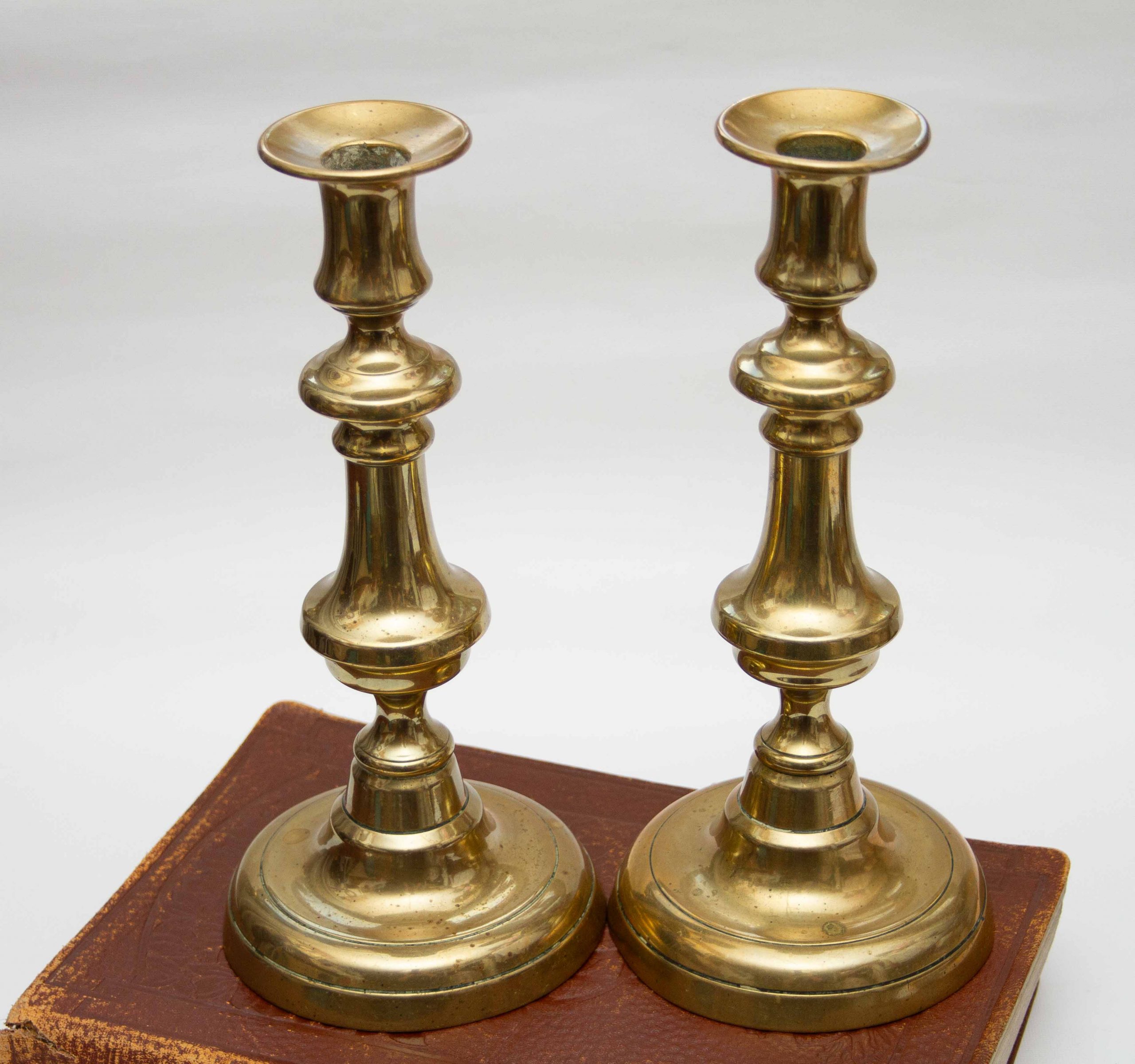 A pair of large brass Edwardian candlesticks with push-ups, suitable for dinner or taper candles.