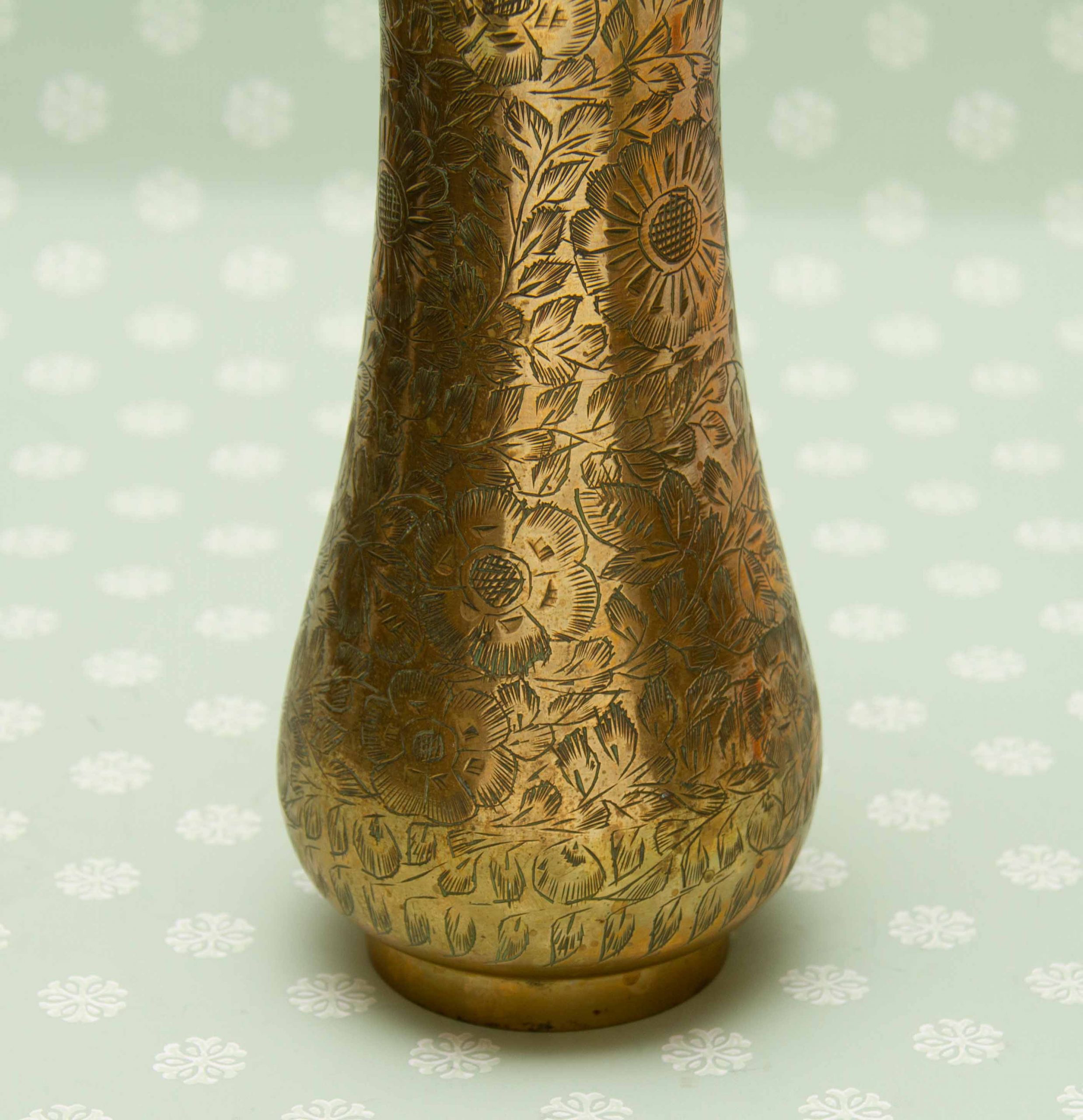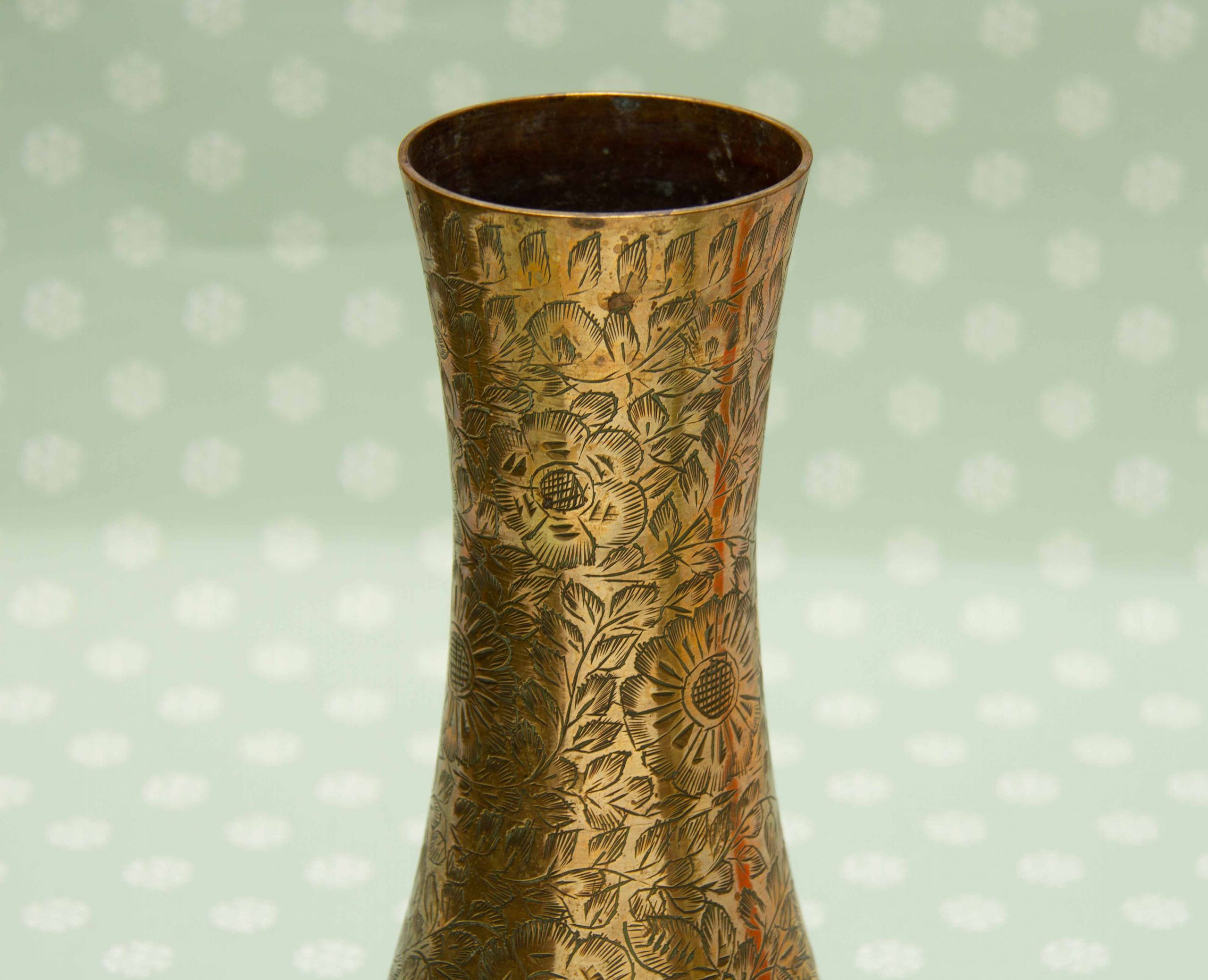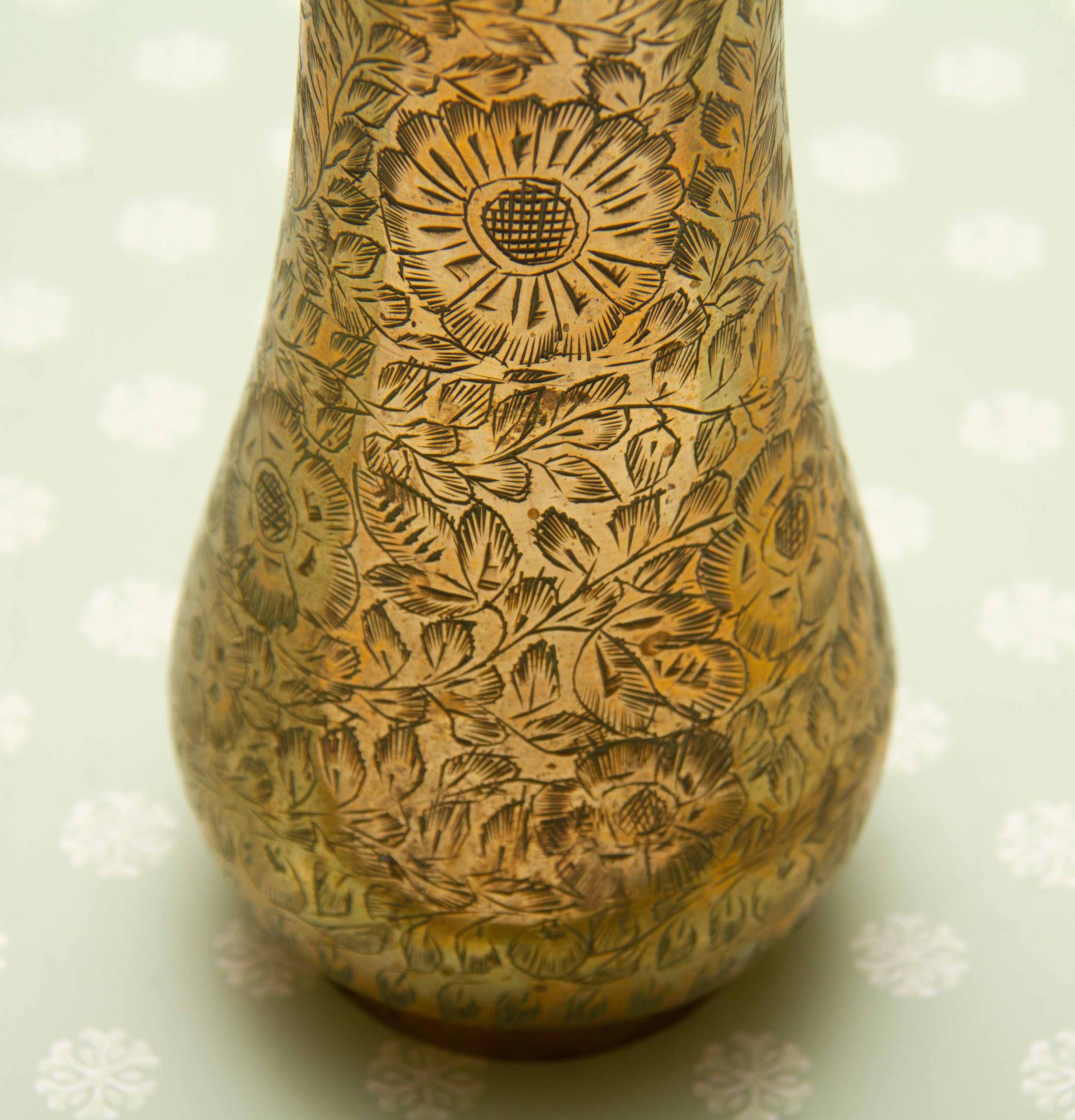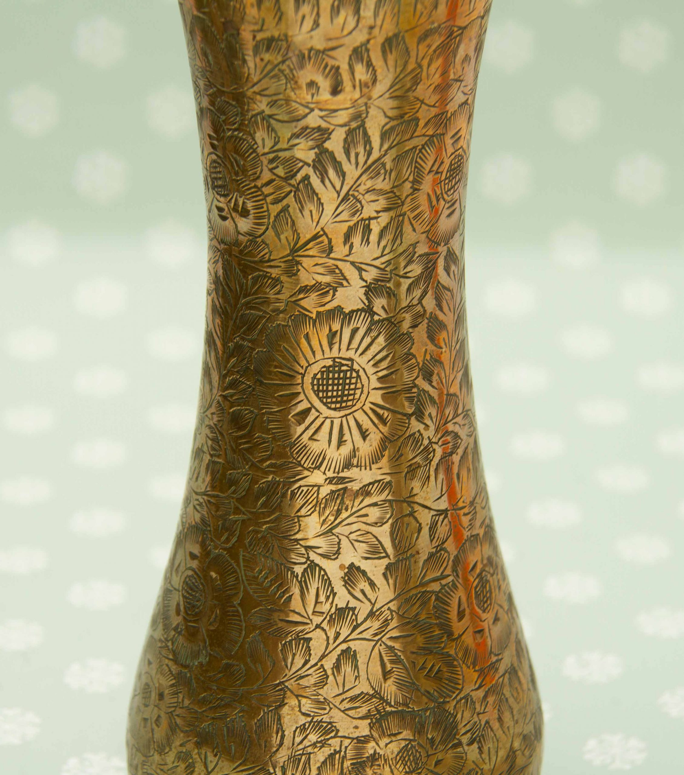 A very nice tall brass vase with an engraved flower pattern on. Made in India