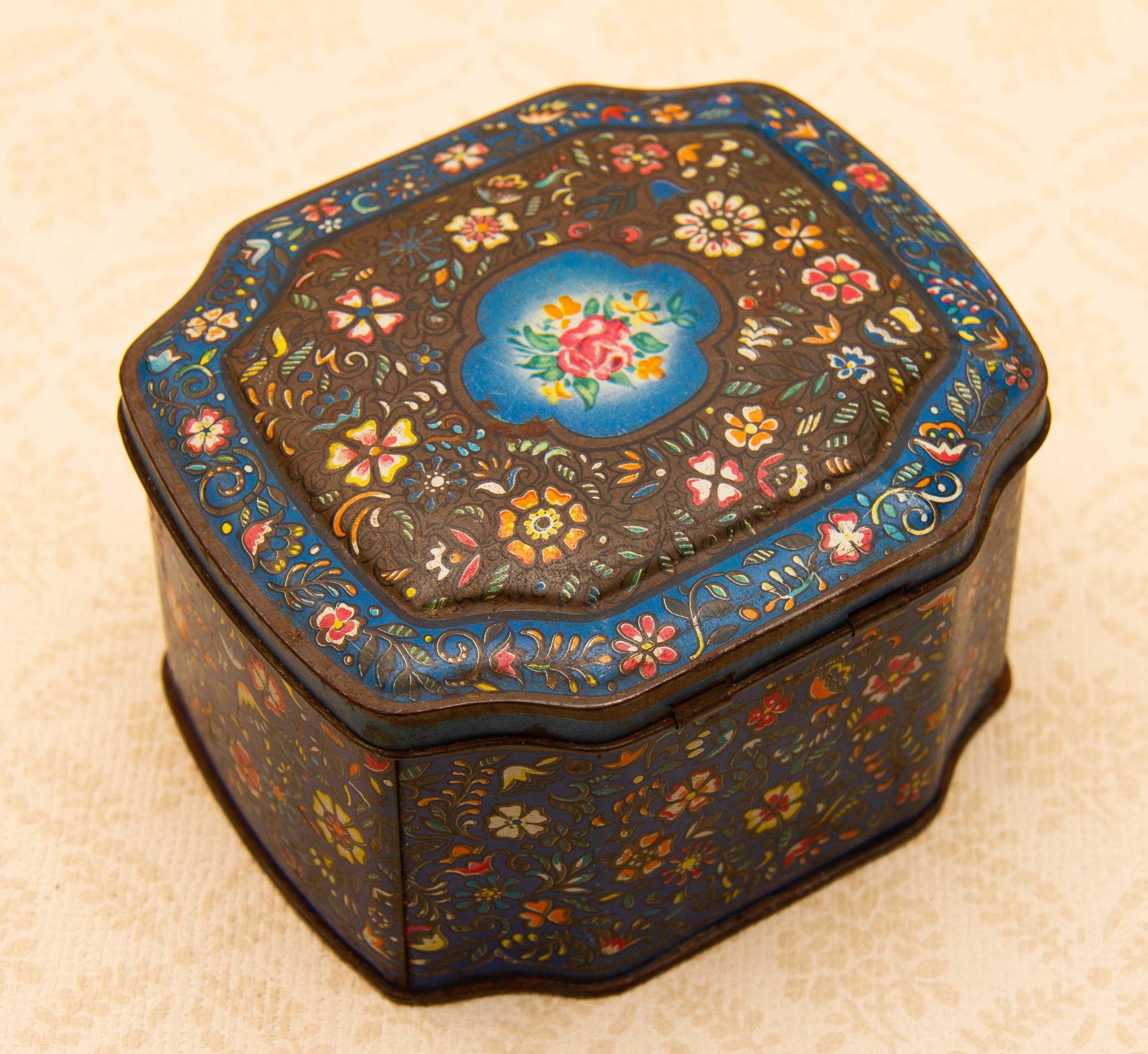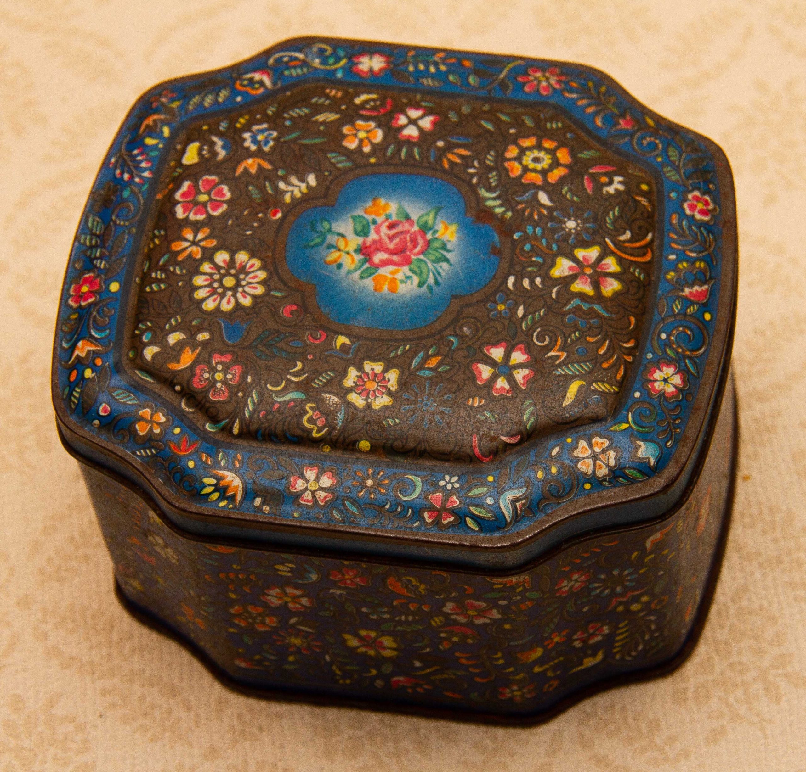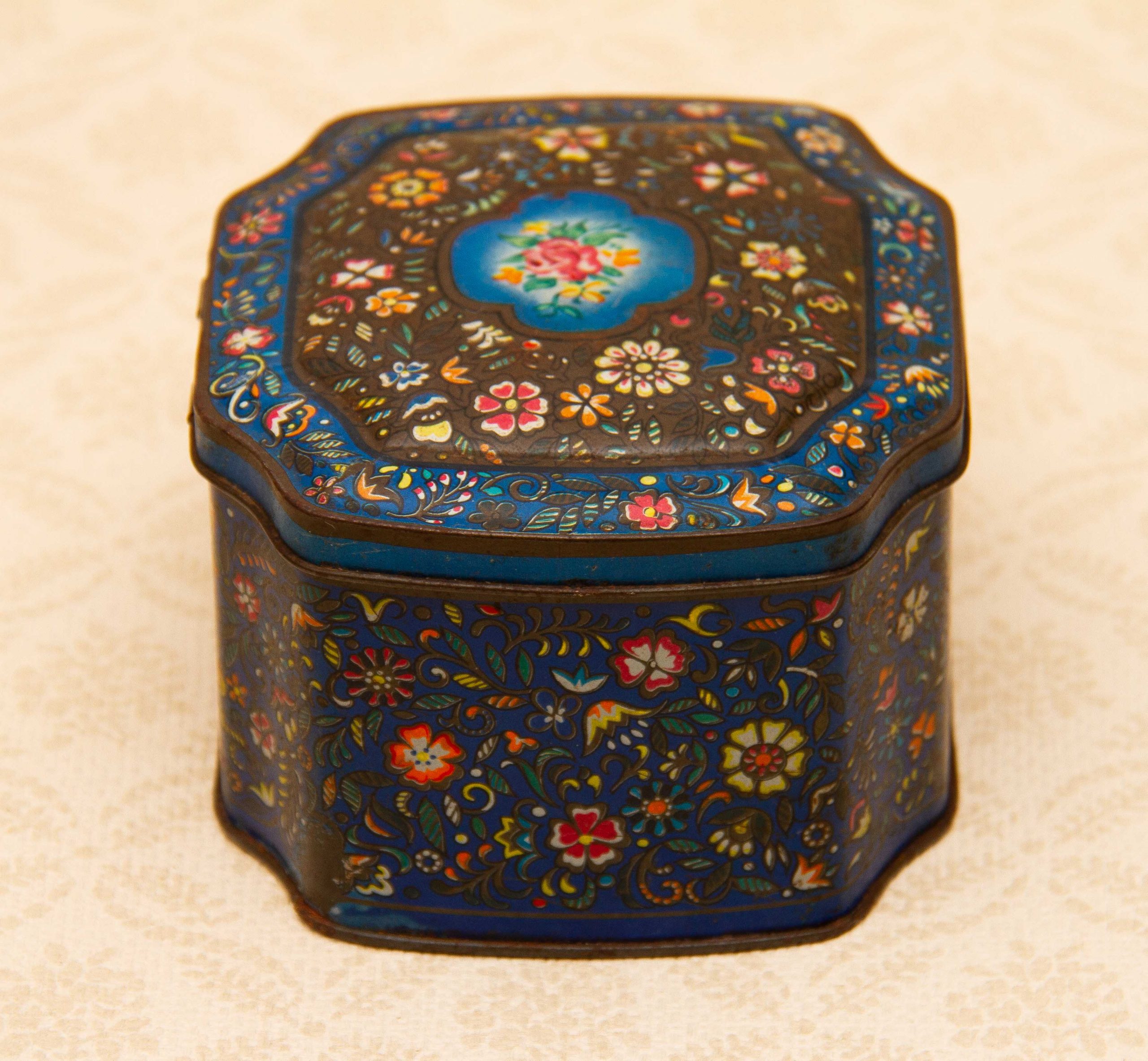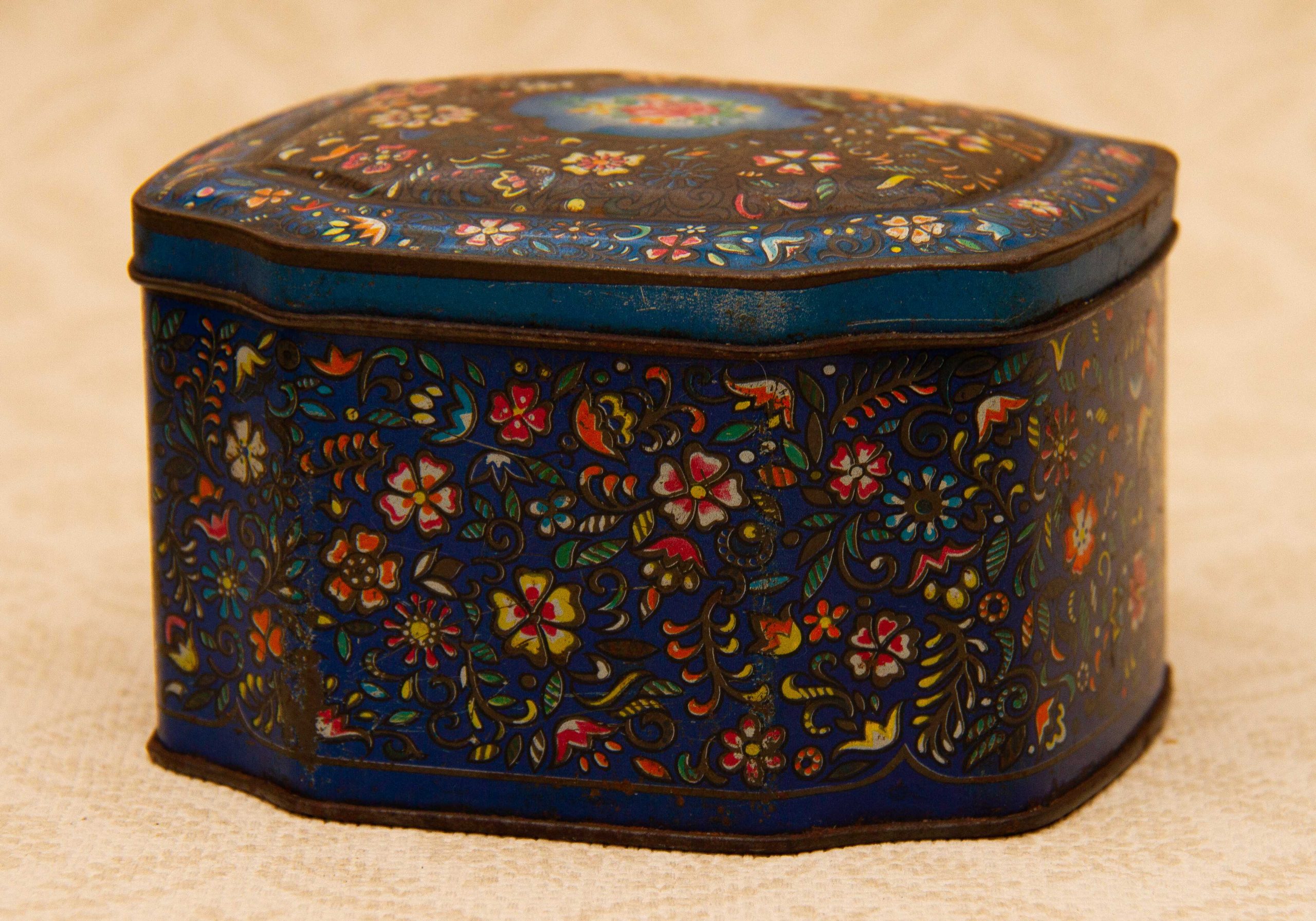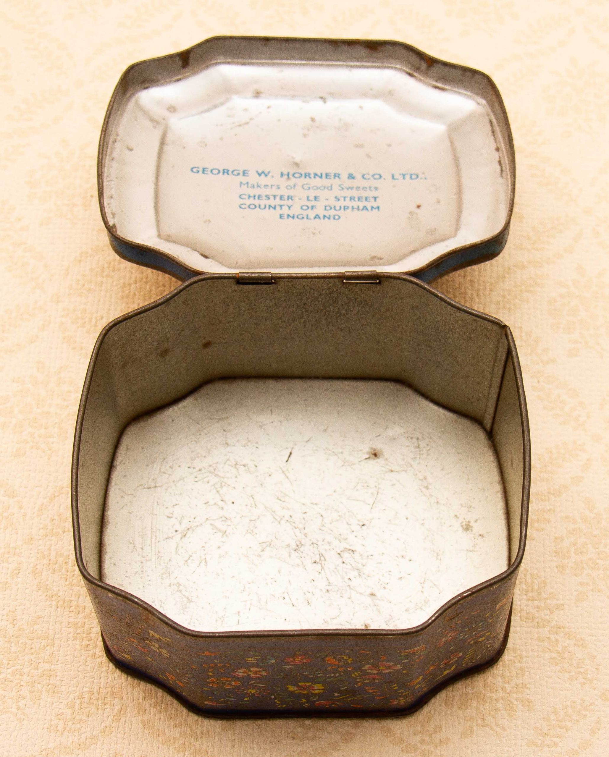 A George W. Horner & Co, Chester Le Street, County Durham vintage sweet tin, with a dark blue floral design on and a hinged lid.
