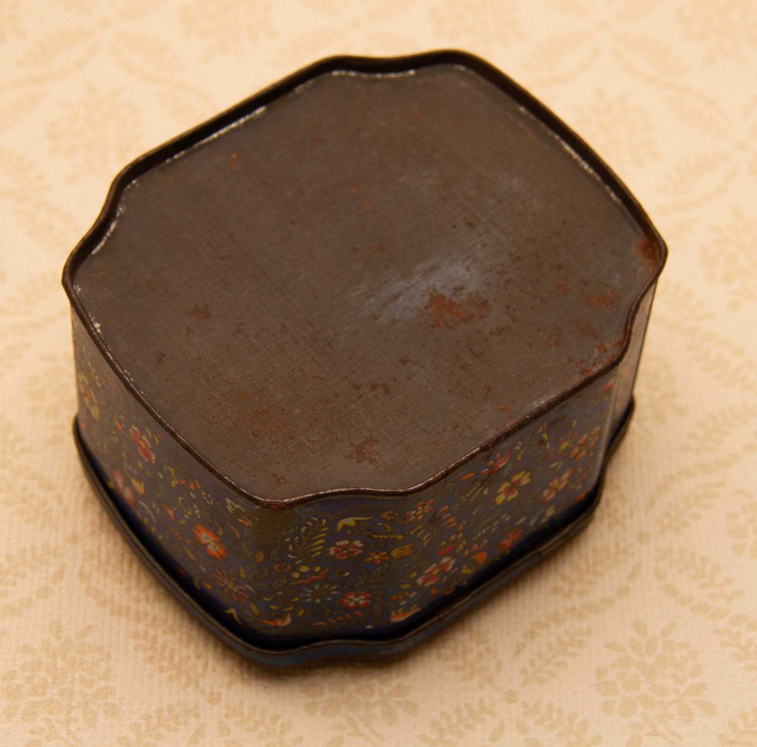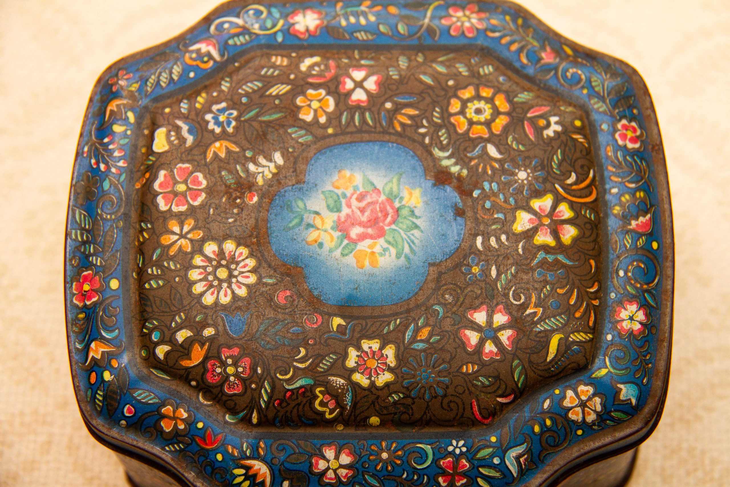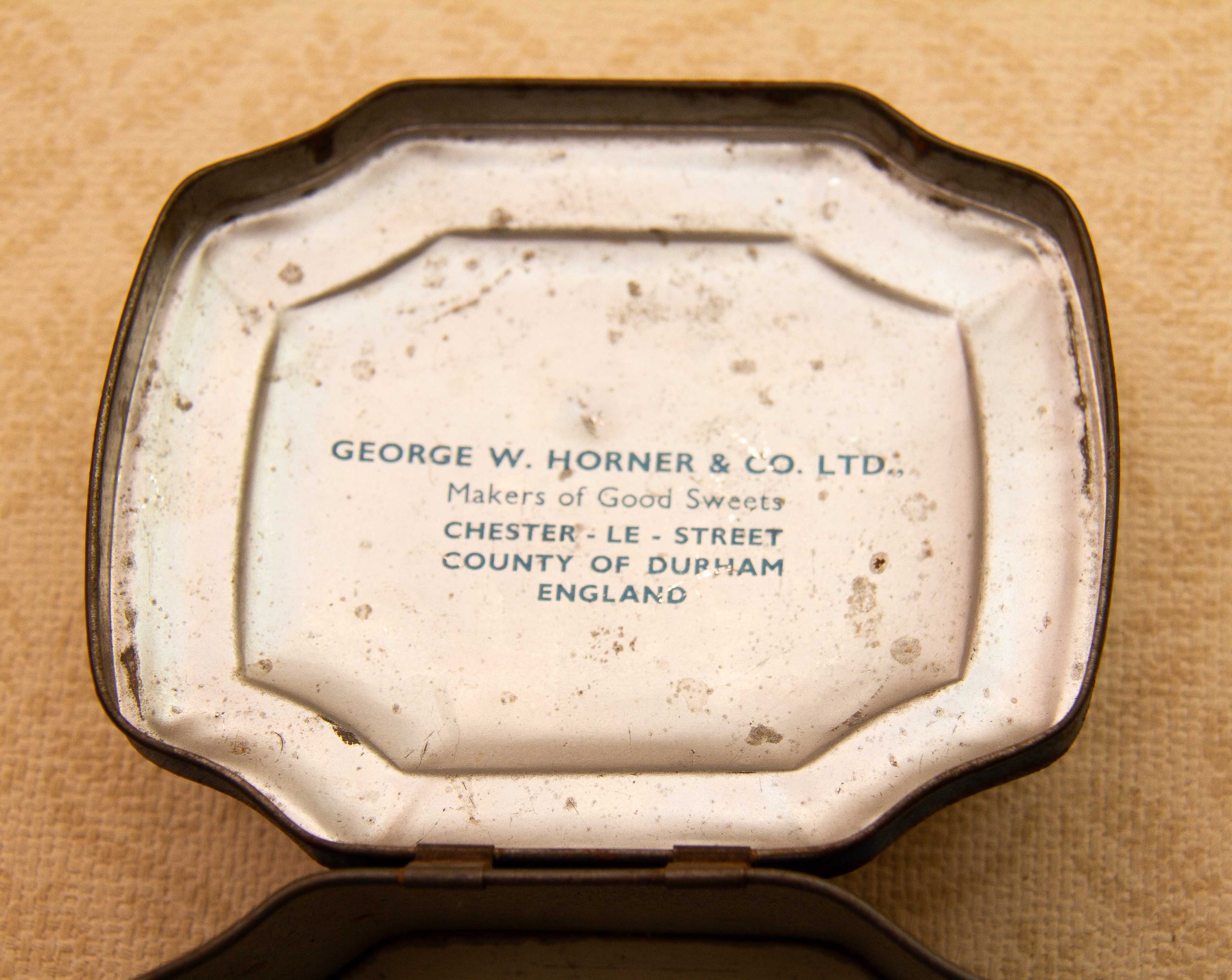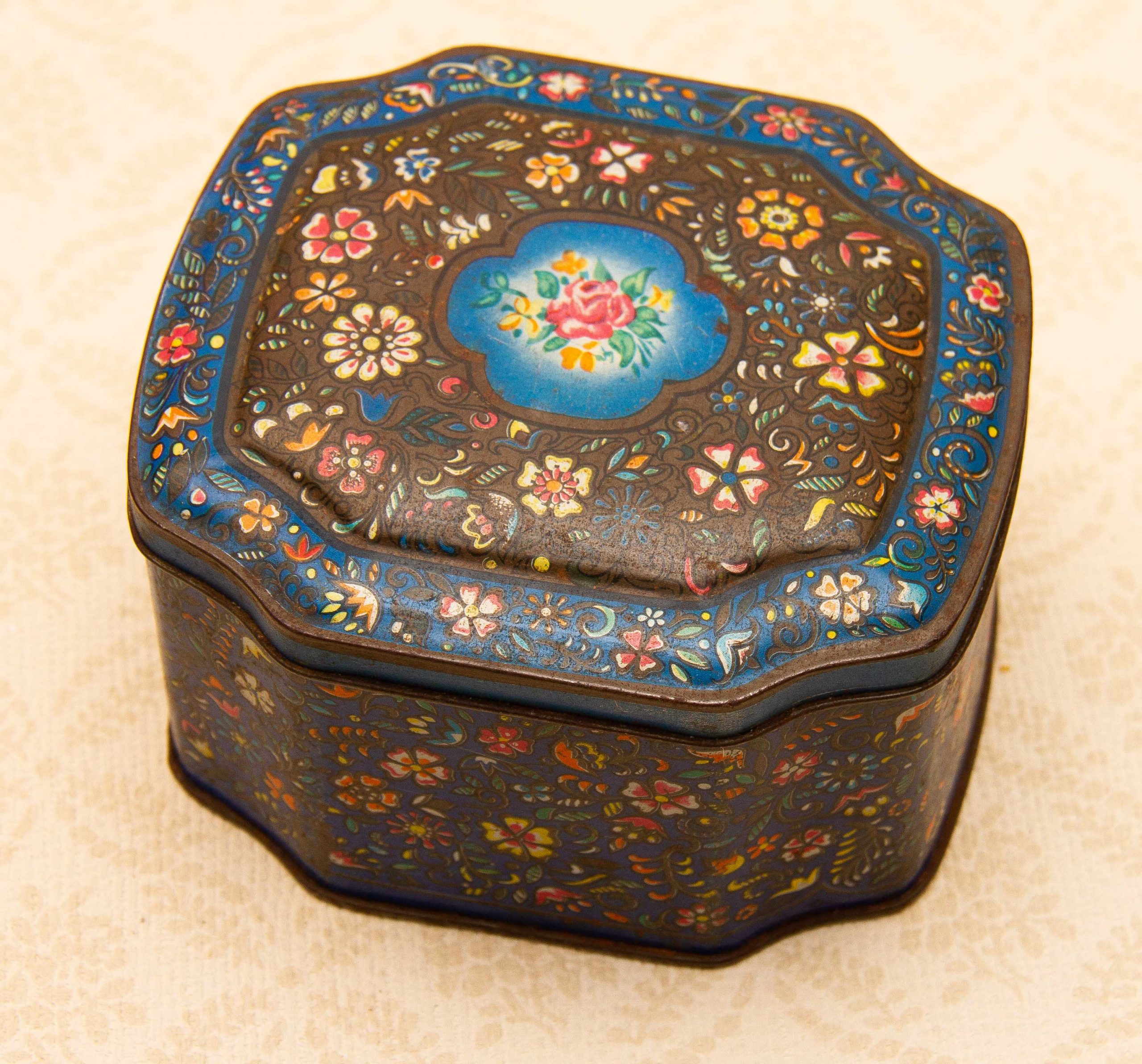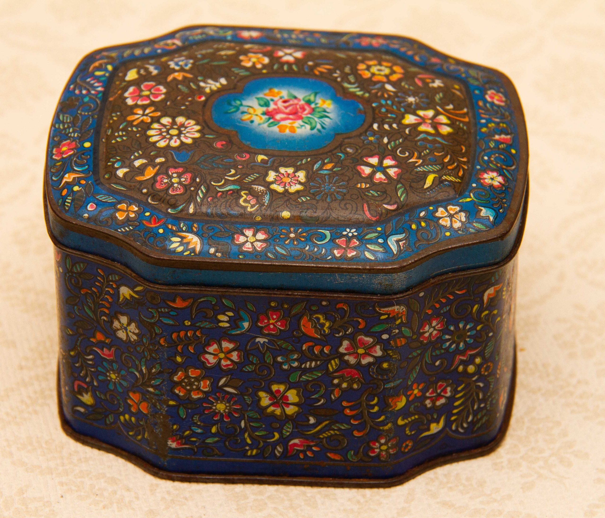 A George W. Horner & Co, Chester Le Street, County Durham vintage sweet tin, with a dark blue floral design on and a hinged lid.