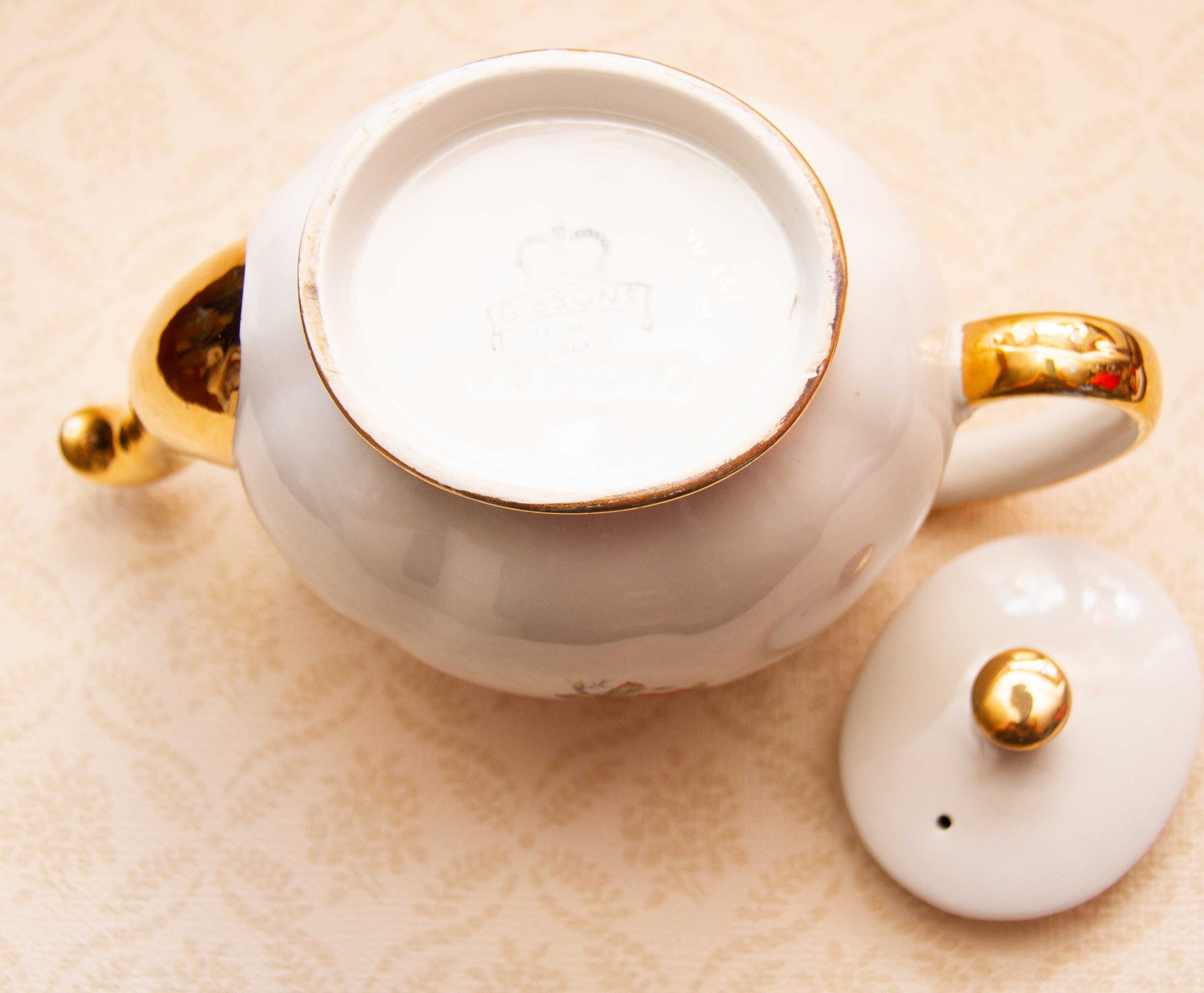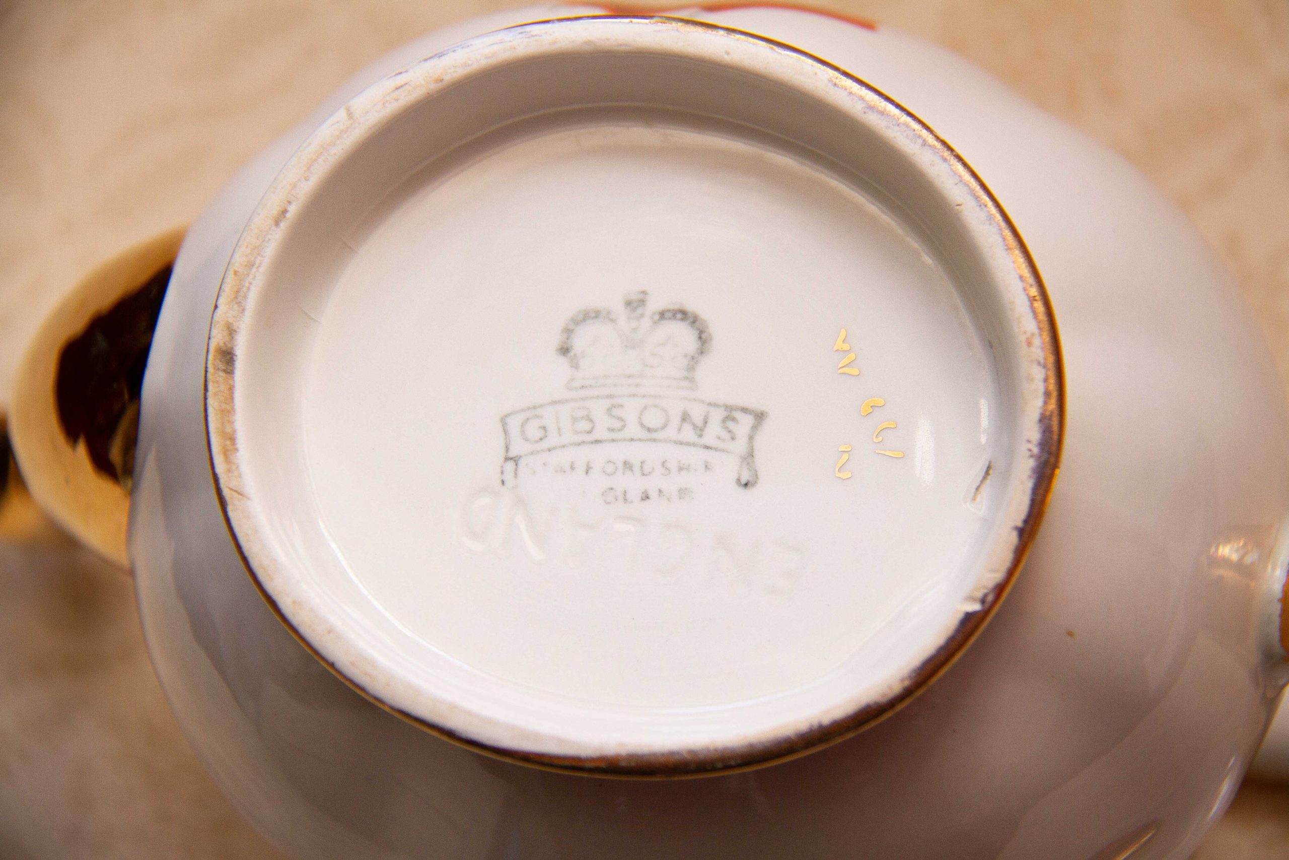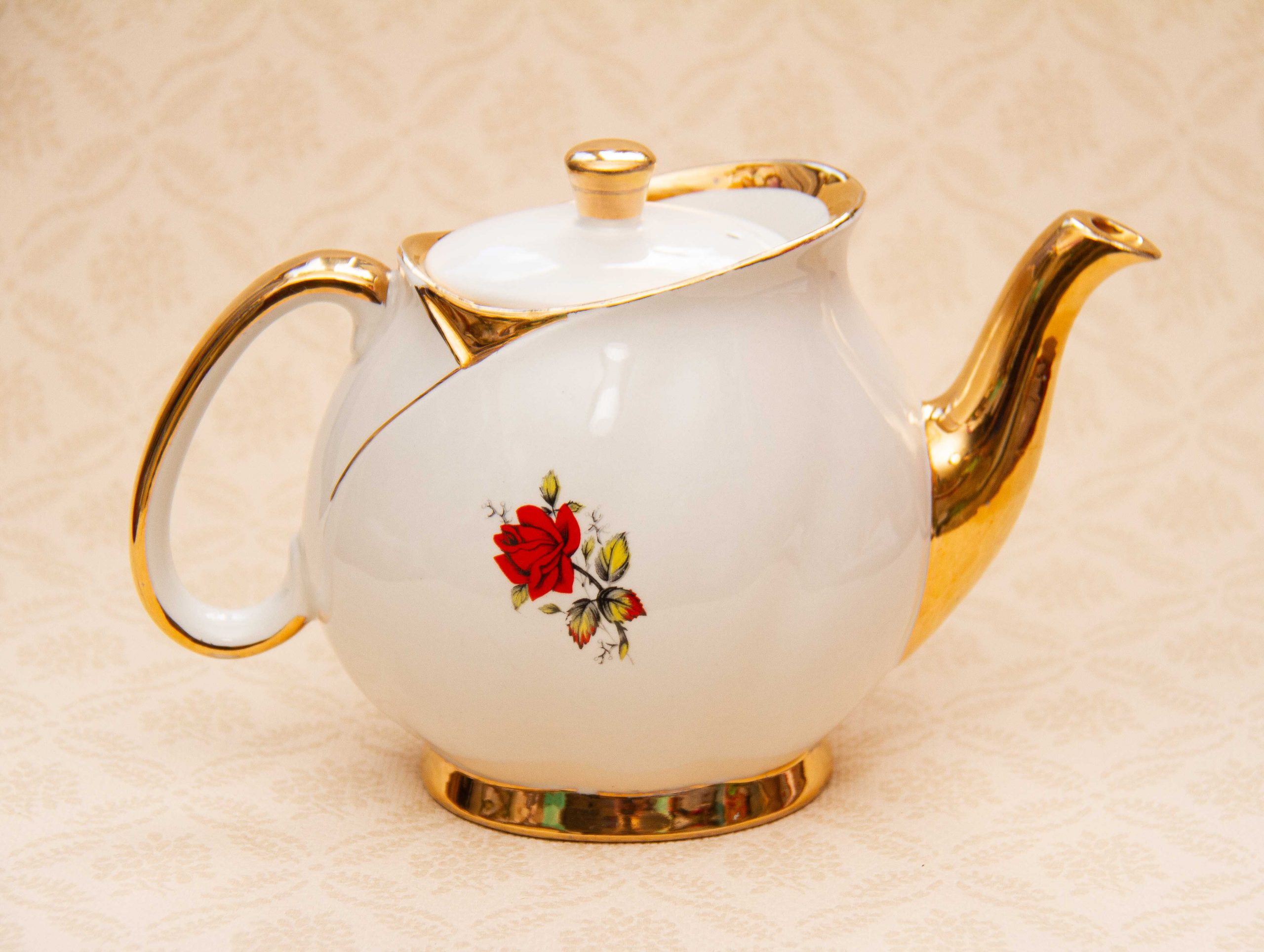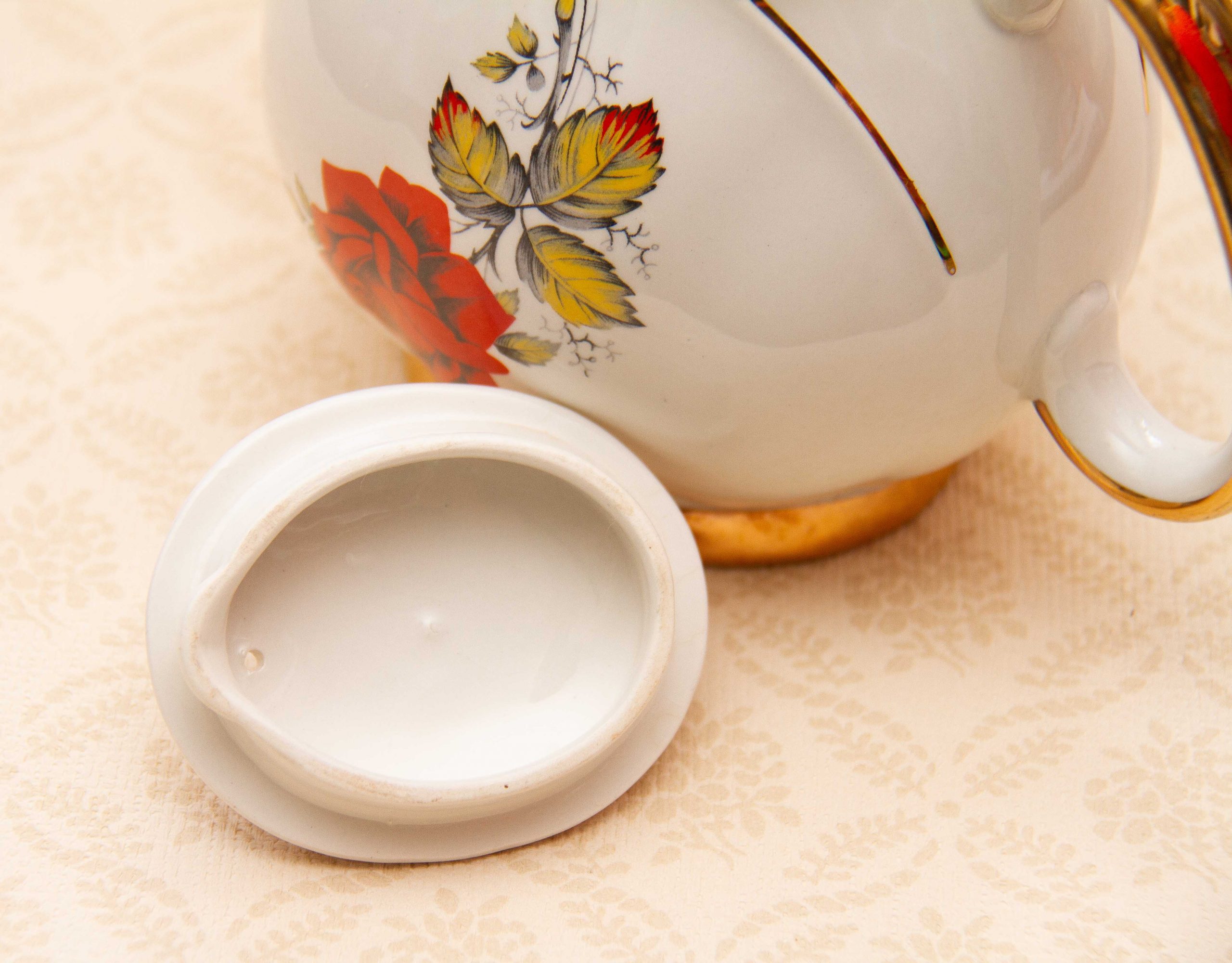 A red rose floral pattern teapot with gold accents, by Gibsons Pottery of Stoke on Trent, England.