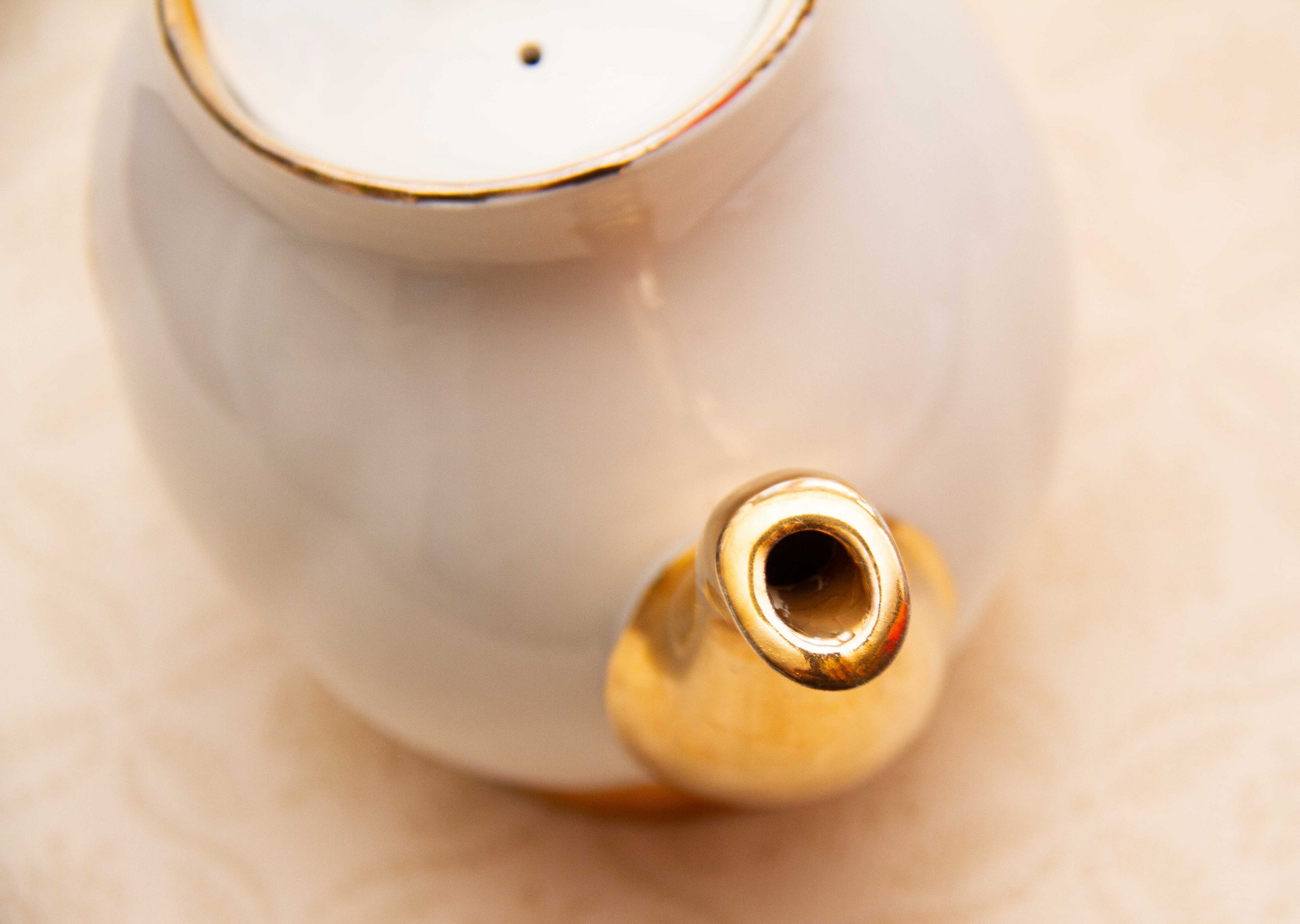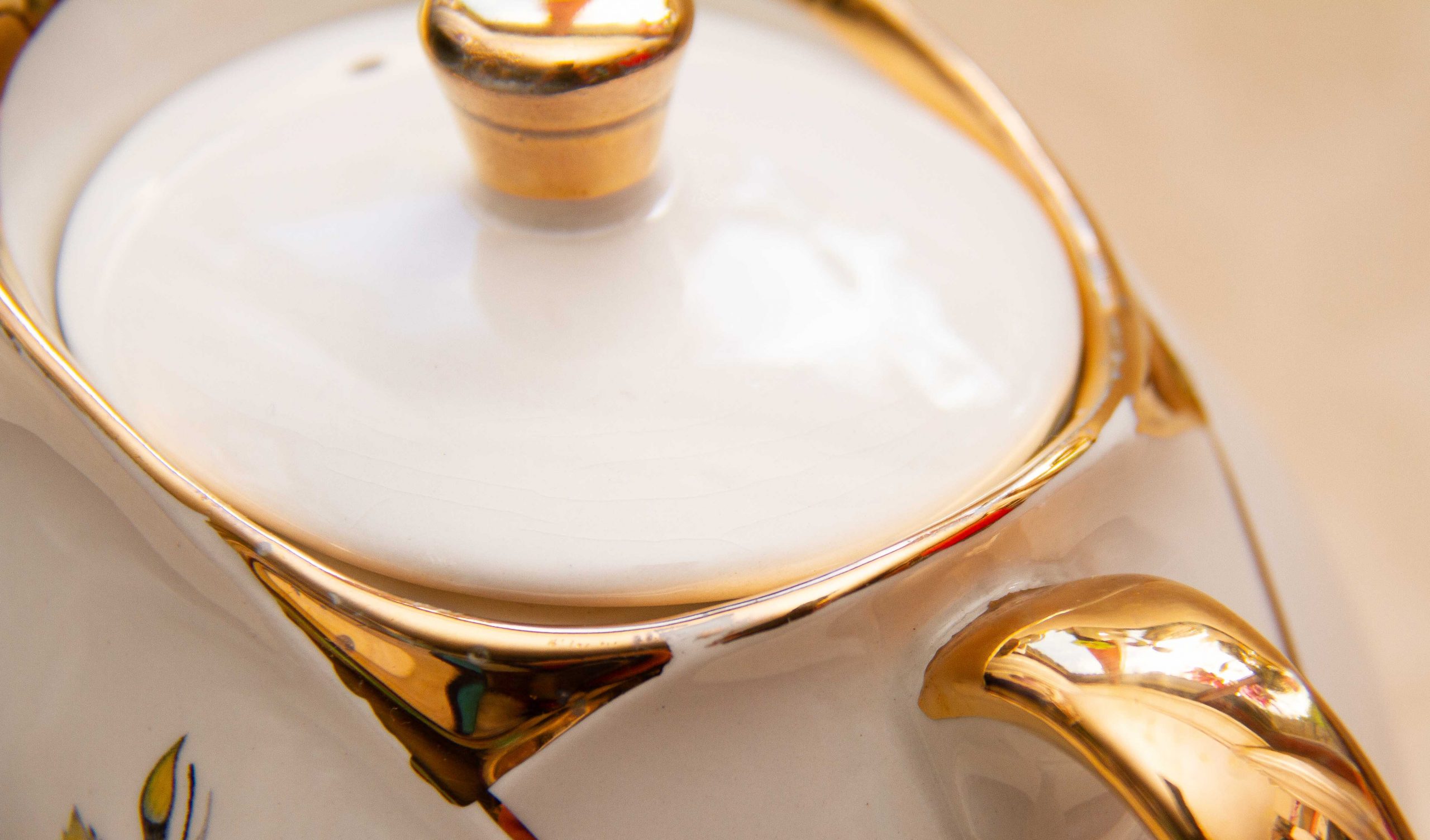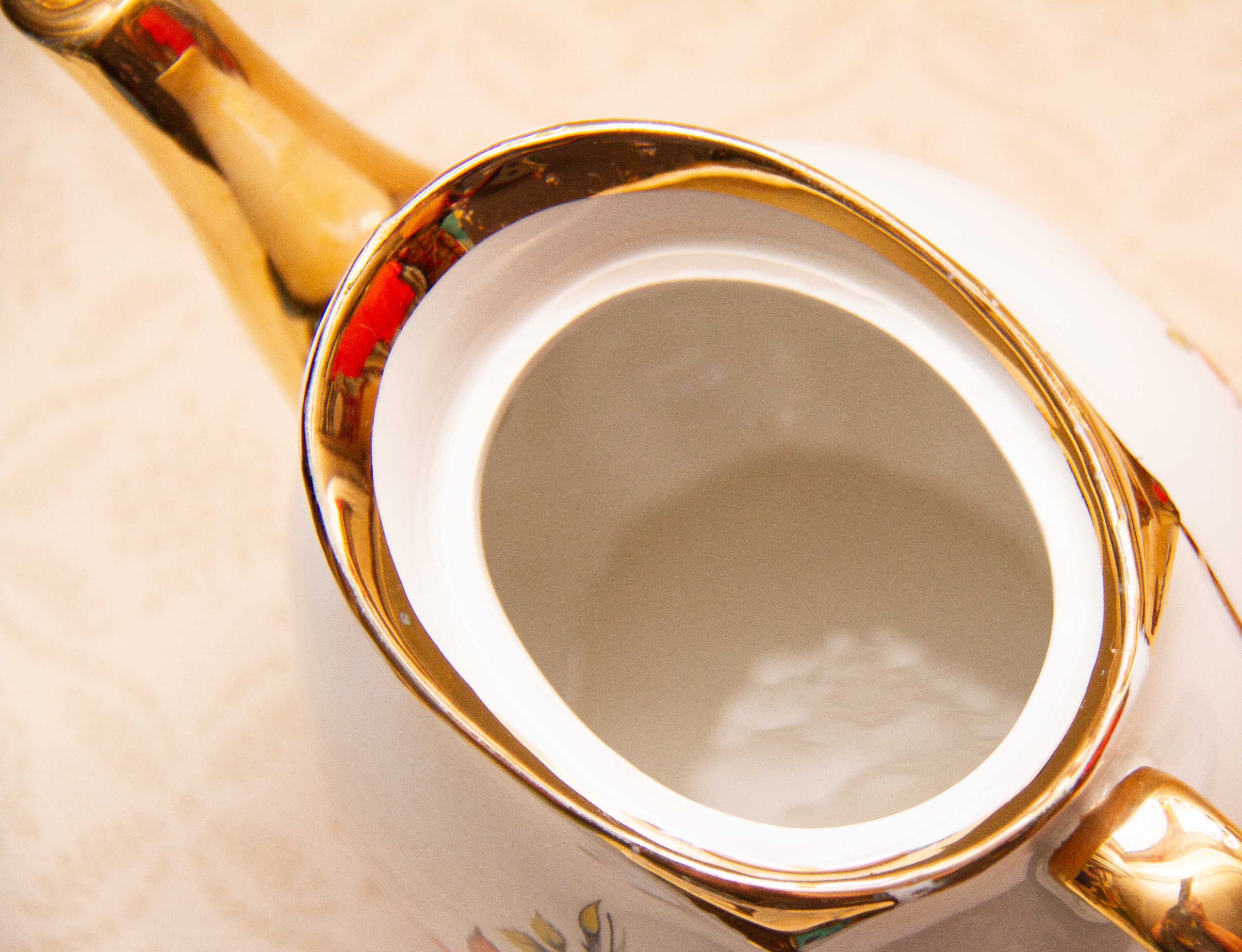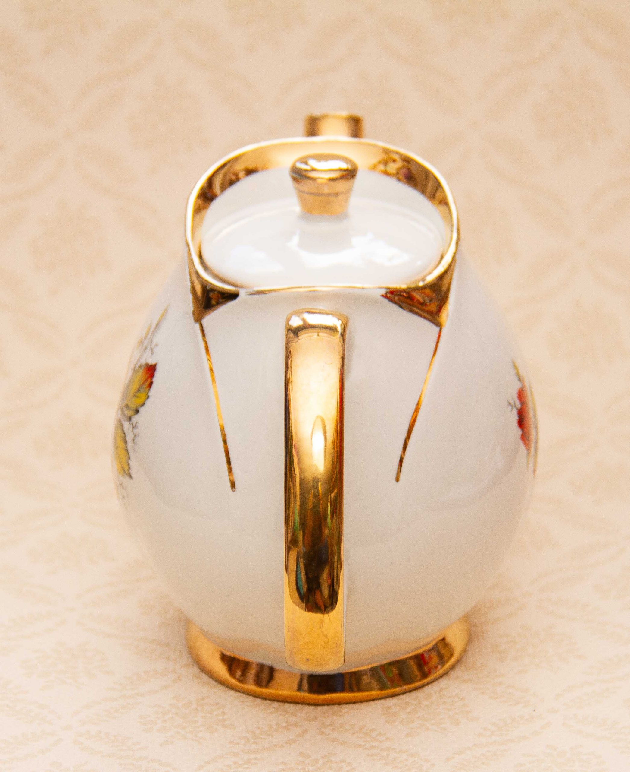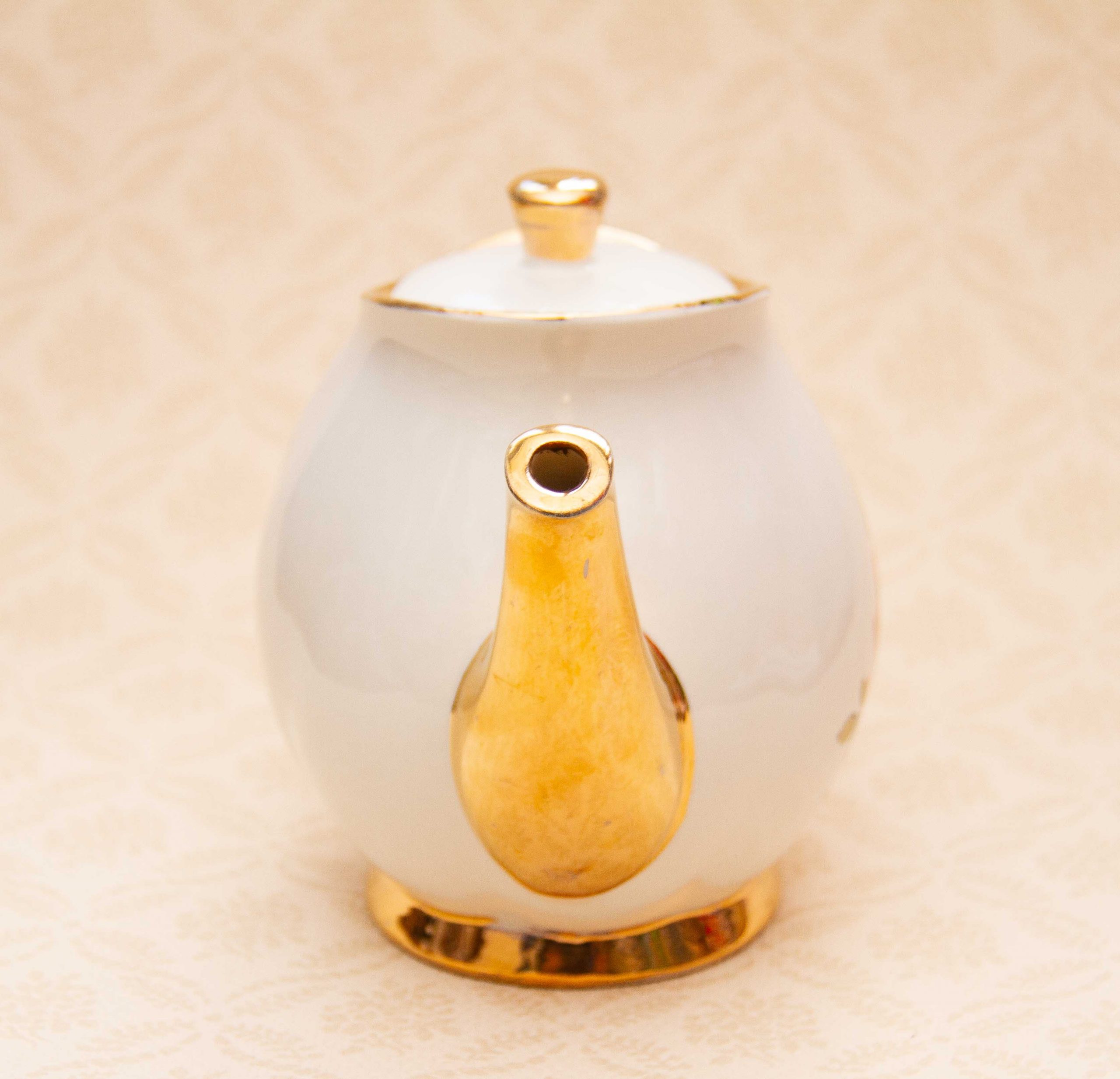 A red rose floral pattern teapot with gold accents, by Gibsons Pottery of Stoke on Trent, England.