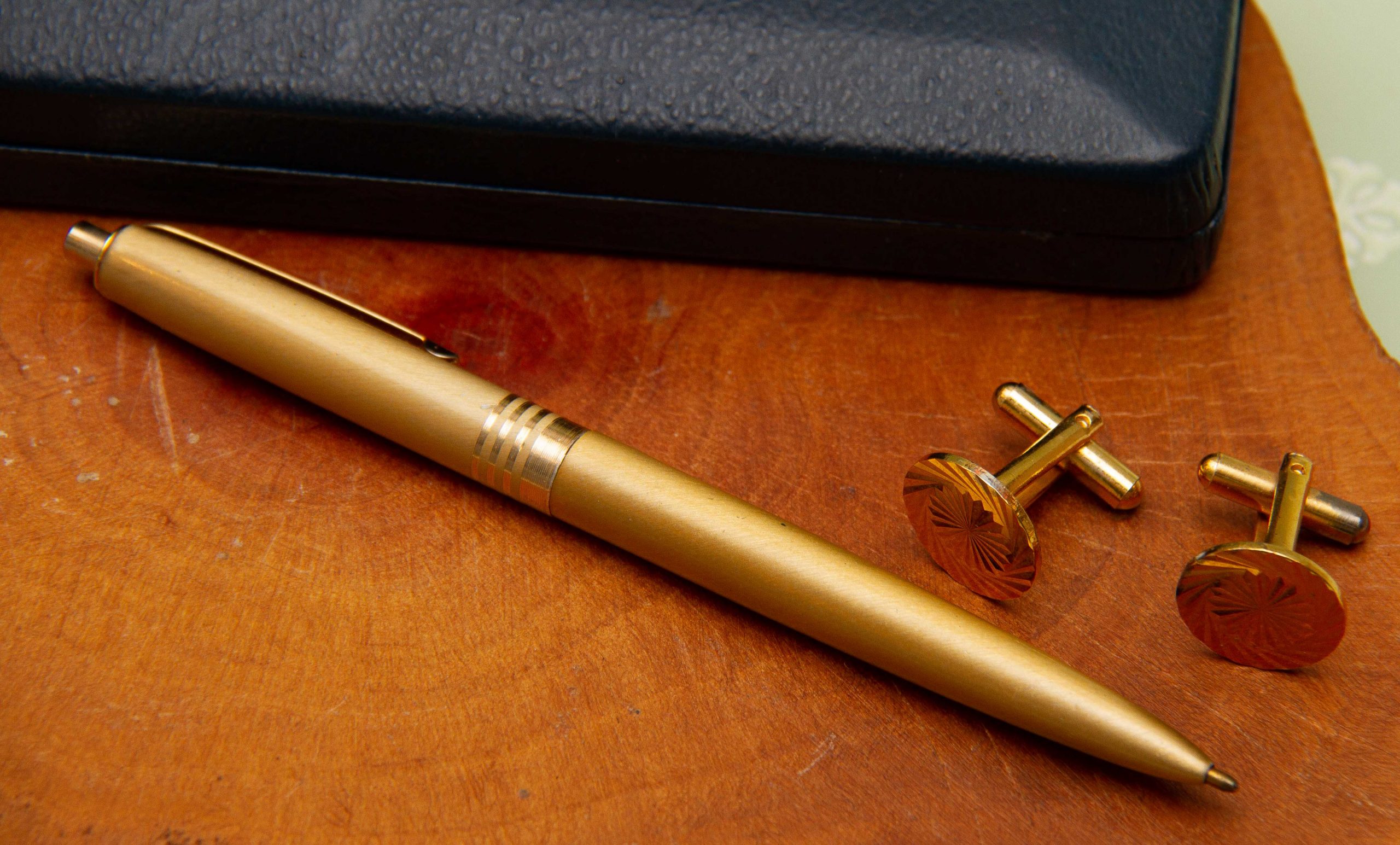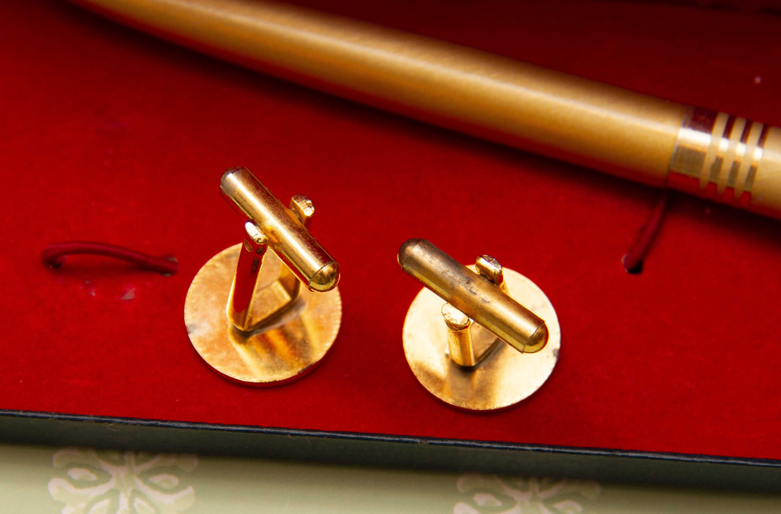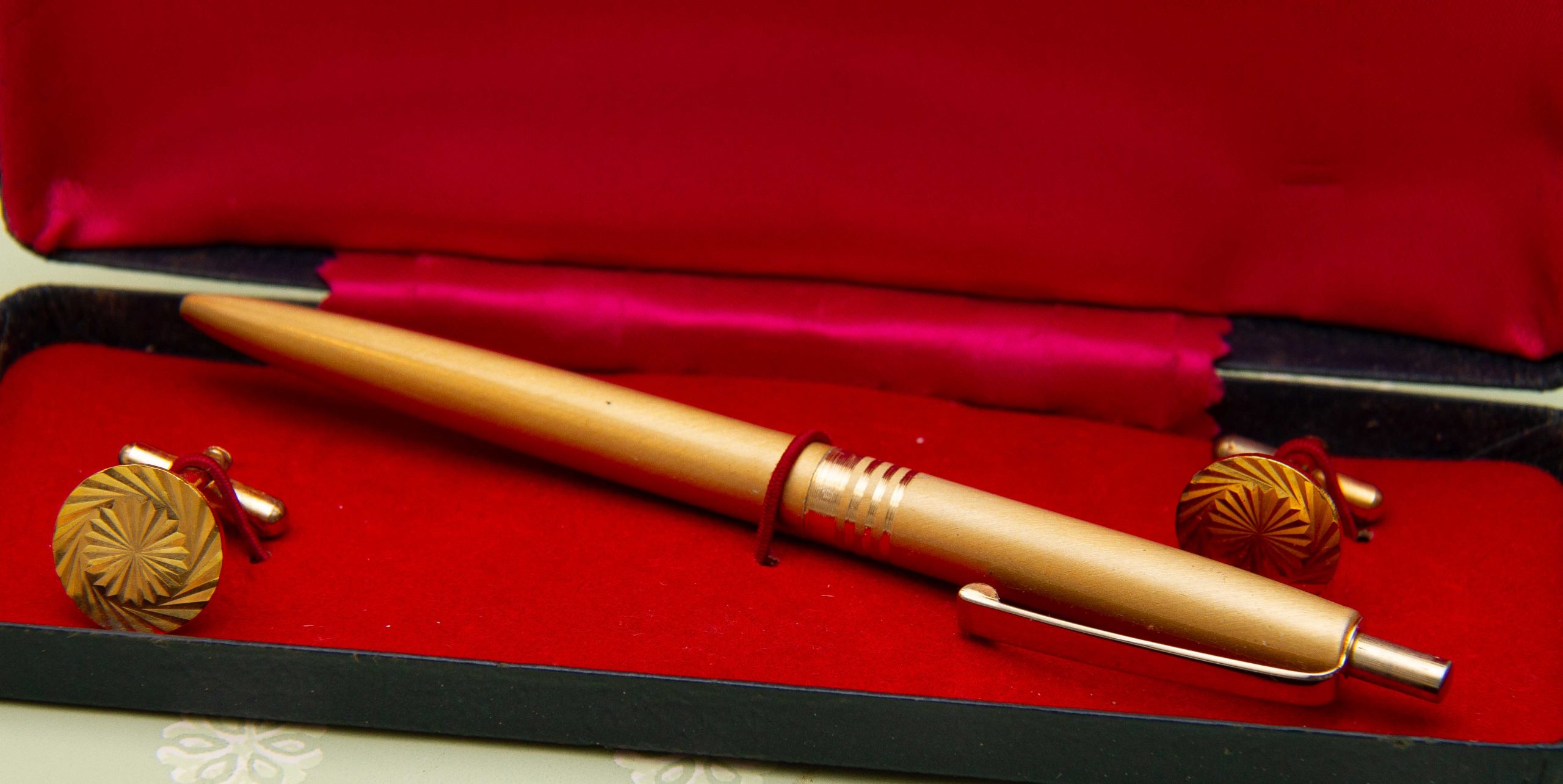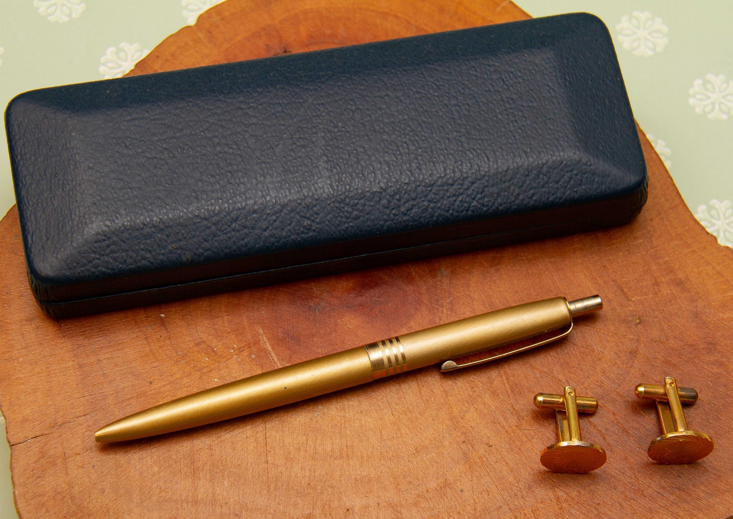 A vintage gift set of a pair of cufflinks and a pen in a gold tone metal. Complete in presentation gift box.