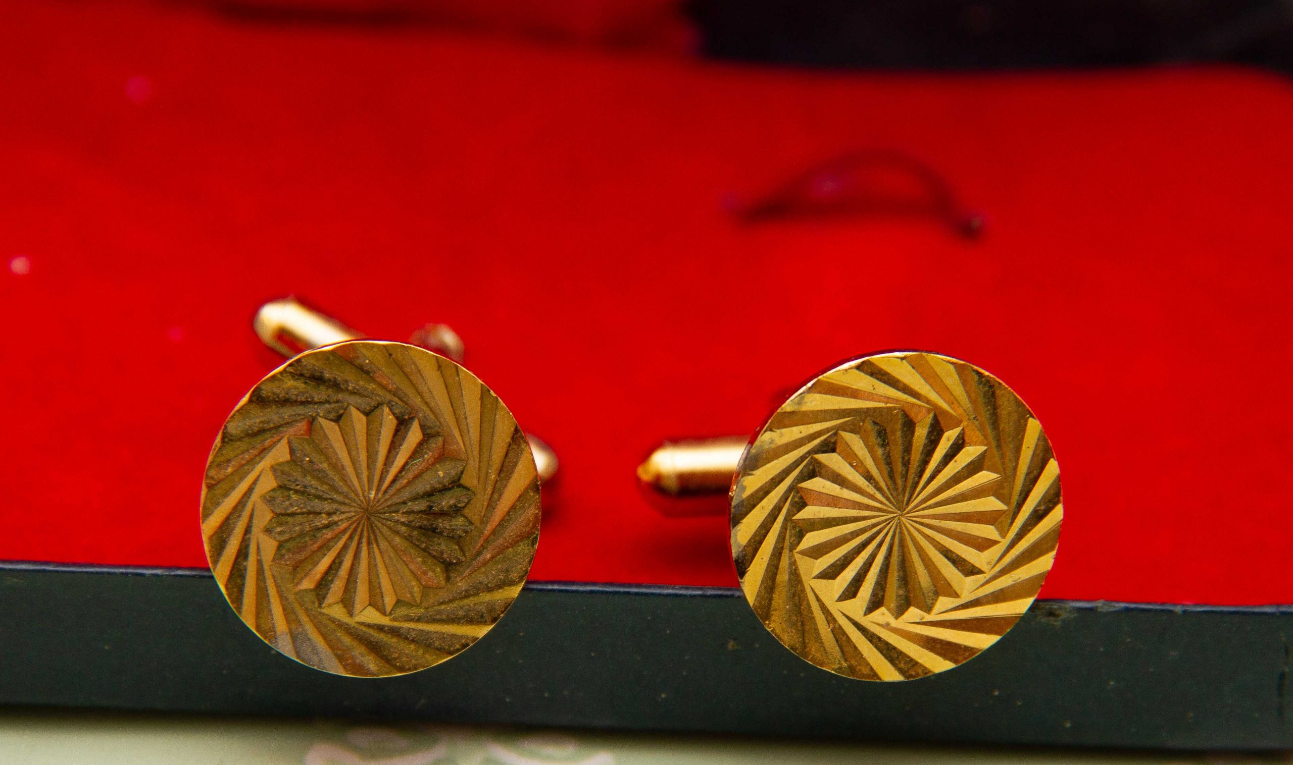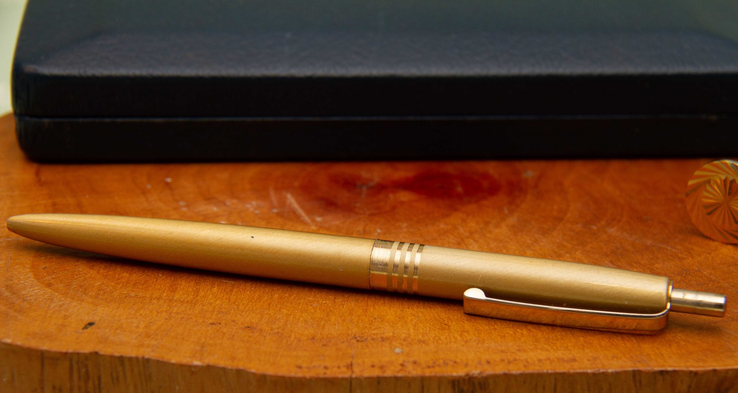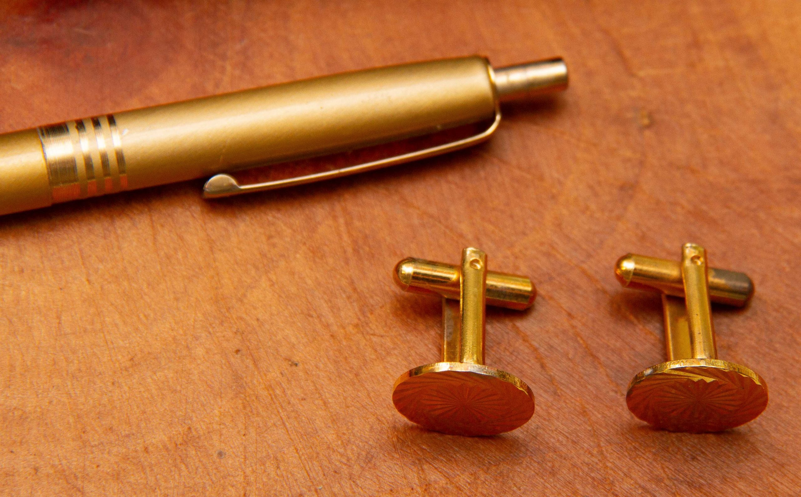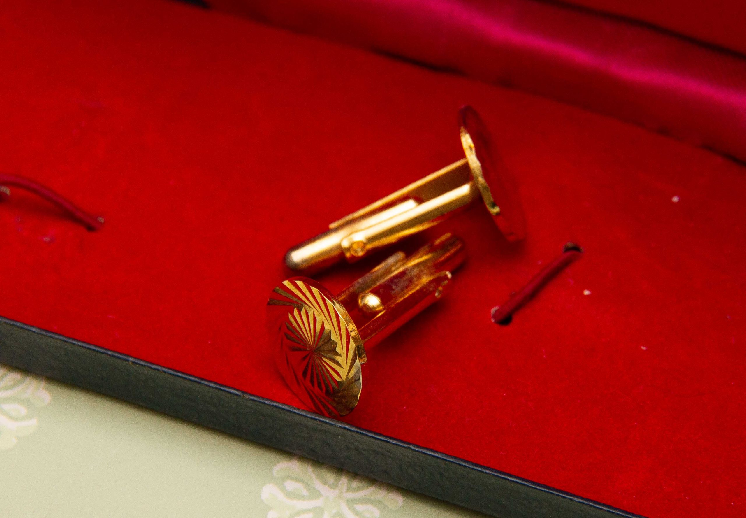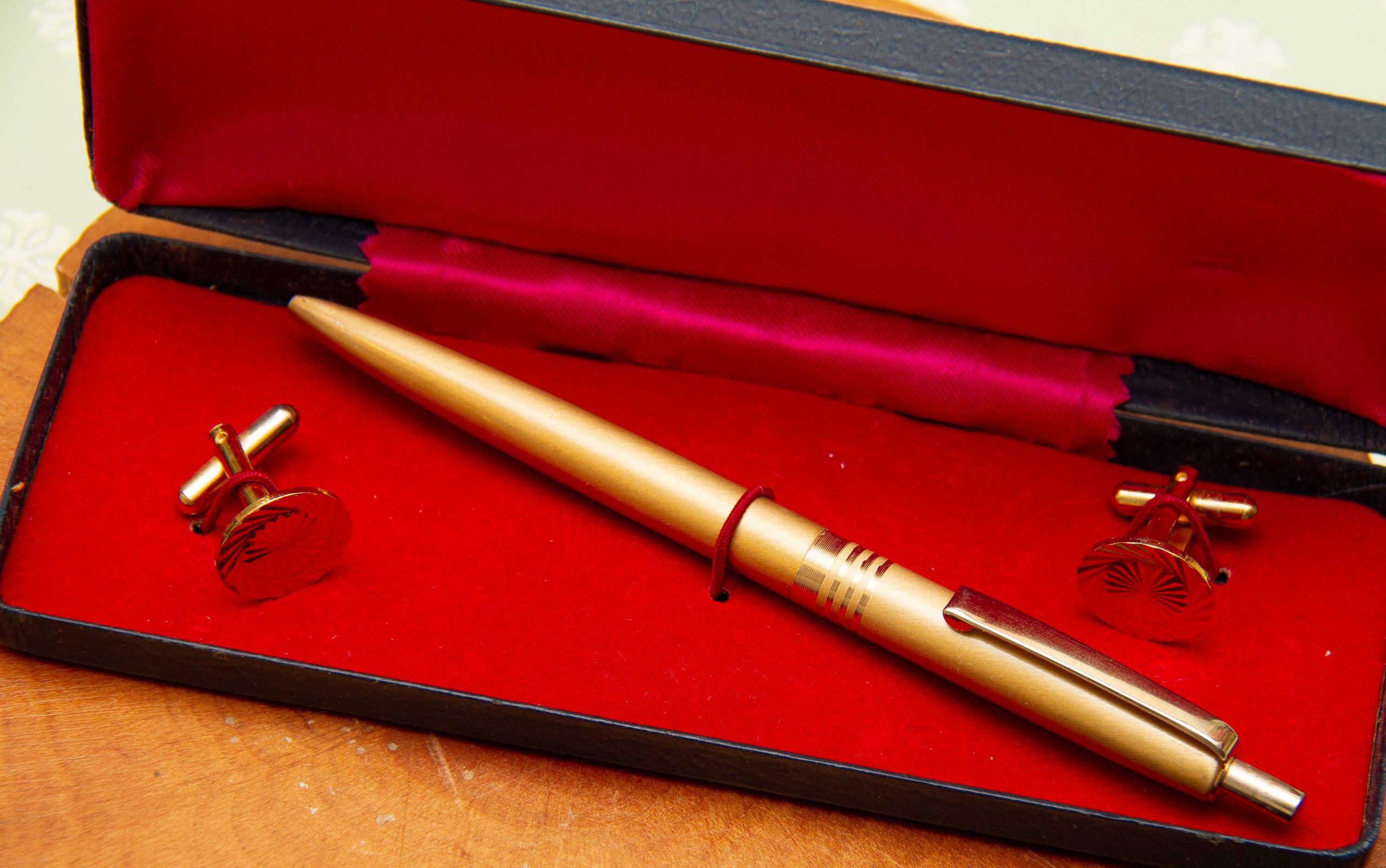 A vintage gift set of a pair of cufflinks and a pen in a gold tone metal. Complete in presentation gift box.