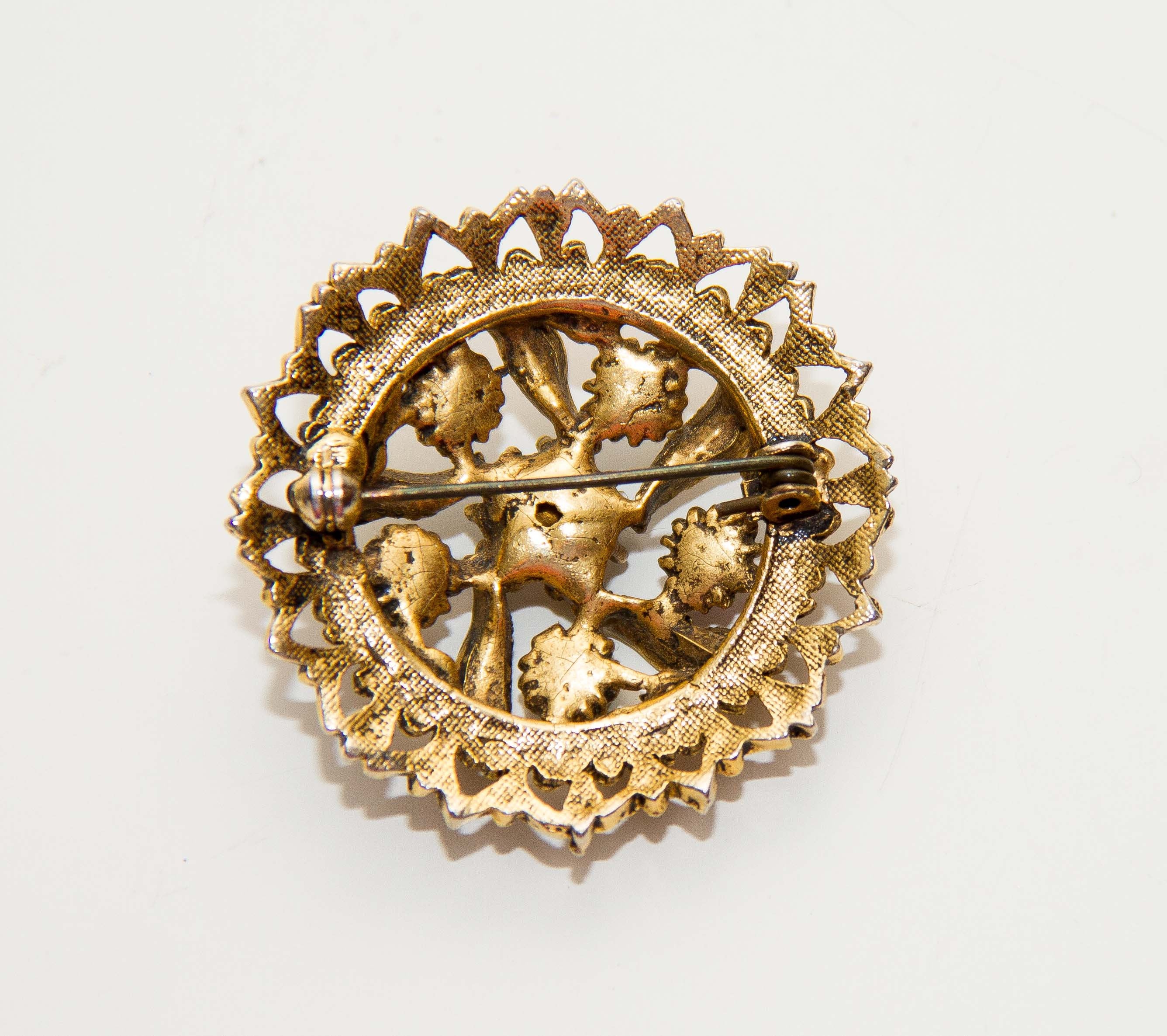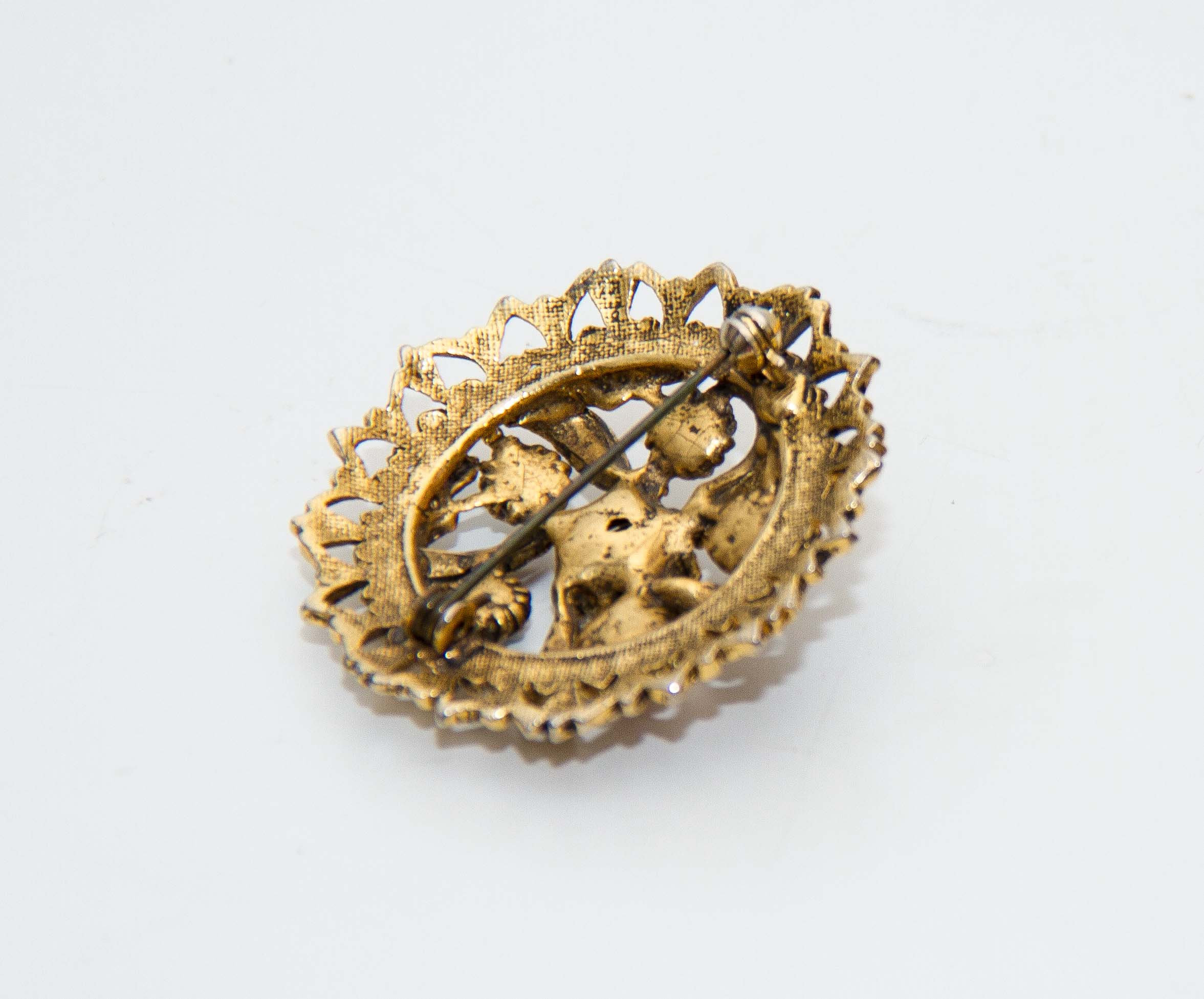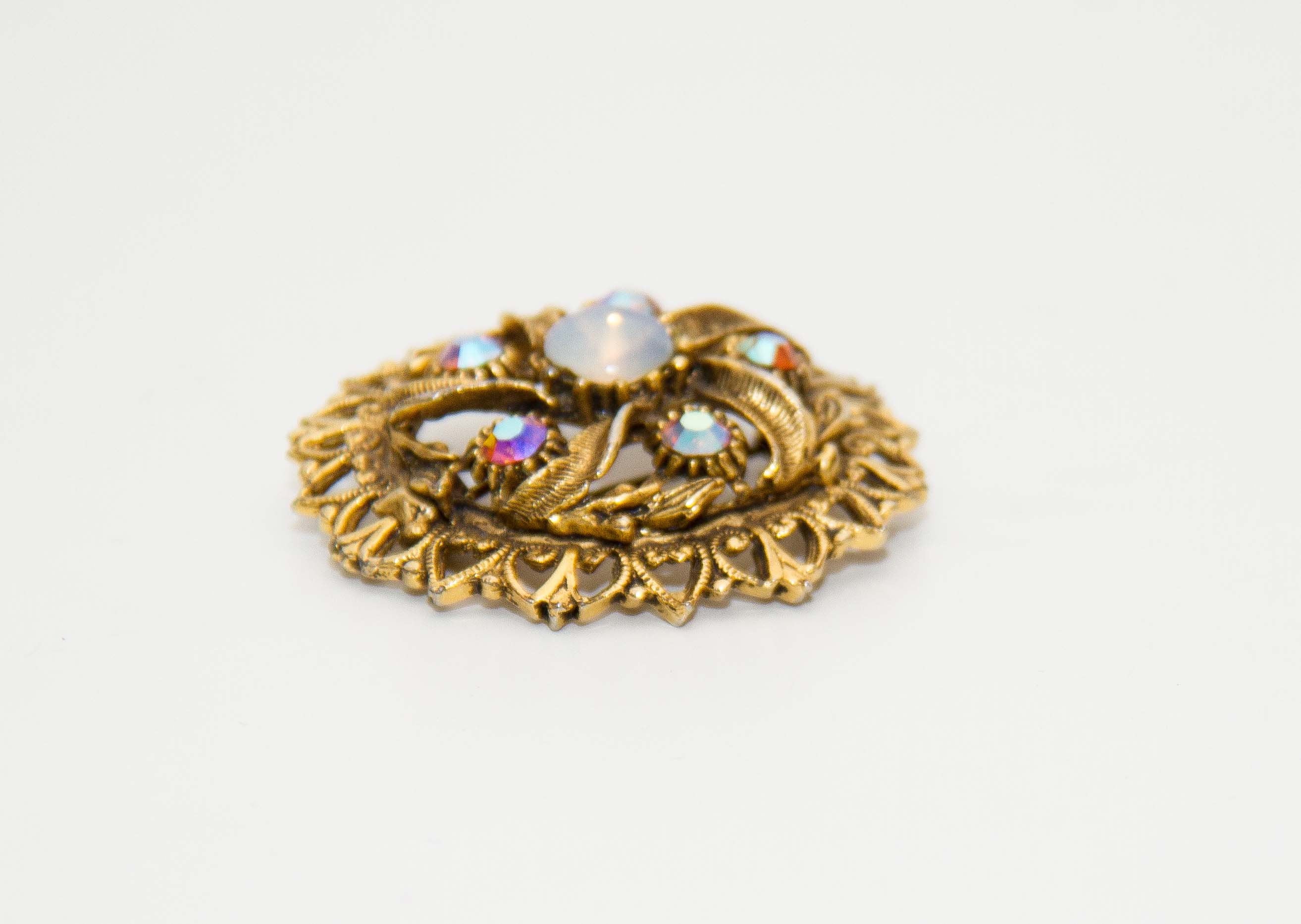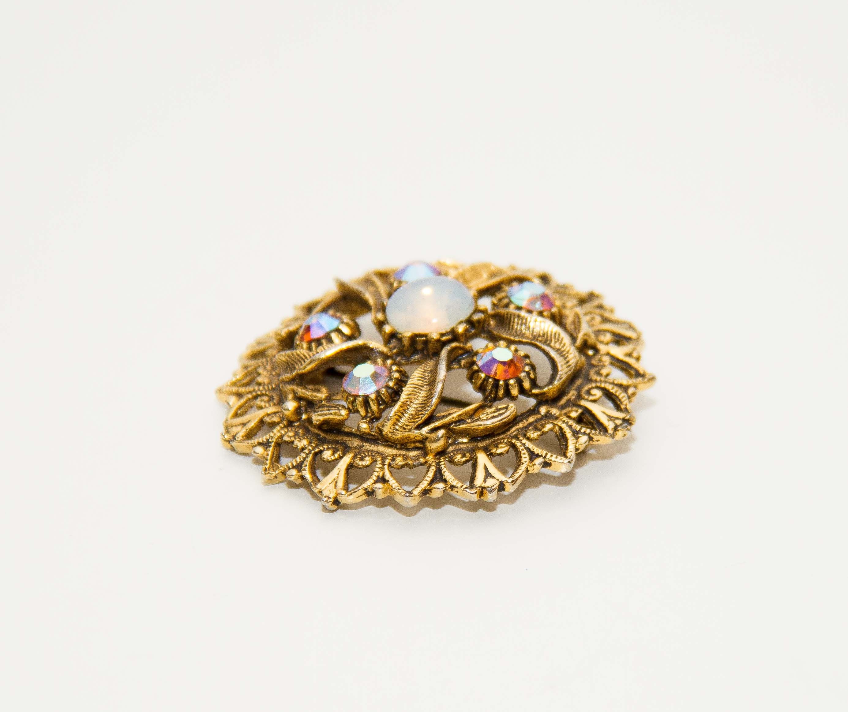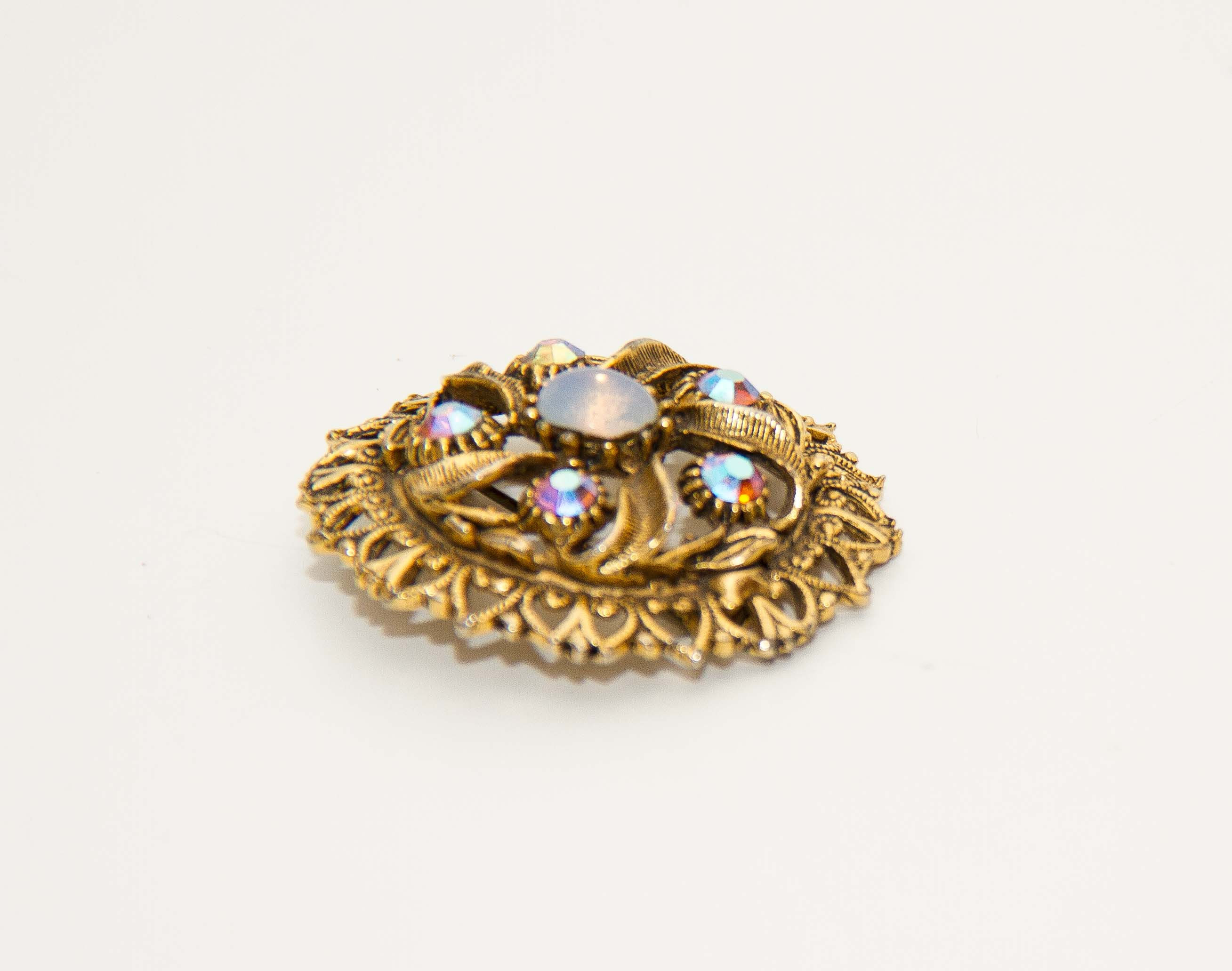 Vintage gold tone costume jewellery brooch with rhinestones and opal. Good condition. Approximately 4cm diameter.