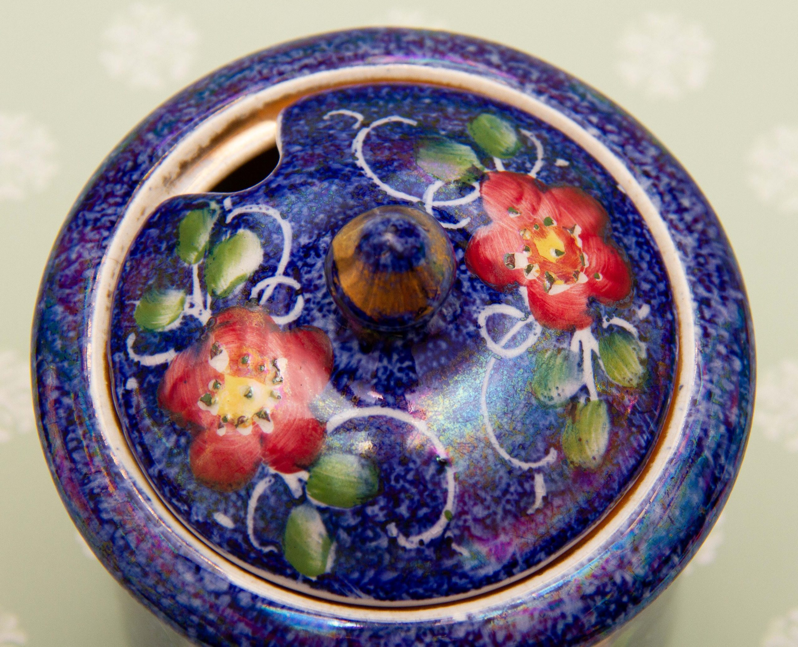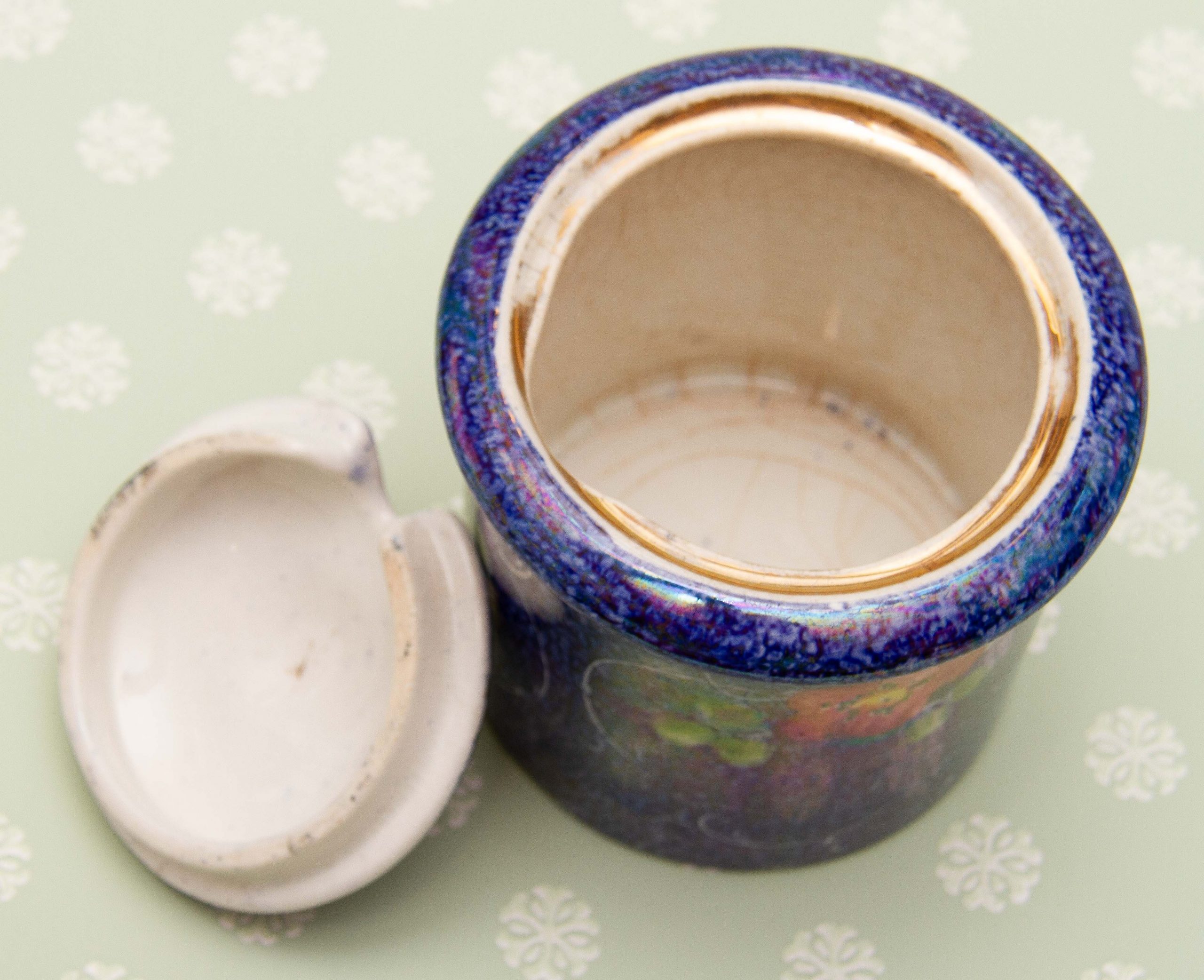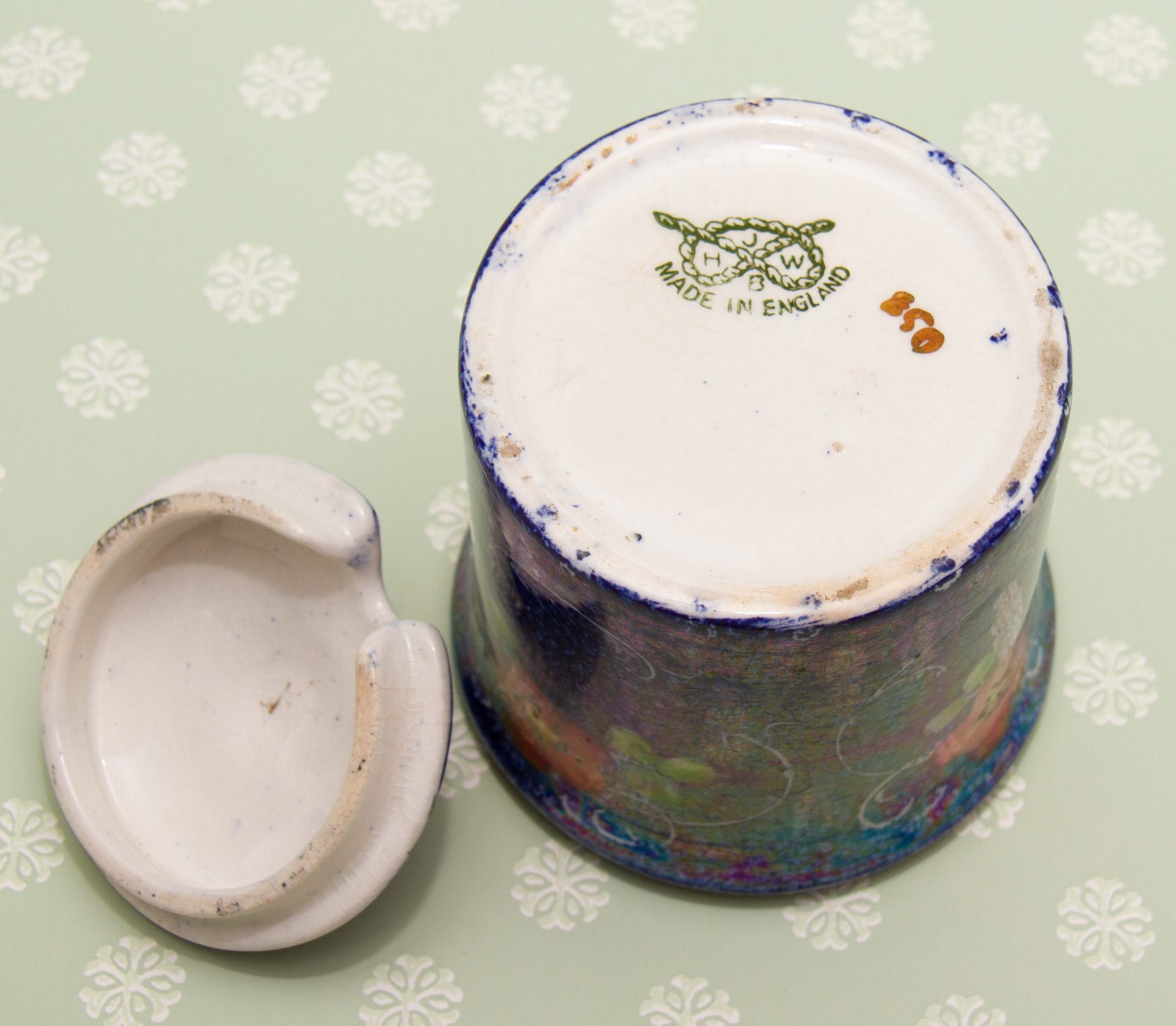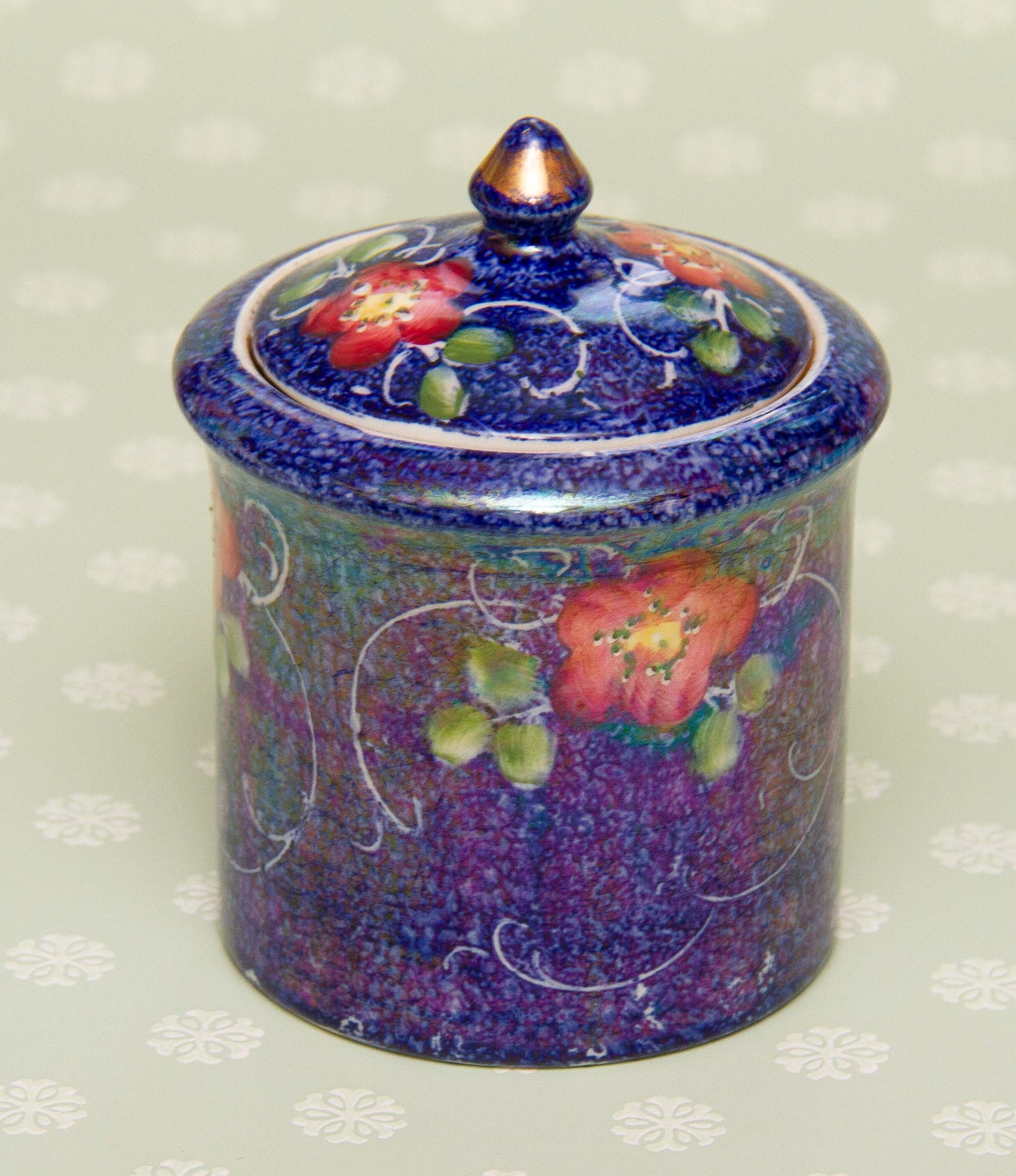 An Antique blue lustre glaze lidded pot with a floral pattern on. By H J Wood of Alexandra Pottery, Burslem Staffordshire, England. Stamped with a Staffordshire knot mark on the base with letters H J W B. This mark was used from 1884 into the early 1920’s.