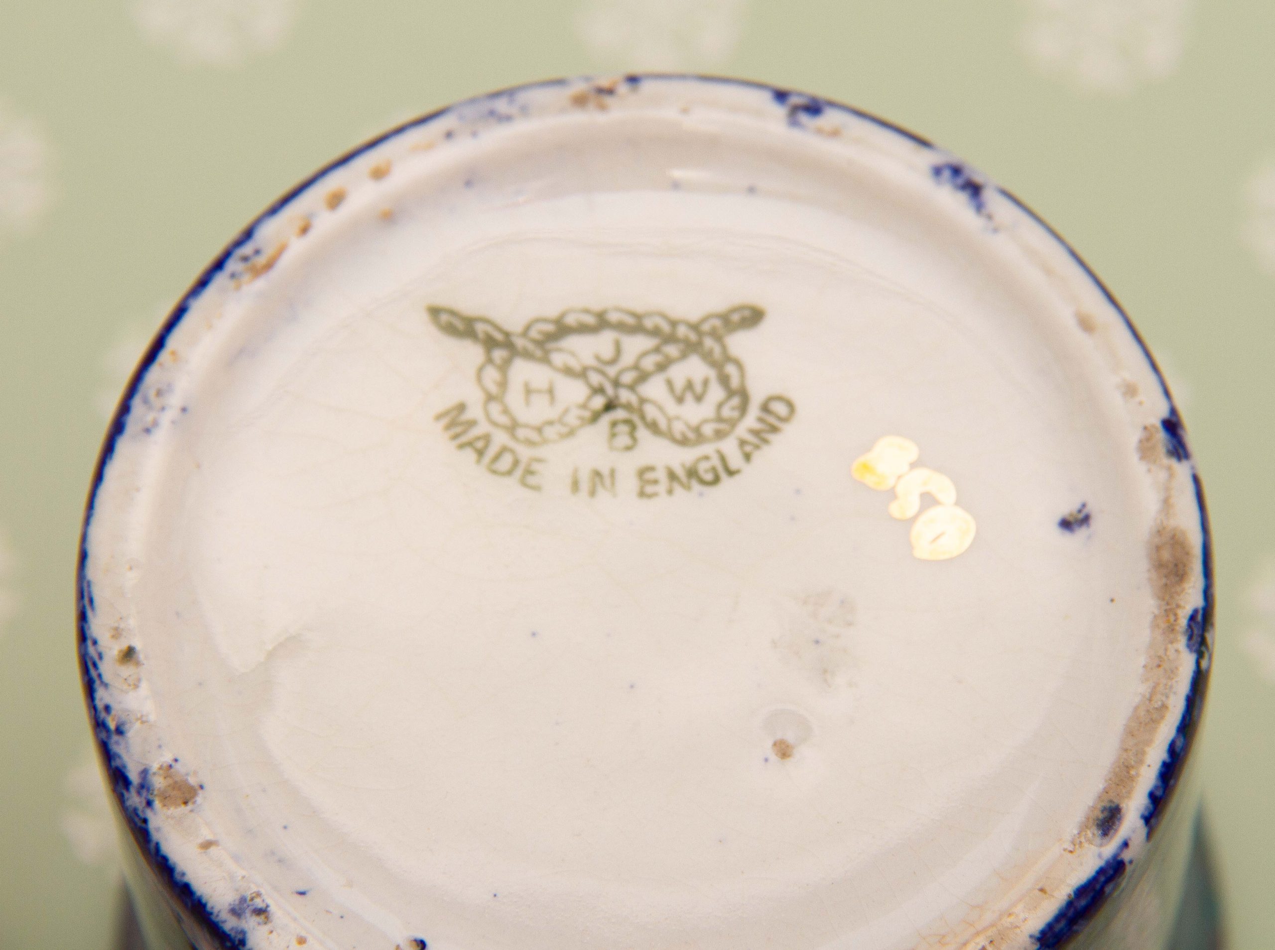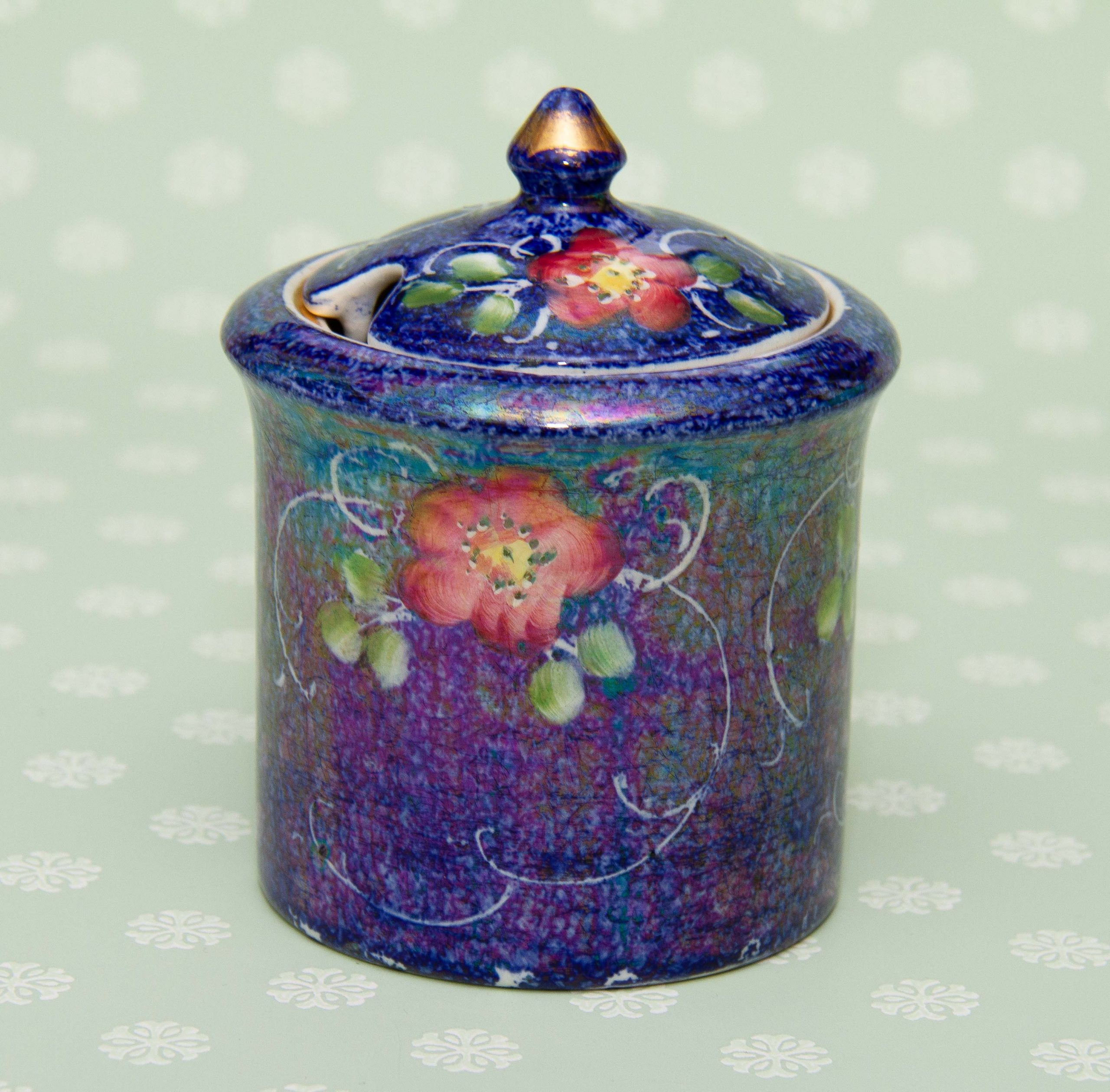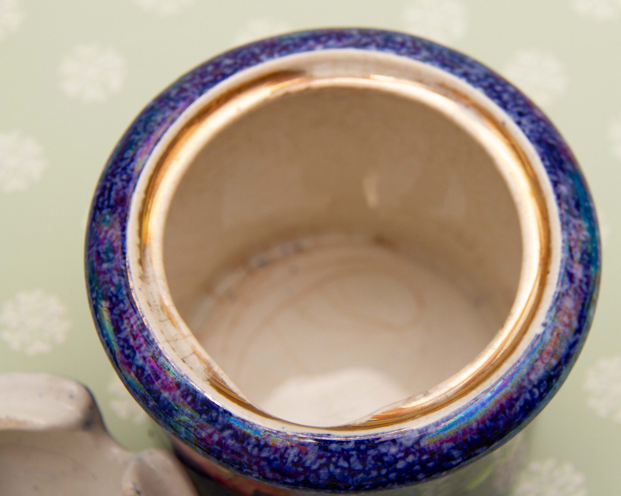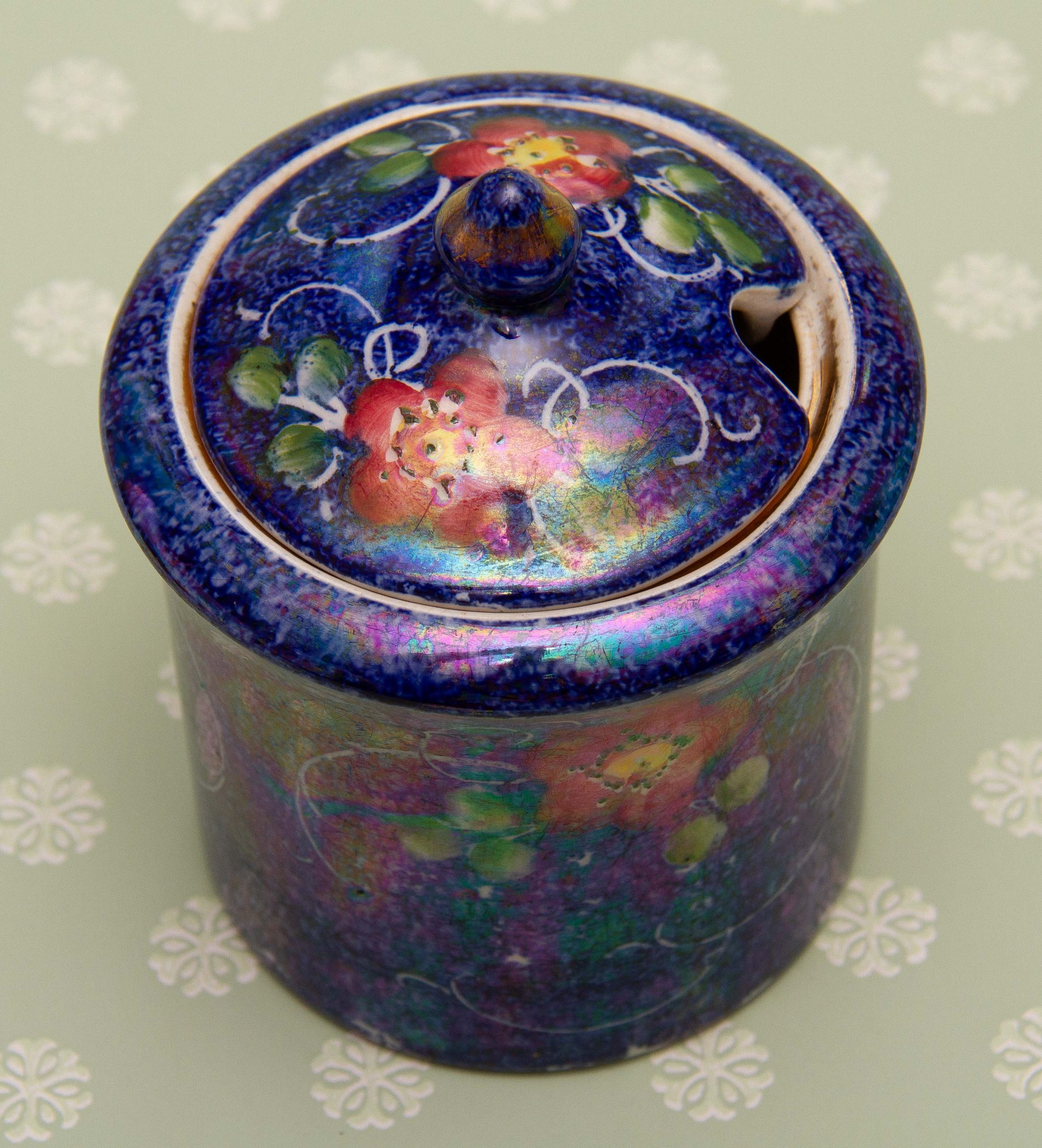 An Antique blue lustre glaze lidded pot with a floral pattern on. By H J Wood of Alexandra Pottery, Burslem Staffordshire, England. Stamped with a Staffordshire knot mark on the base with letters H J W B. This mark was used from 1884 into the early 1920’s.