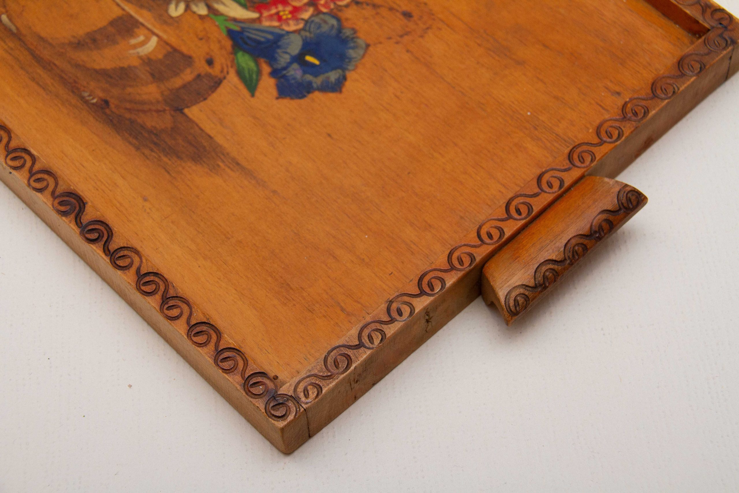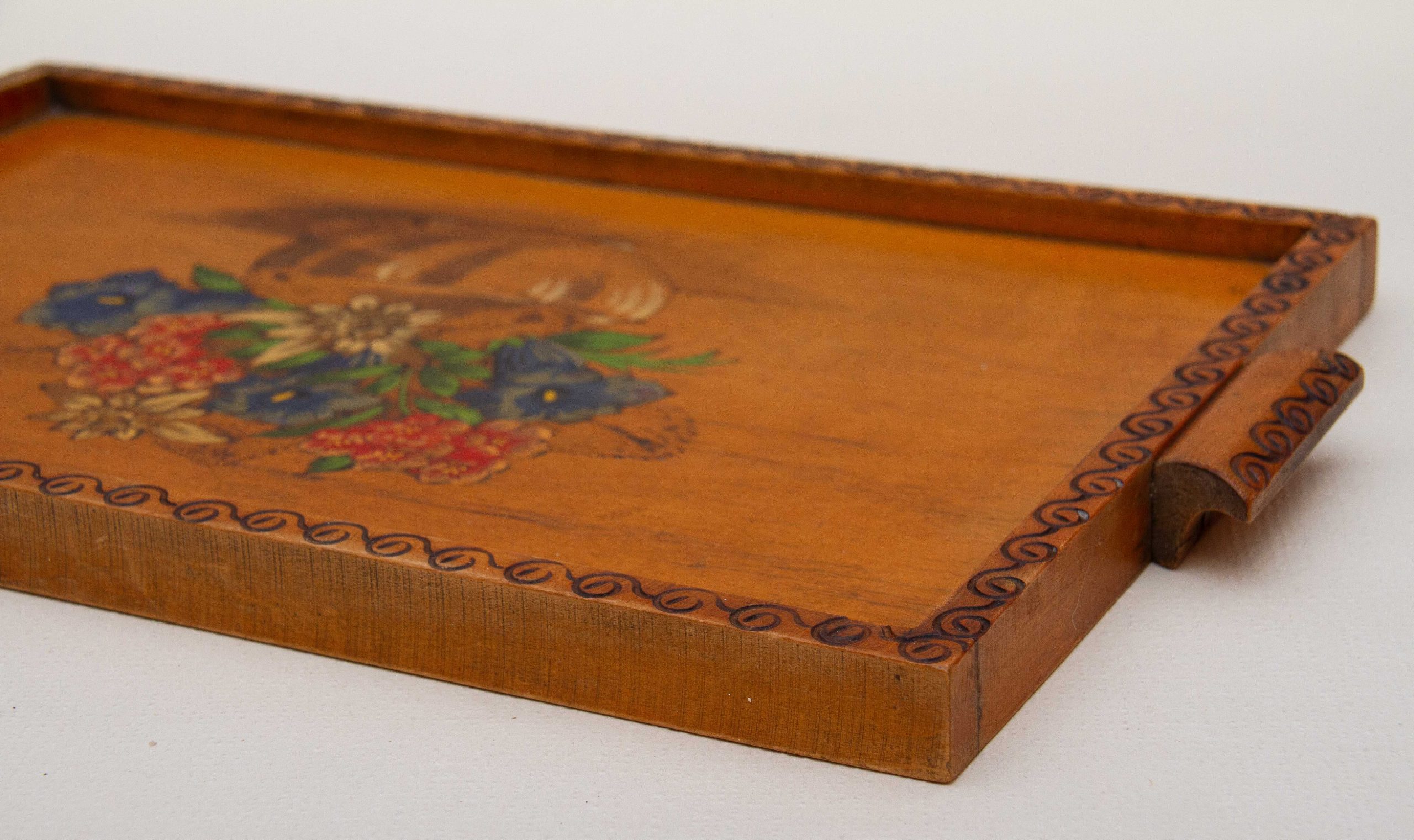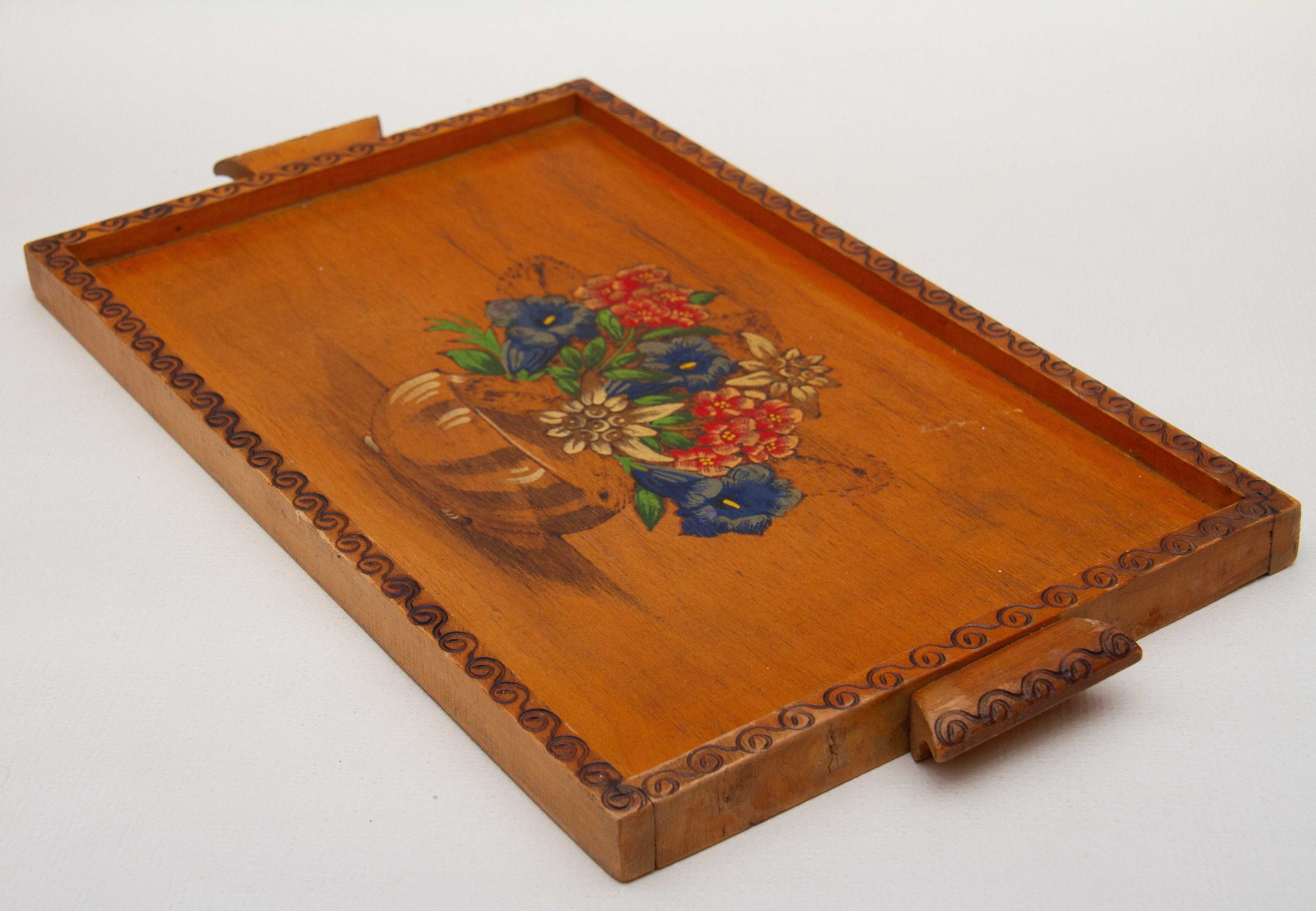 A vintage Austrian hand made wooden tray, with pyrography pattern edges and a pyrography and hand painted floral design on. Signed and marked Tirol on the back.