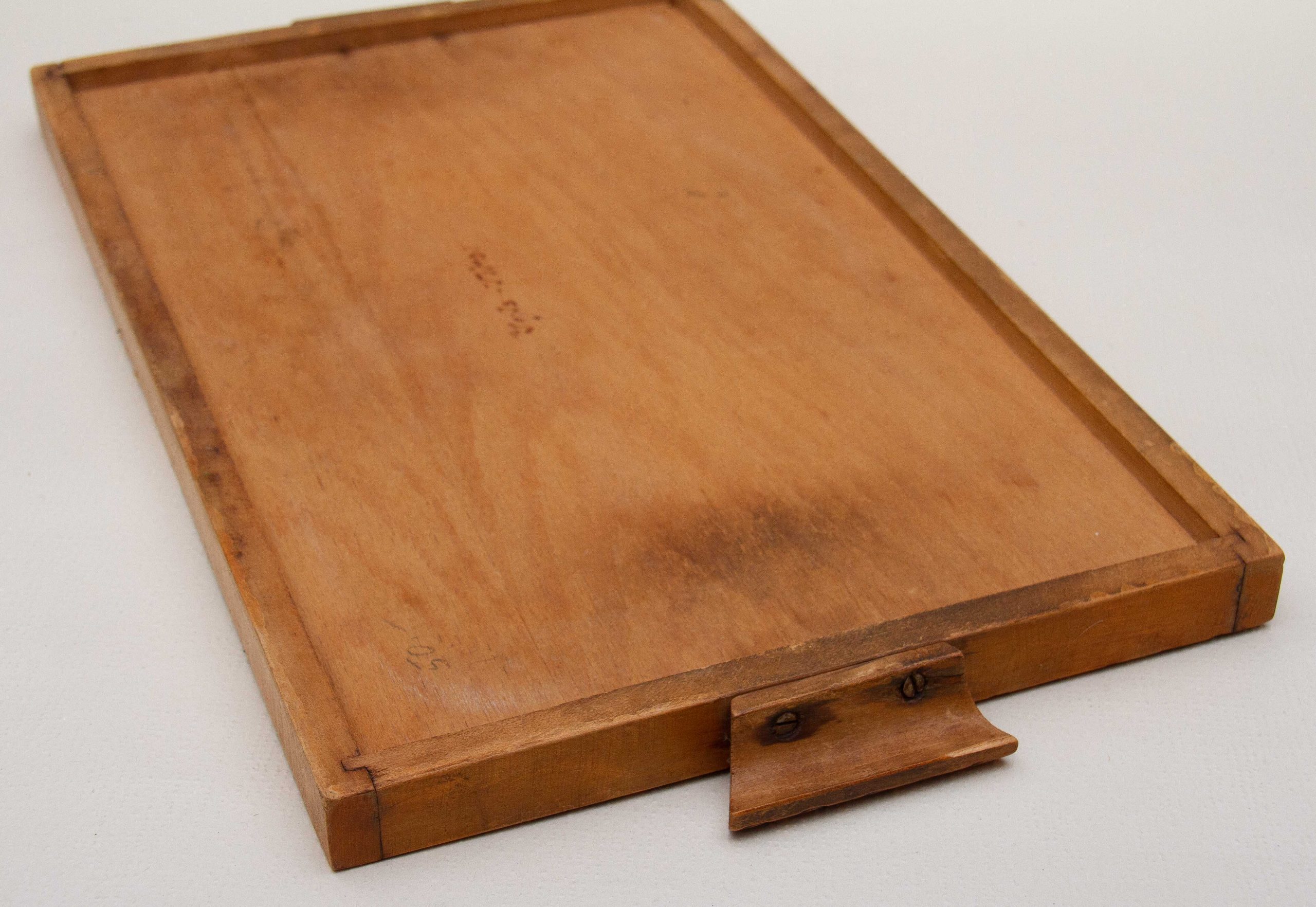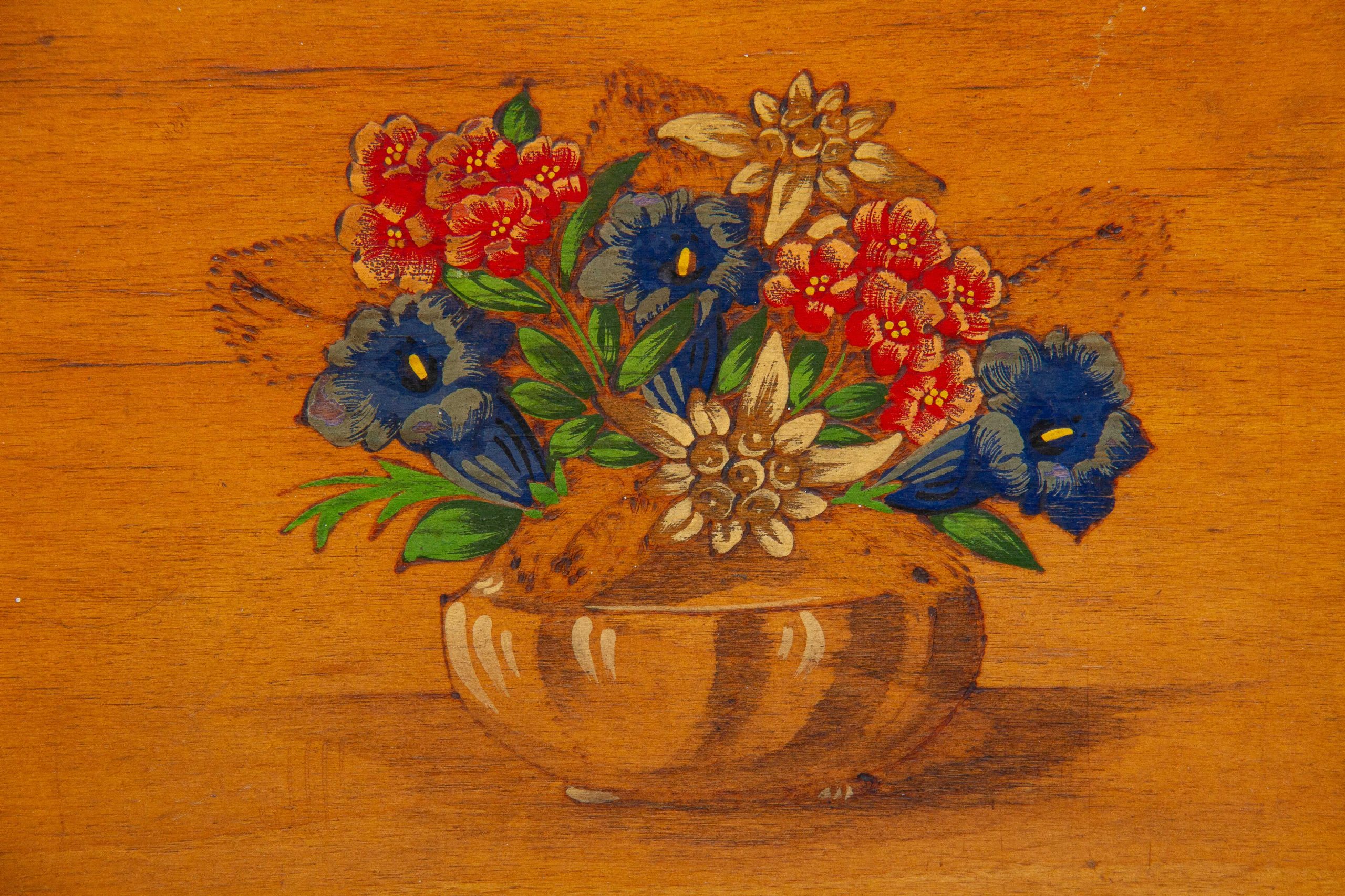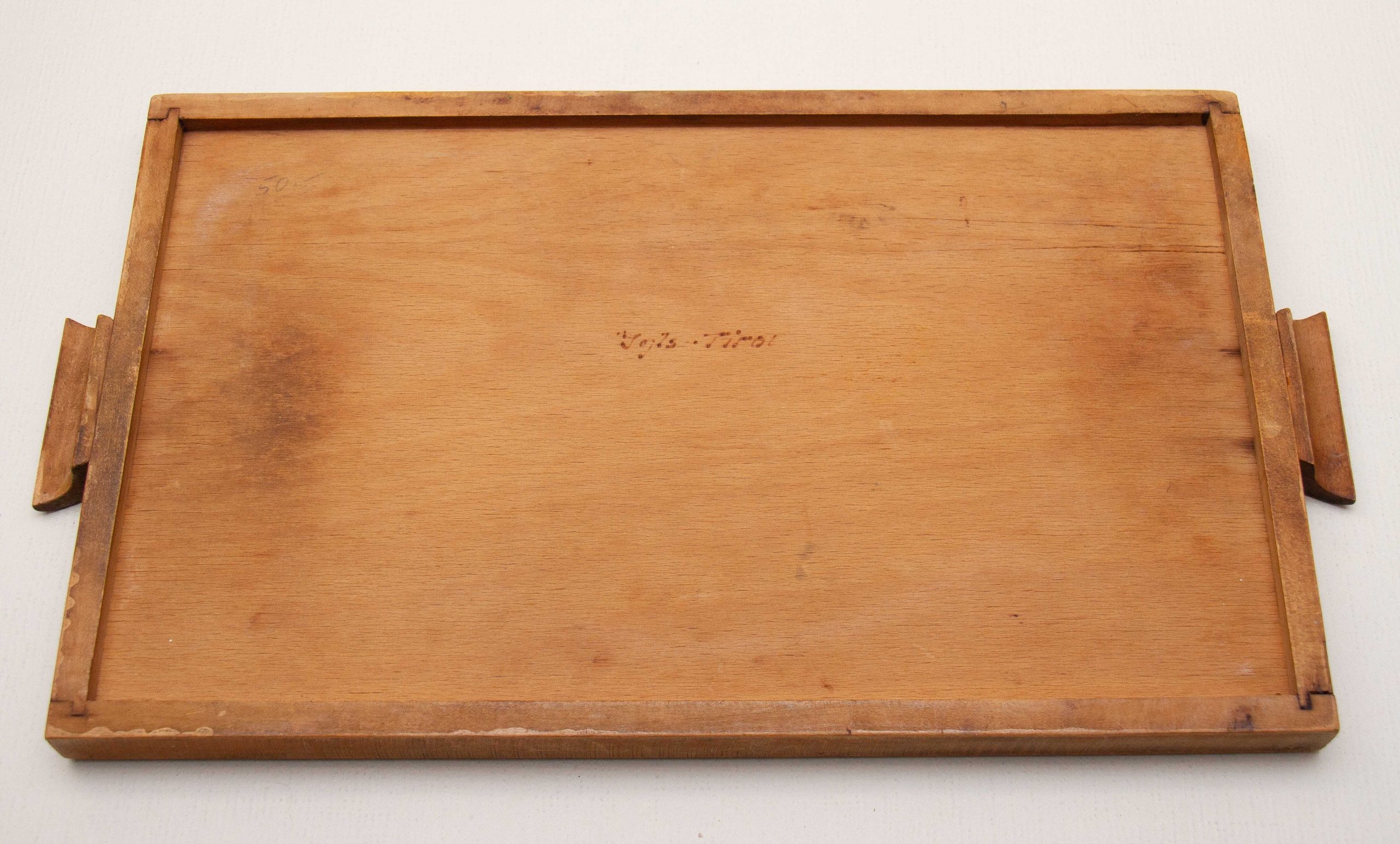 A vintage Austrian hand made wooden tray, with pyrography pattern edges and a pyrography and hand painted floral design on. Signed and marked Tirol on the back.