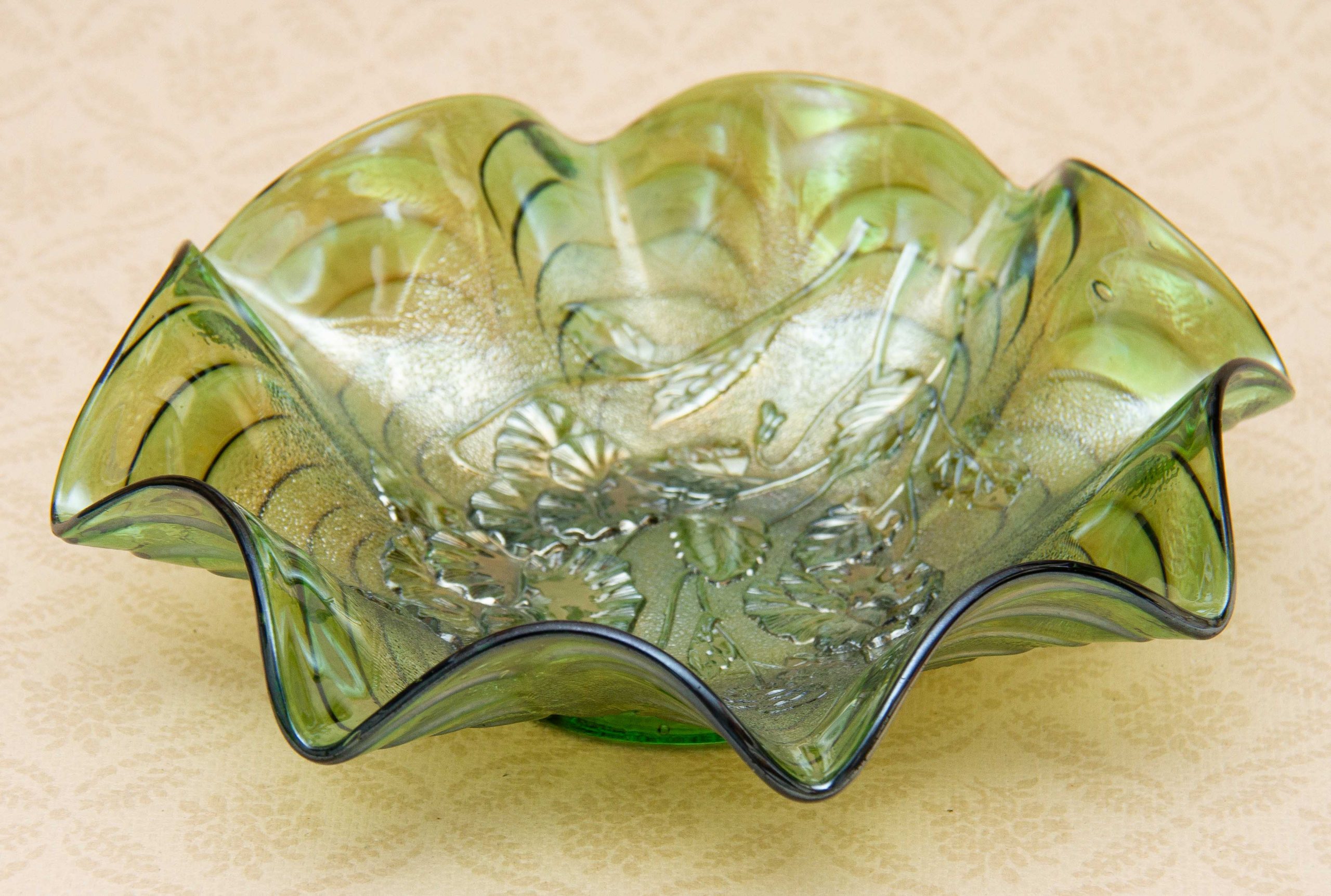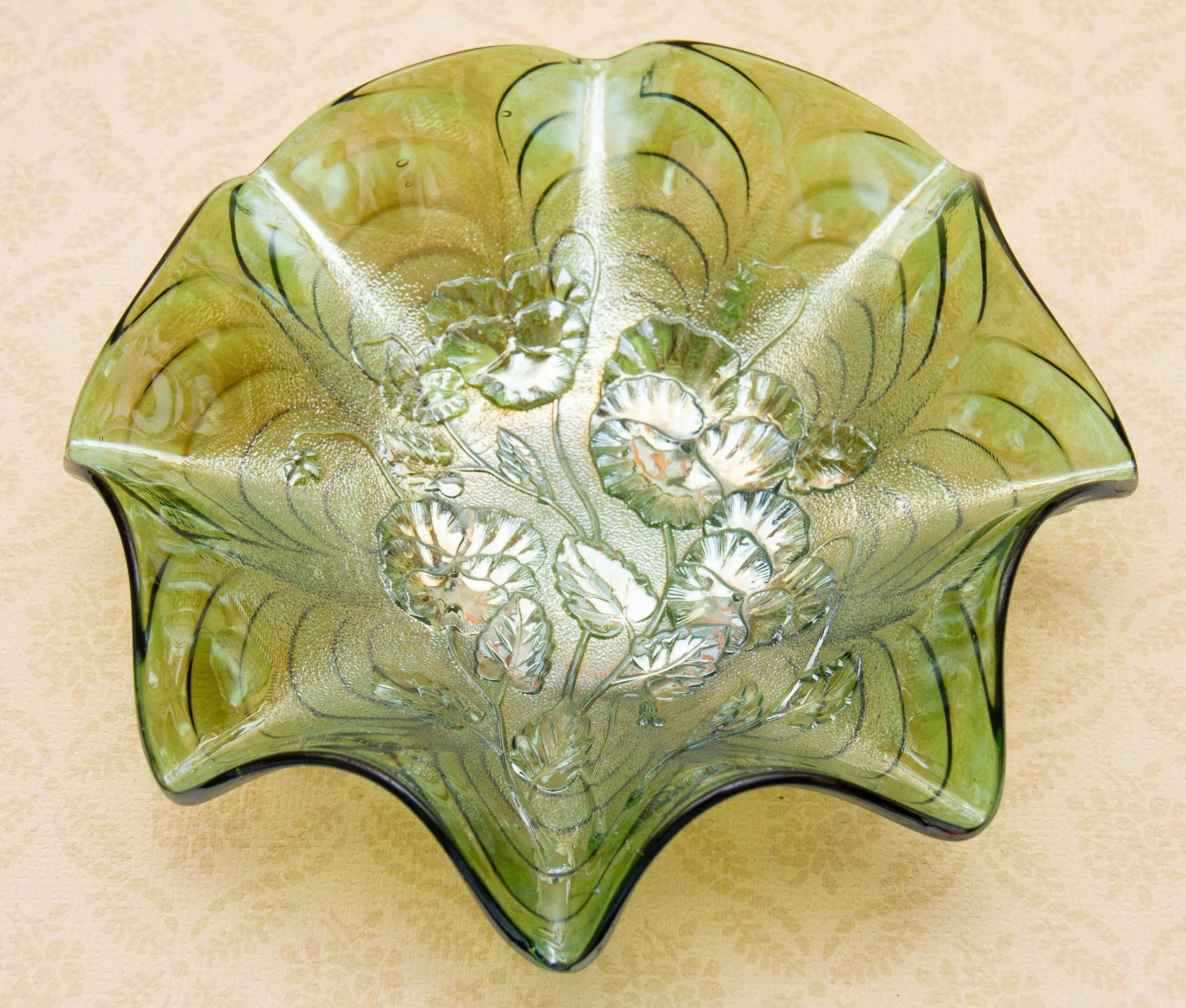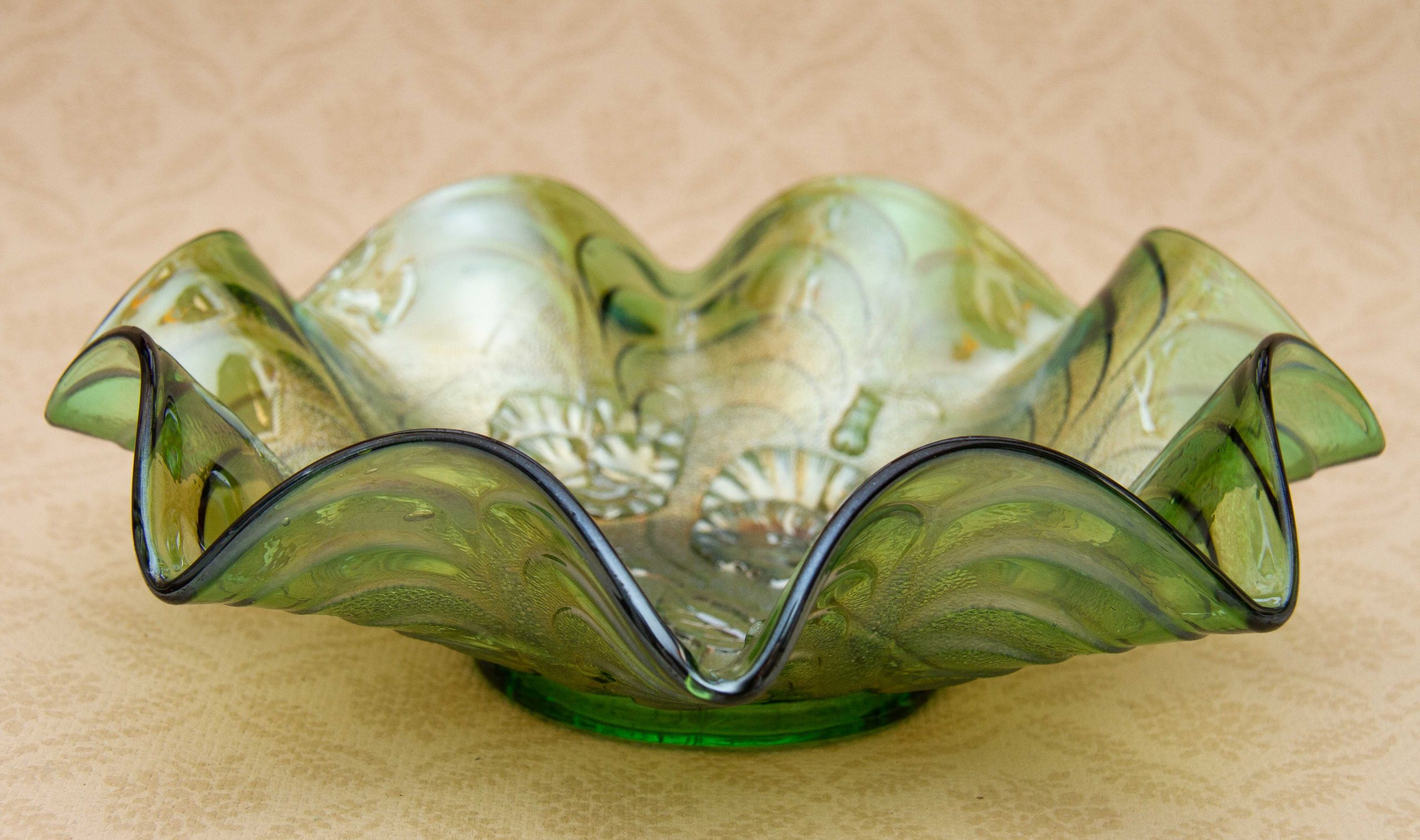 A 1930’s Imperial green iridescent lustre Carnival glass bowl decorated with a pansy pattern on the inside and arc pattern on the outside, with deep ruffled edges.