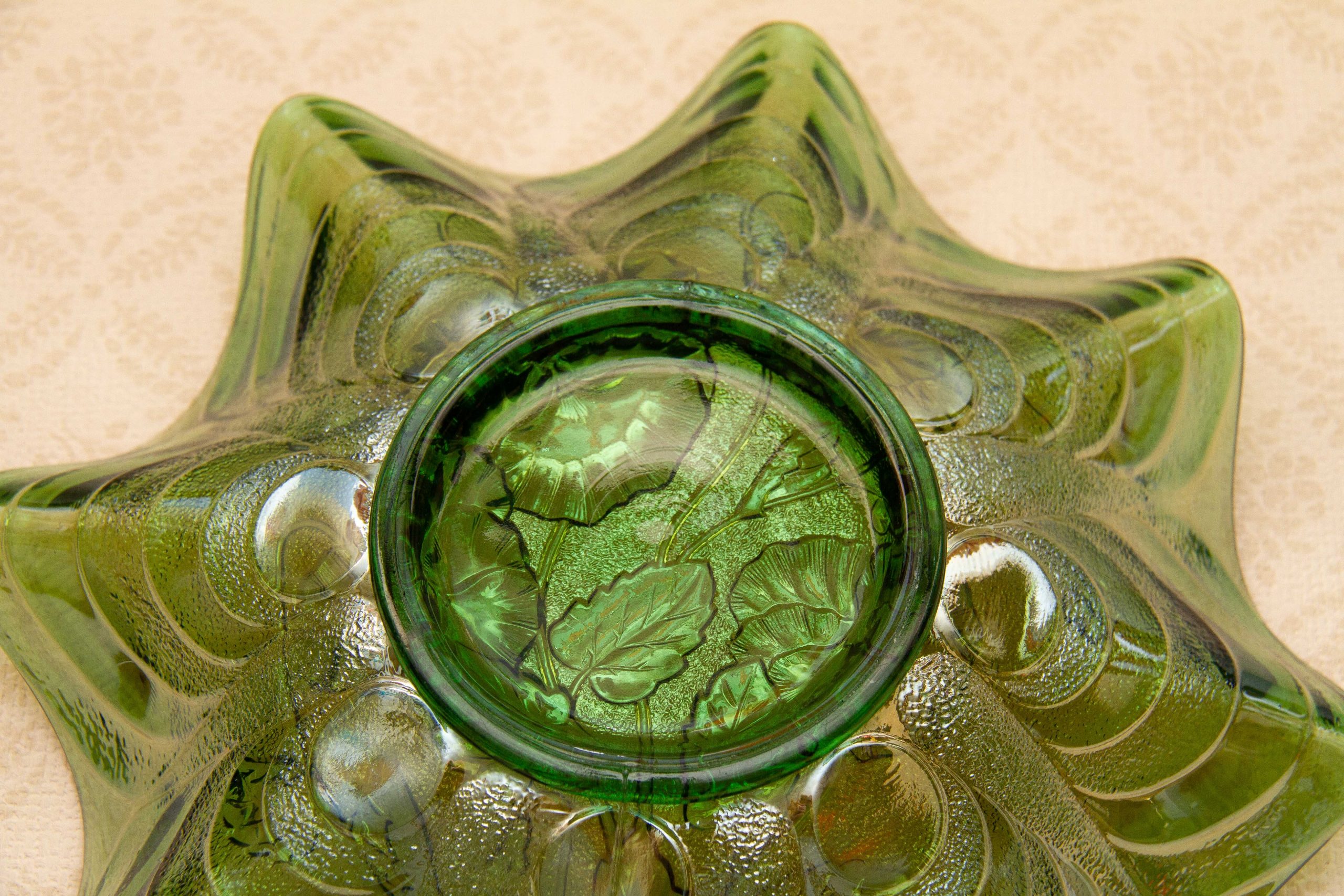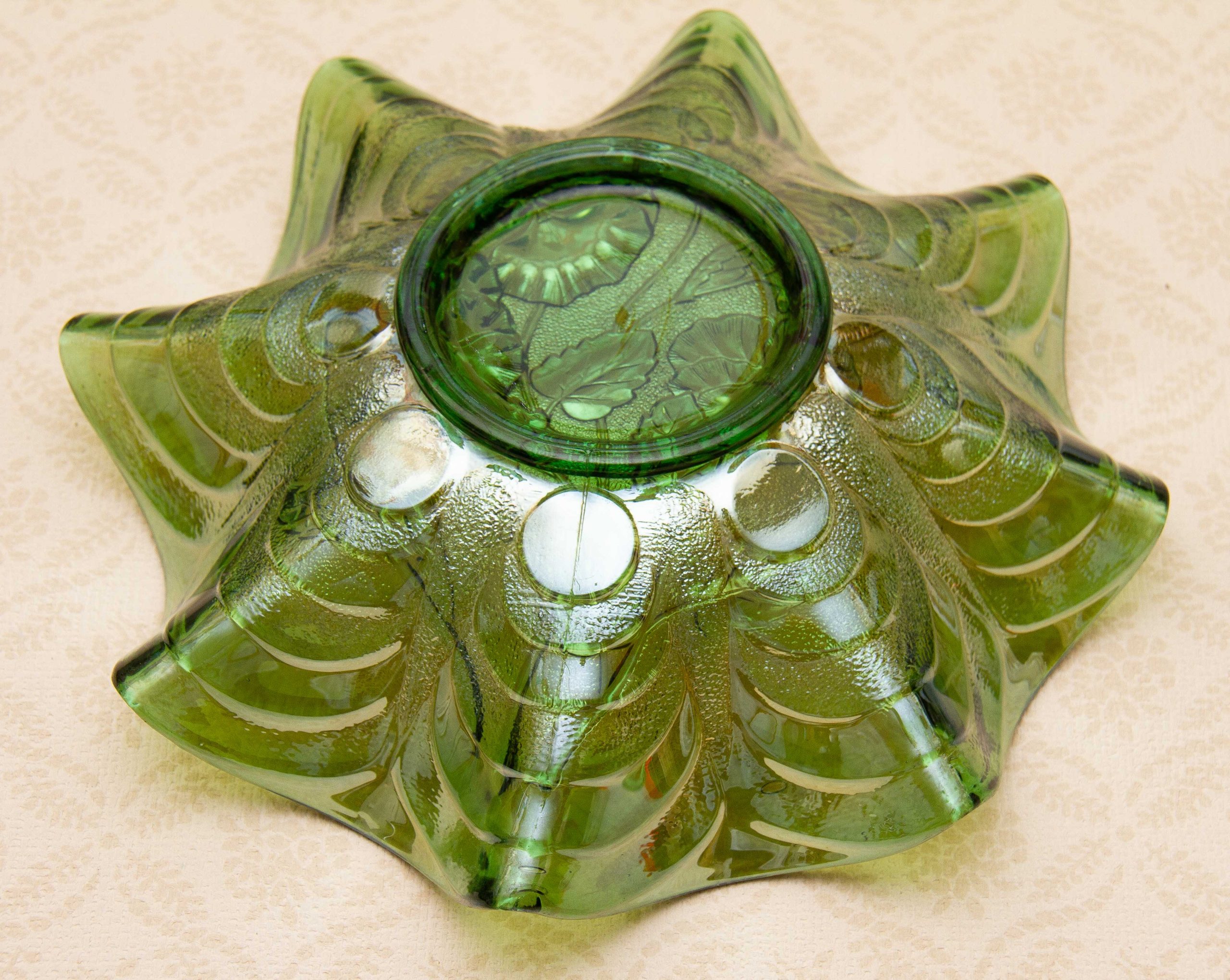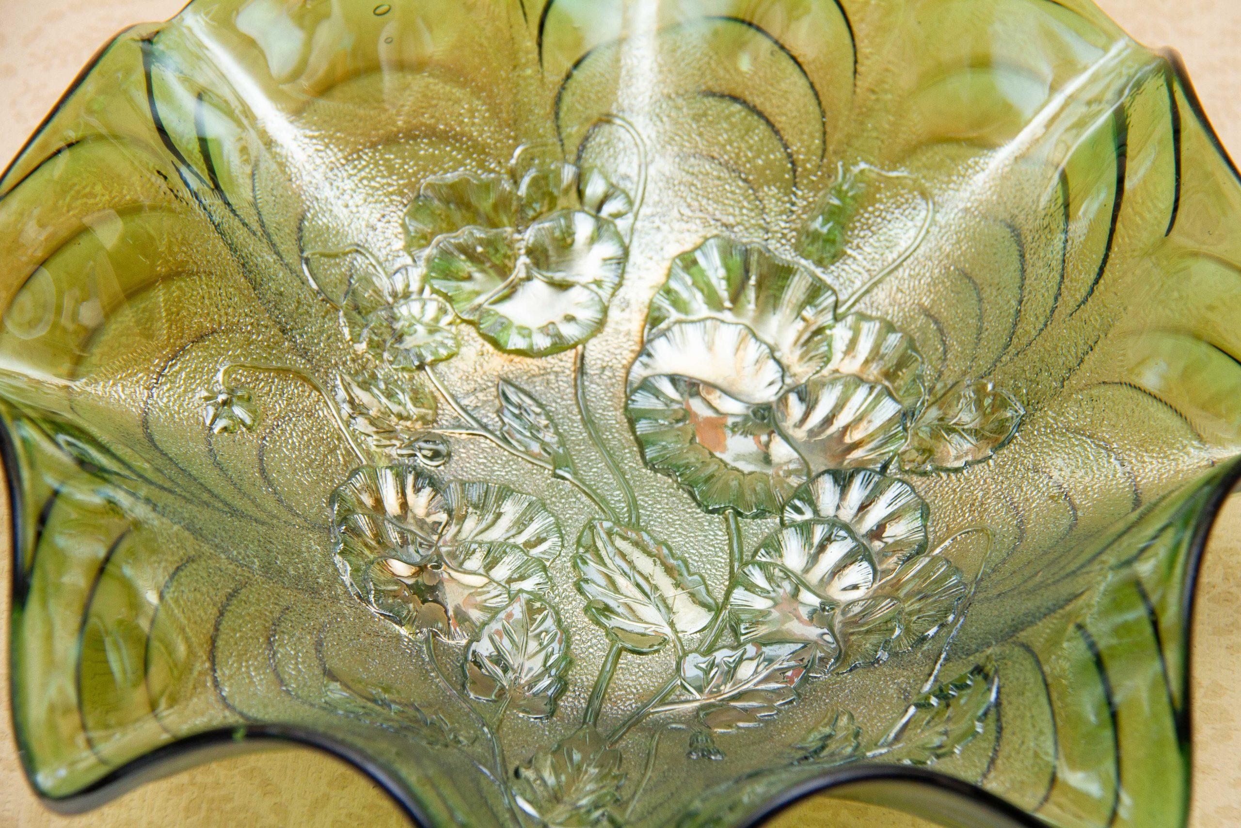 A 1930’s Imperial green iridescent lustre Carnival glass bowl decorated with a pansy pattern on the inside and arc pattern on the outside, with deep ruffled edges.