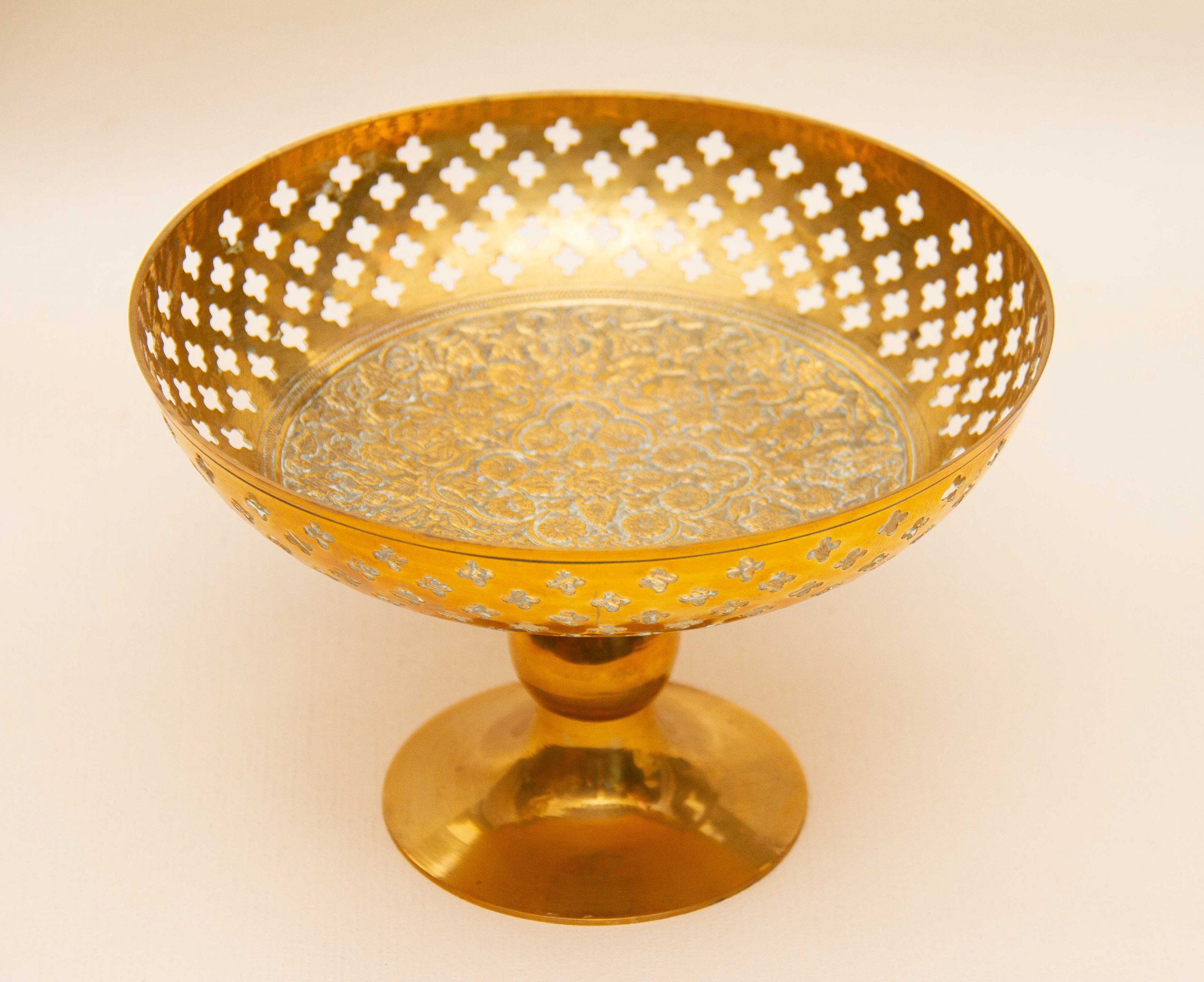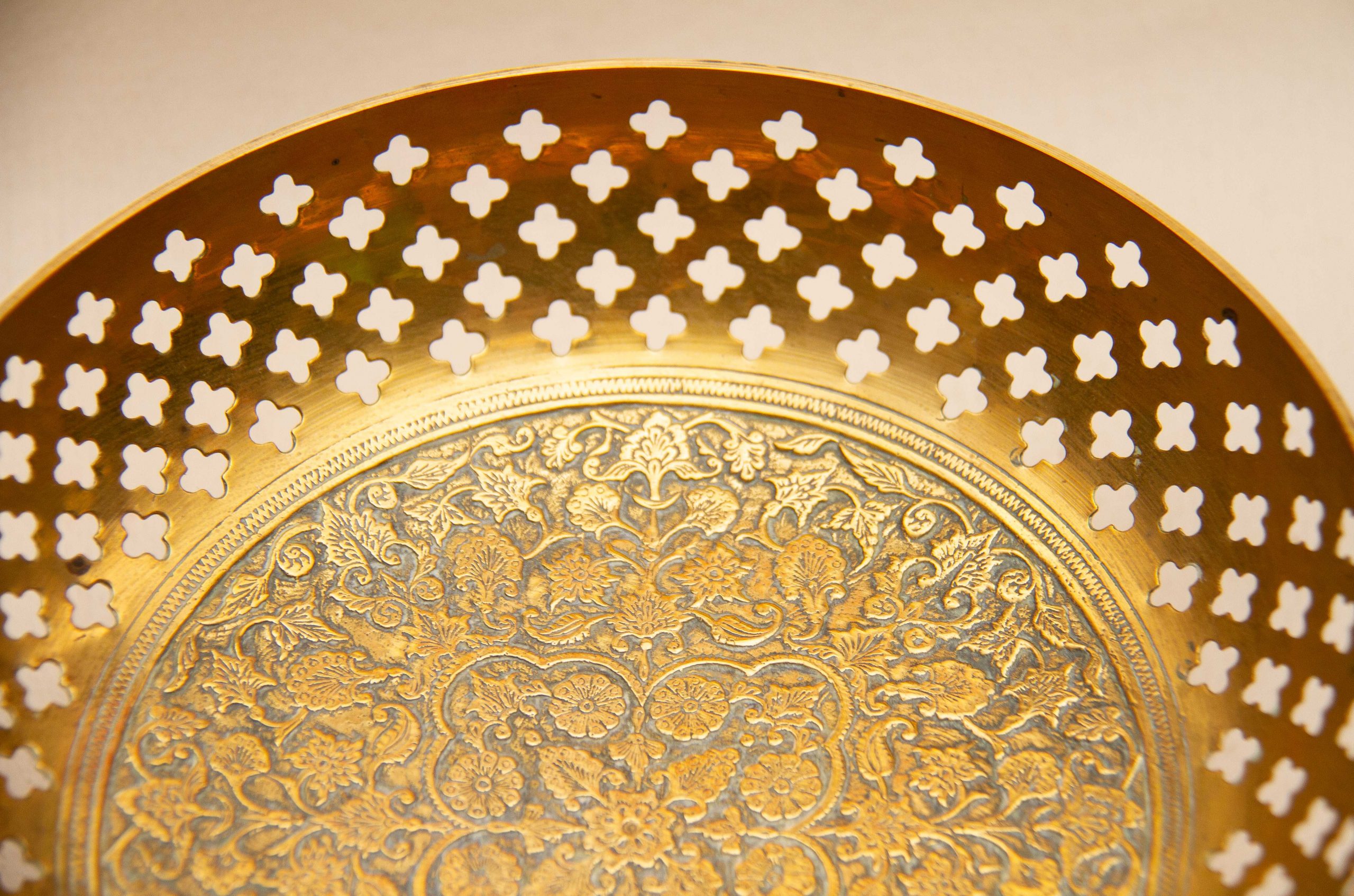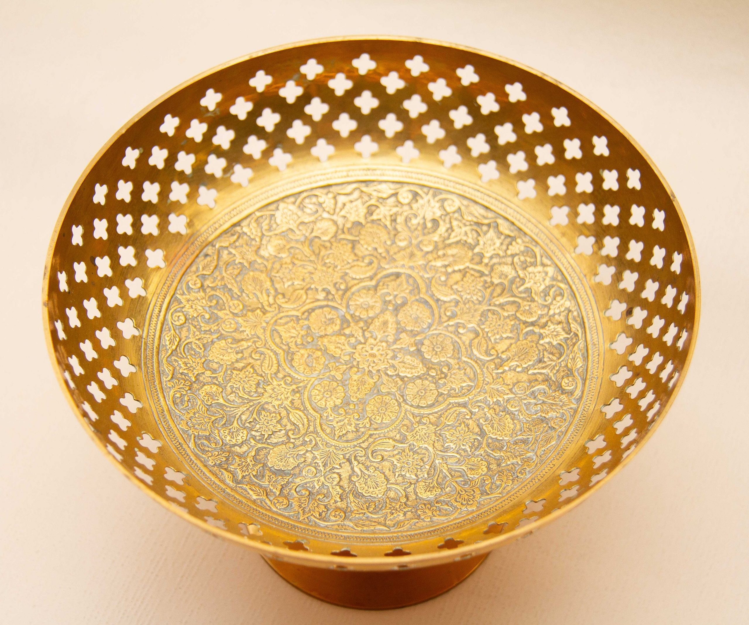 An Indian brass pedestal bowl with cutwork pattern around the top and embossed floral decoration on the inside.