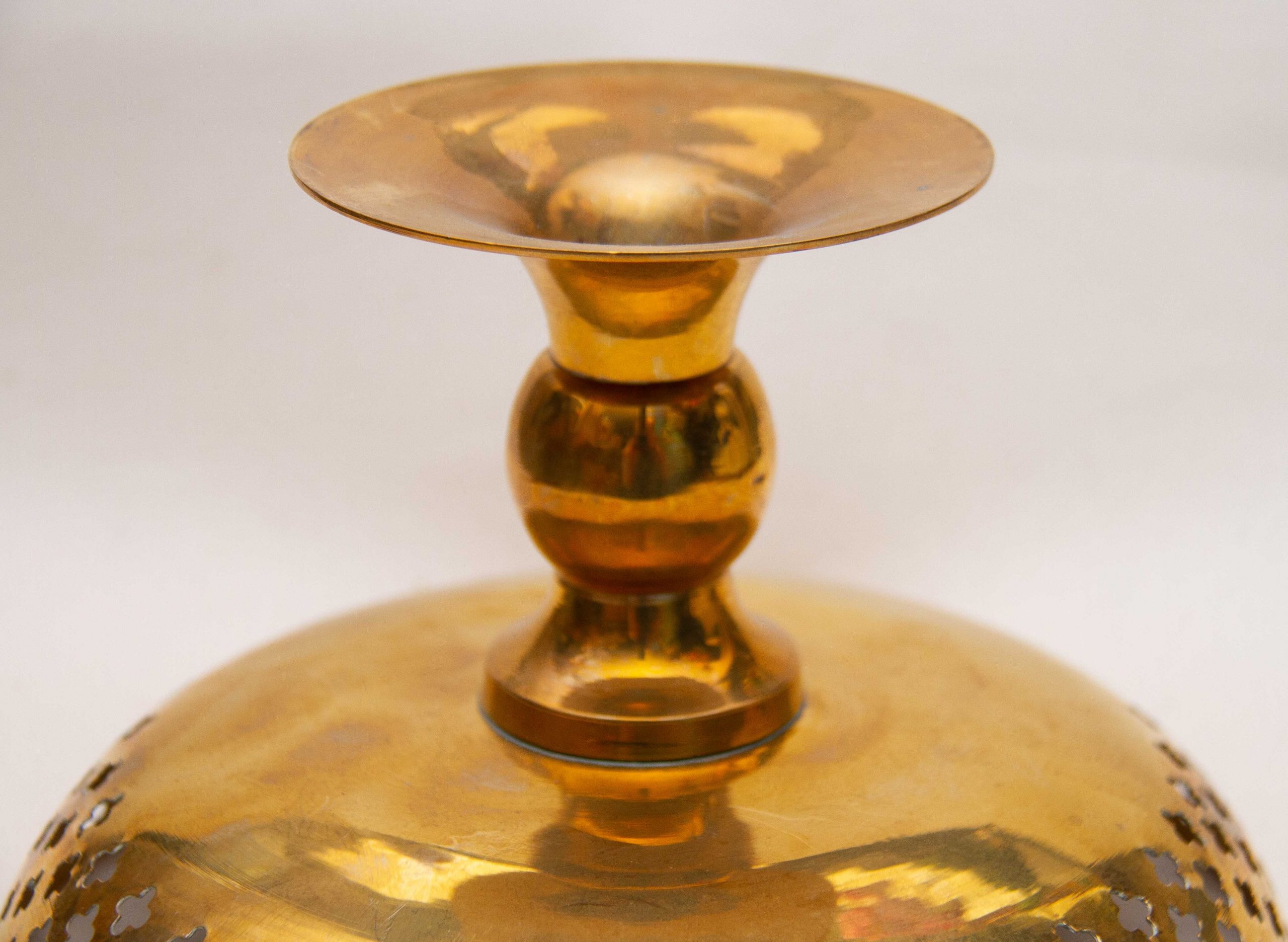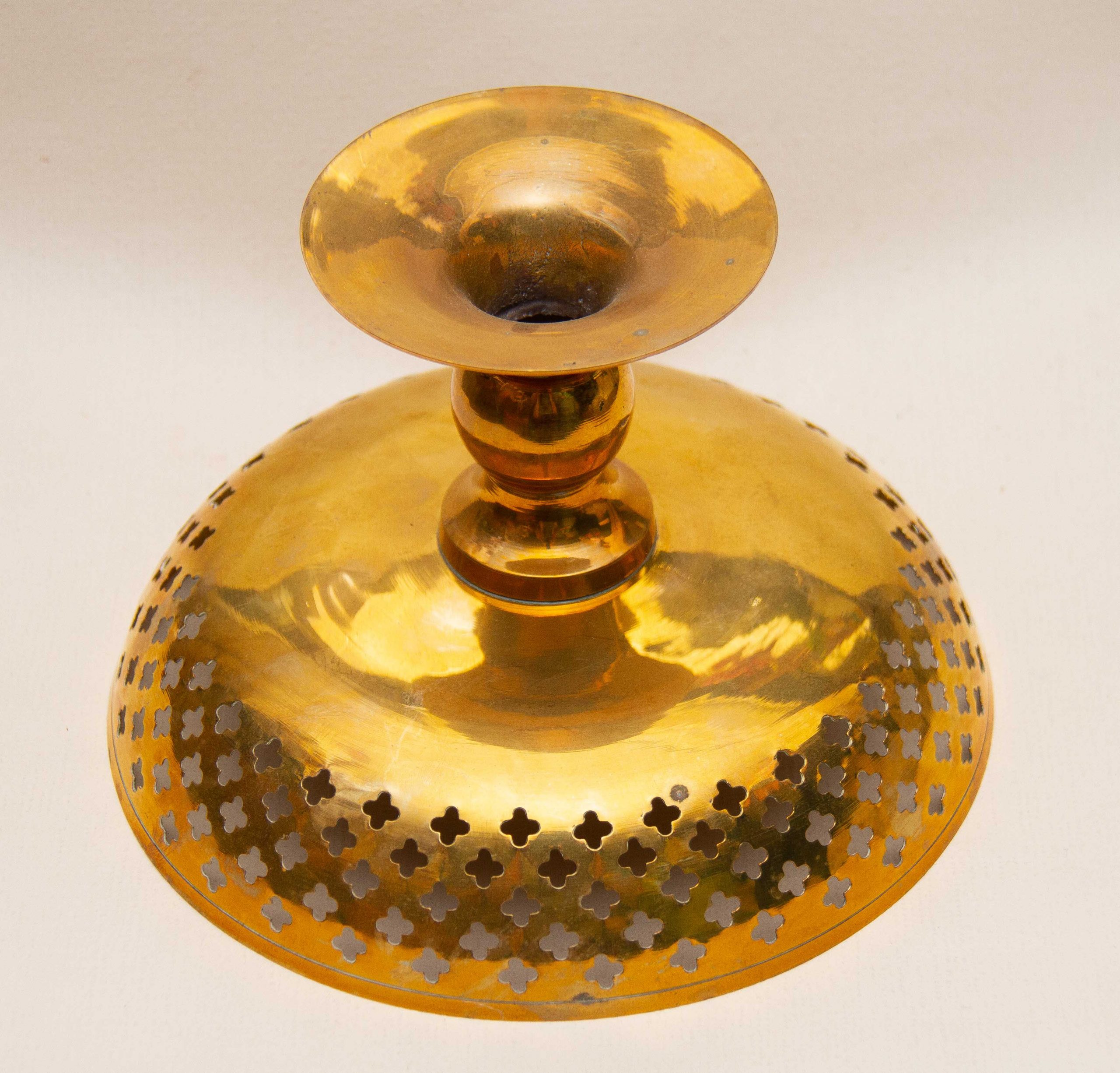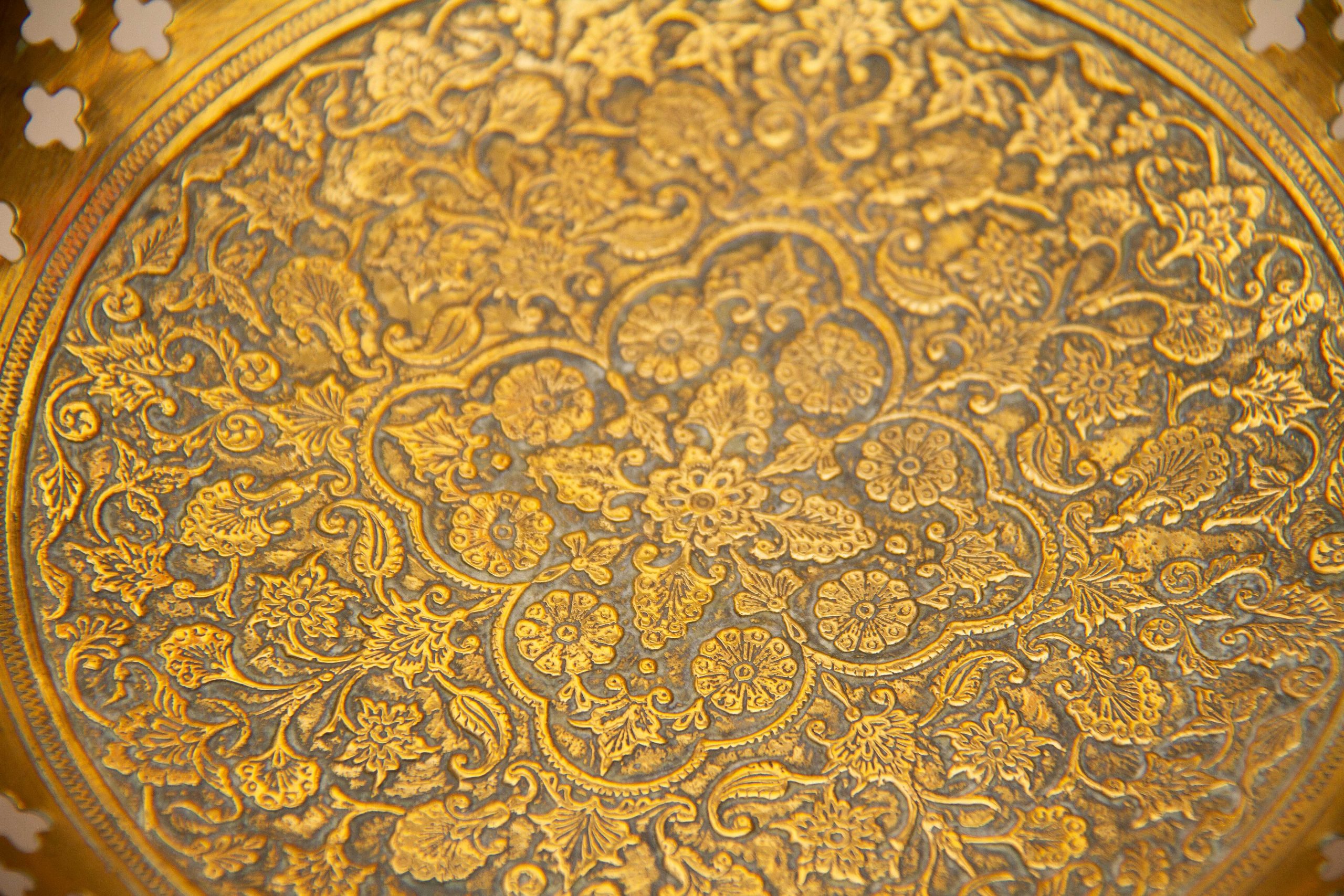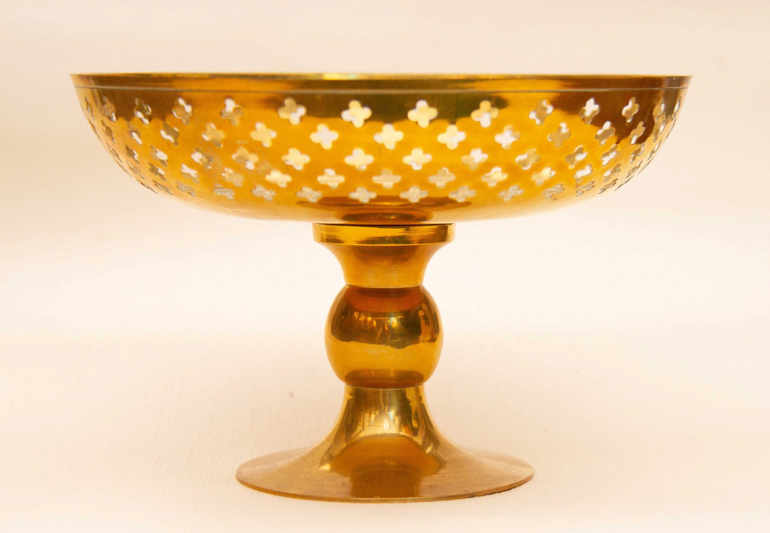 An Indian brass pedestal bowl with cutwork pattern around the top and embossed floral decoration on the inside.