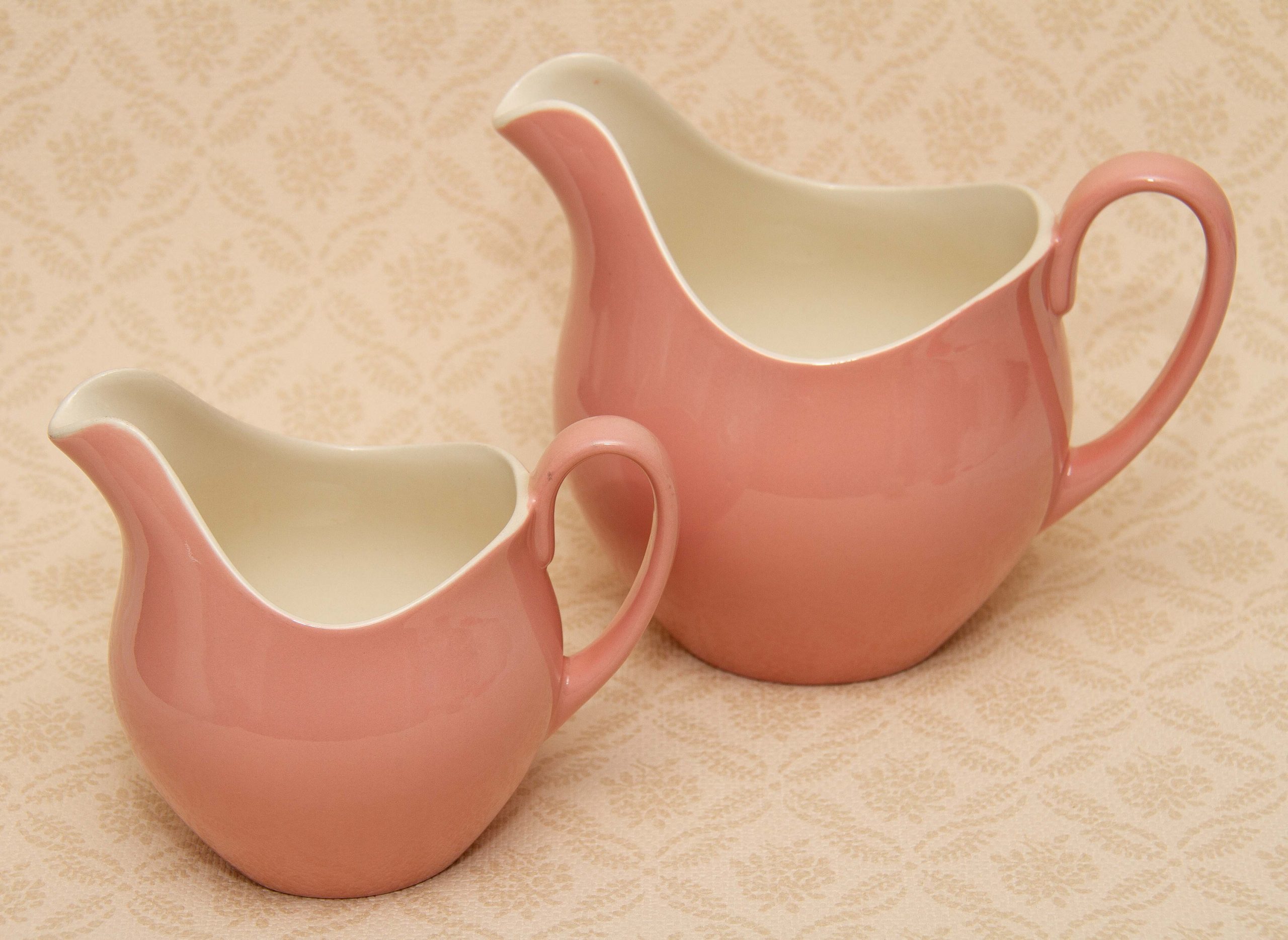 A fabulous pair of Johnson Bros. Jugs. In a gorgeous dusky pink and white. These look great just displayed on their own or used as vases. Circa 1950/1960 Made in Staffordshire England